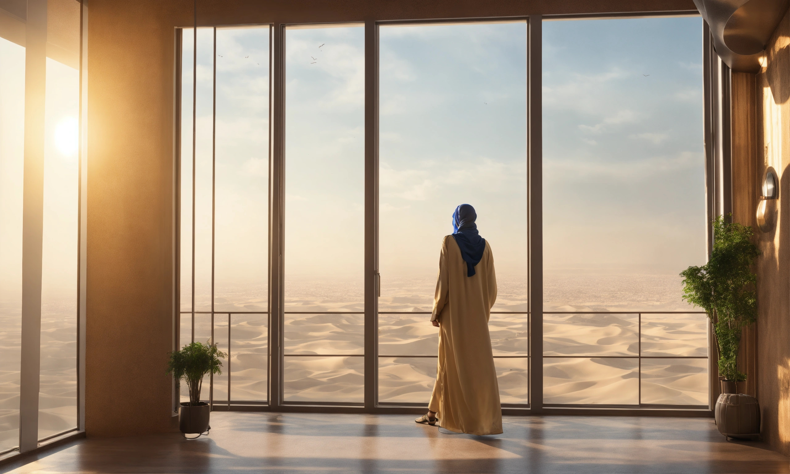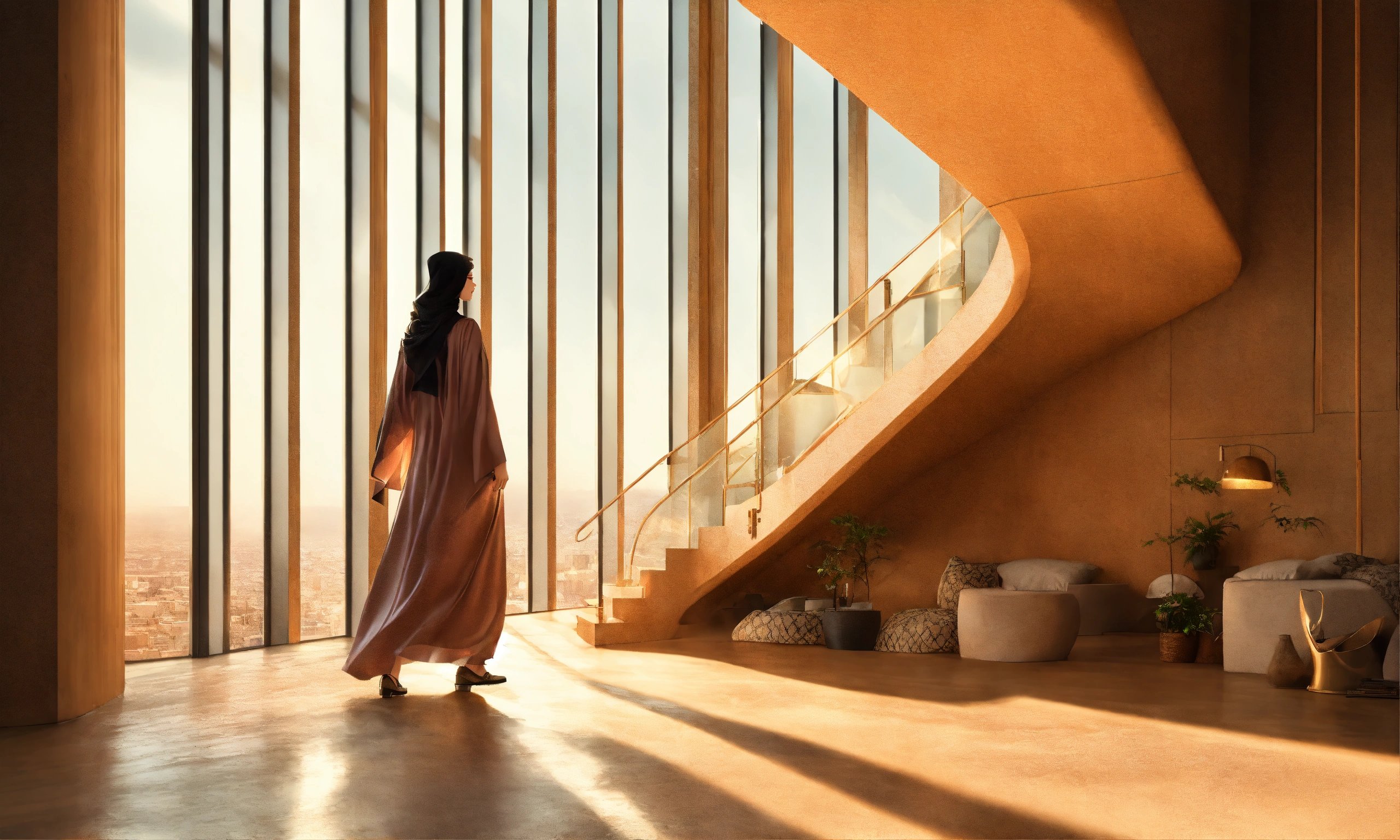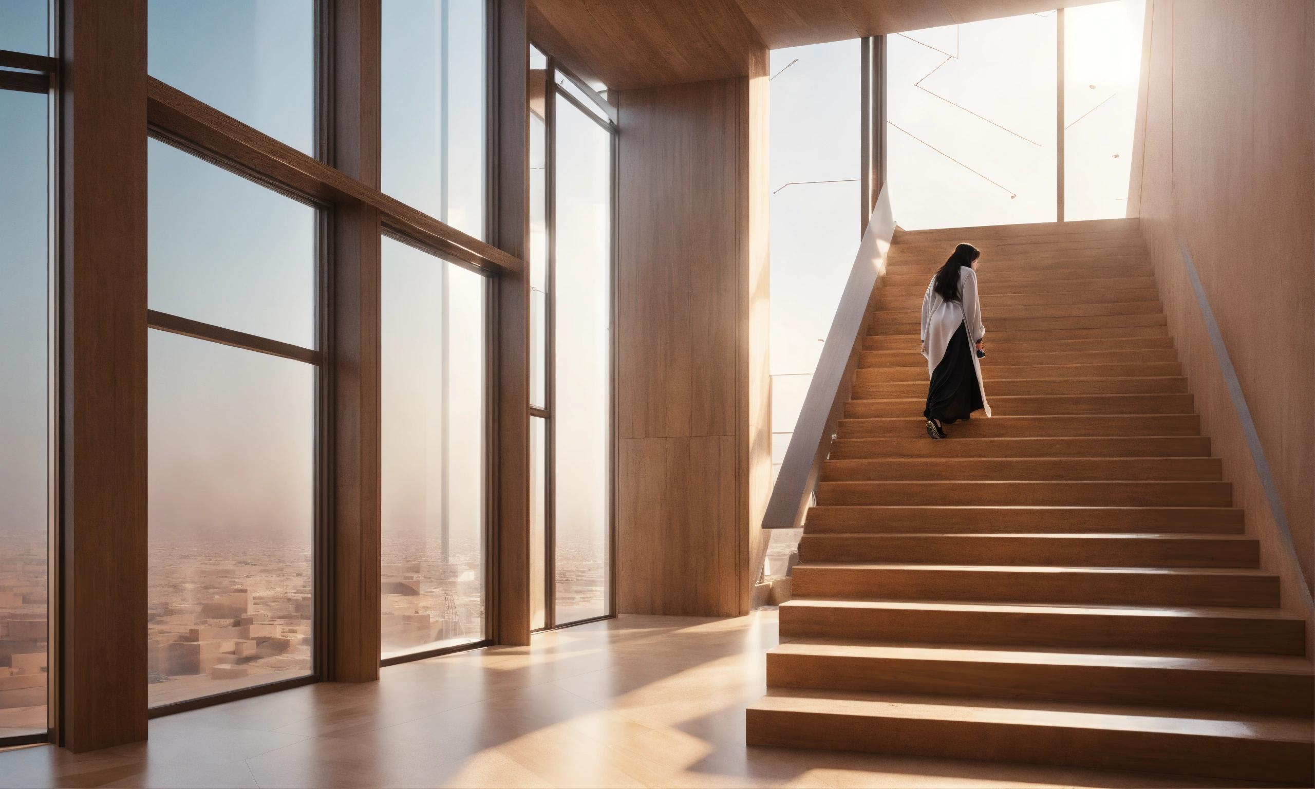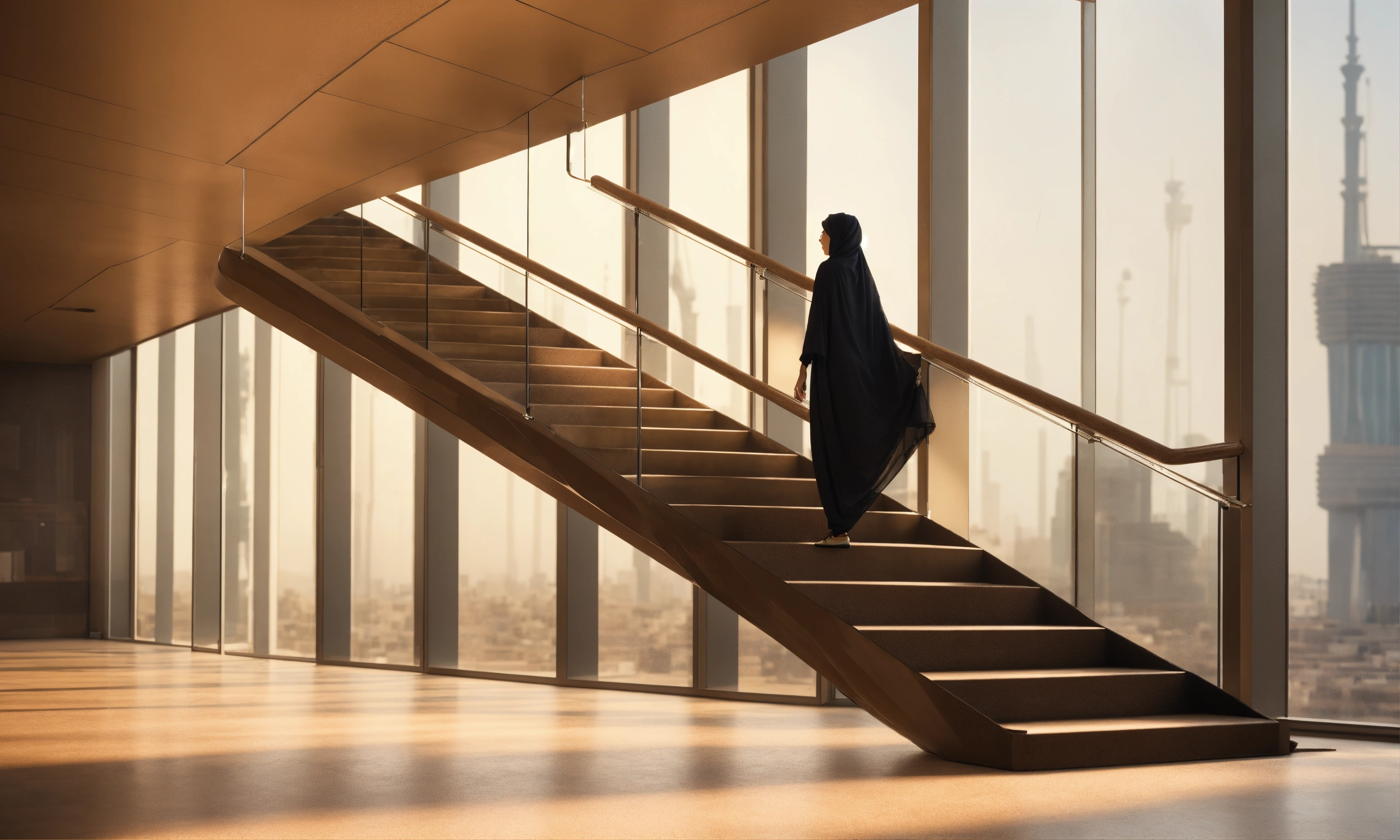 Saudi woman climbing six steps, side way, indoor, futuristic, modern, large window, natural light, warm, photo-realistic, 8k, high definition