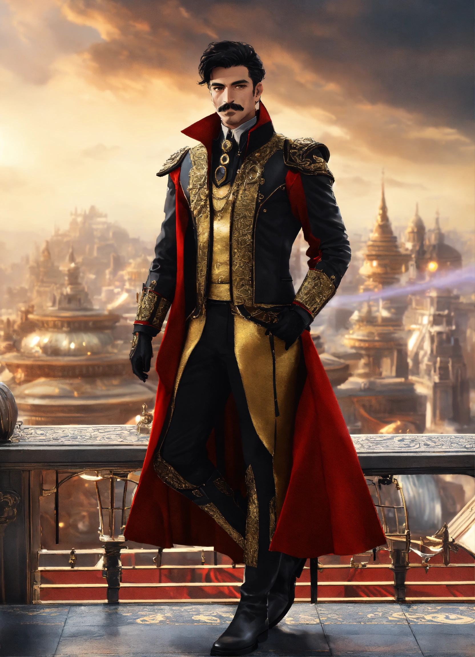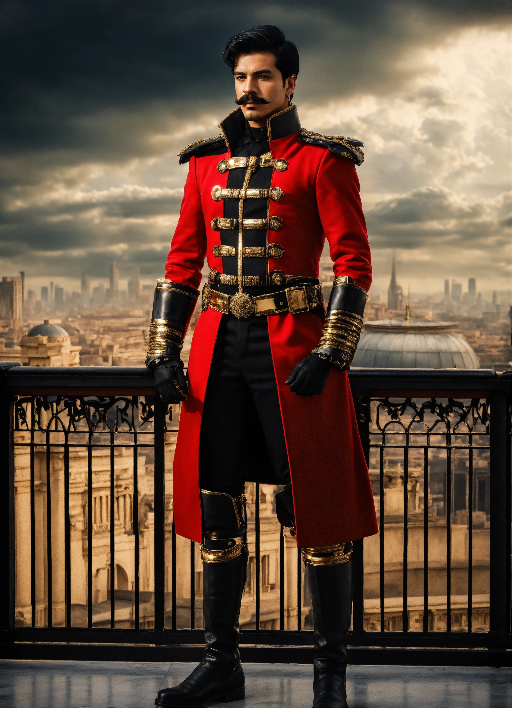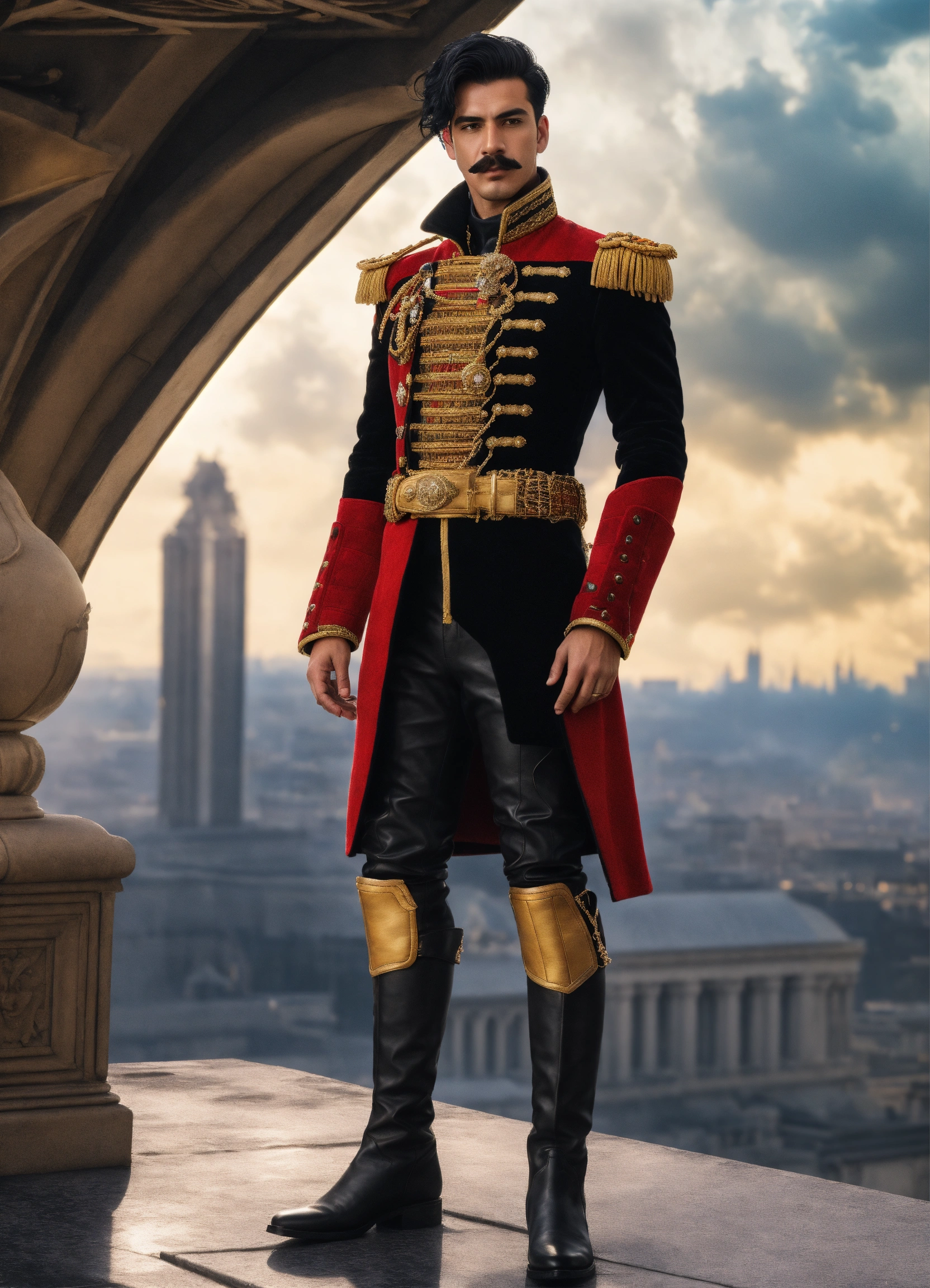Highly detailed full body of a sci fi aristocrat, royalty, leather black and red and gold outfit and boots, black hair and mustache, standing on palace balcony overlooking a sci fi city on a cloudy day, male, handsome, 21 years old, highly detailed