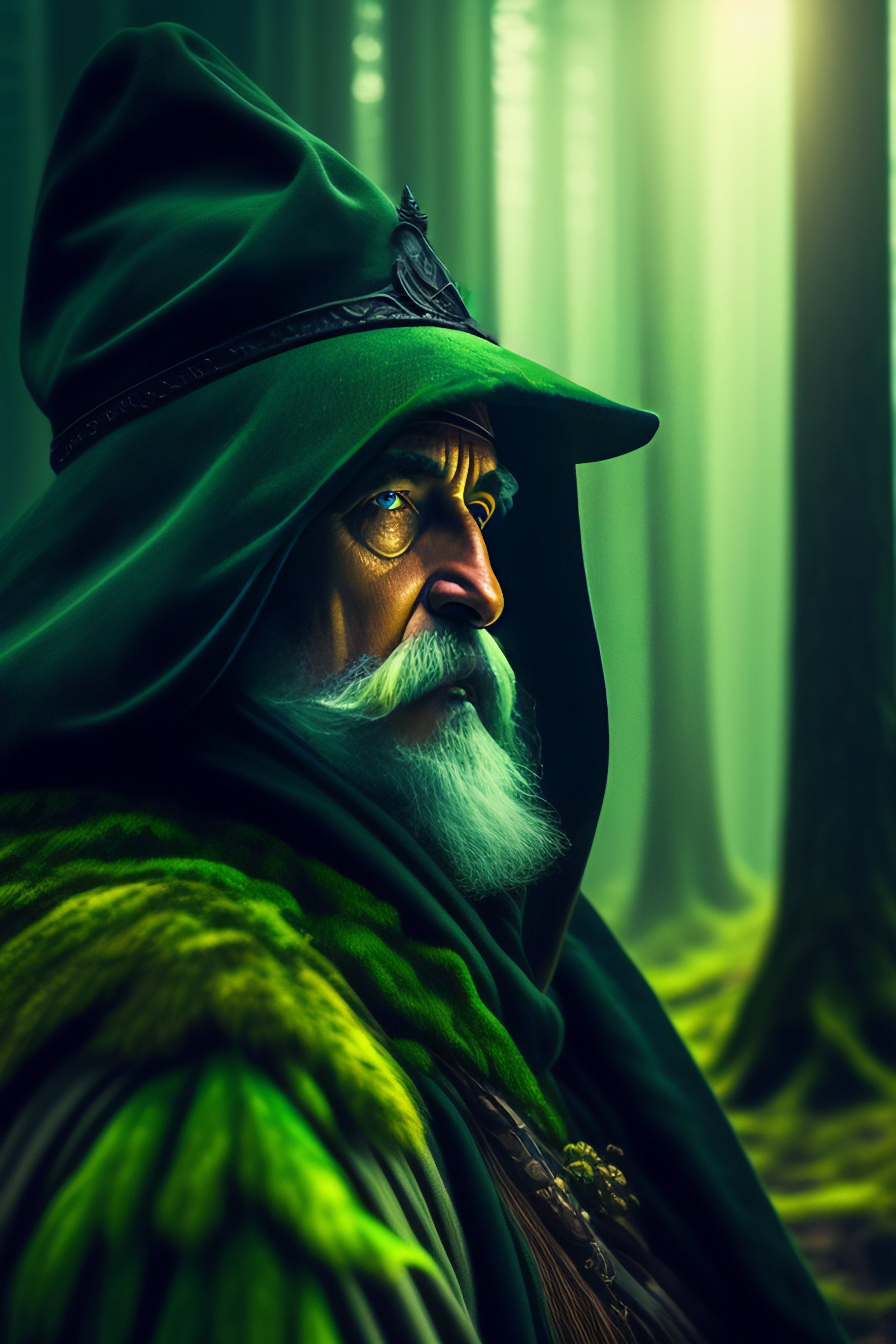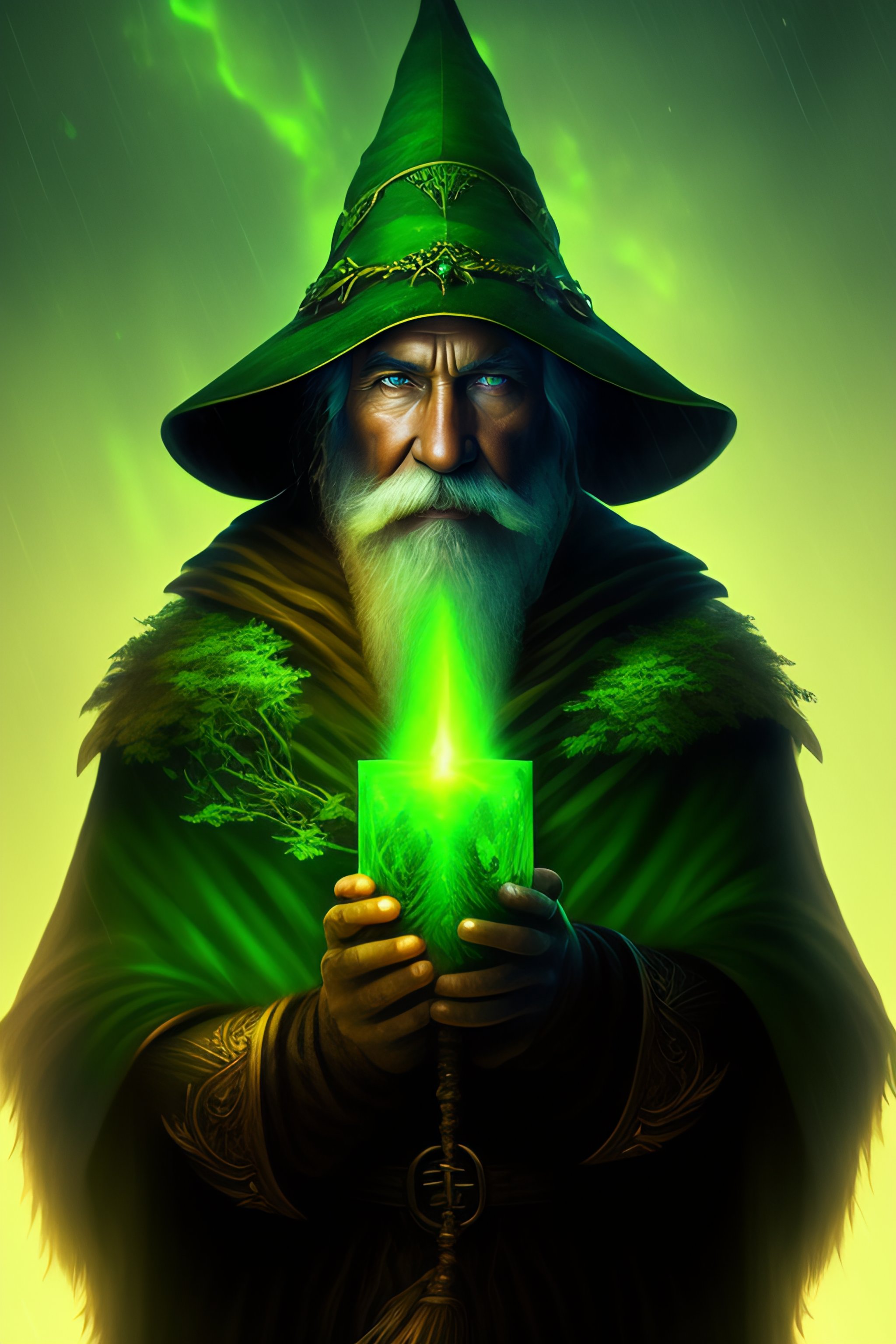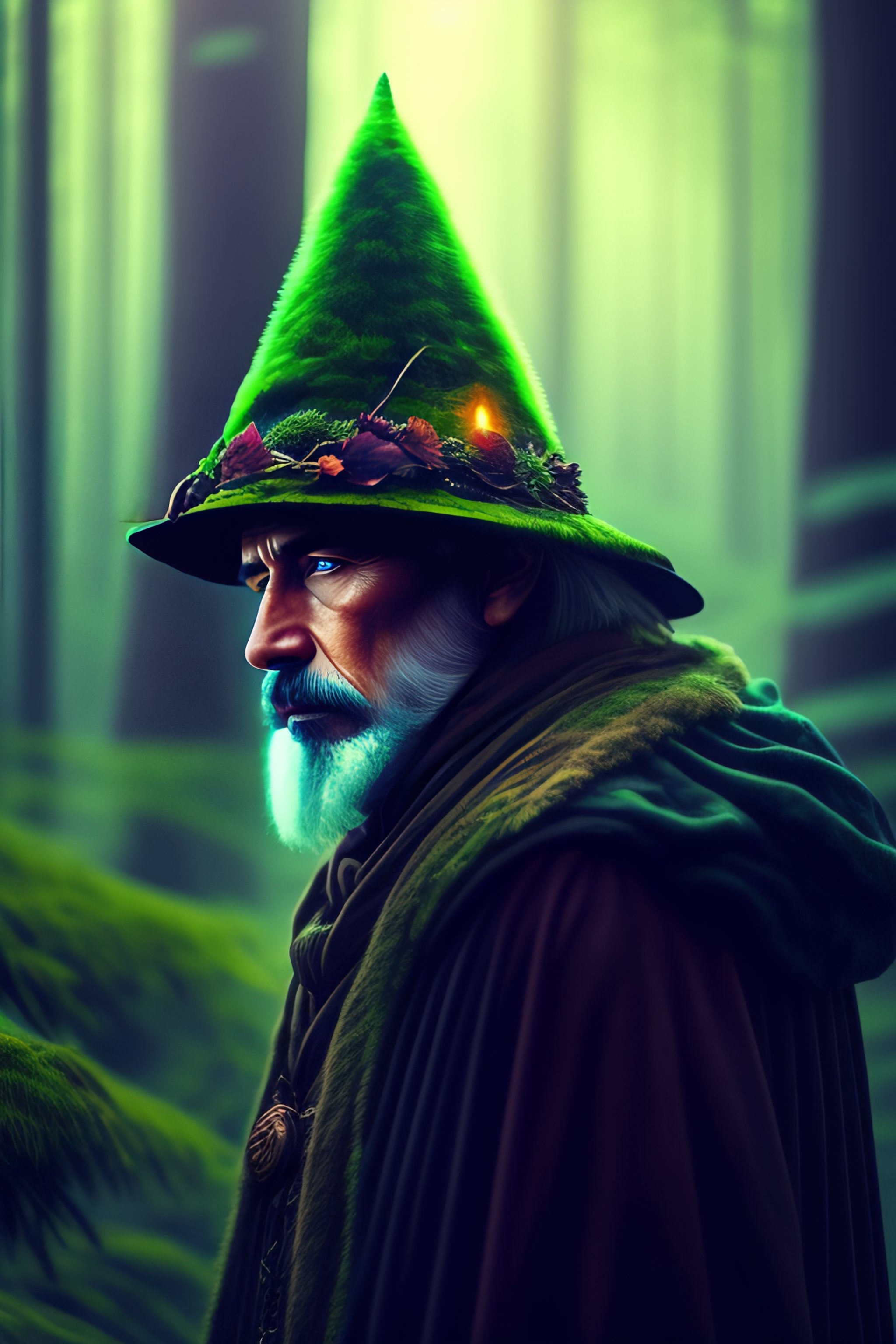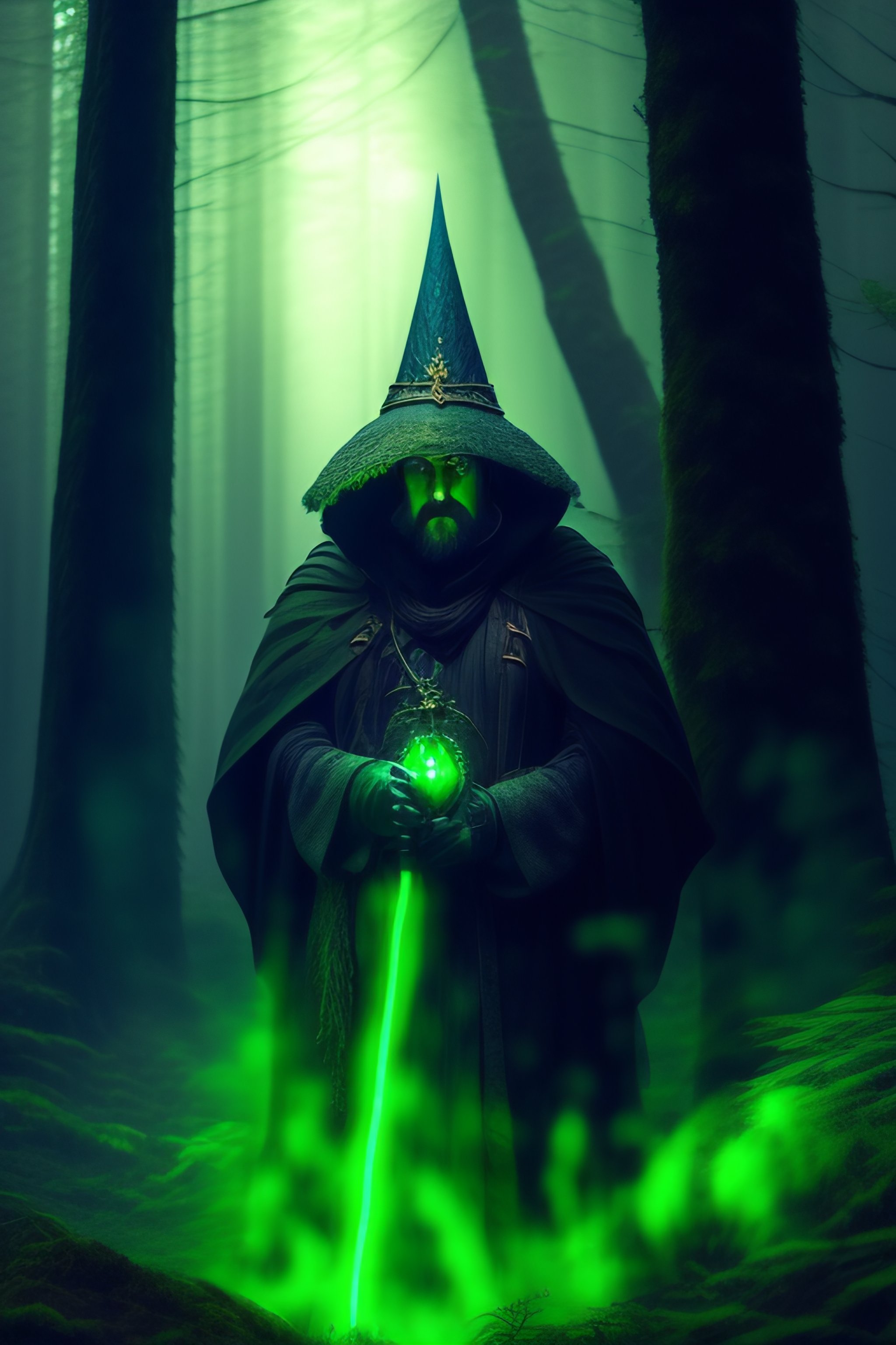 A forest wizard, gloomy and dark, with old hat, armor, his eyes glow fluorescent green, background forest green, nature, this wizard releases nature spells from his hands