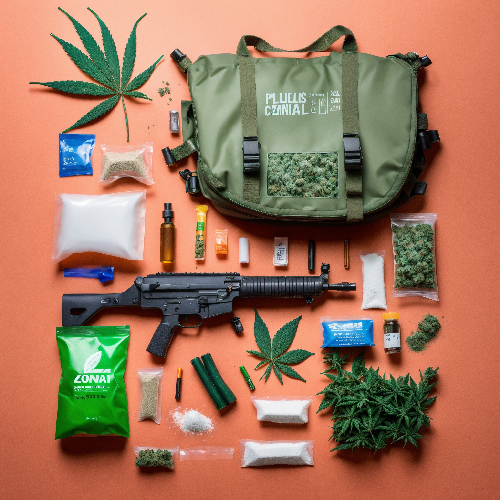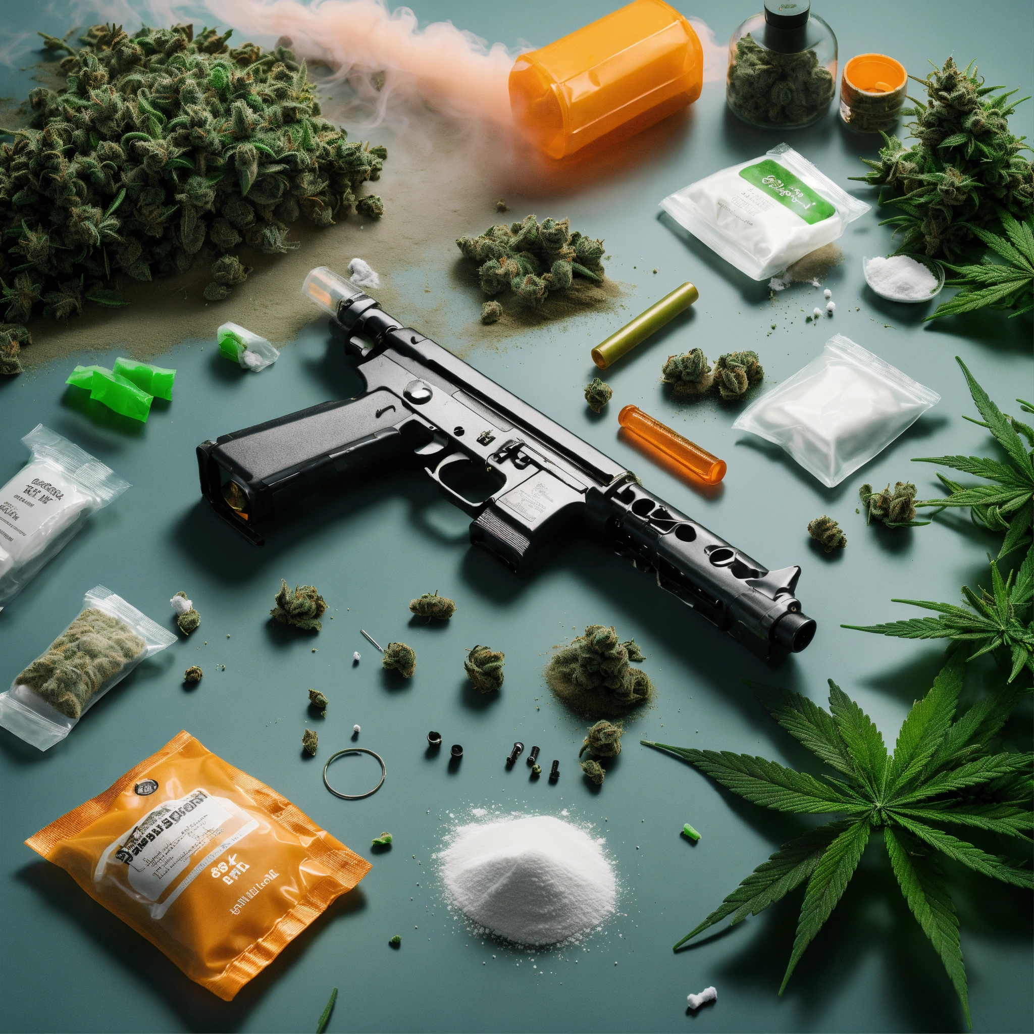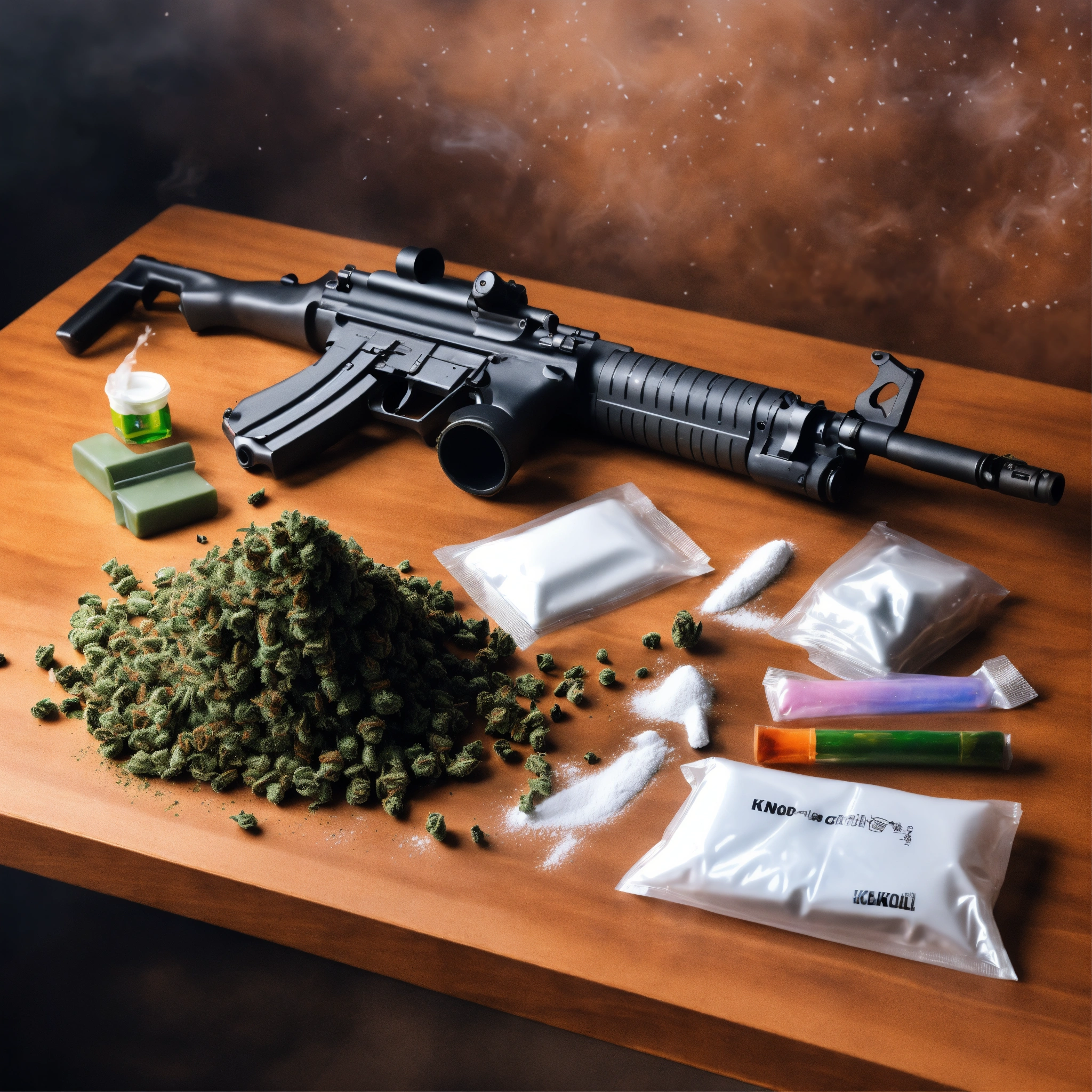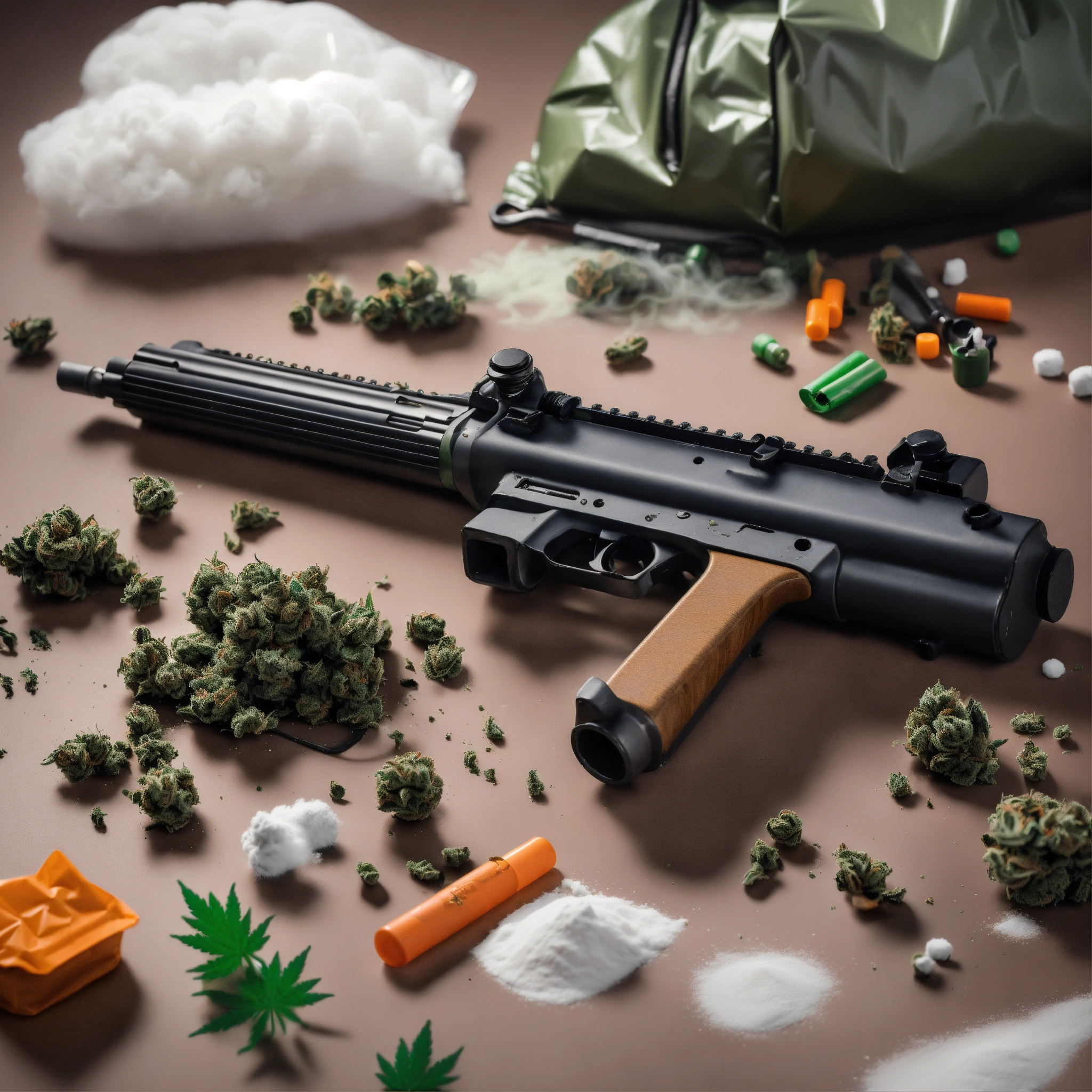 Components of a submachine gun mixed with smoke pipe, knolling layout, 8k, photorealistic 3d with pastel mate colours of cannabis, with a lot of white powder in the background and plastic zippy bags full of white powder