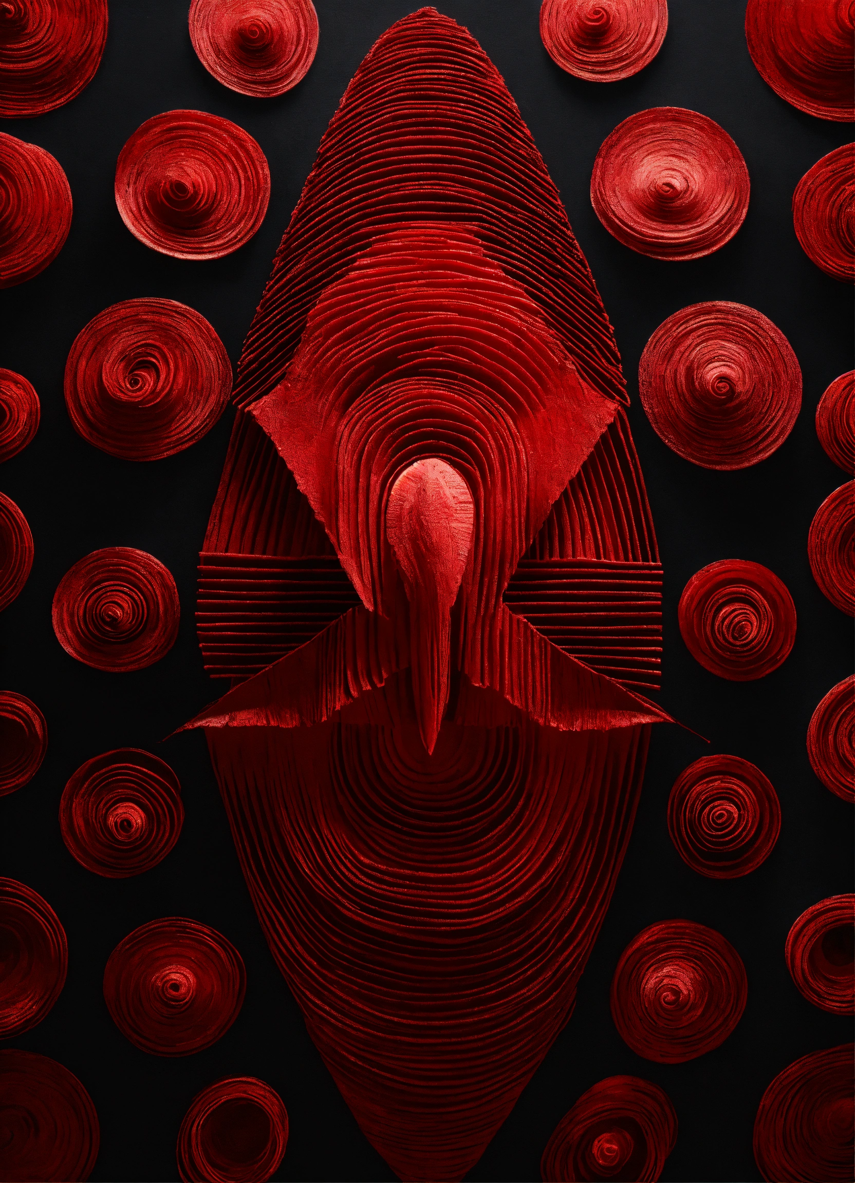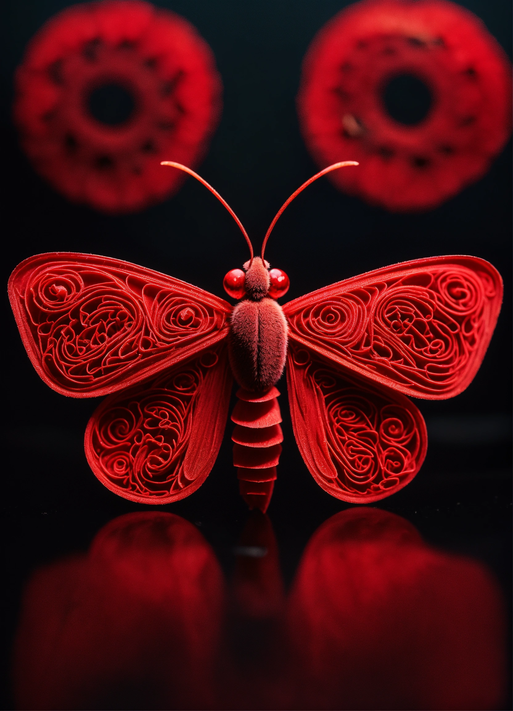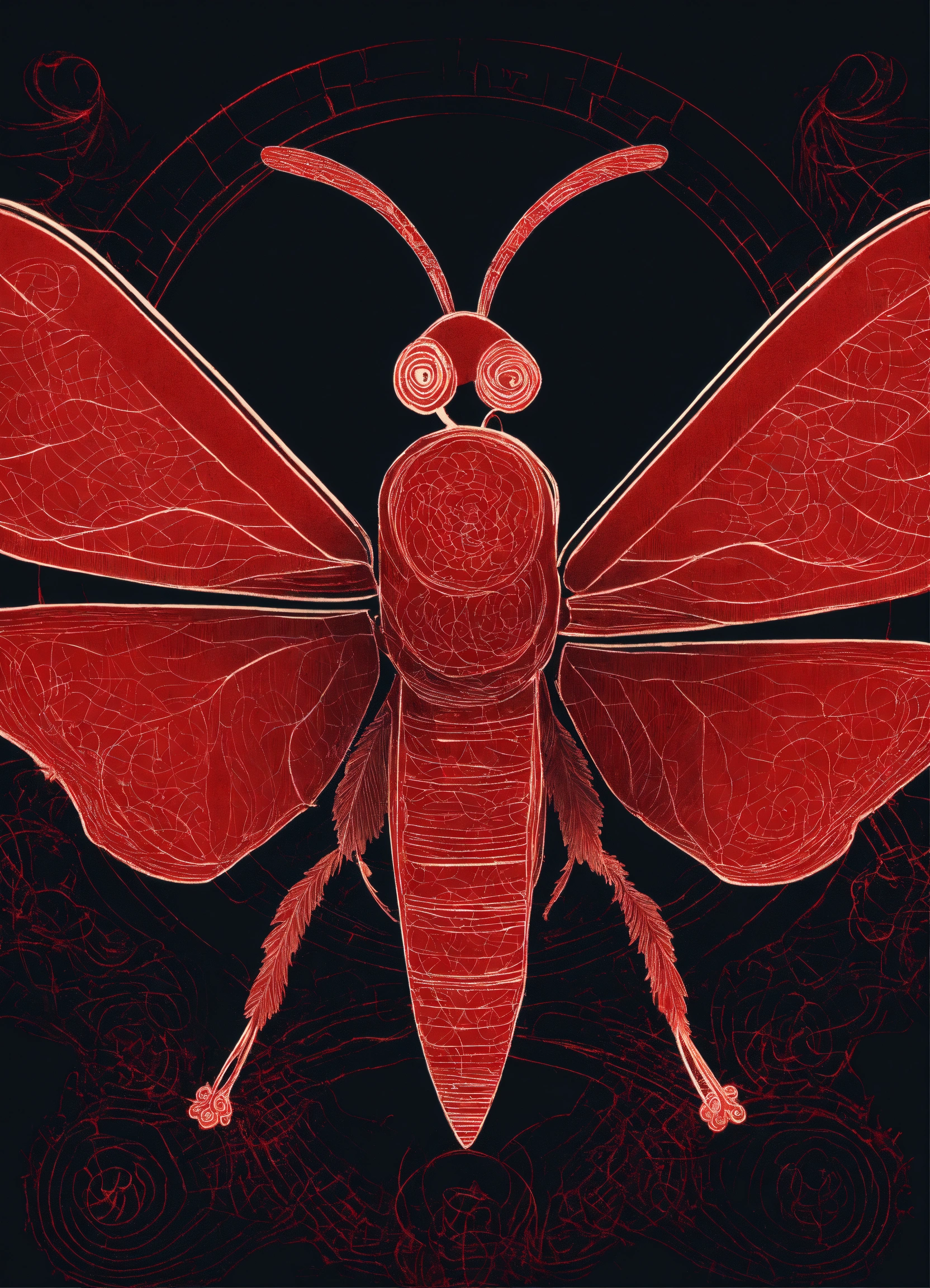 A gamma paper moth of red colors, with a small cold contrast, forming spirals on its wings. very defined antennas. with black background.