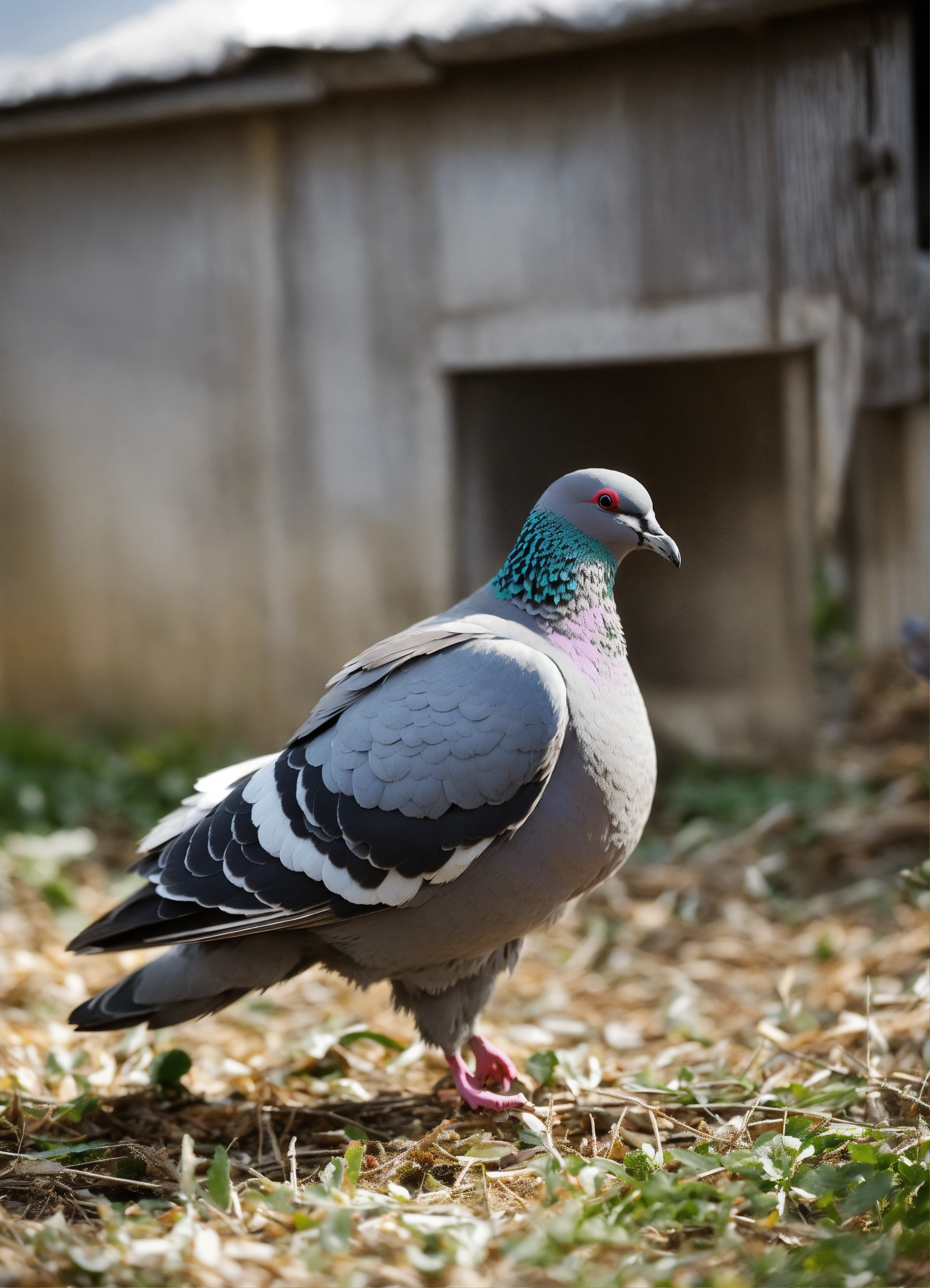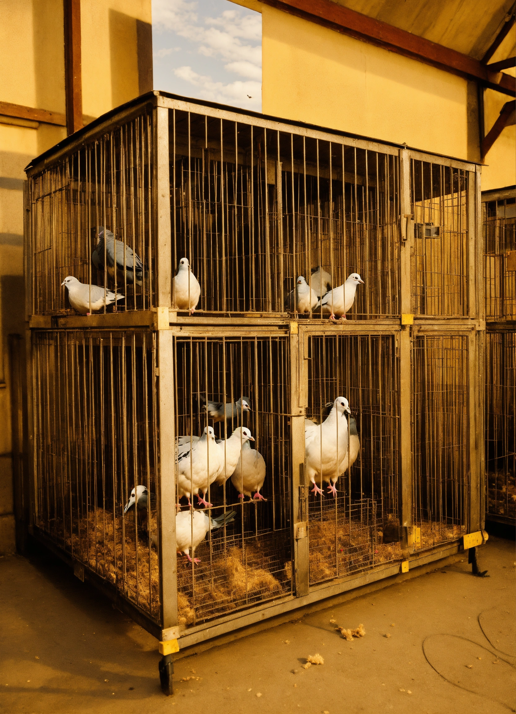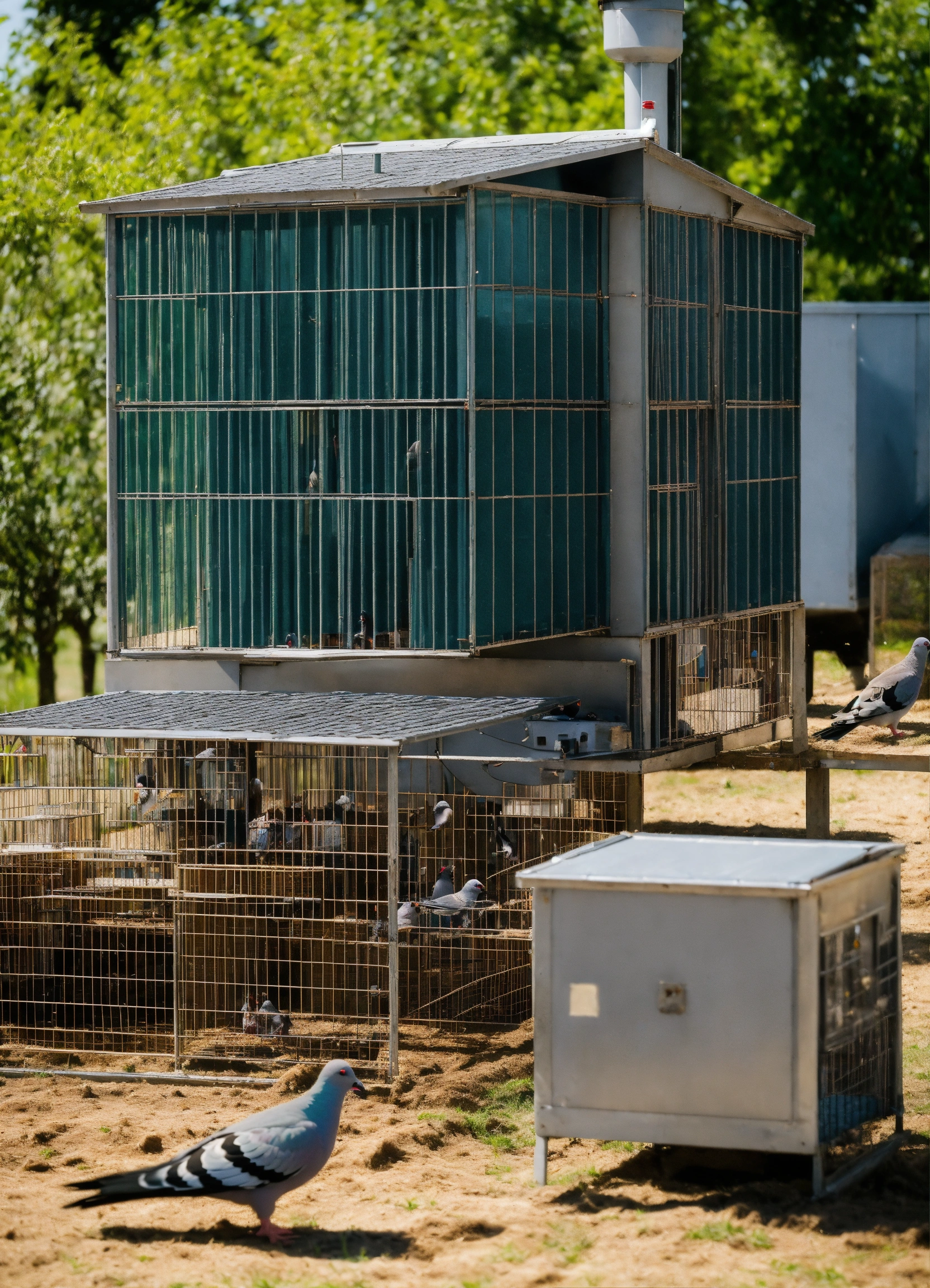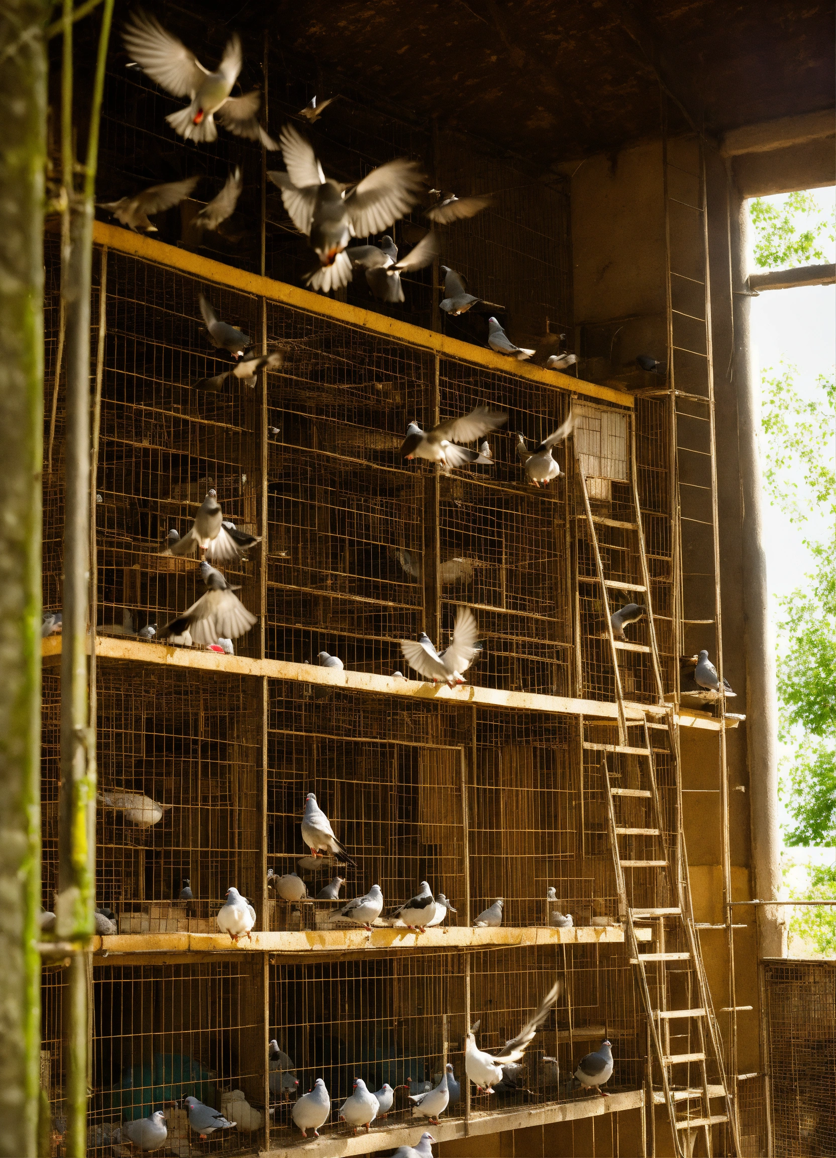 Un pigeonnier automatisé pour 10 000 pigeons, situé dans une zone rurale, entourée d'arbres et de champs. le bâtiment est en béton et en acier, avec un toit en métal. la zone de production est équipée de systèmes automatisés, tels que des convoyeurs pour la distribution de la nourriture et de l'eau, des robots pour le nettoyage des cages et des caméras pour le suivi de la santé des pigeons. la zone d'élevage est divisée en plusieurs sections, chacune contenant environ 1 000 pigeons. chaque section est équipée de perchoirs, de pondoirs, de mangeoires et d'abreuvoirs. les pigeons sont de différentes races et couleurs.