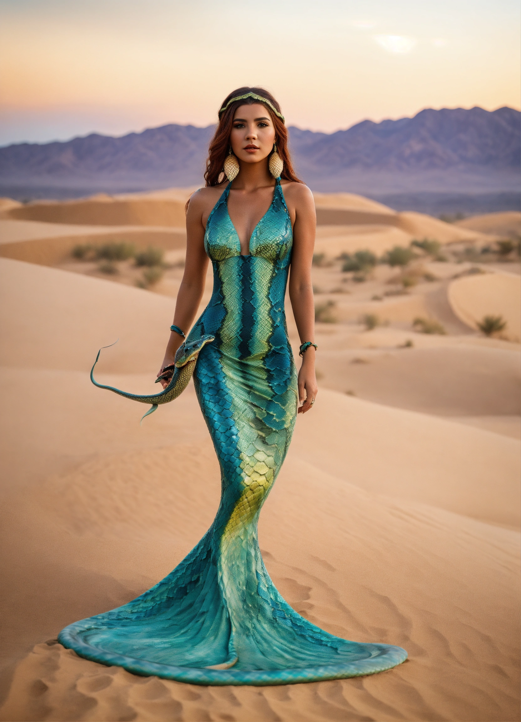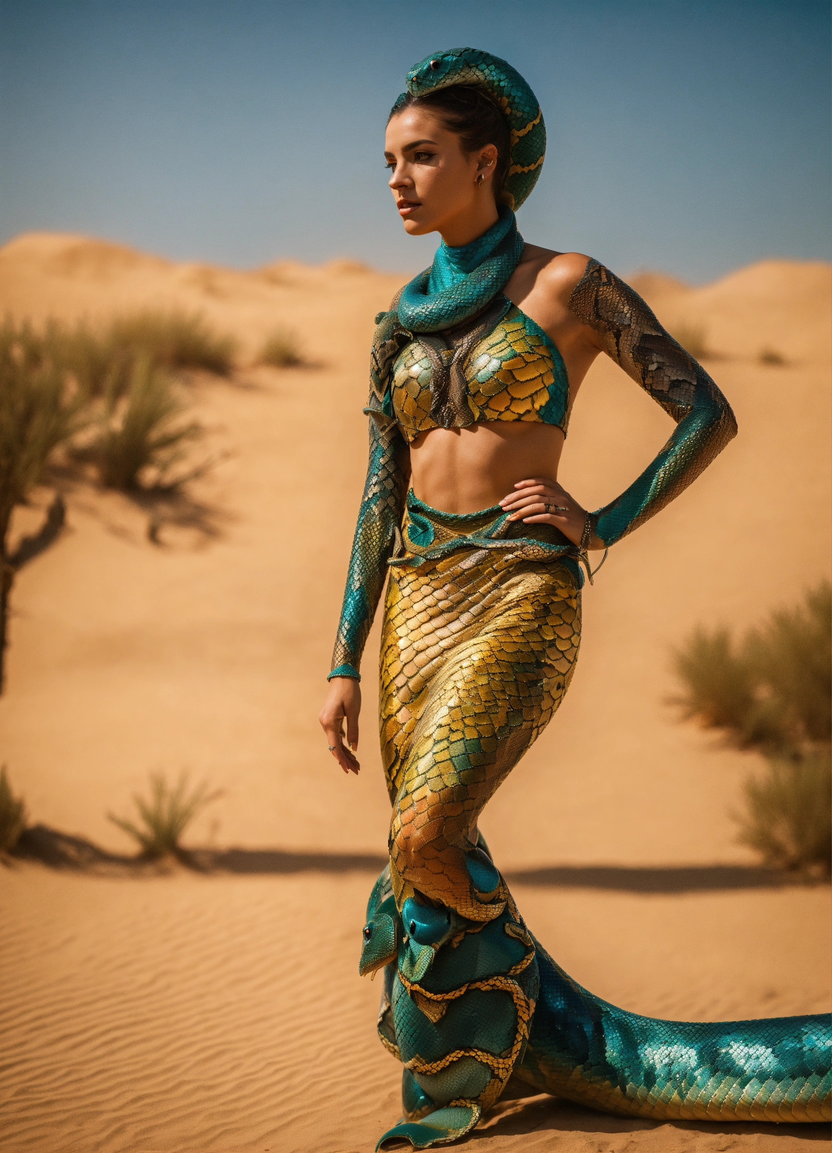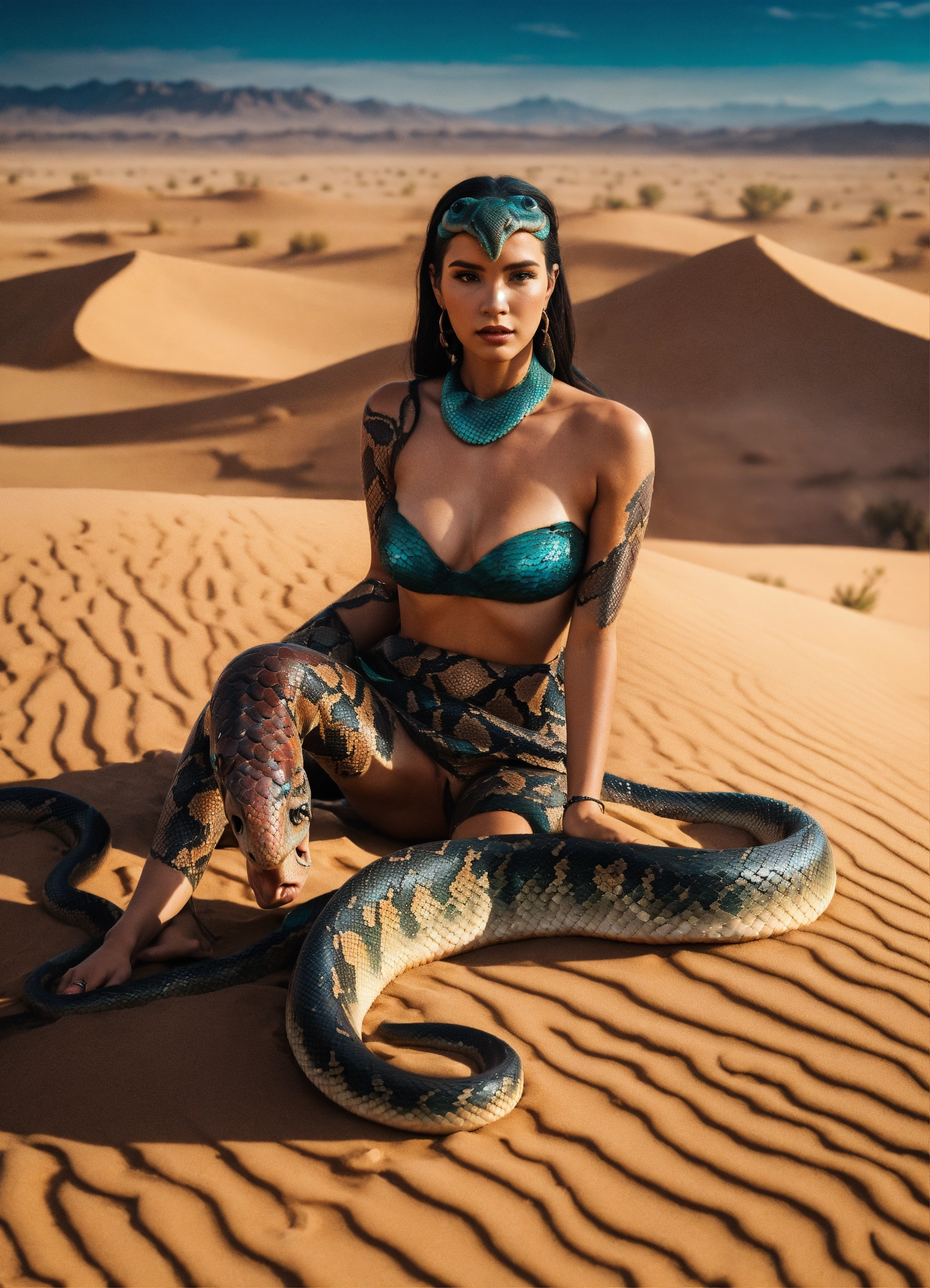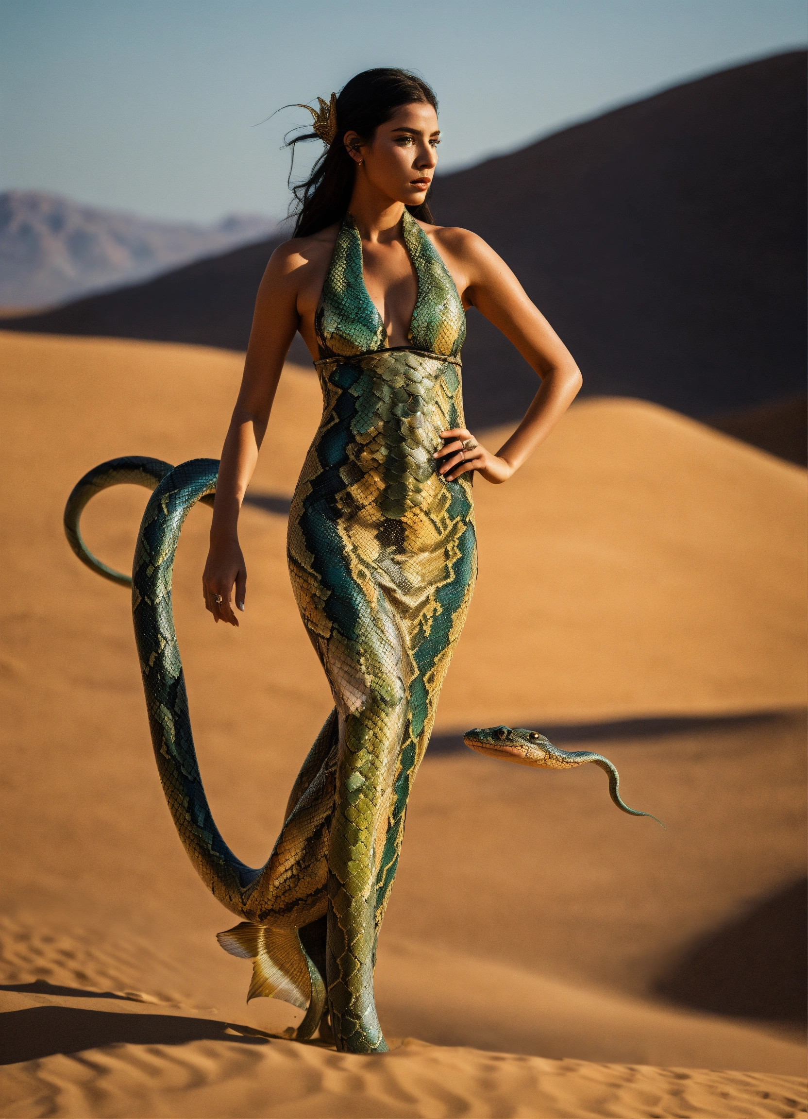 Detailed 4k photo full body portrait of a snakemaid slithering through the desert a snakemaid is like a mermaid, but instead of half fish, she is half single snake from the waist down.