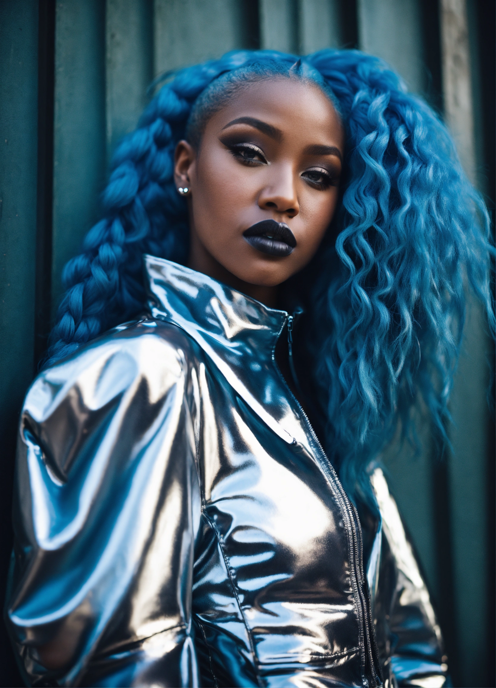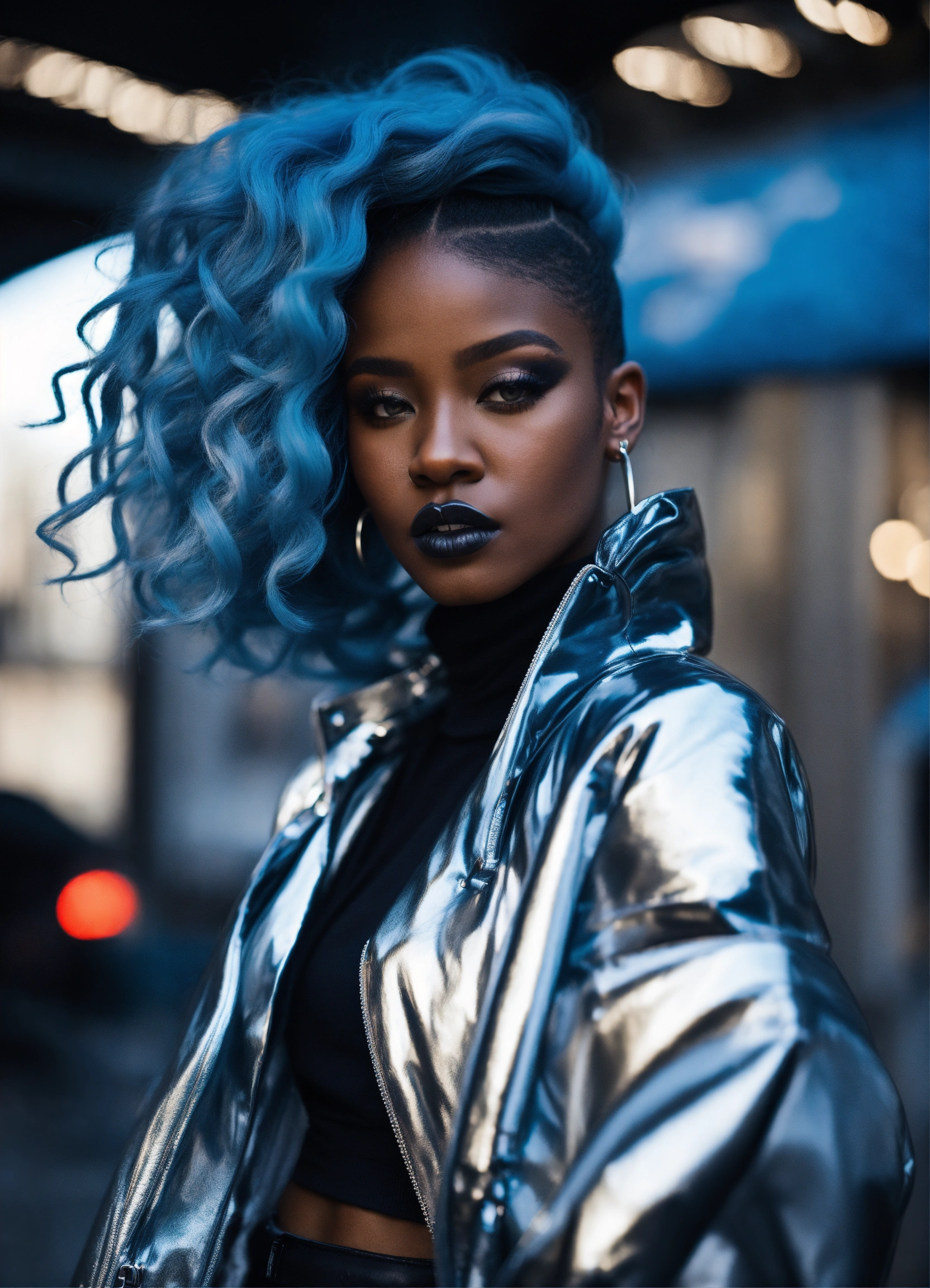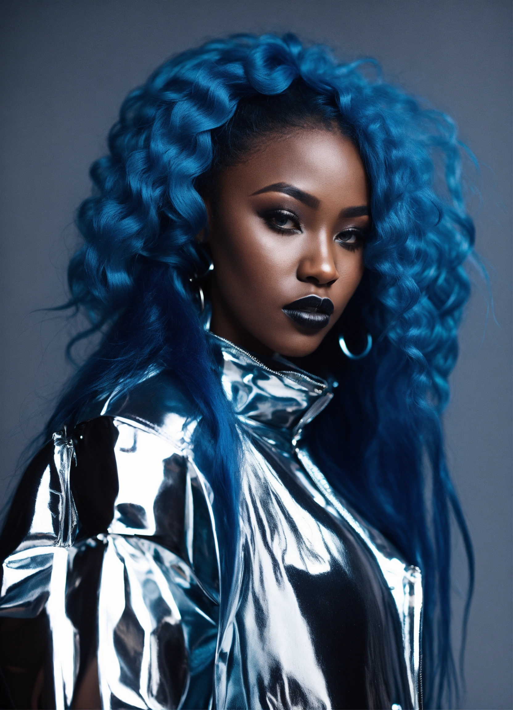 Black woman, in silver high fashion street wear with puffer sleeves, avant-garde, long flowing blue hair, edgy sleek styling, photography