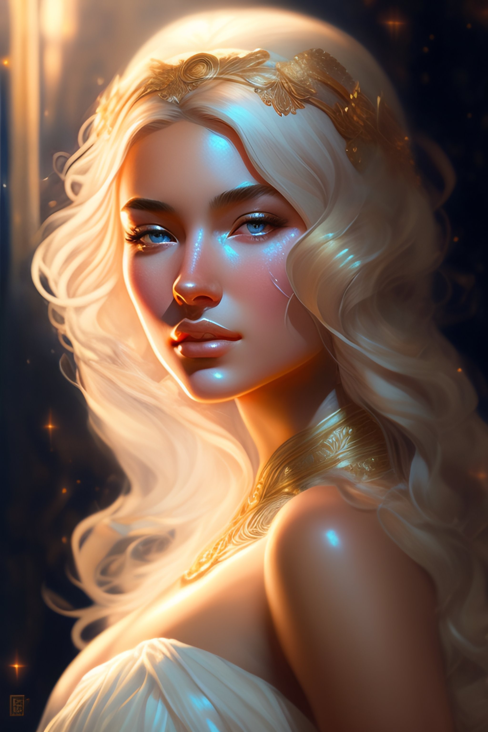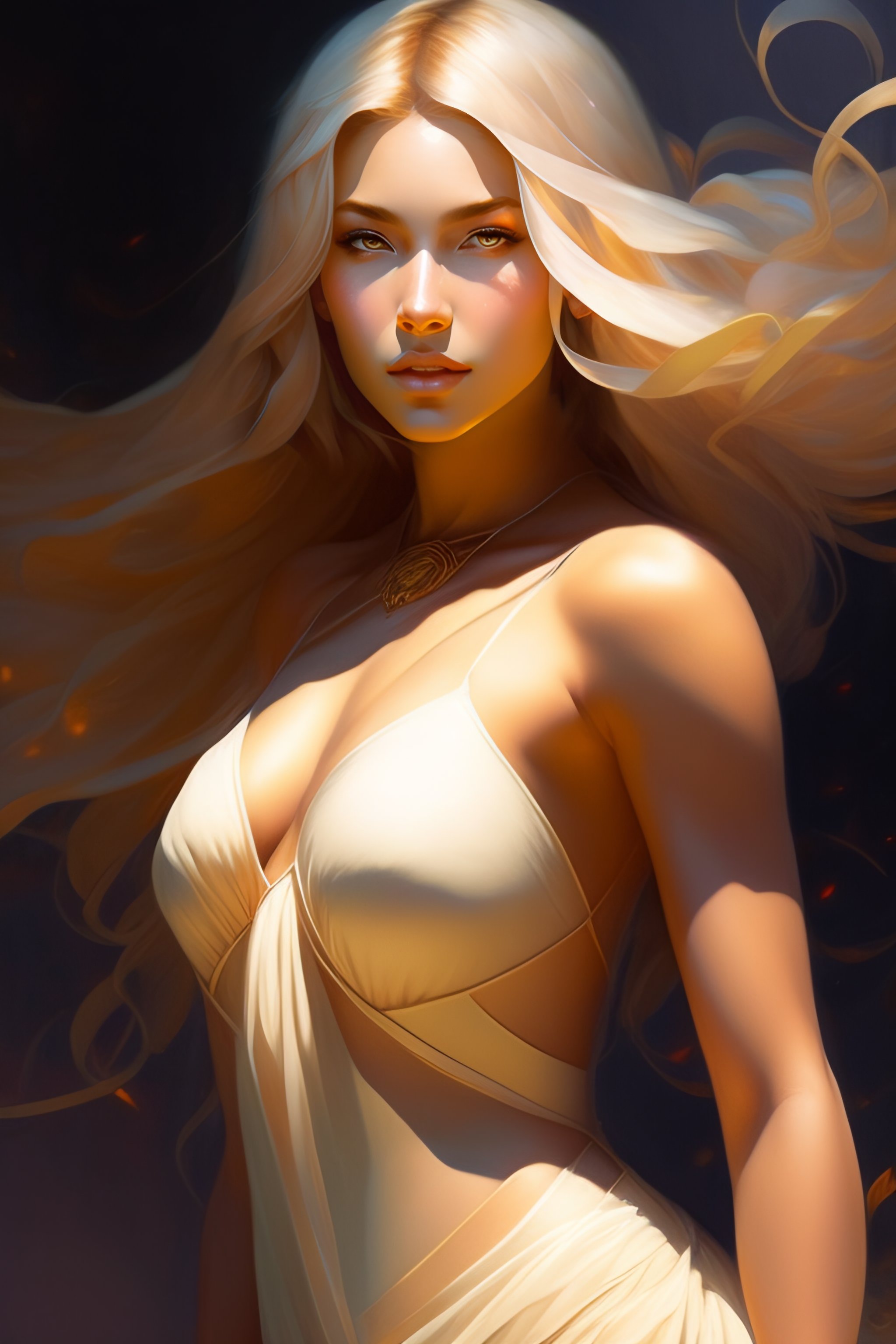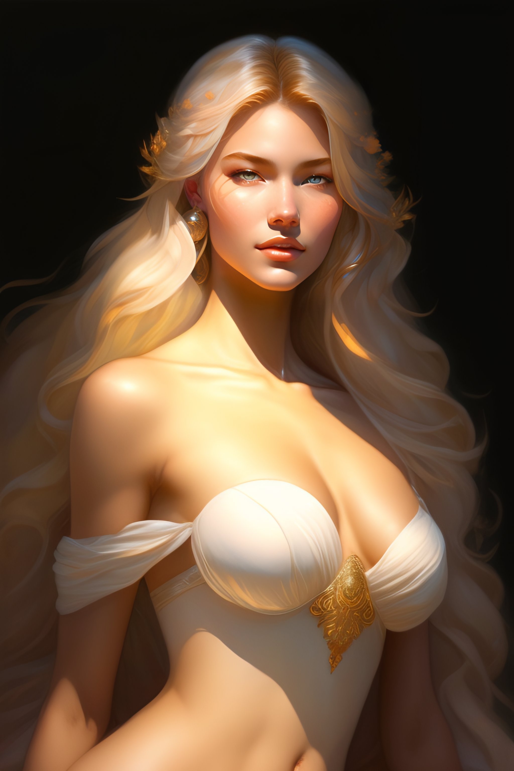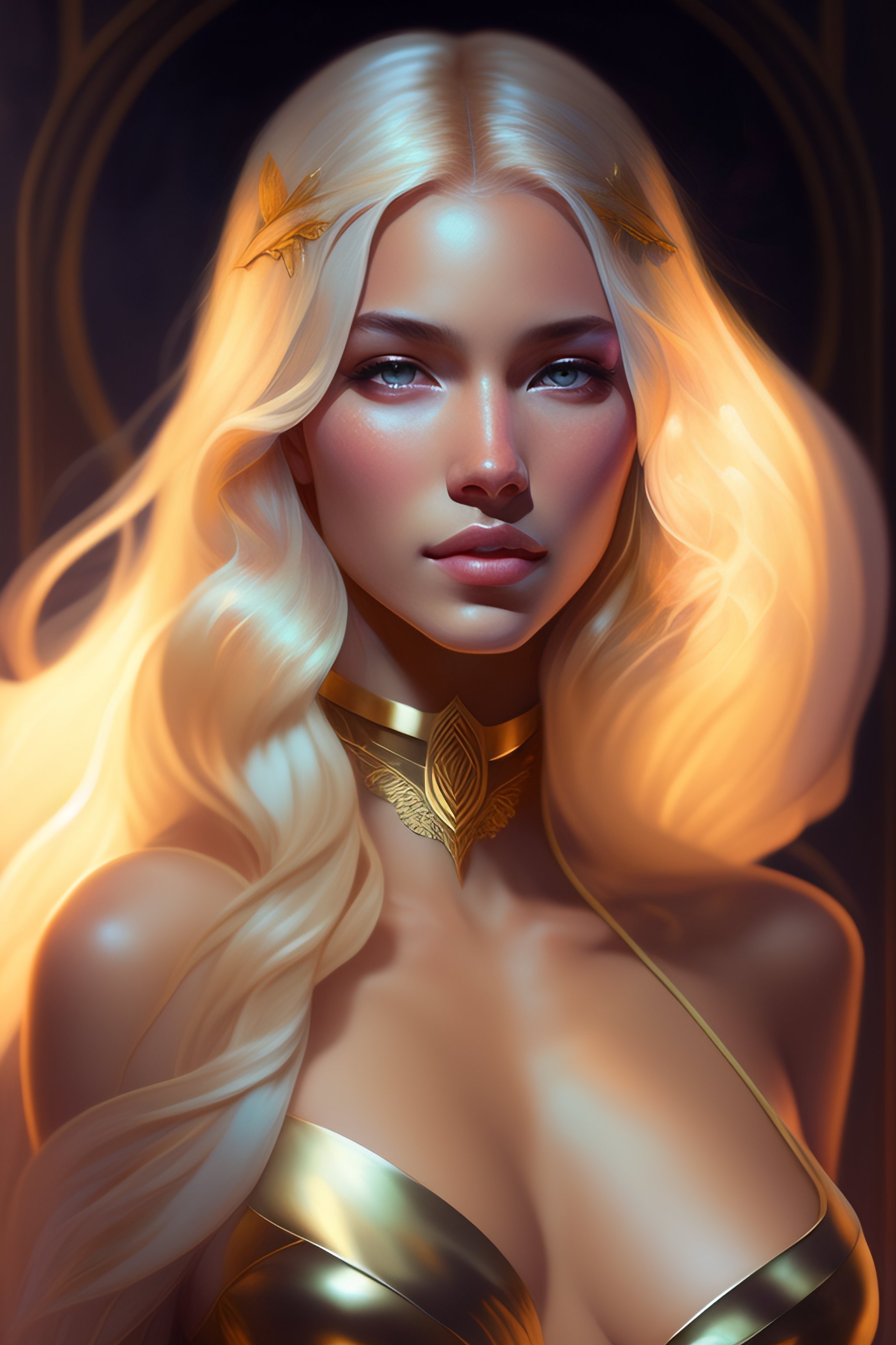 Digital character concept art by artgerm and greg rutkowski and alphonse mucha. clear portrait of a young wife blessed by god to uncontrollably become overwhelmingly perfect!! blonde, barely clothed, obviously feminine holy body!! light effect. hyper detailed, glowing lights!! intricate, elegant, digital painting, artstation, smooth, sharp focus