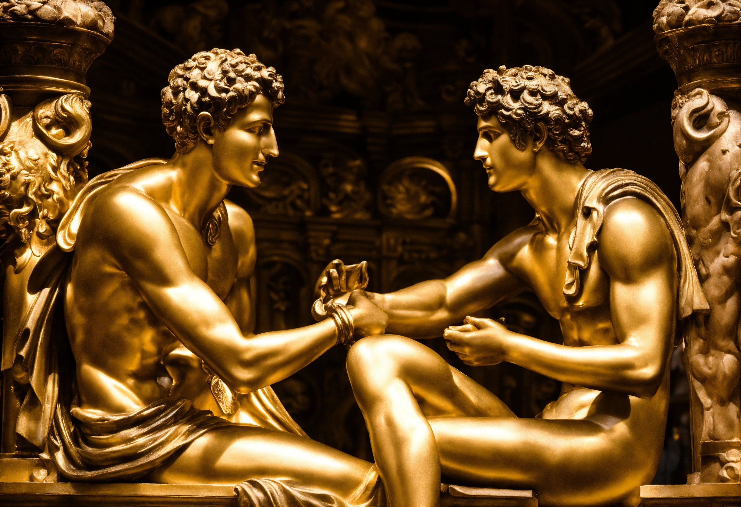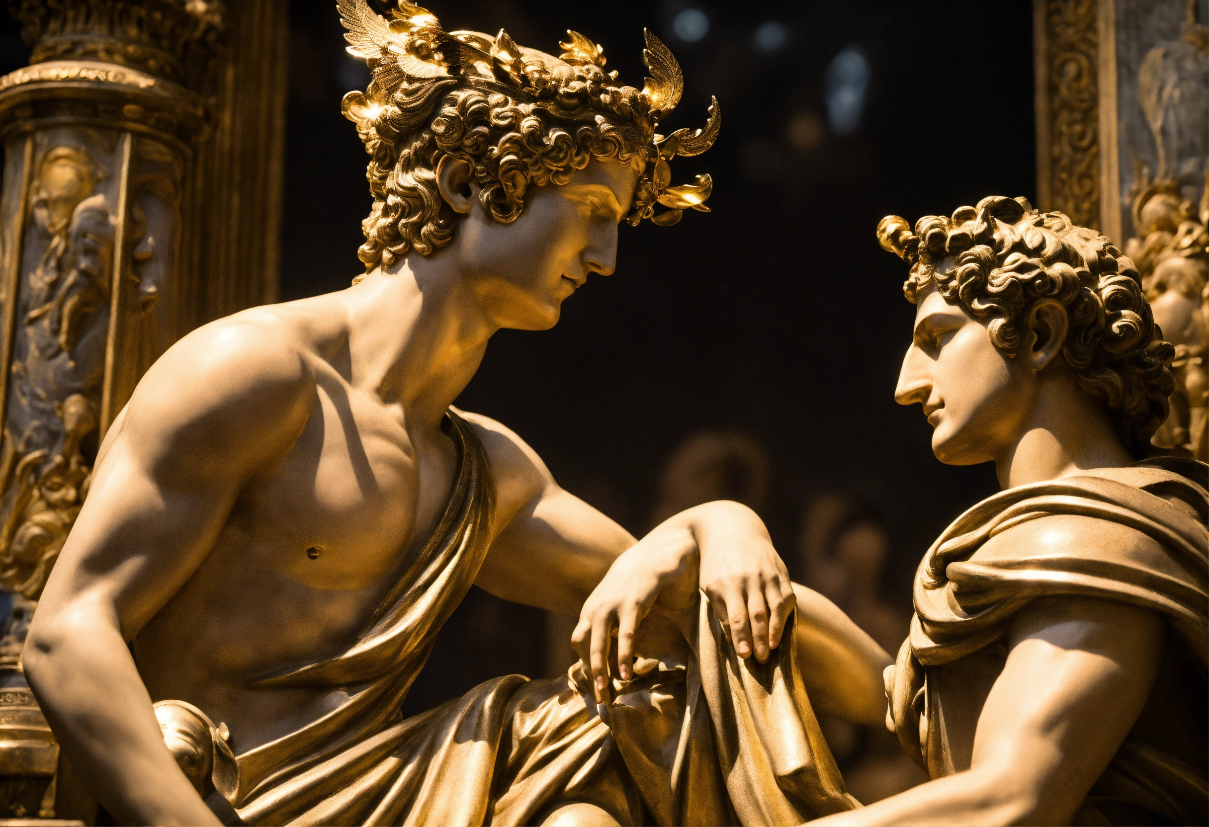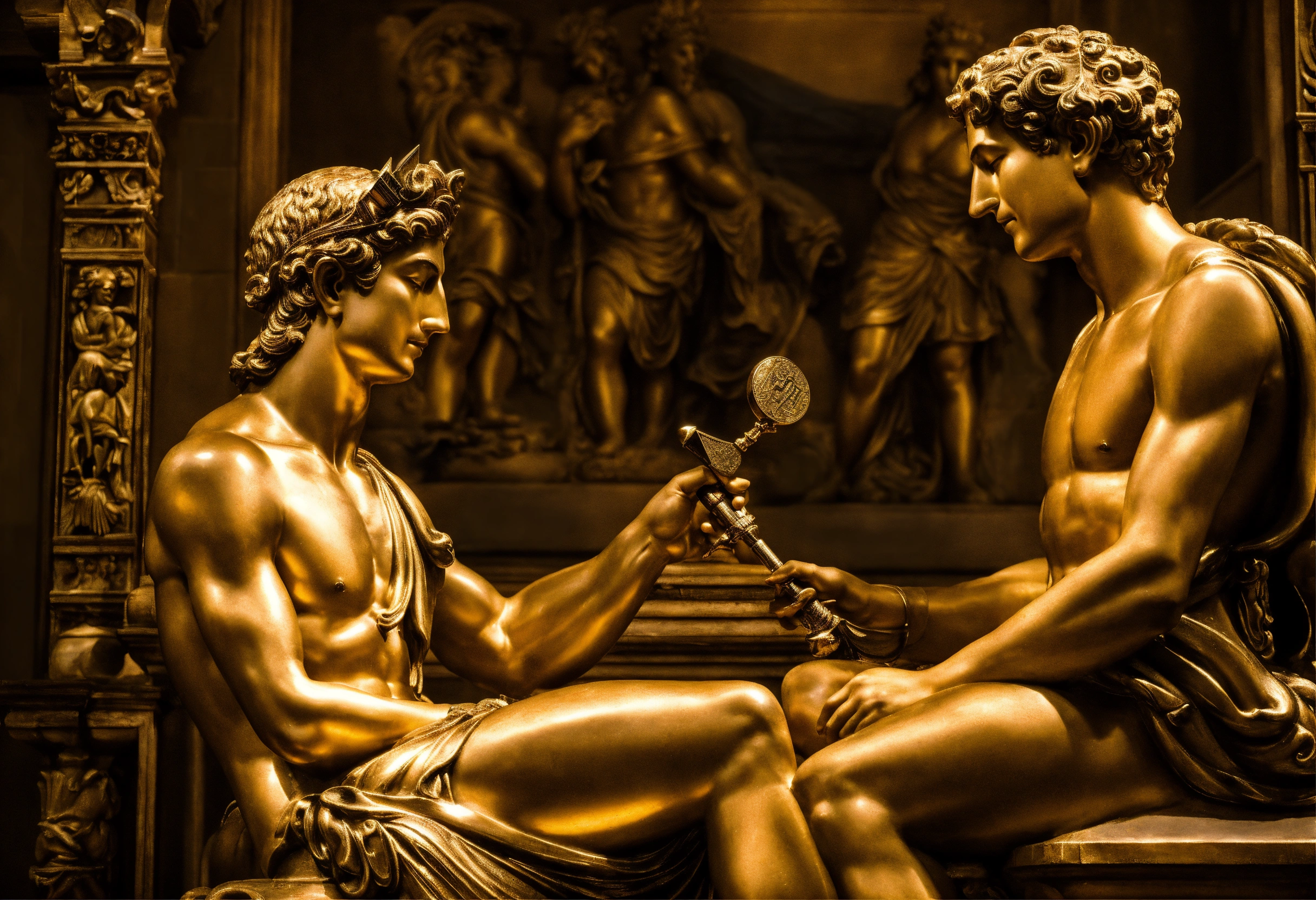 A photograph capturing mercury, the god of information, chatting friendly with cronus the god of time, uniting in divine harmony, transcending epochs and knowledge