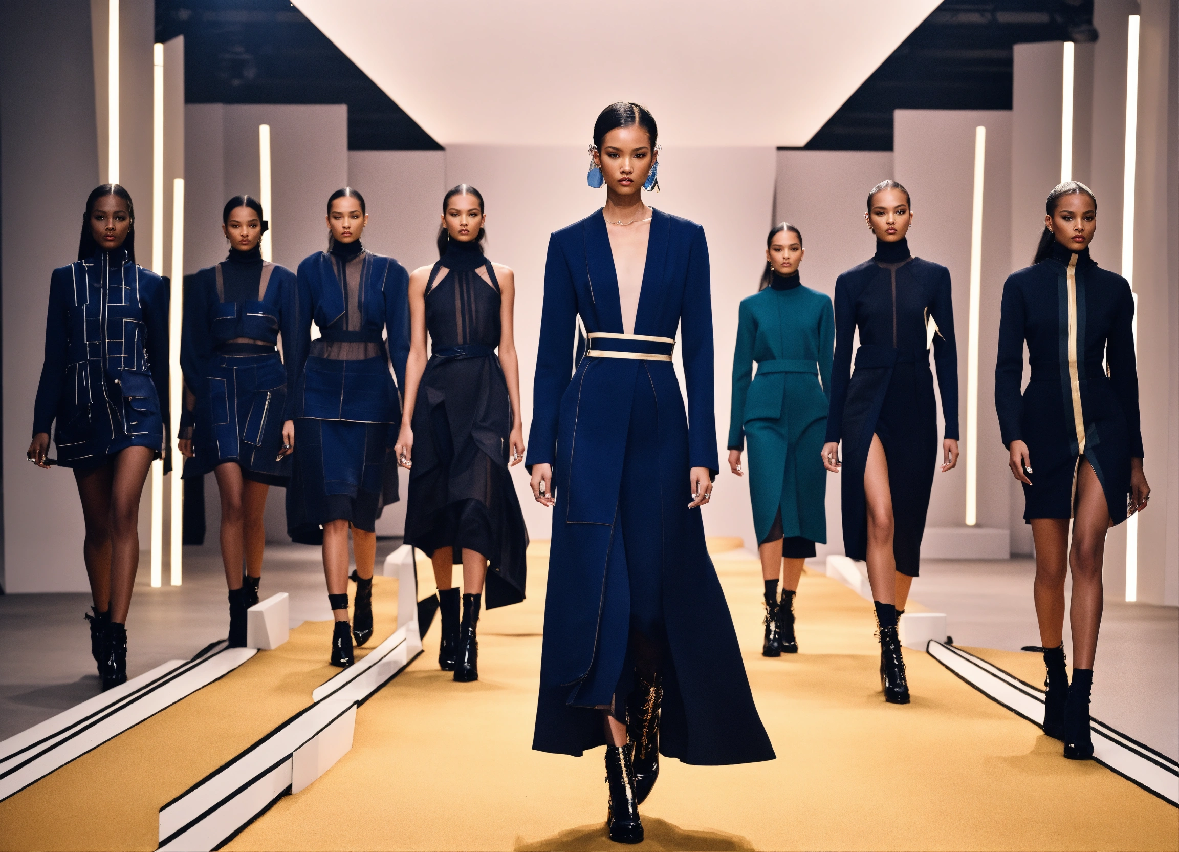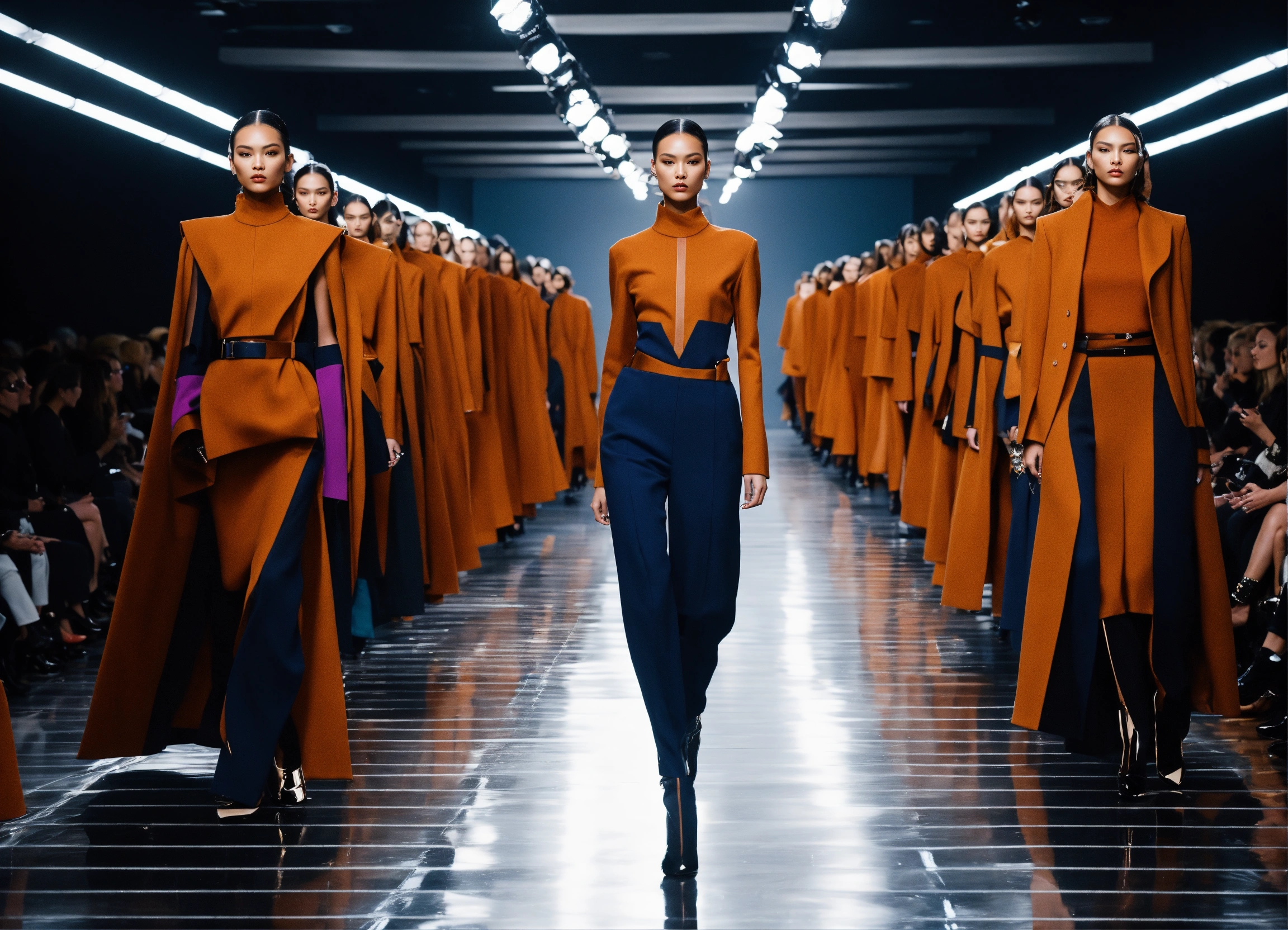 A womens streetwear runway showing off the expensive, chic, and trendy styles of the upcoming season in 2025. sketch, photography, or 3d rendering could all be appropriate techniques for this prompt. in a style reminiscent of futurism, with clean lines and a sleek aesthetic that reflects the modernity of the fashion industry. the fusion of contemporary and classic elements with a focus on geometric shapes and architectural fashion designs. a minimalist color palette, consisting of deep jewel tones, lending an air of elegance and sophistication to the scene. low key lighting to create clear and defined shadows, adding depth and drama to the runway presentation.