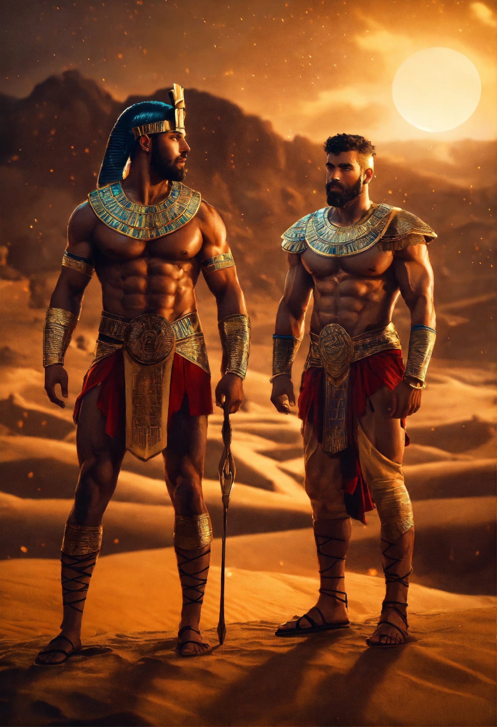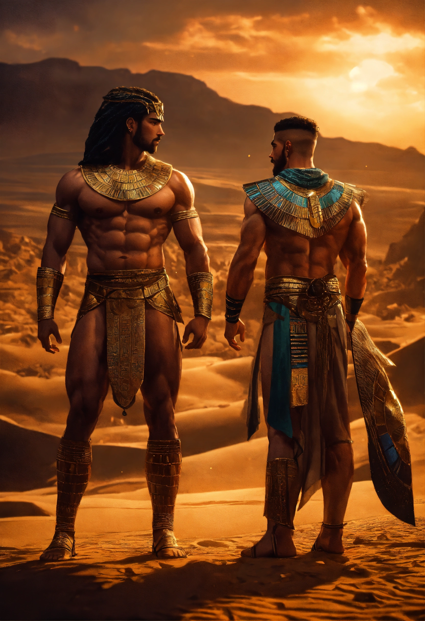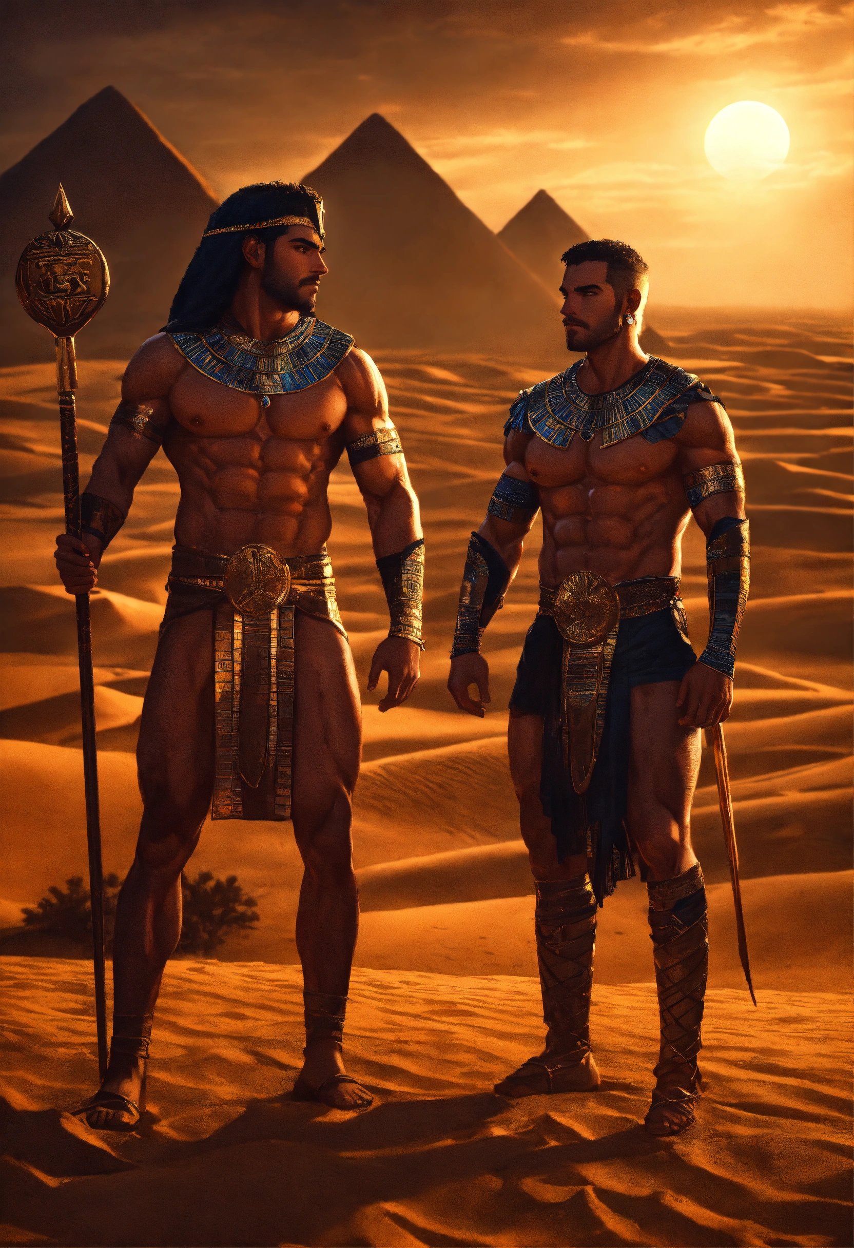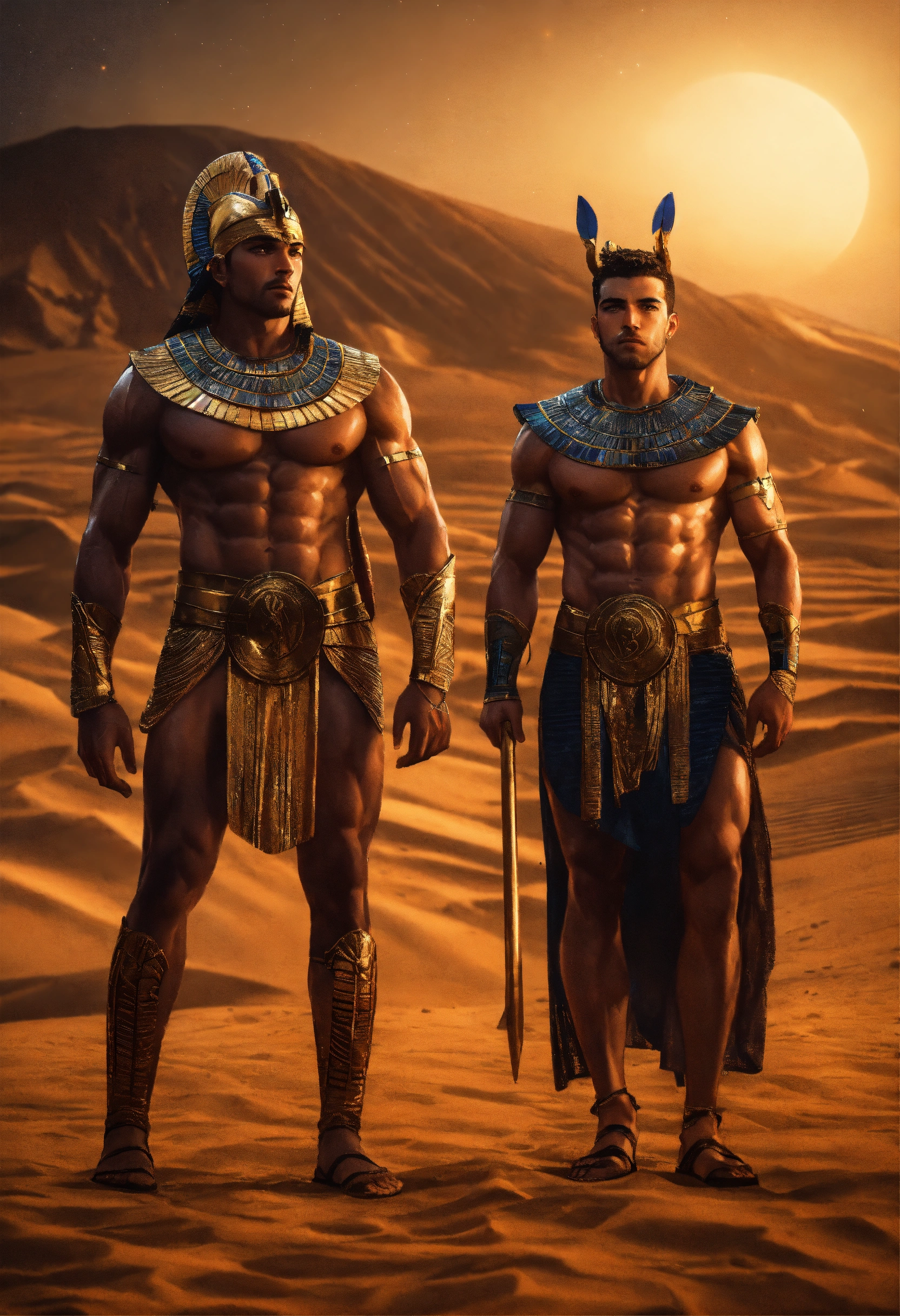 An epic fantasy scene in ancient egypt featuring two muscular male at night, in the desert, standing aside and watching at us. cinematic view, sharp detail.