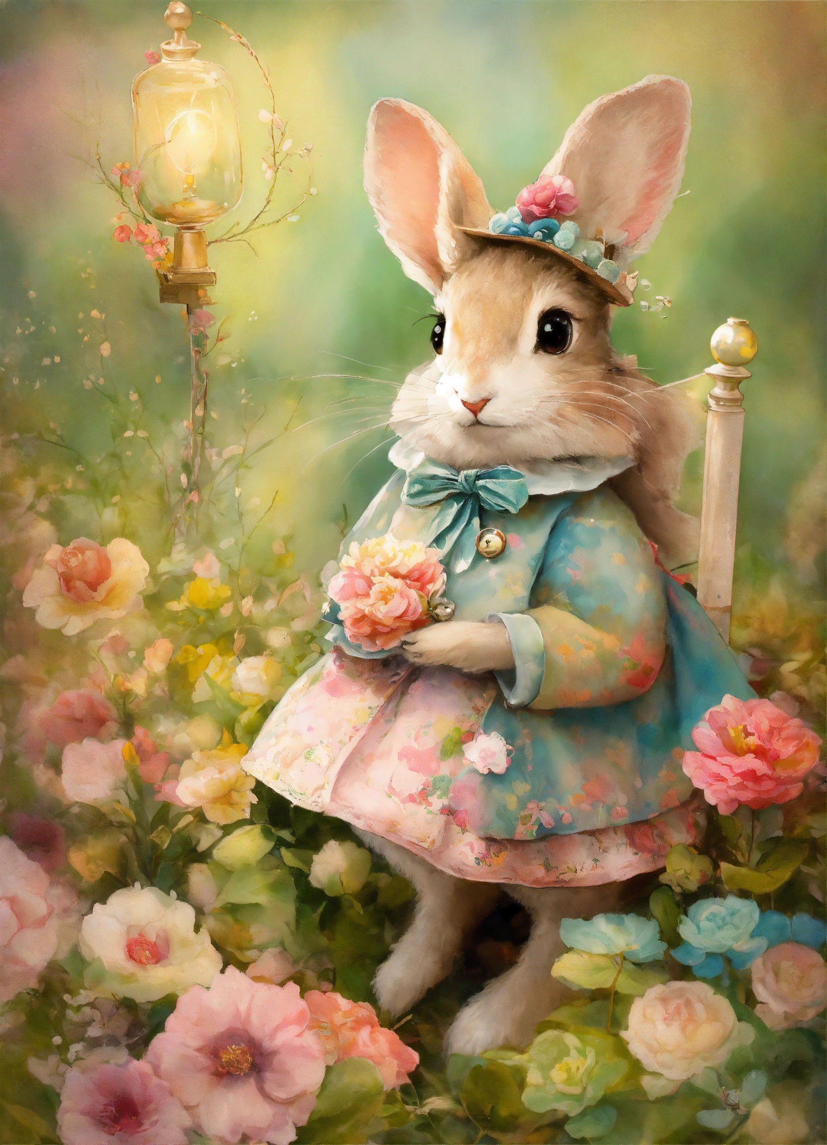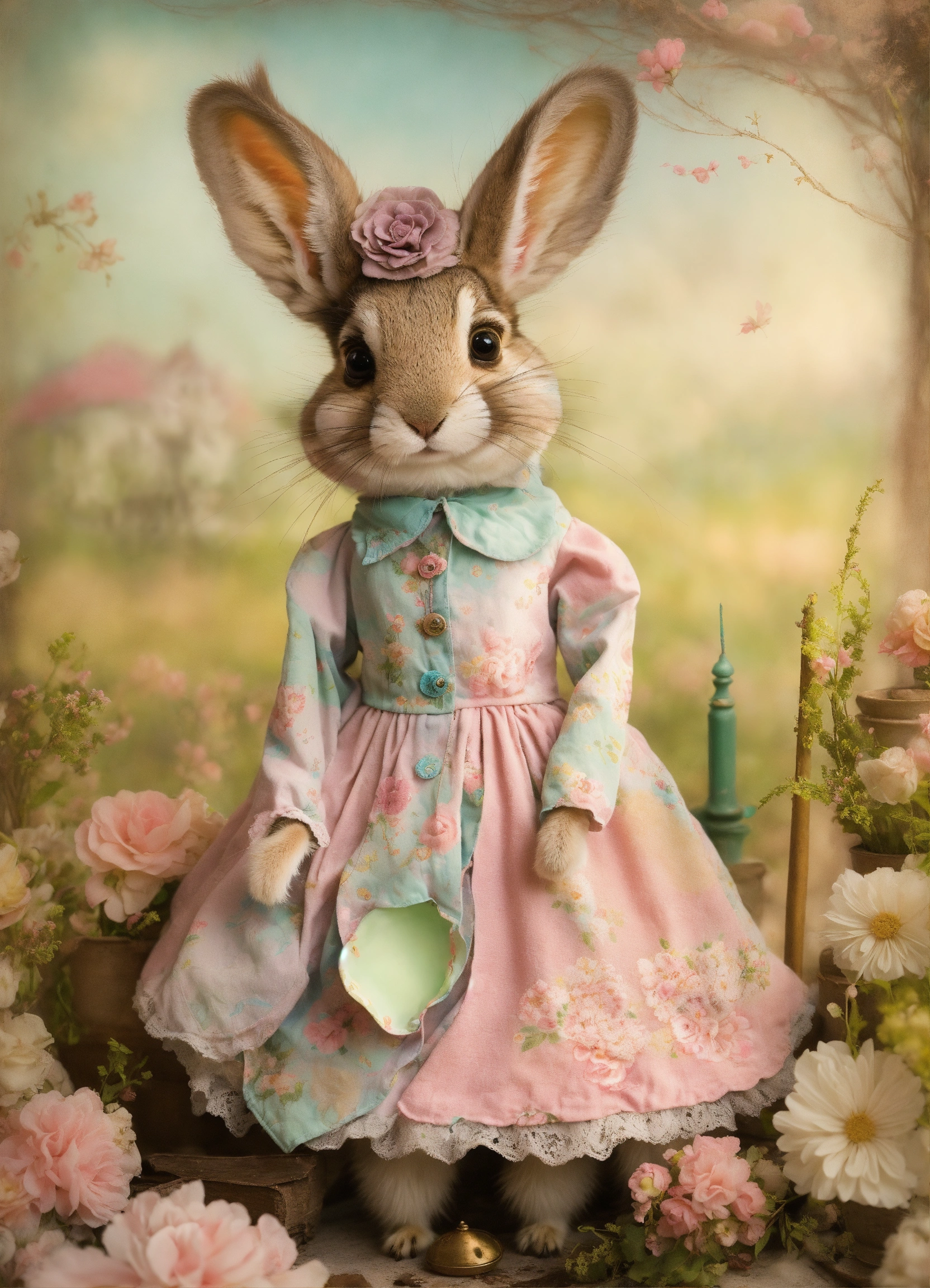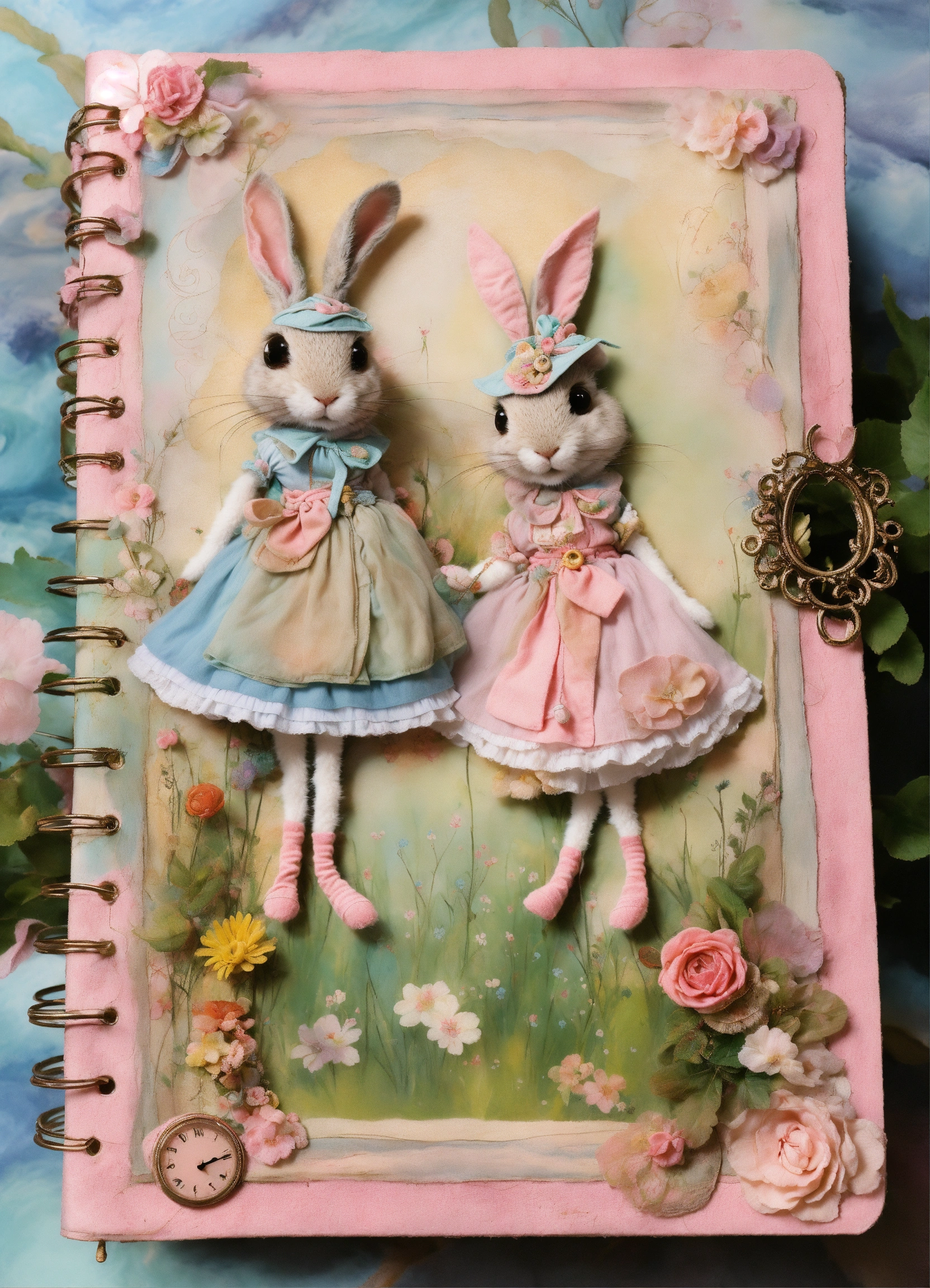 Shabby chic dreamy mist pastel junk journals whimsical cute quirky beatrix potter style "mopsy and cotton-tail" with big eyes in odd clothings, tamara laporte style, swirling magical fairytale abstract art style