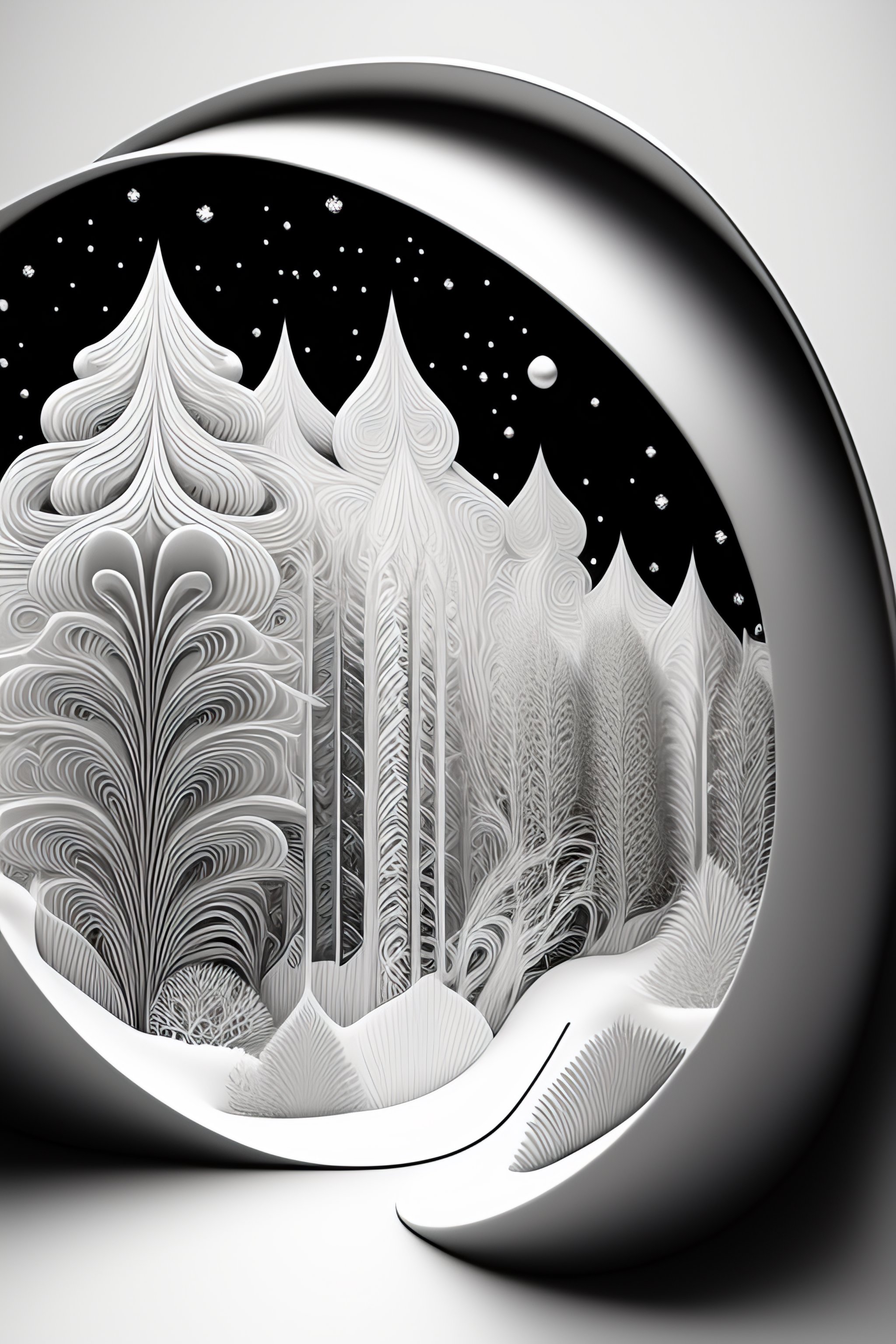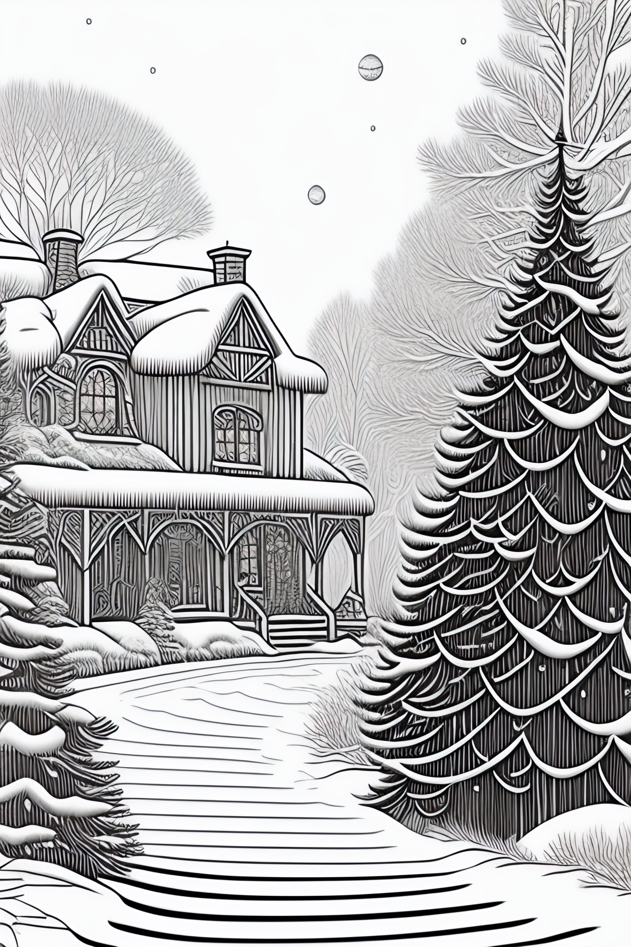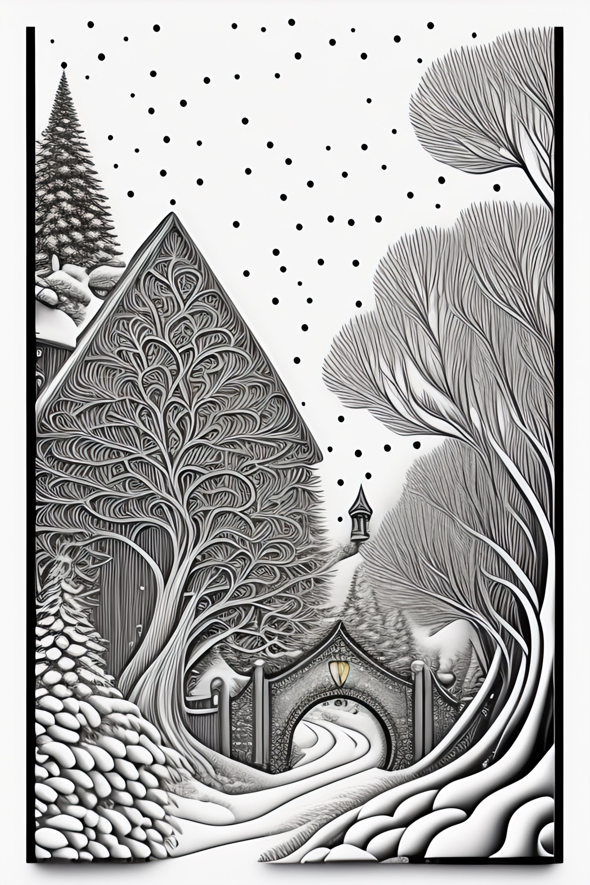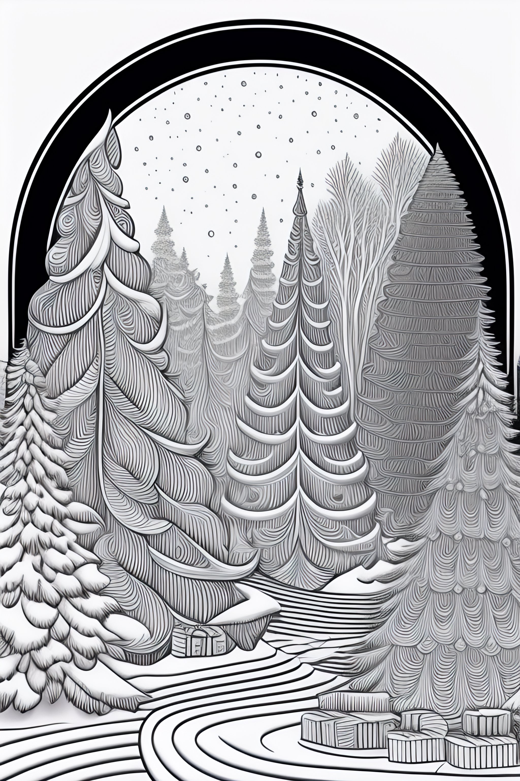 3d animation, relaxing winter, and christmas coloring page, fantasy, magical, mystical, unusual, black and white, wavy lines, realistic line art drawing, coloring book page, no noise, crisp thick lines, outline art, centered image, isolated on a white background --v 4 --ar 2:3
