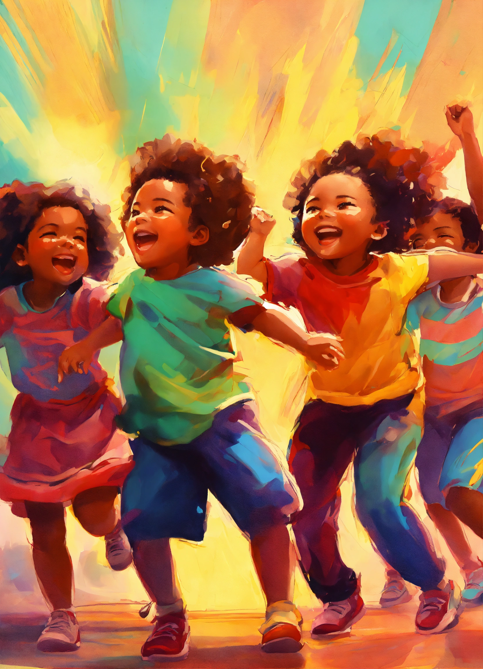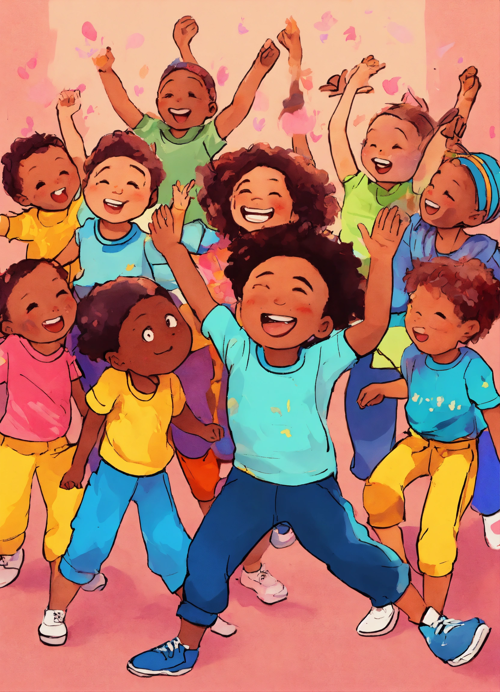 A hand drawn painting of a group of multiracial children, dancing with happiness, 4k, sharp, vibrant, lively