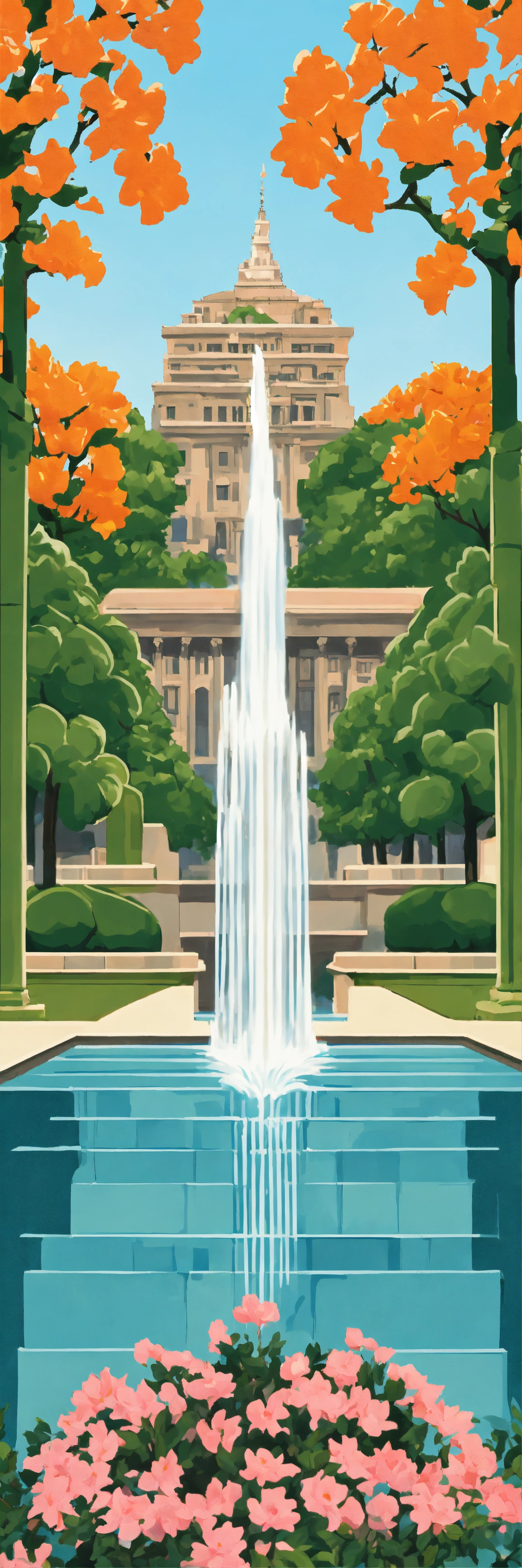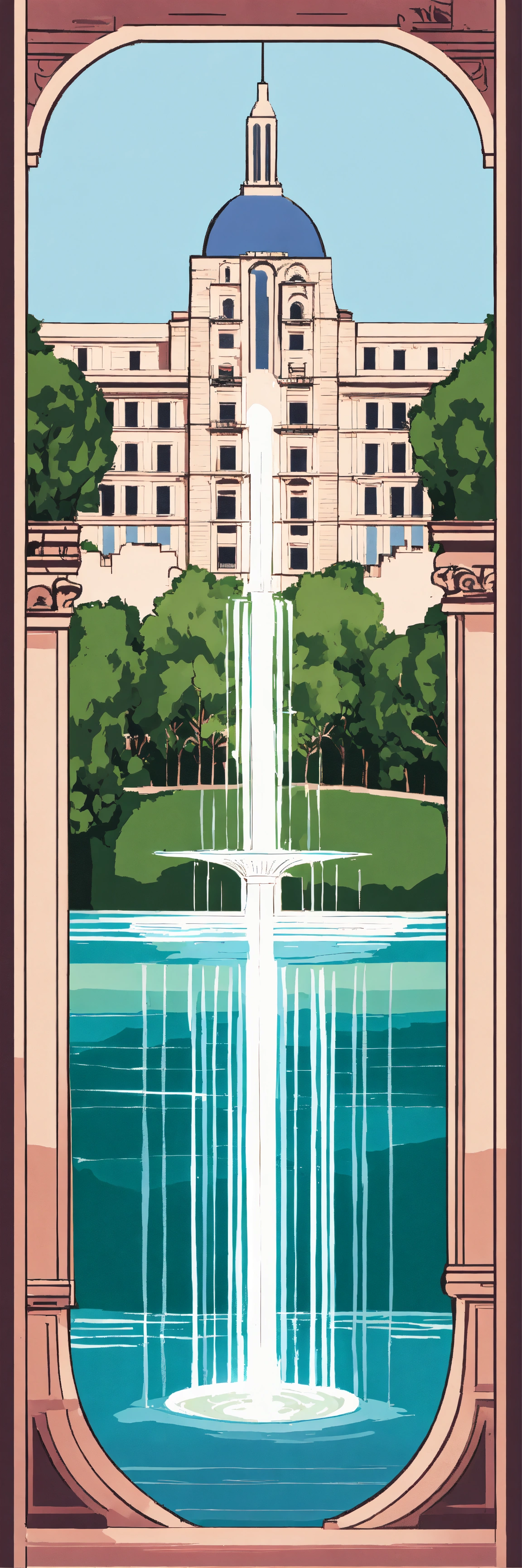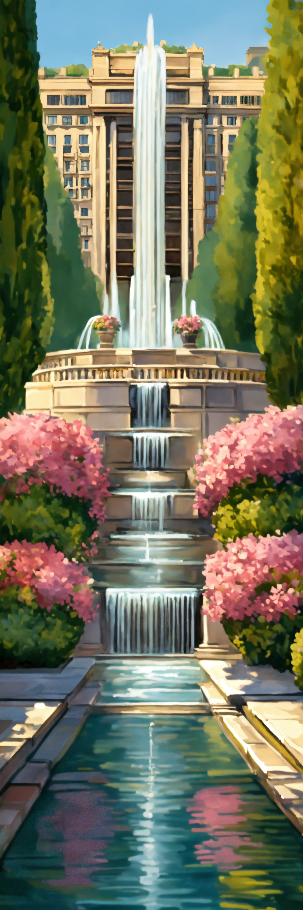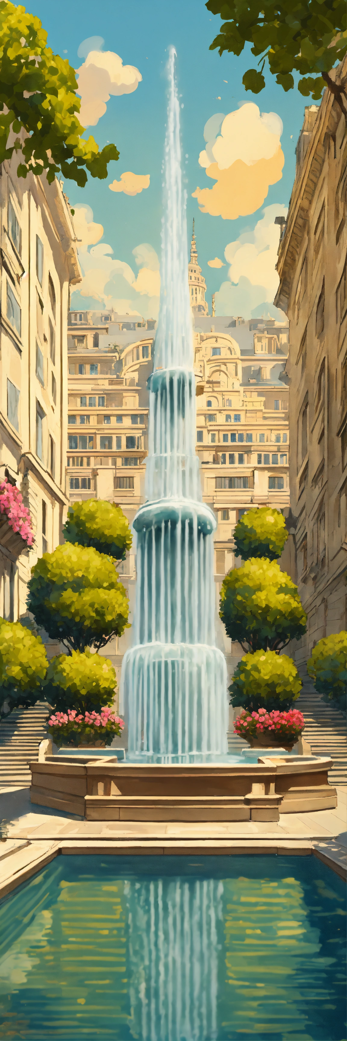 Water falls, the geneva water fountain jet d’eau, cypress trees tall, flowers, art deco pattern maze, pool canal, ornade sculpted stone masonry haussmannian parisian style empire state building with french roof tops, hérgé style illustration, symmetrical symmetry, spanish steps staircase, pillers, hanging gardens, bridges