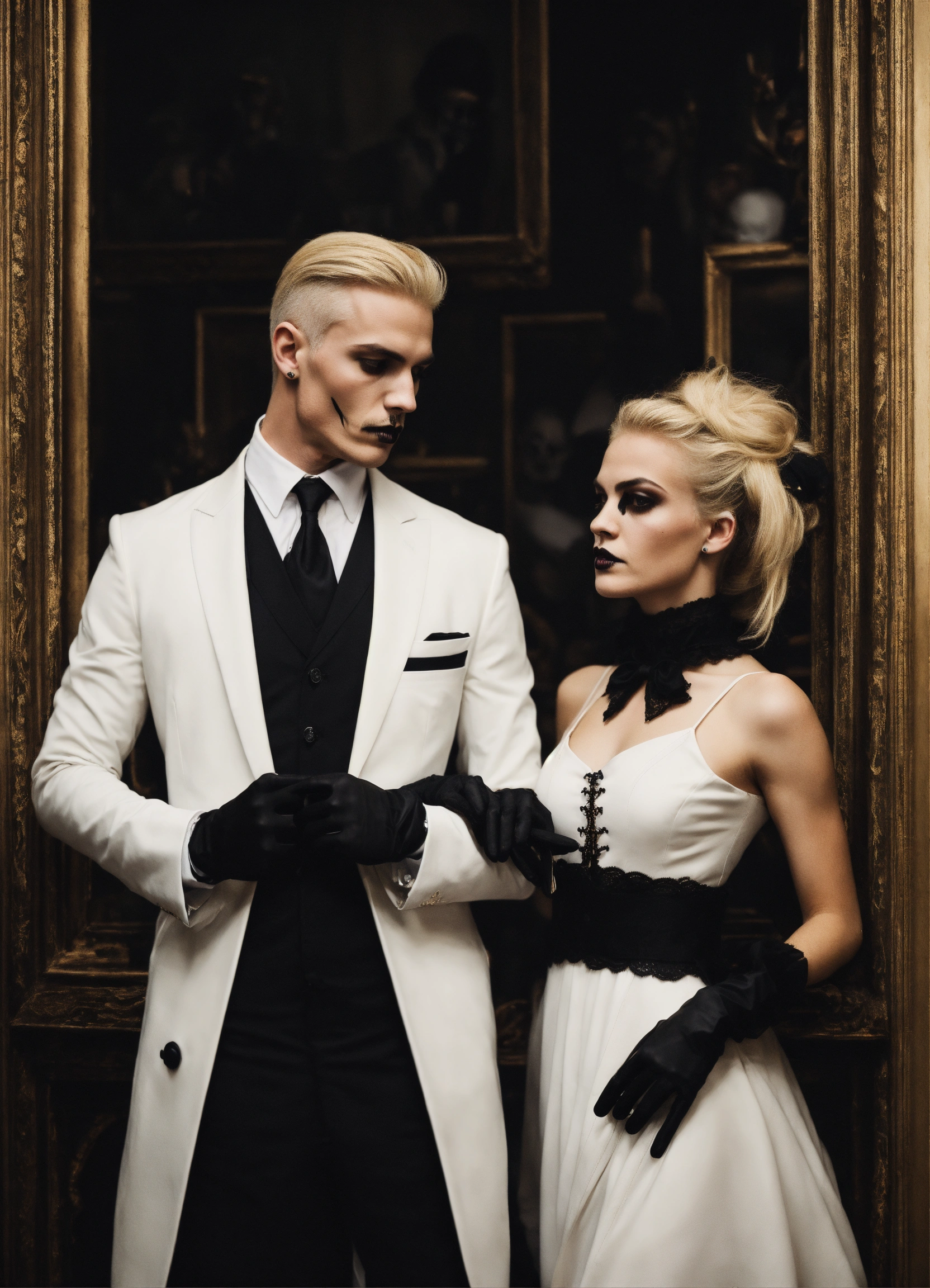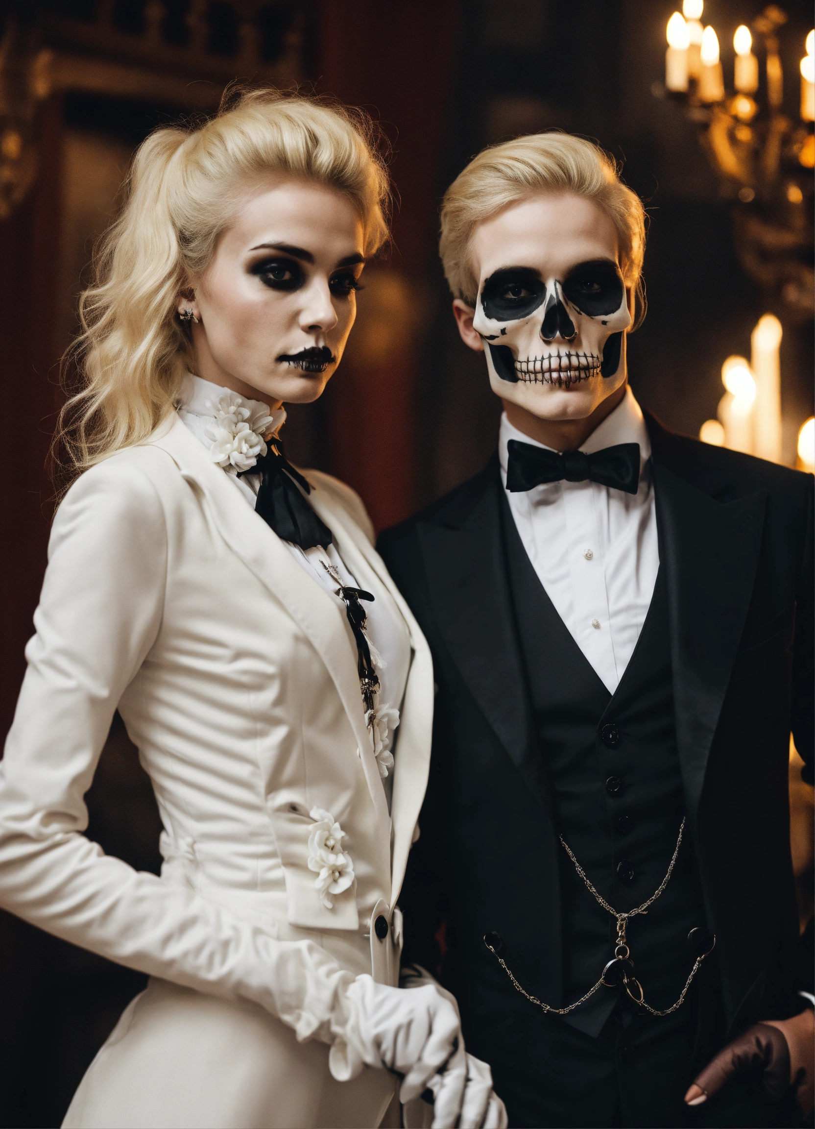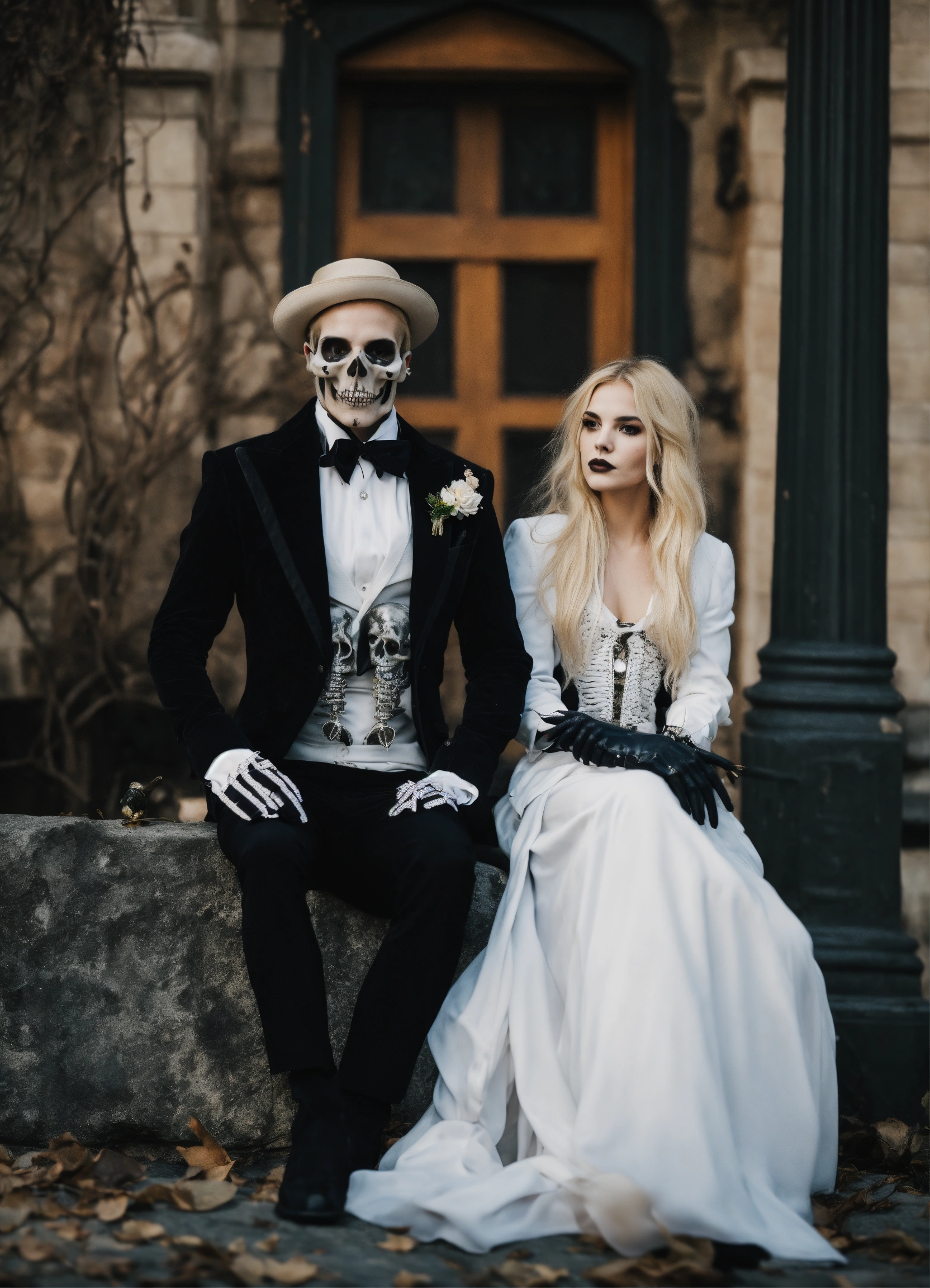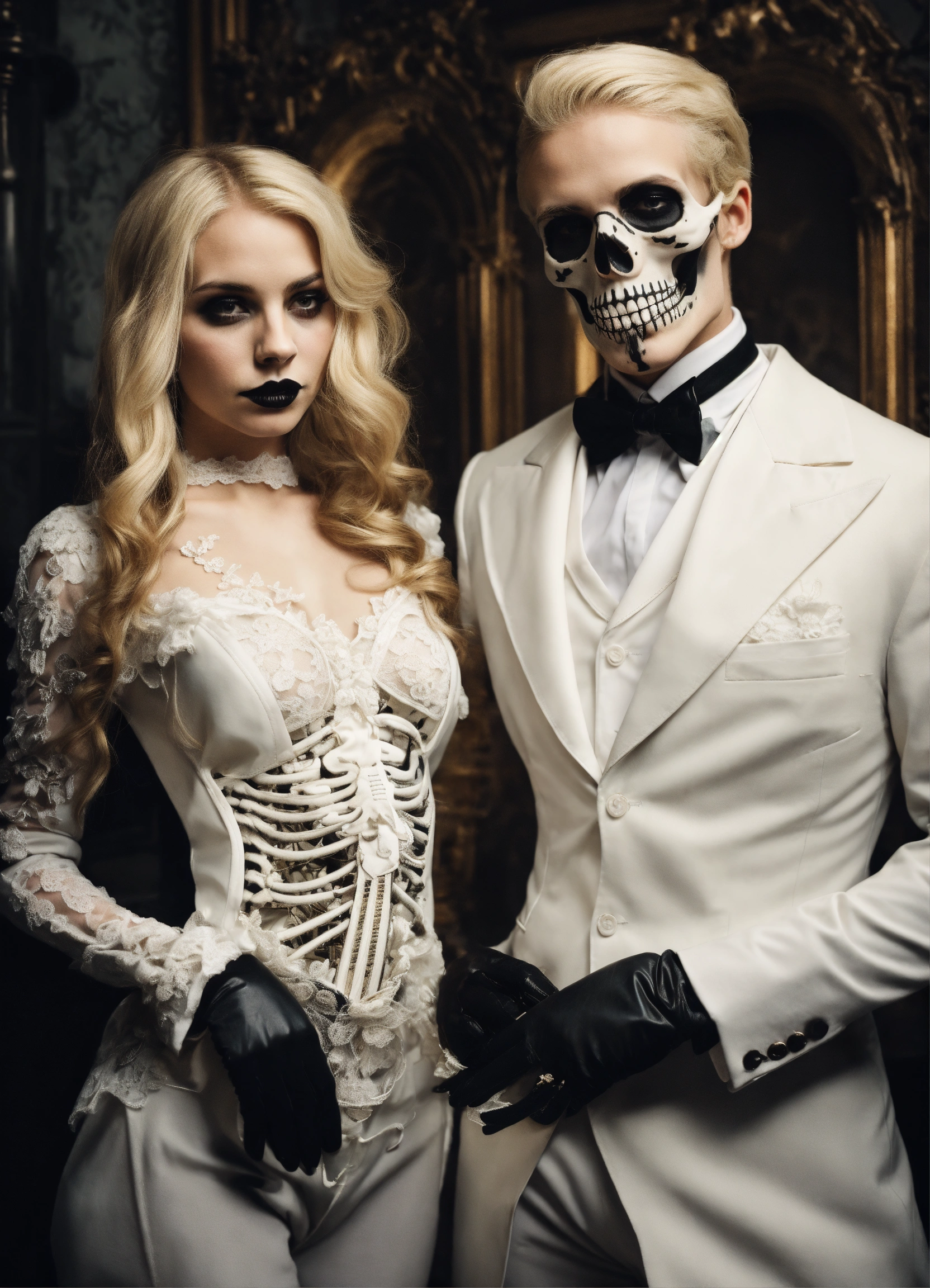 Gothic skeleton gentleman and blonde girl in a white suit and black gloves