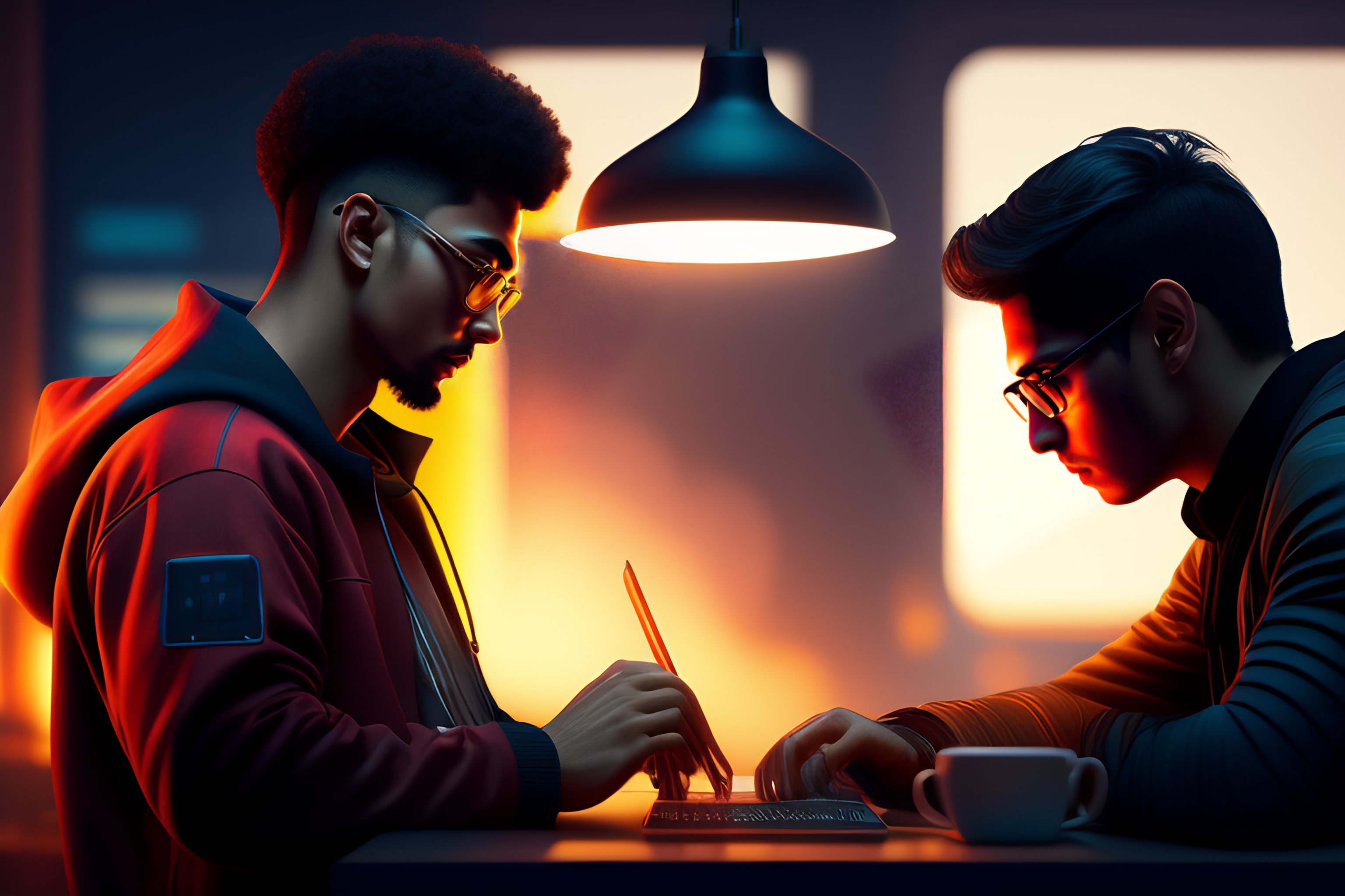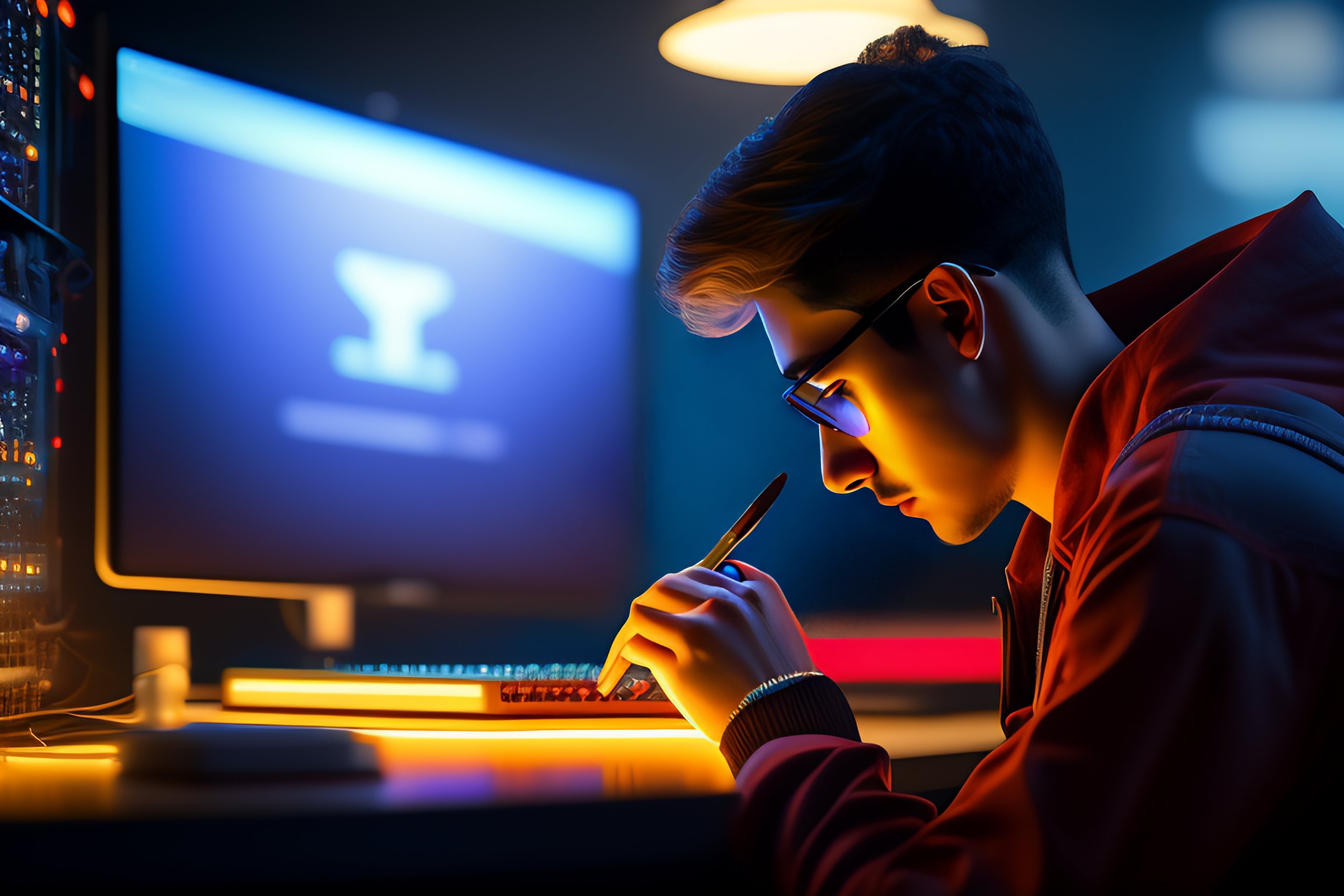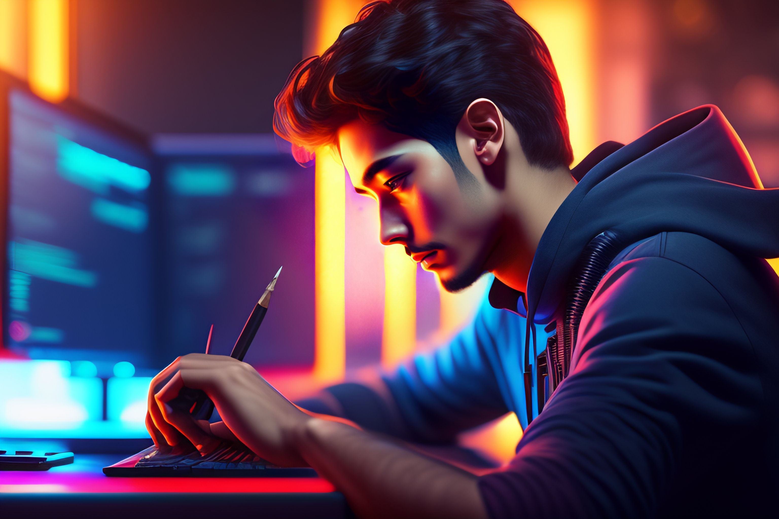 A college aged hacker studiously working on his computer, highly detailed, digital painting, artstation, concept art, matte painting, smooth, sharp focus, illustration, art by cristi balanescu and randy vargas, magali villeneuve, 8 k, techno cyberpunk futuristic, colorful background, concept art, digital painting, fantasy, photo realism, cinematic lighting, intricate, --v 4 --ar 3:2