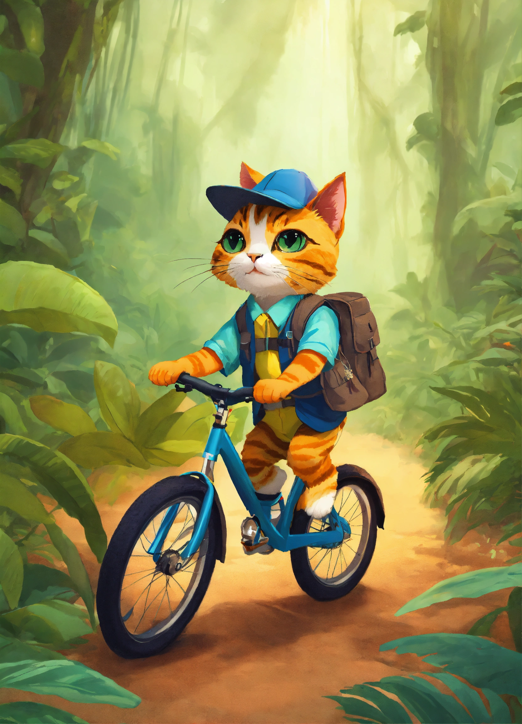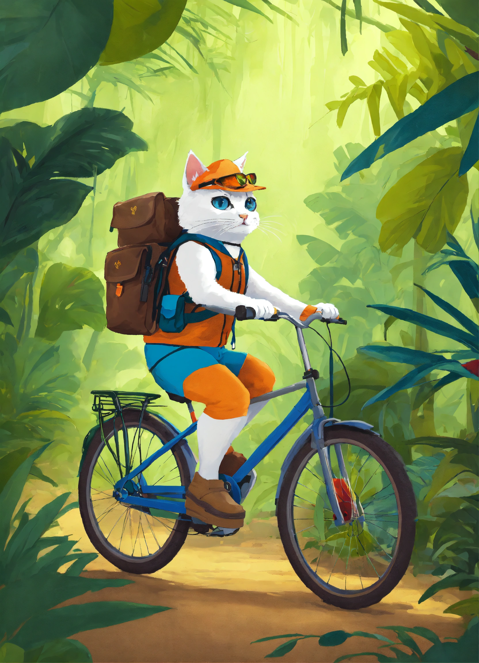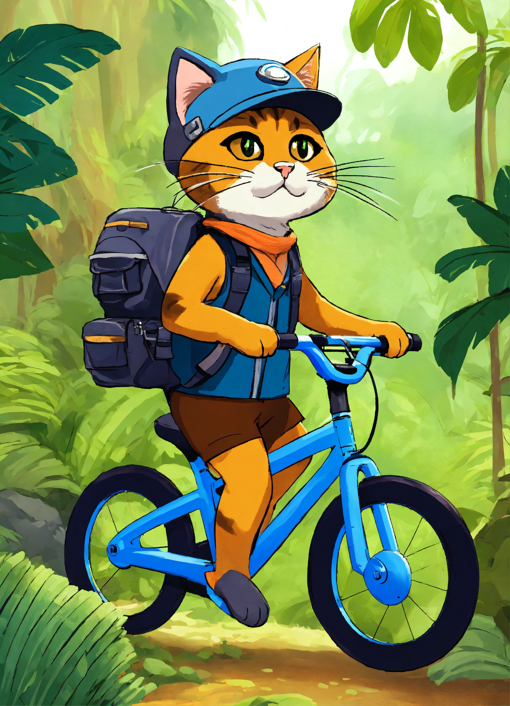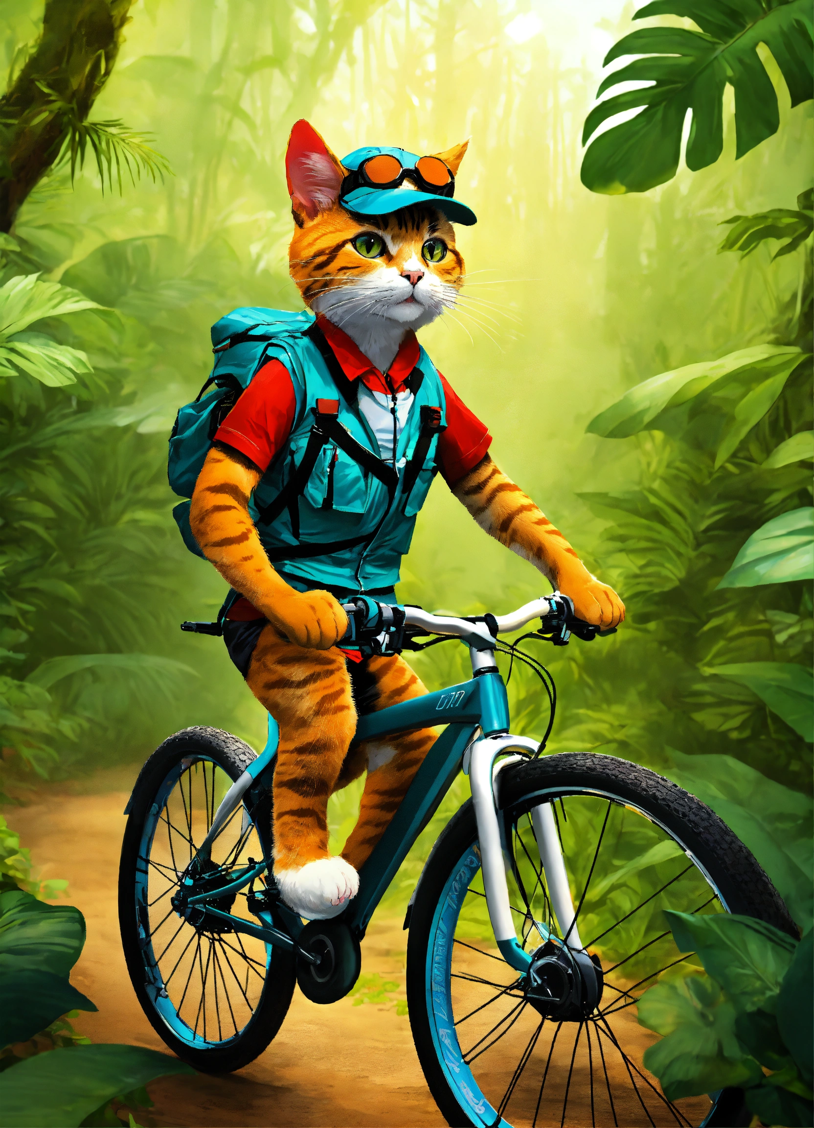 Design a picture of a cat biking through a tropical jungle in an adventurer costume. the cat is wearing an exploration hat, a vest with pockets, and shorts.