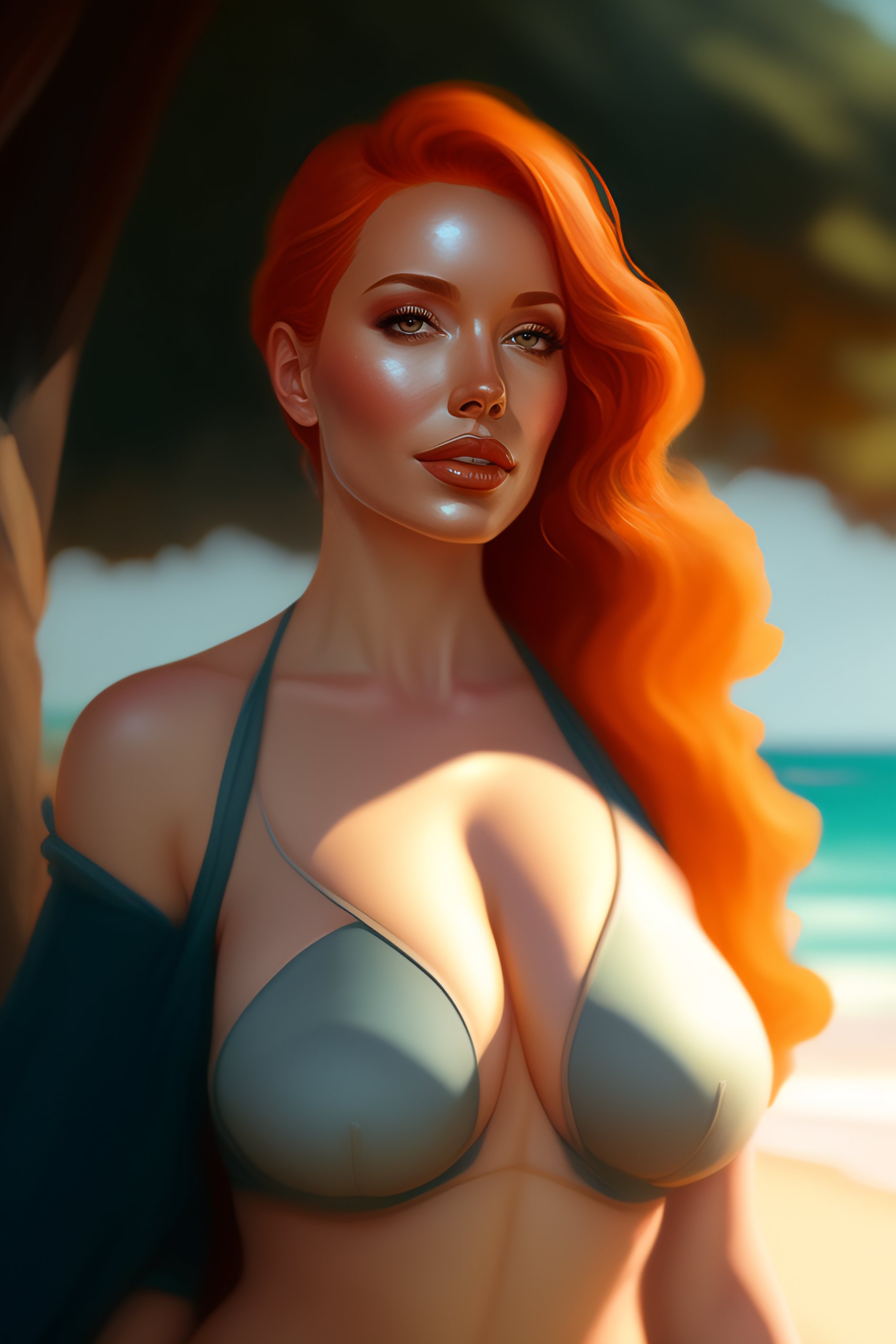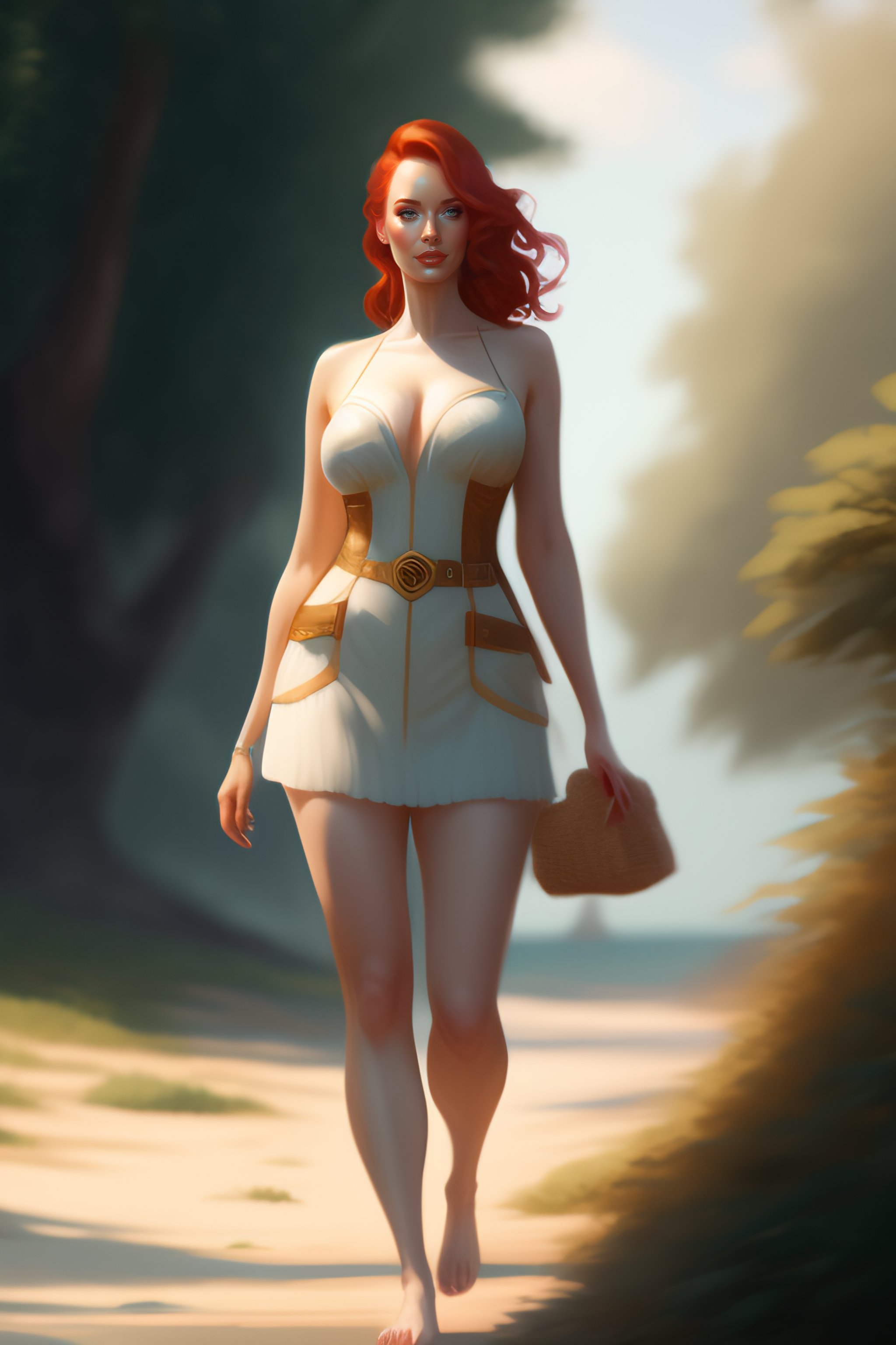 Christina hendricks walking to pool, full body, swimsuit, barefoot, feet, ultrarealism, jordan grimmer, greg rutkowski, artgerm, artstation