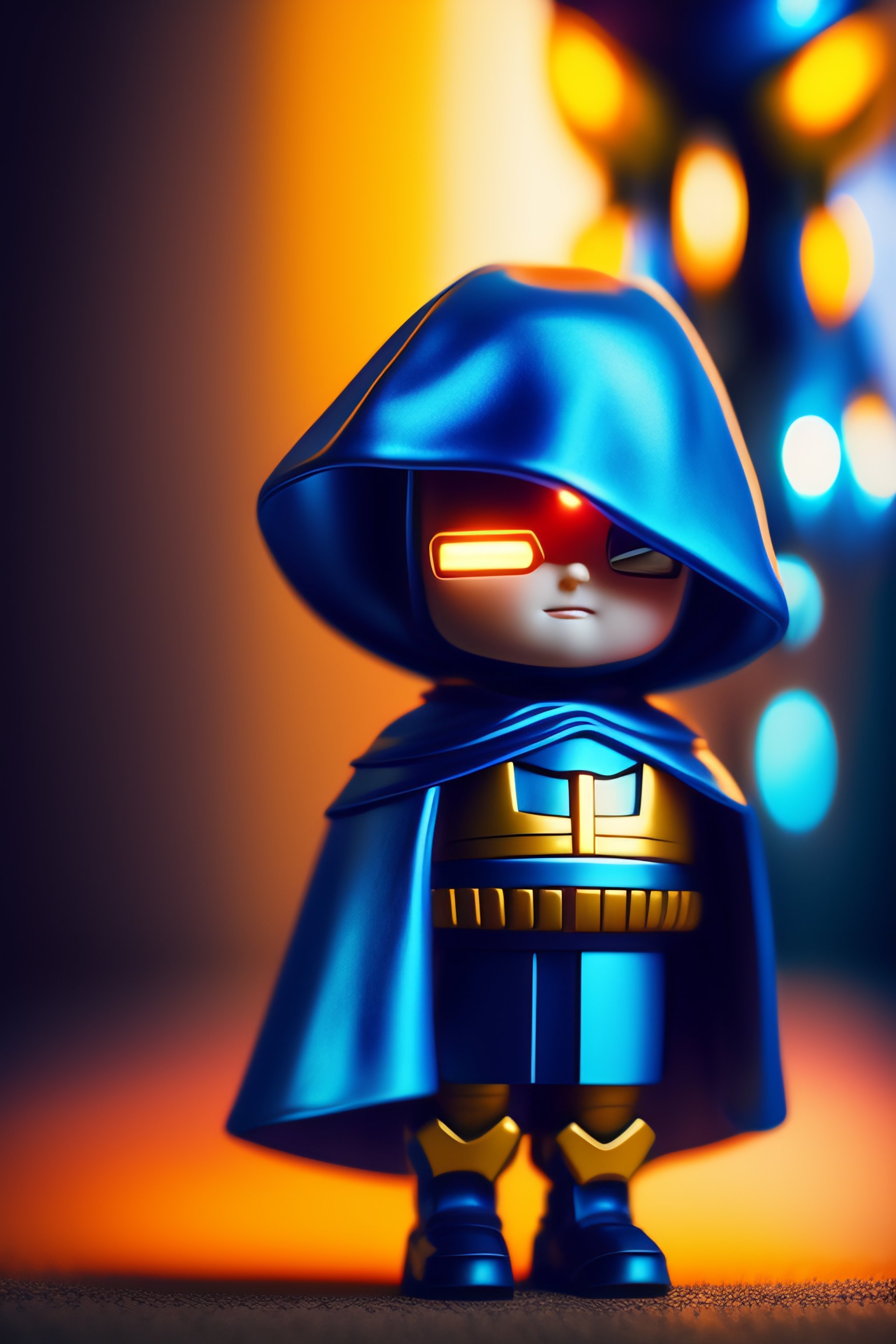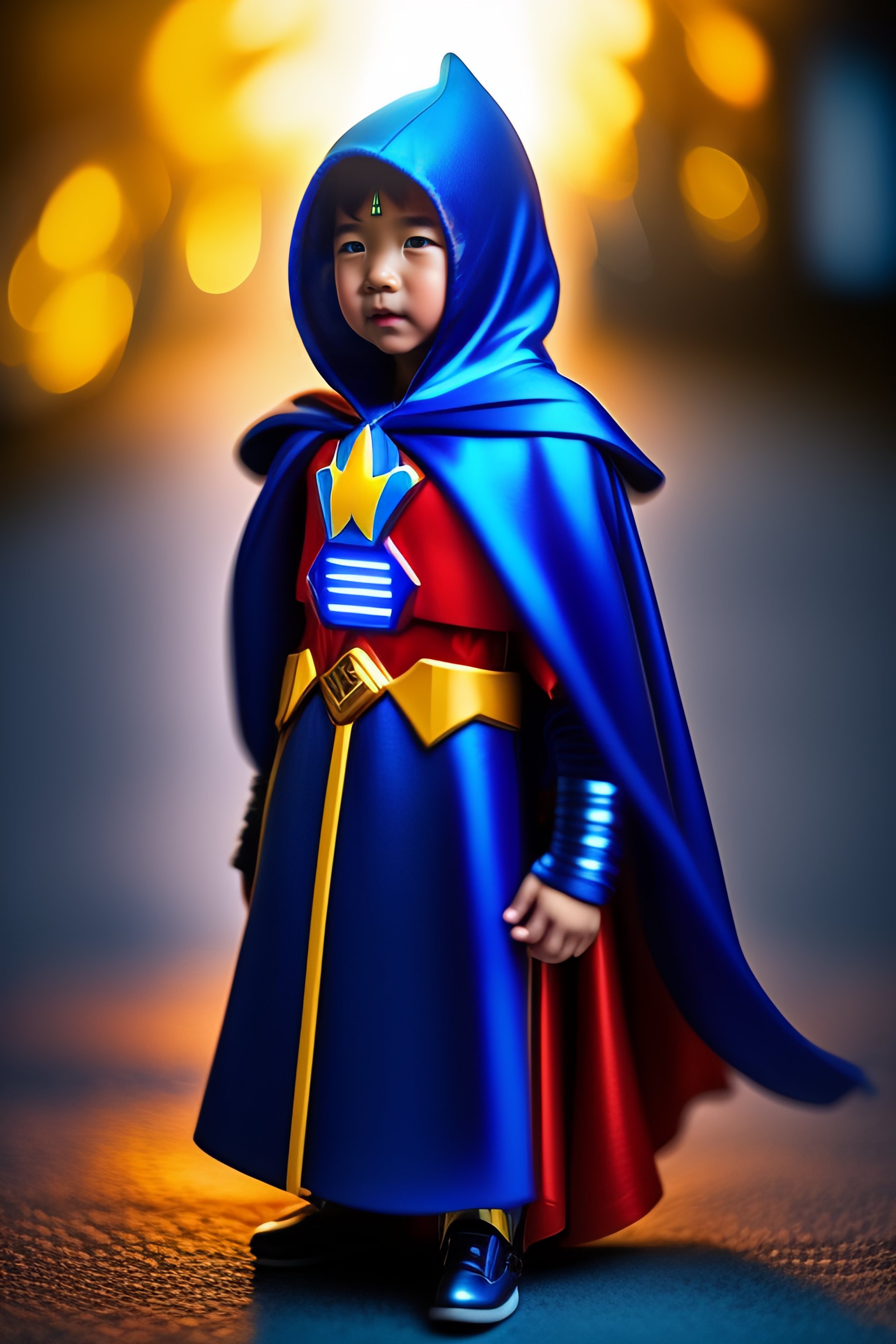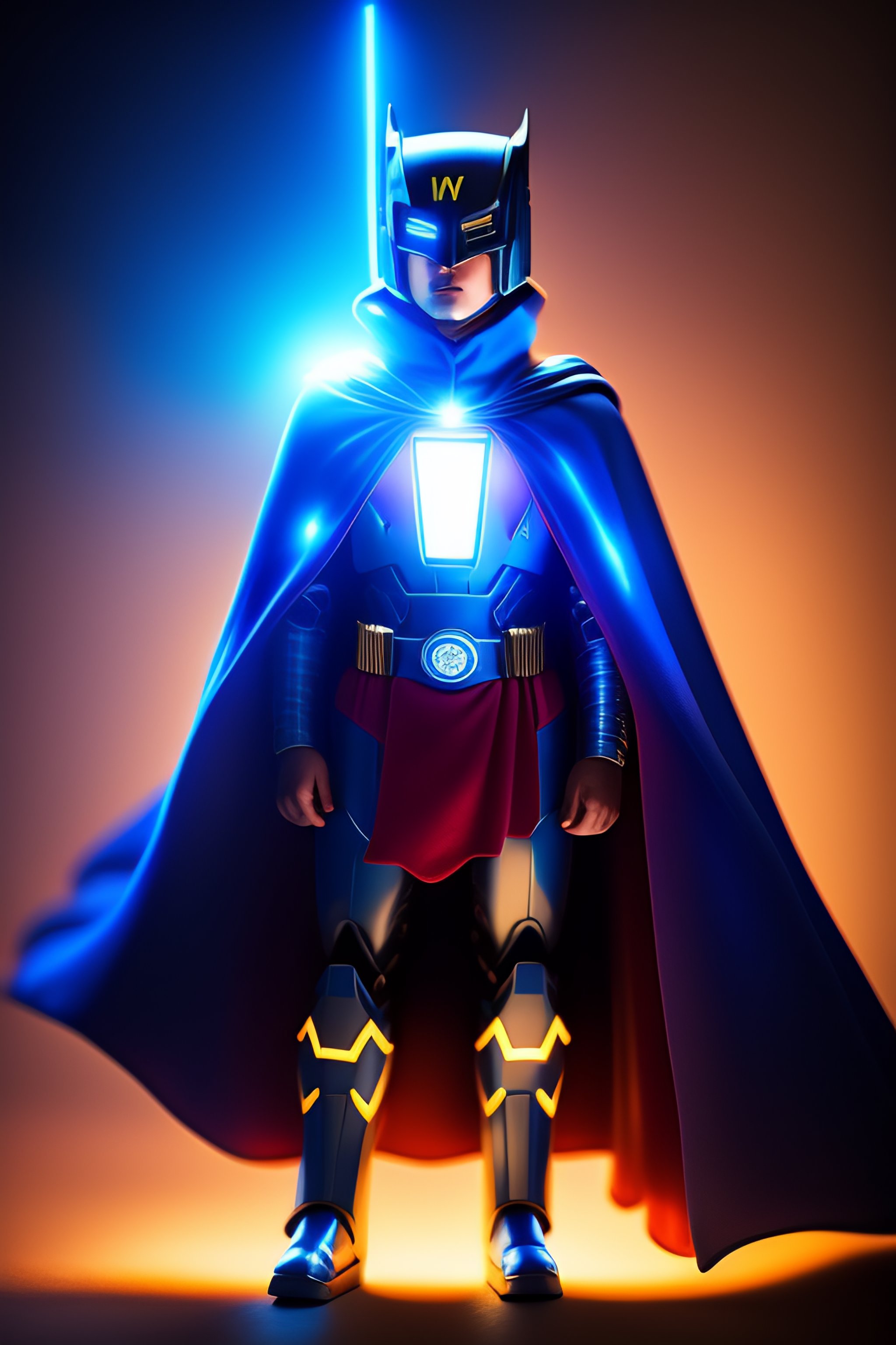 Superhero wearing blue cape, lighting bolt, standing, facing camera, robot head, transformers, studio ghibli