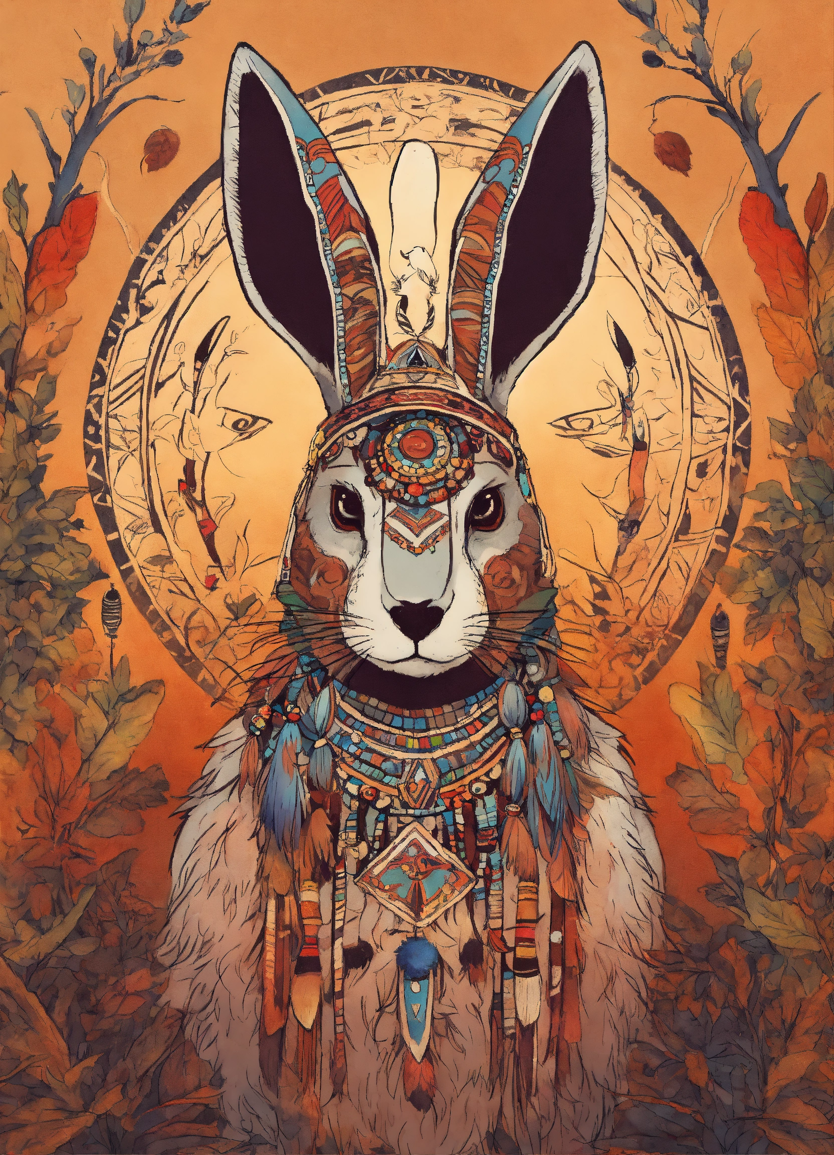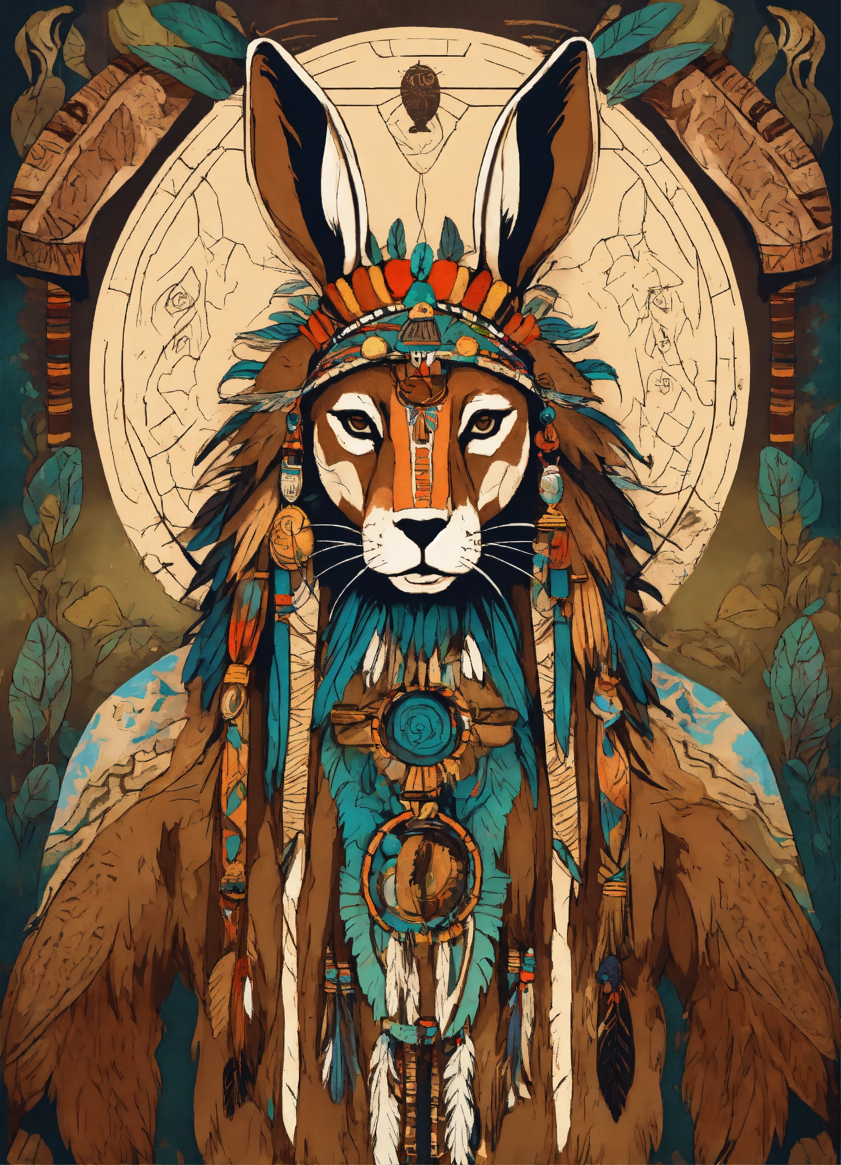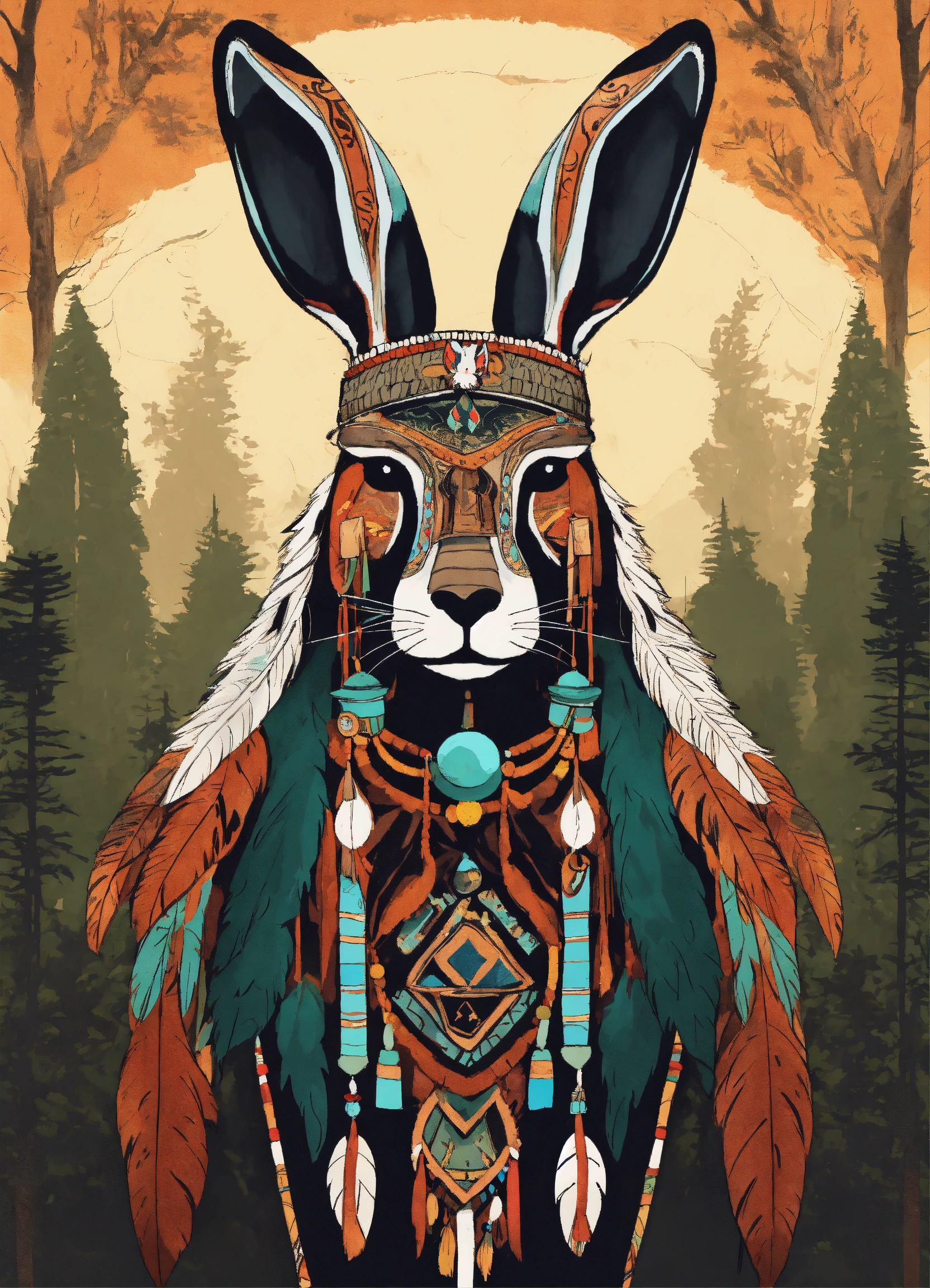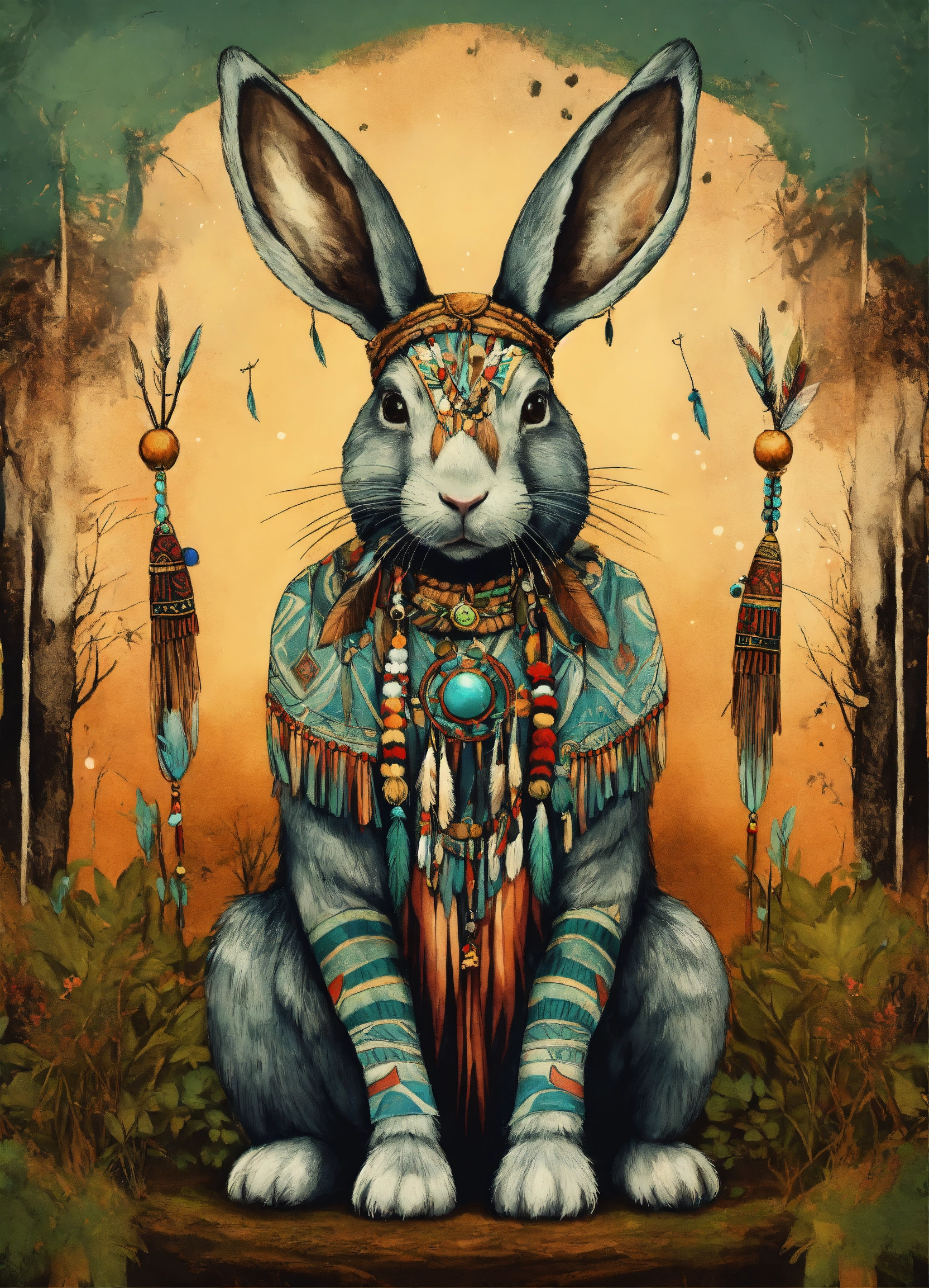 Ancestral rabbit shaman, antropomorph, animal, native american style drawing, ancient forest background