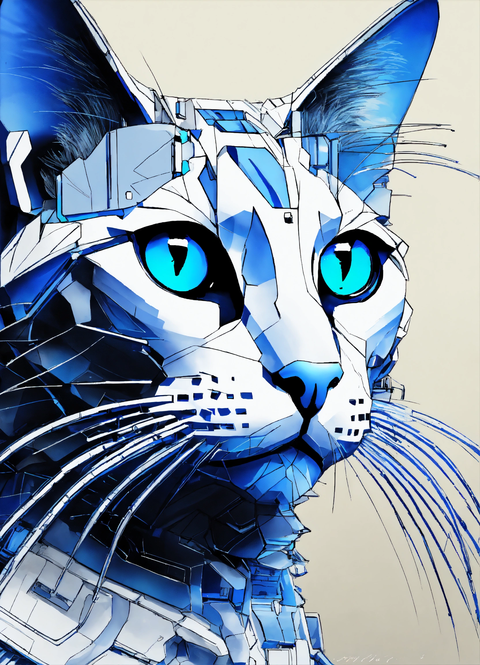 Of a cybernetic face cat realist 16k, technical drawings viewed from the front and side on light white paper with bold background text like "caterpillar", the cat eyes should be blue in color, poster.