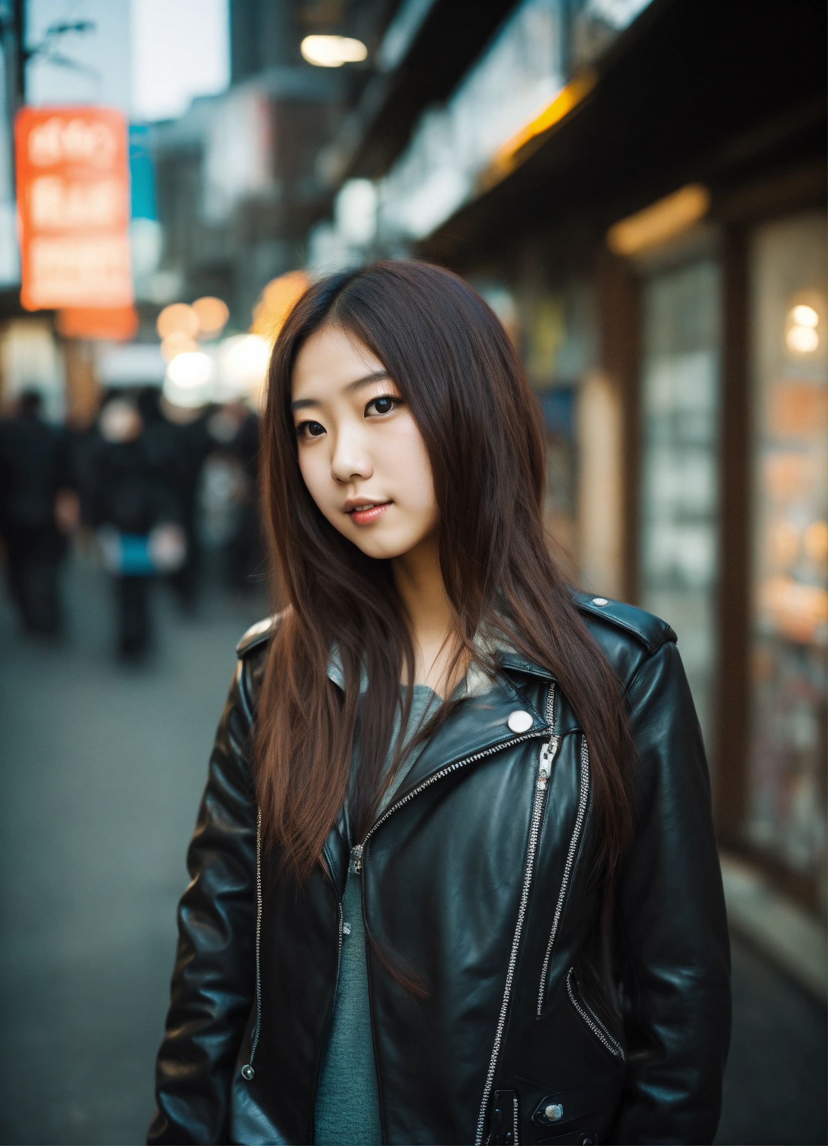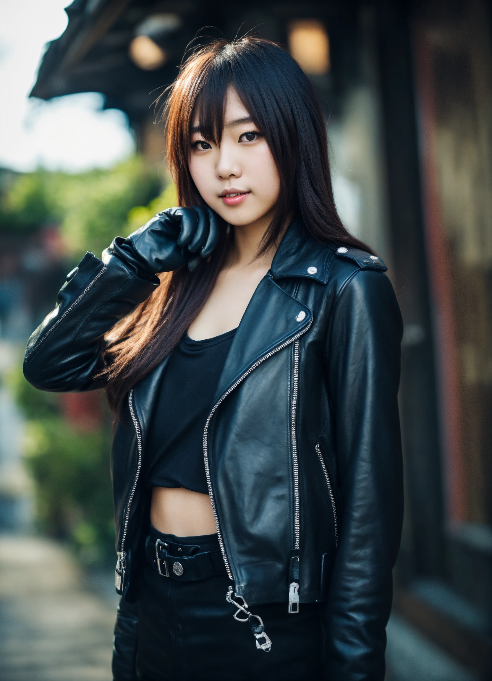 A beautuful young japaneze kawaii girk wearing, long hair, urban enviroment, daylight, full body, black leather jacket and gloves