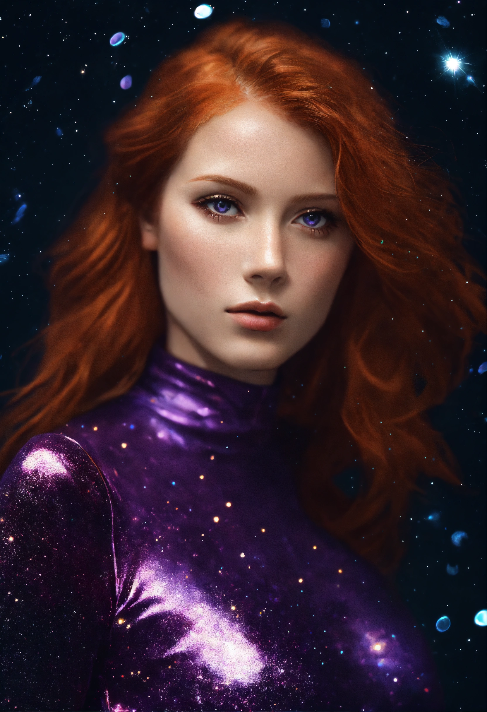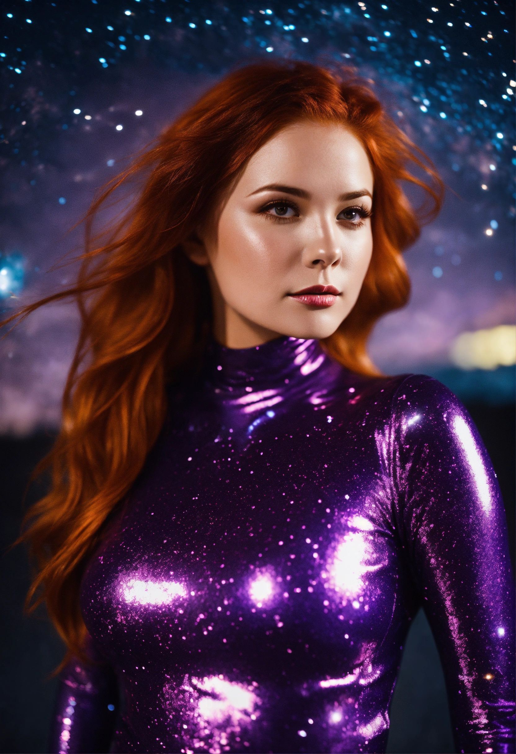 A cute 28 year old red head girl wearing a open purple/glitter catsuit, in the sky we see the milky-way