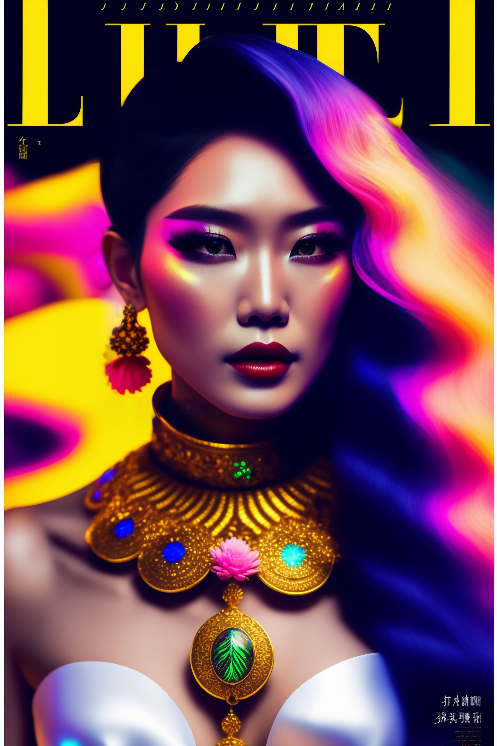 Fashion huge japan magazine headline front page, beuty girl in dress tattoos ornate, neon glow around hair, neon jungle, chrysanthemum blossom time glossy white + black + gold + highly detailed, ultra realistic, unreal engine 5, realistic cgi, 32k