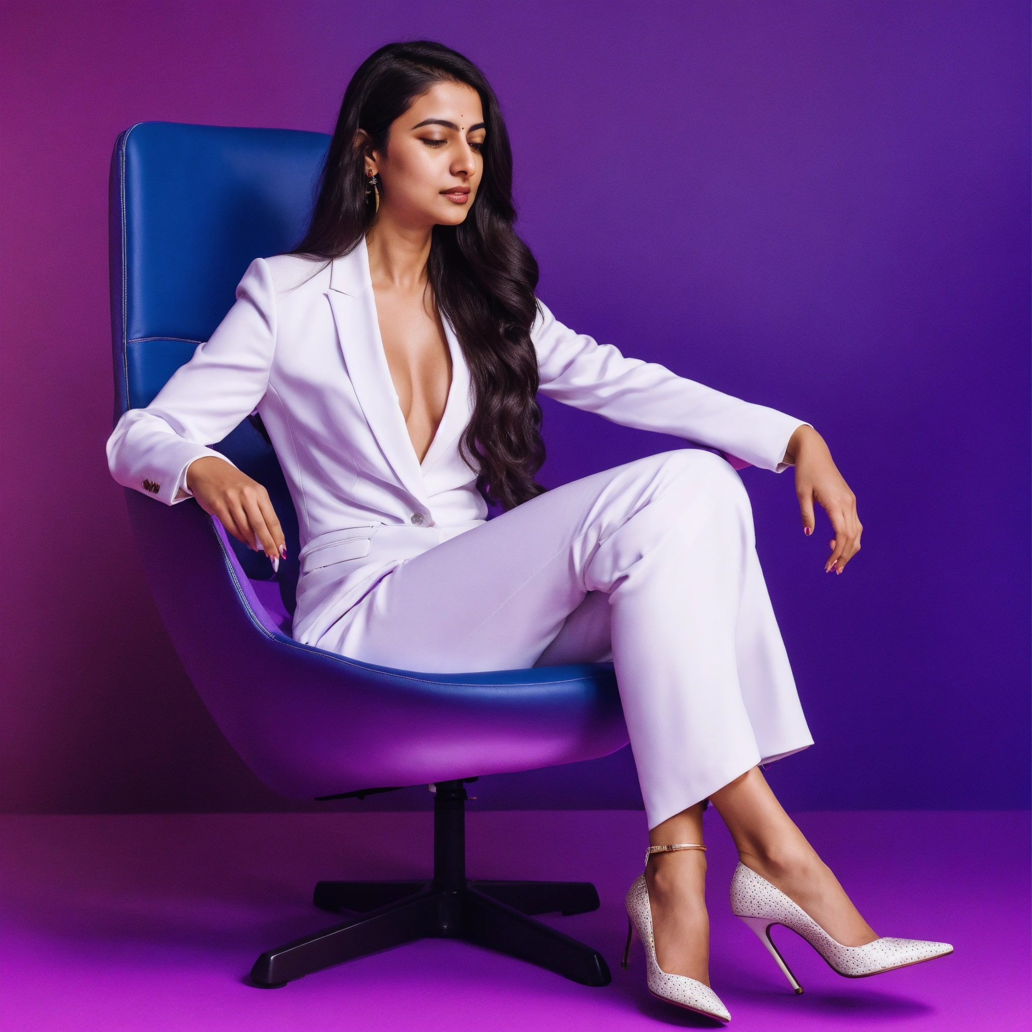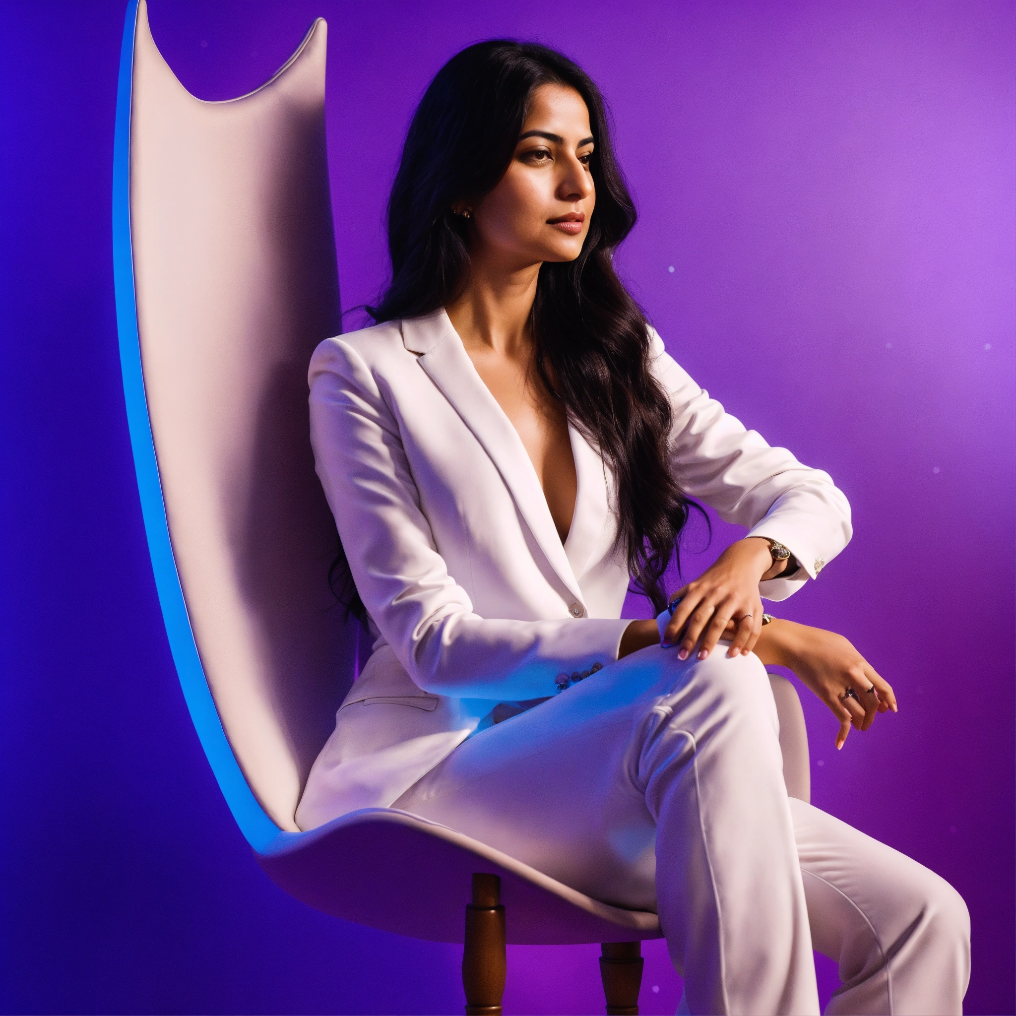 Ravshana kurkova with long dark hair sits comfortably in a chair, smart, attractive, in an elegant white suit, back view, beautiful, perfect composition, purple background, points with her hand at augmented reality, from the side, relaxing