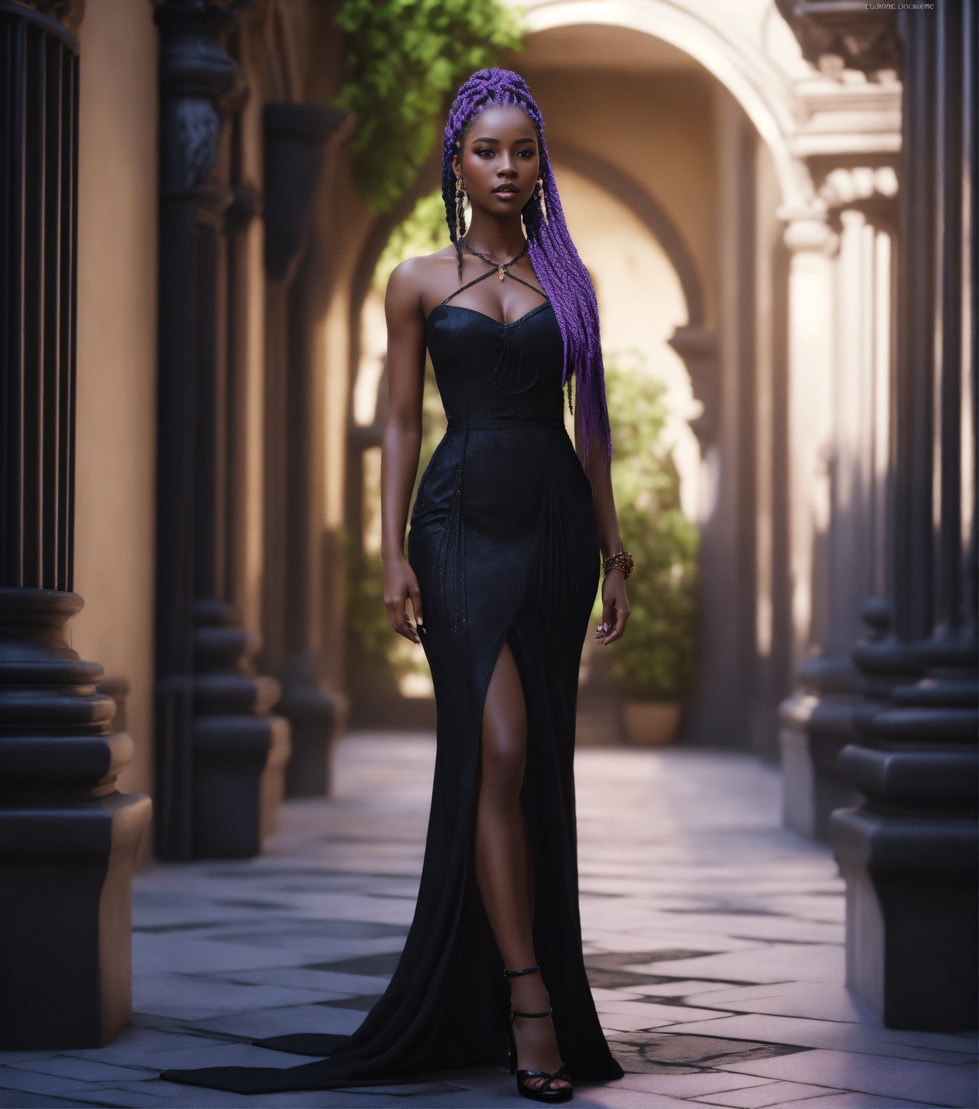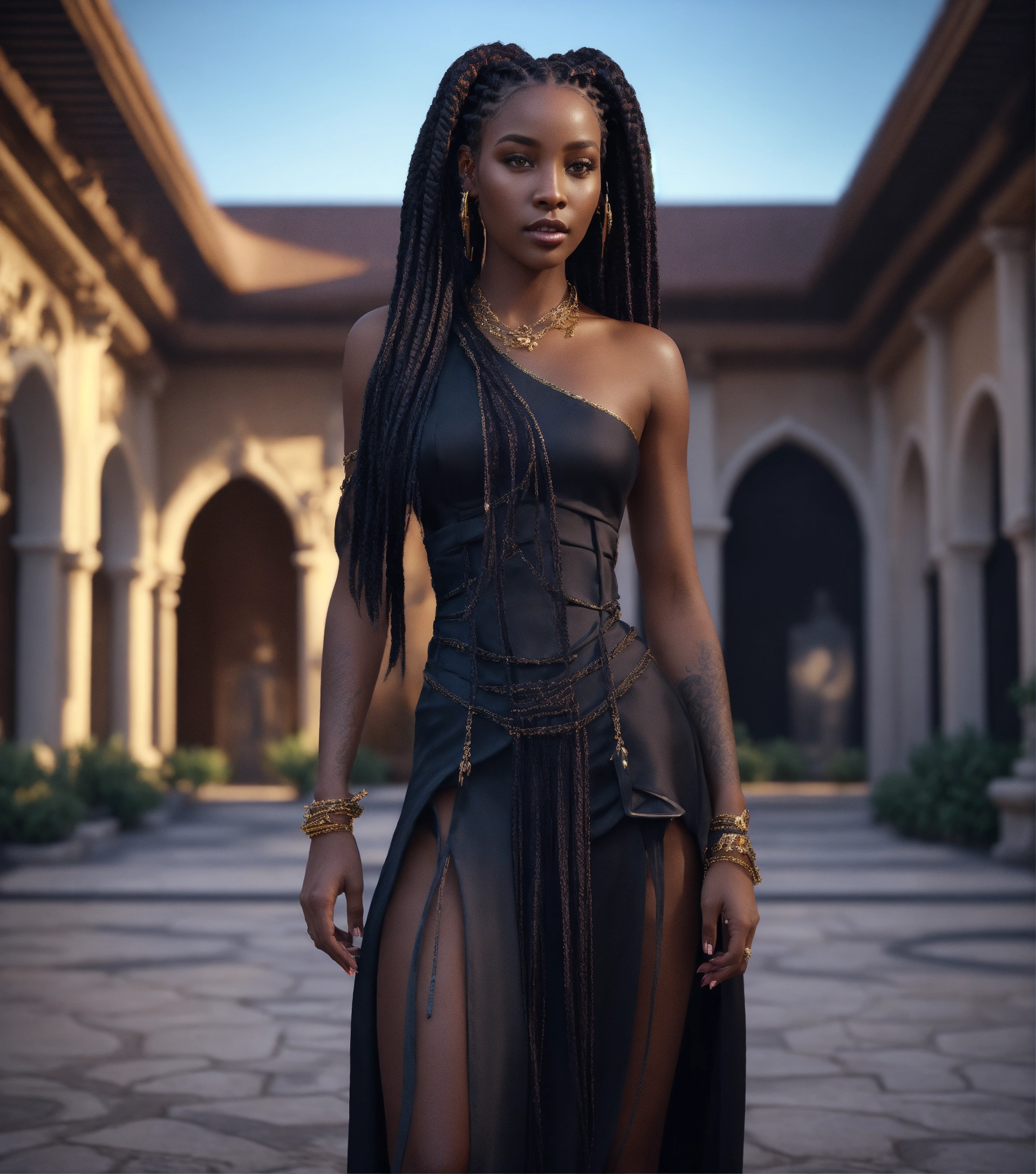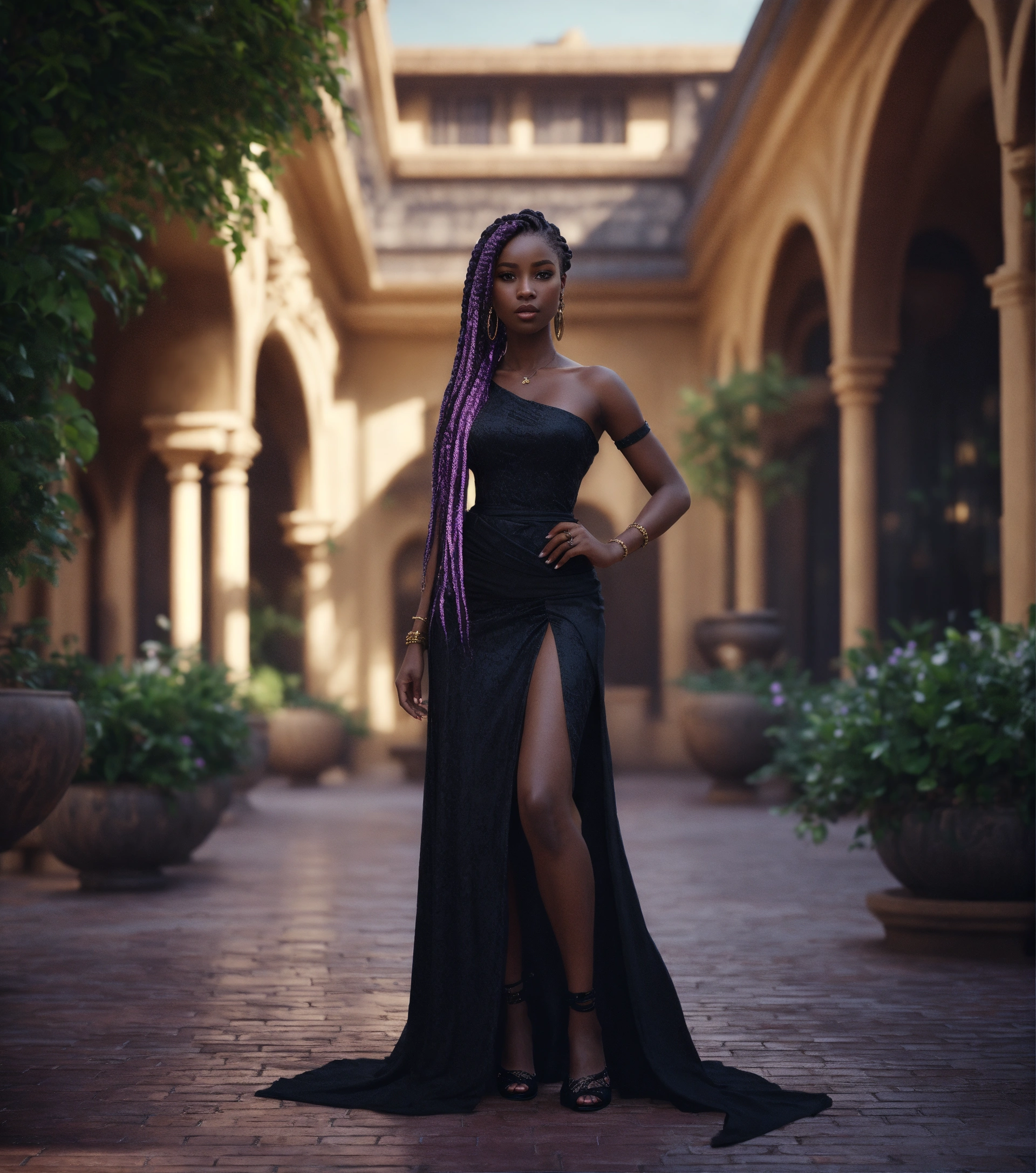 Alien female, 30 years old with purple eyes, dark skin, and long waist length dark box braids, wide hips. dressed in one shoulder black dress, and heels. standing in a luxurious courtyard during day, regal persona. cinematic style, high detail, realistic physics, photorealistic, unreal engine, hdr, 8k