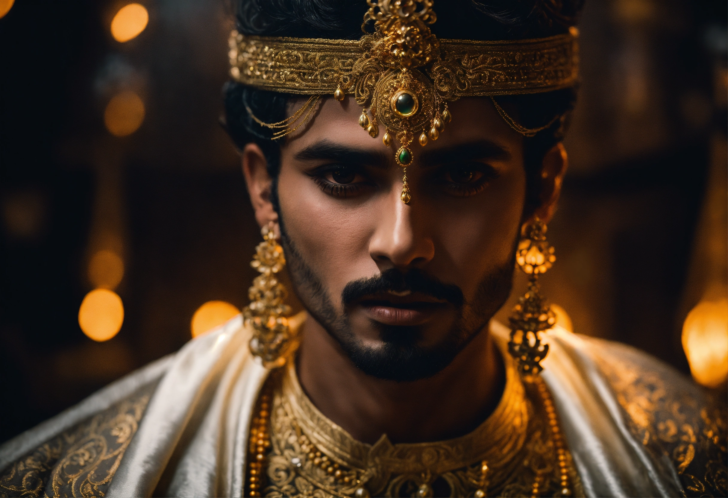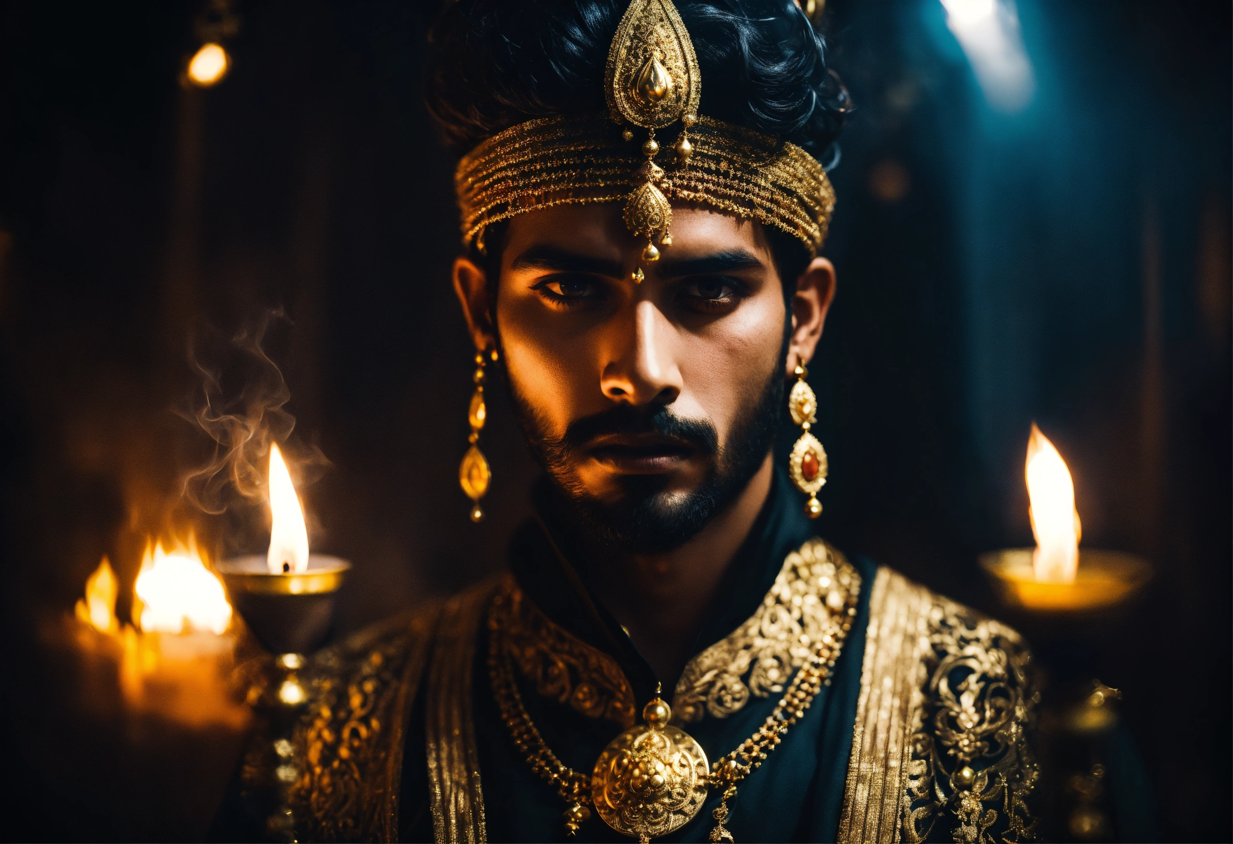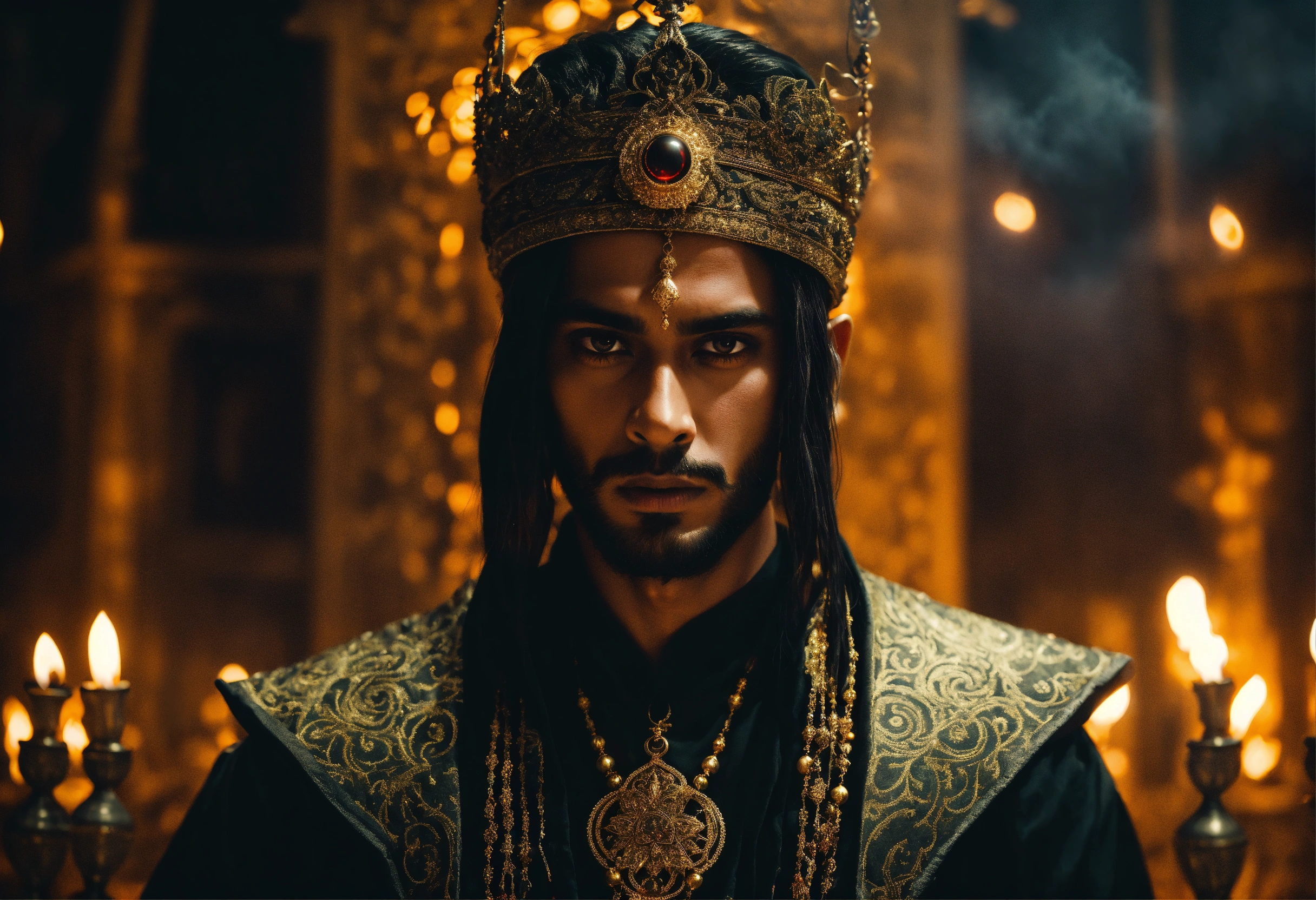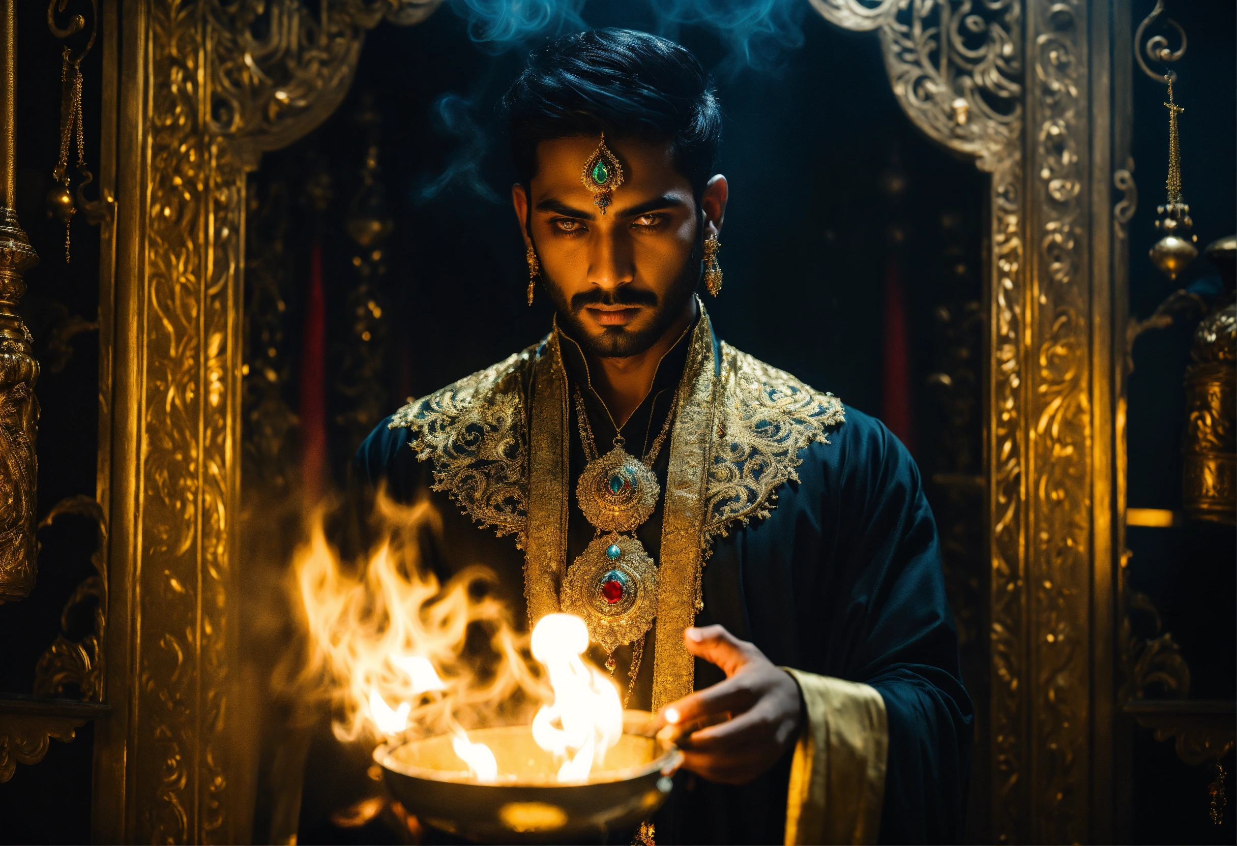 Dark, mysterious and dramatic portrait of a young handsome south asian sinister sorcerer with glowing hypnotic eyes wearing dark elaborate robes and ornate gold jewellery performing a black magic ritual in a smoky sinister dimly lit occult temple