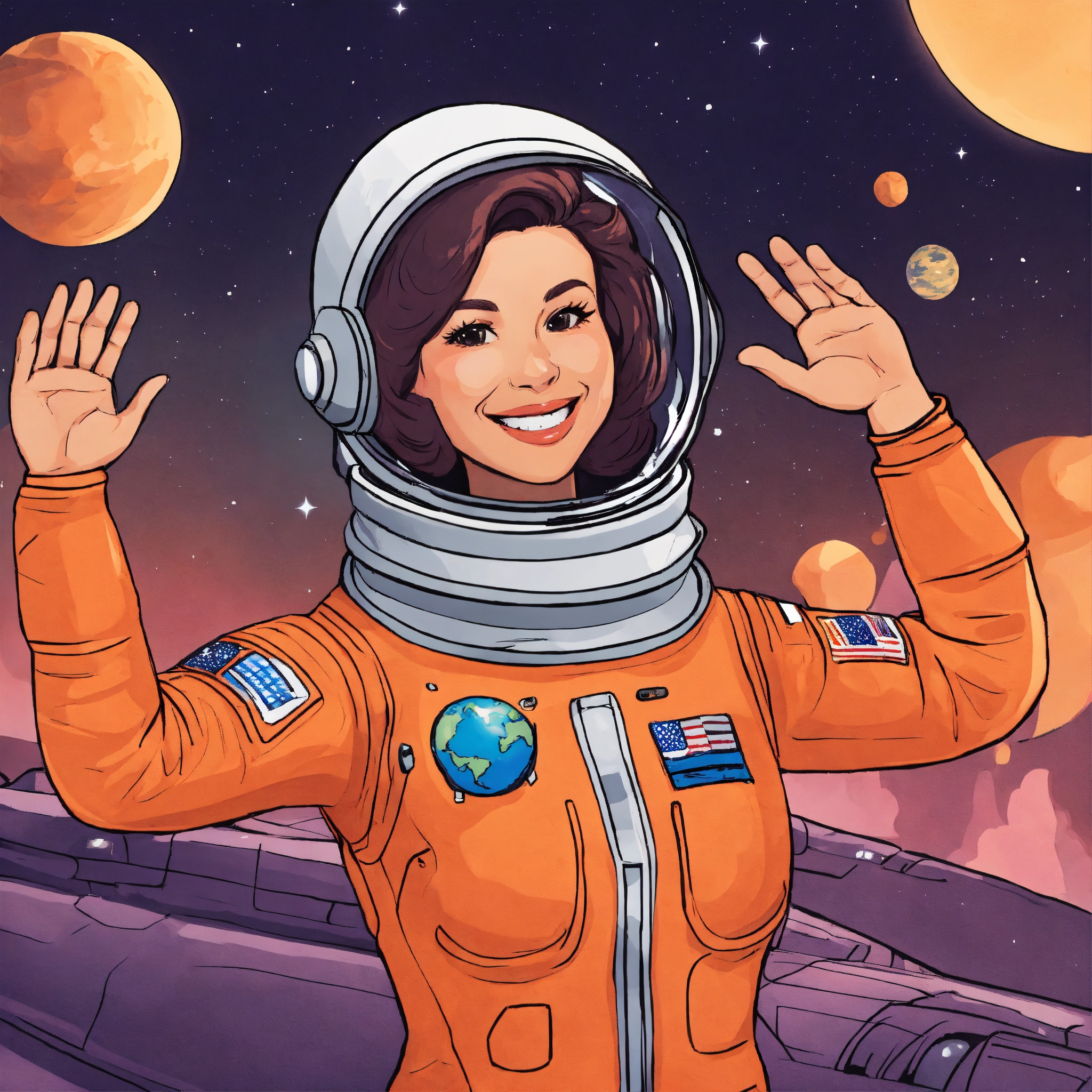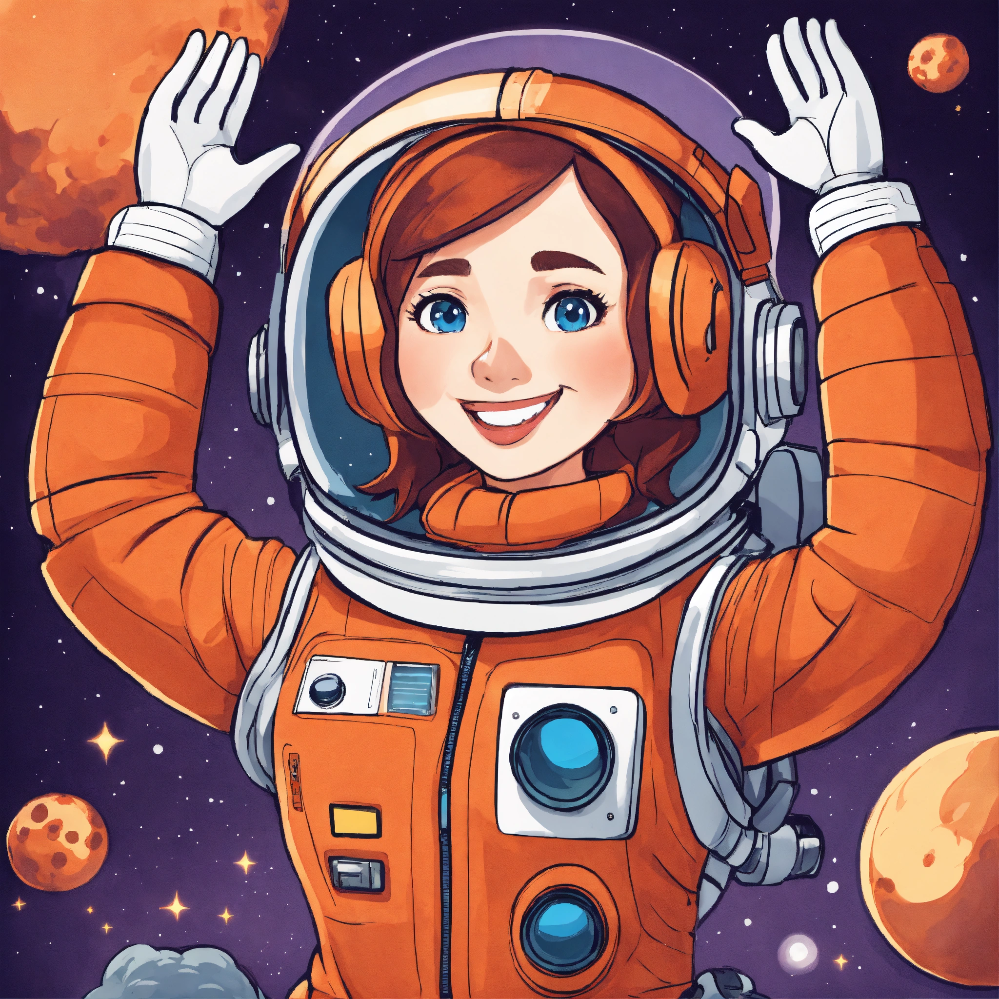 Create a cartoon version of a female astronaut, dressed in an orange suit, waving at the camera with just a raised hand and smiling very much.