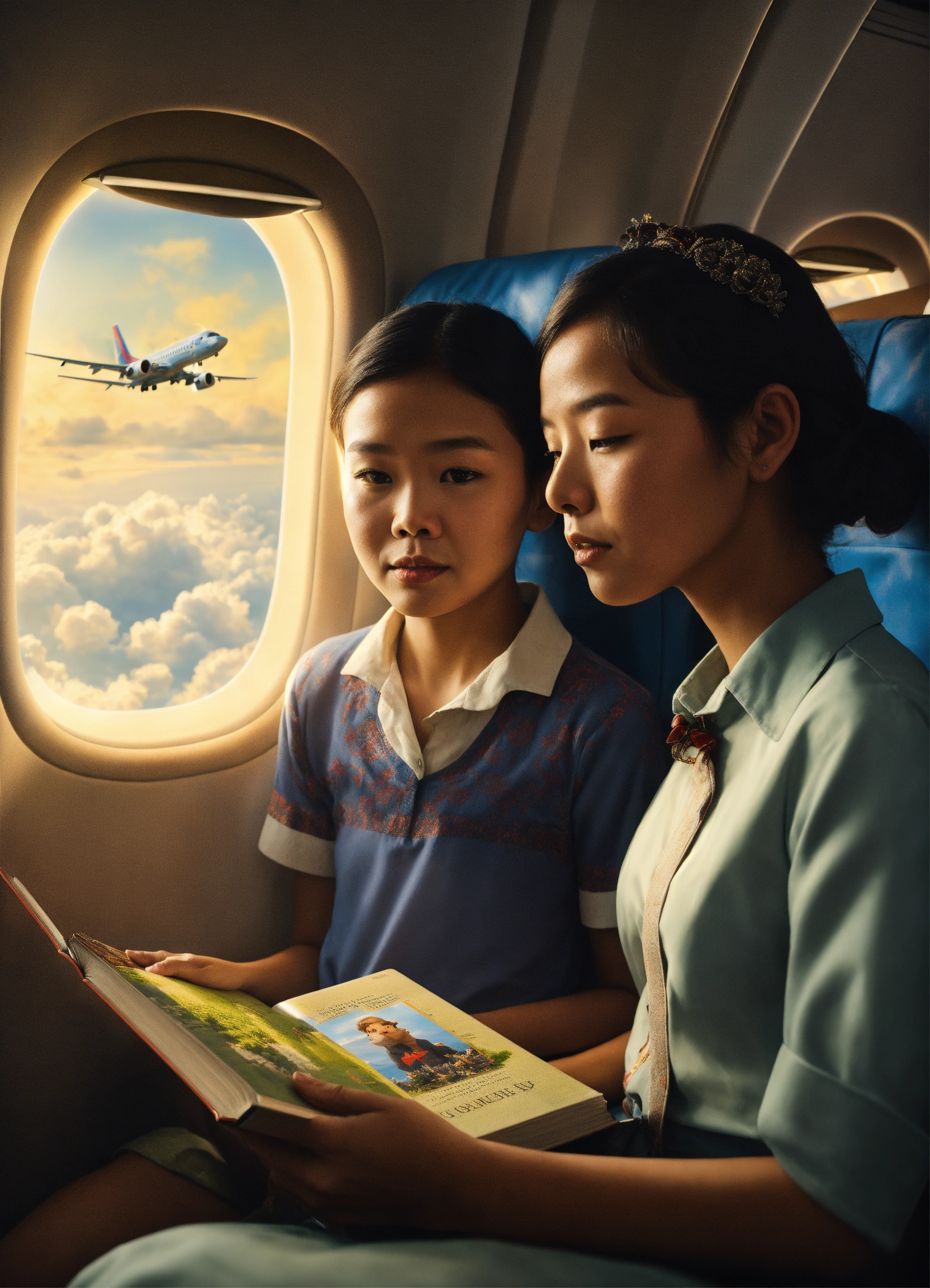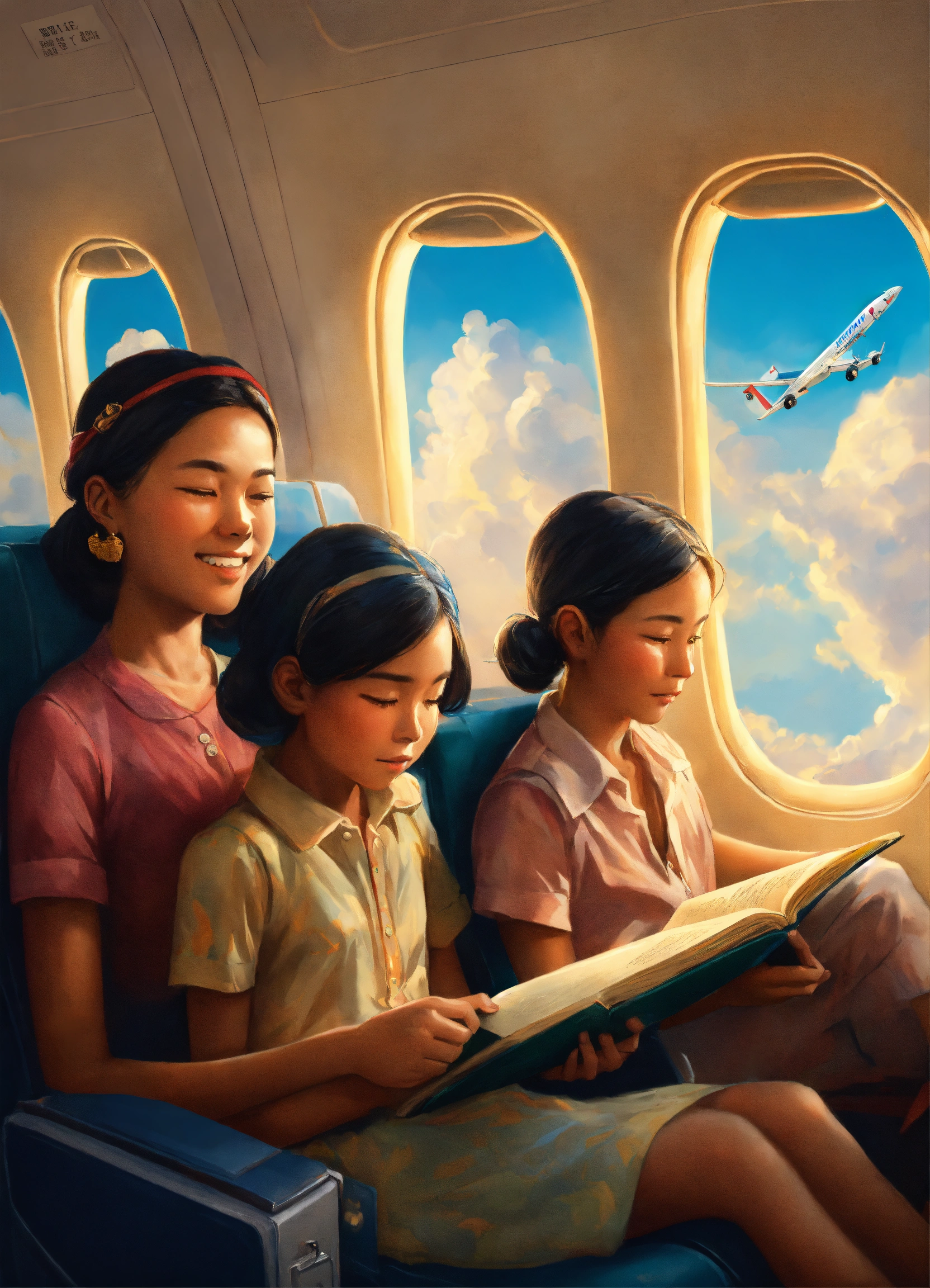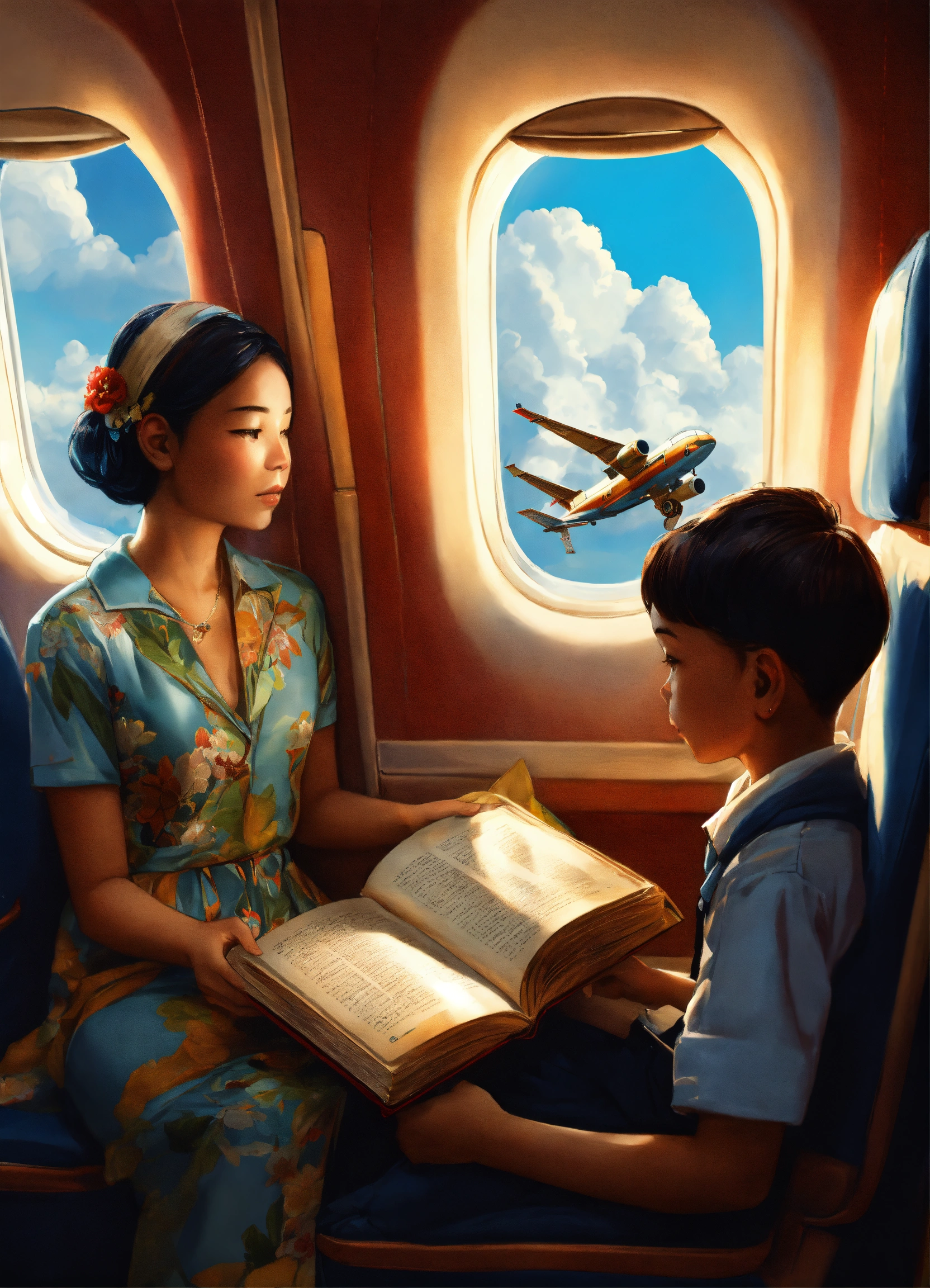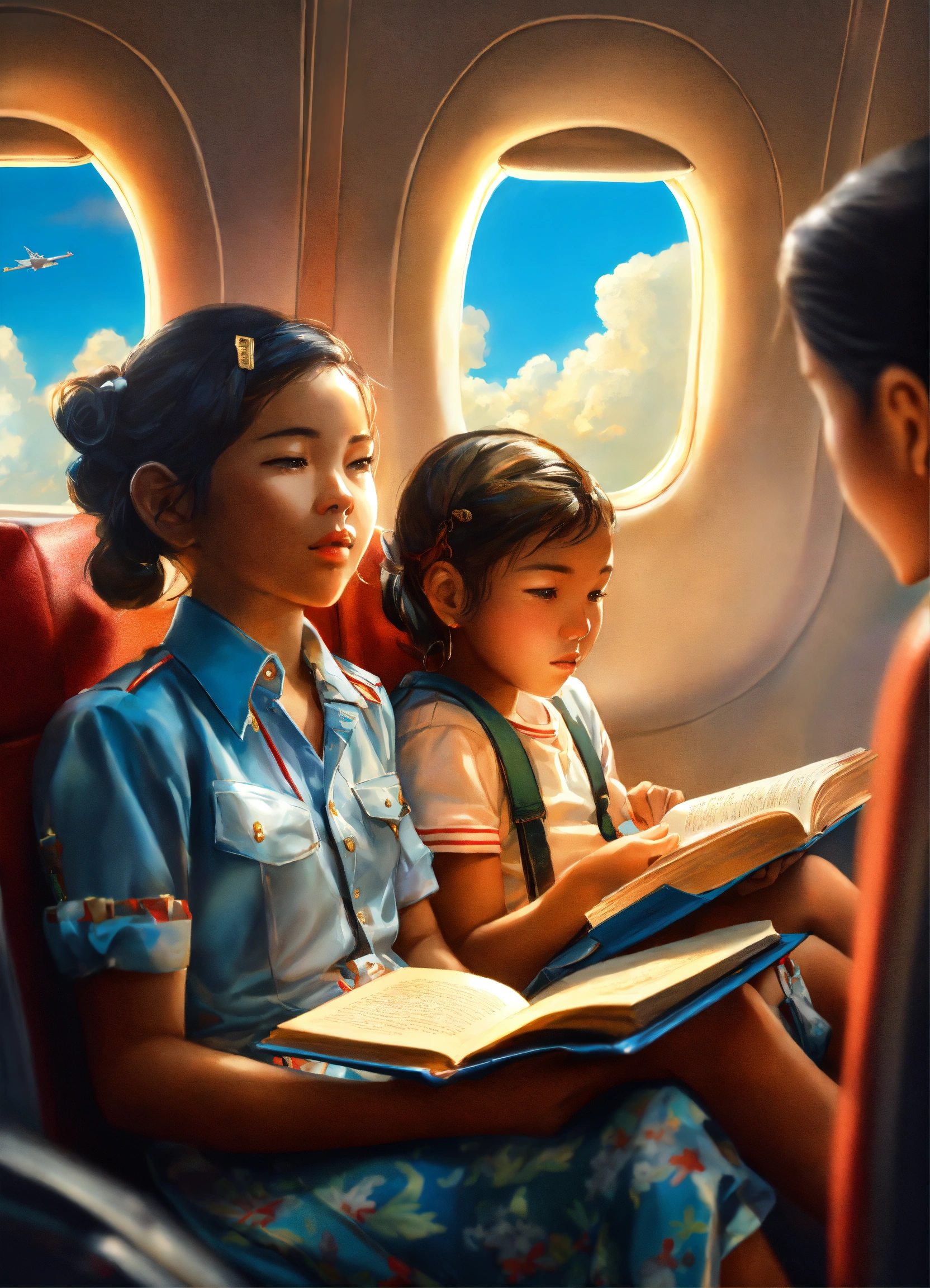 People are on the plane reading a book, background in the plane, indonesian faces, blue sky, dramatic light, 8k, by bob byerley