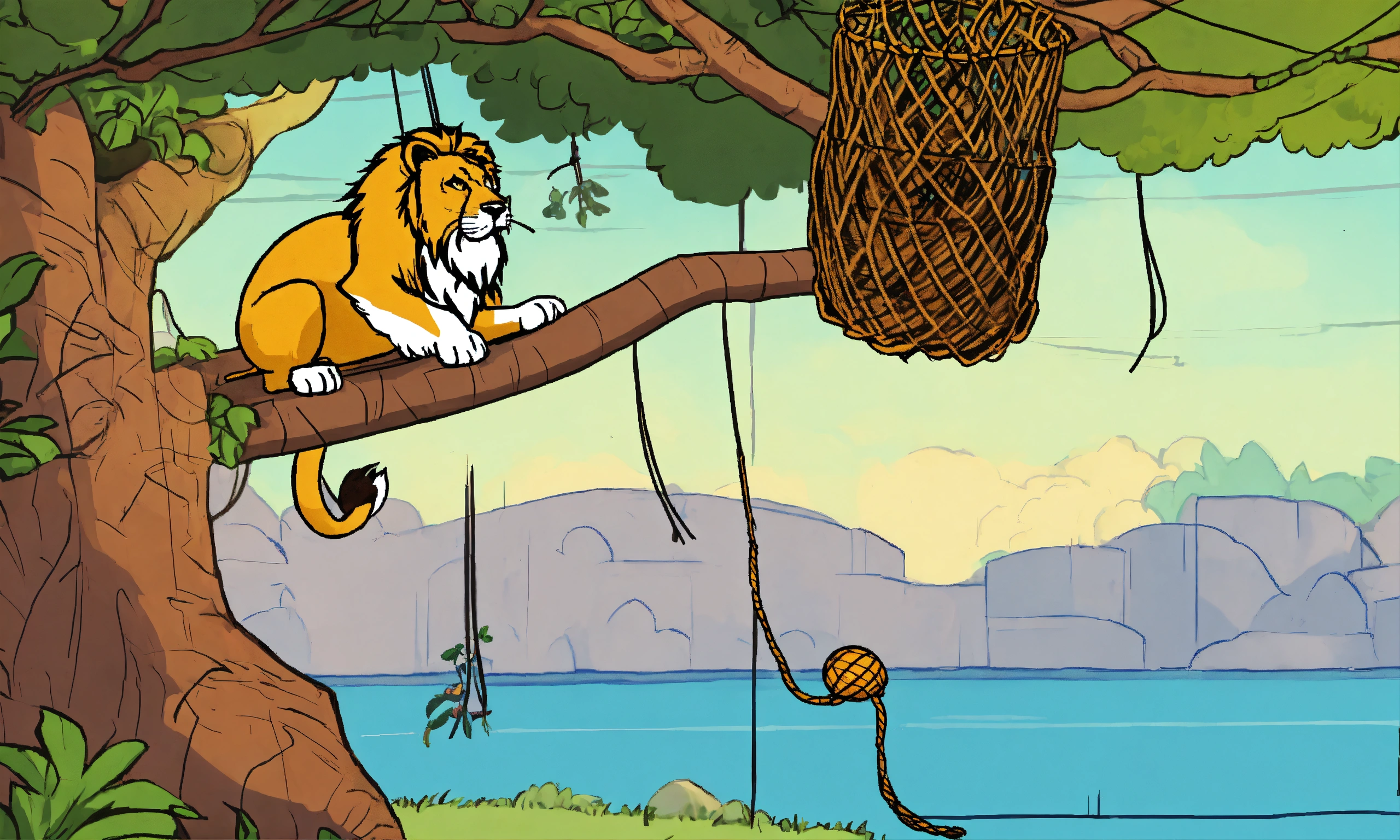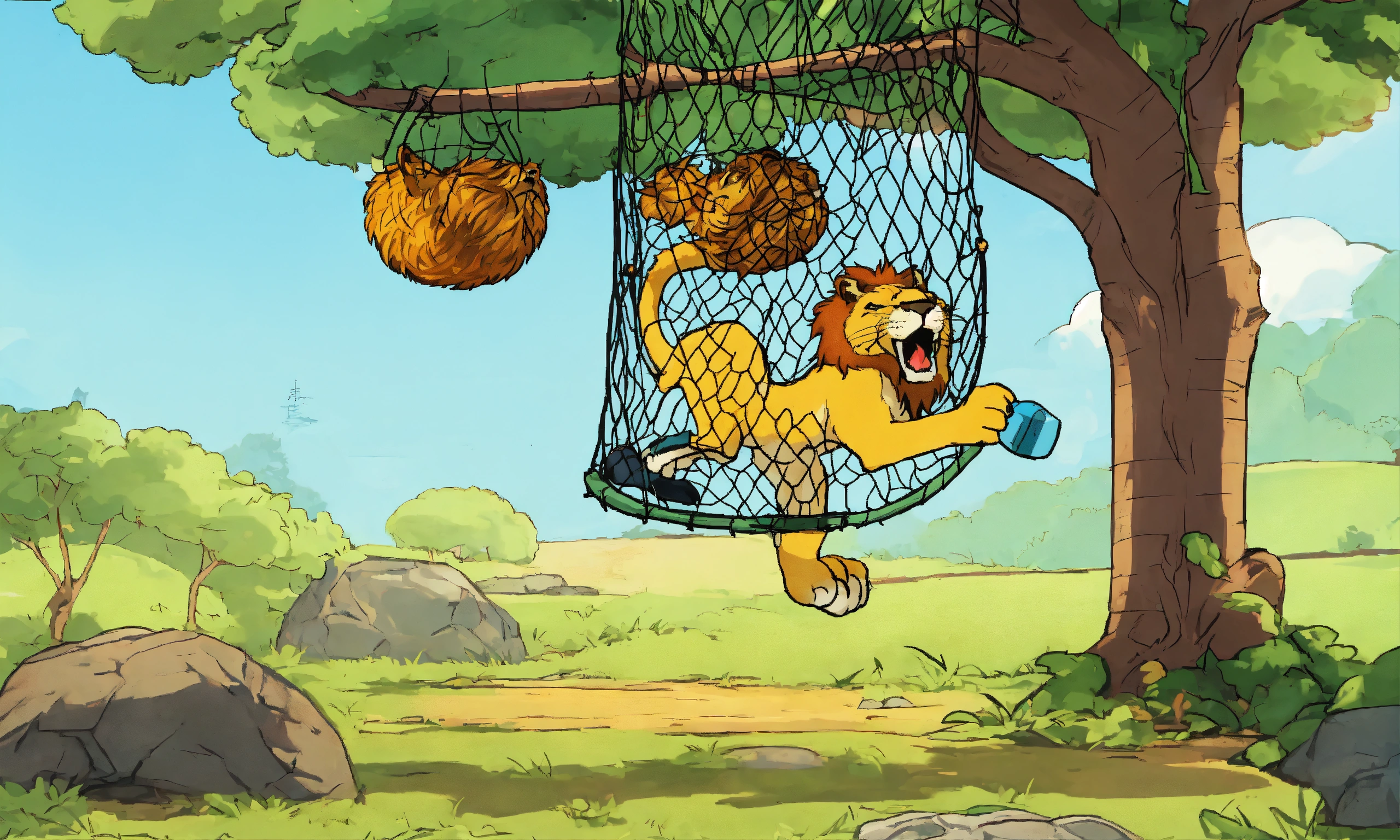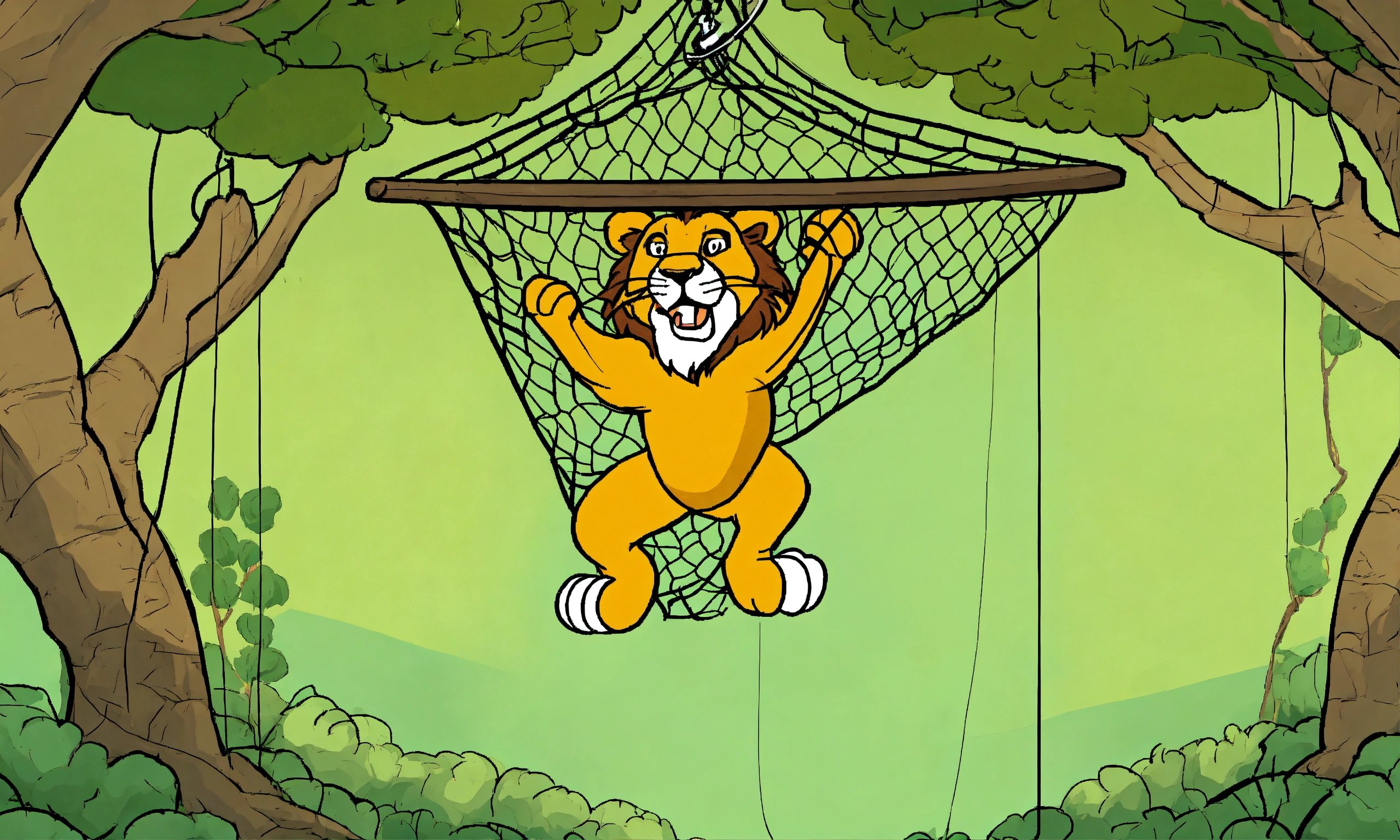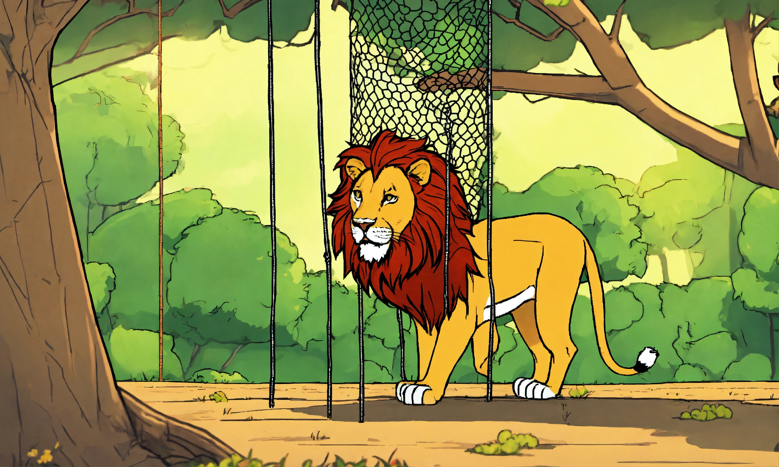 Comic 2d style animation cartoon net hung to tree upside down and lion captured in that net and mouse cutting that net to make lion free