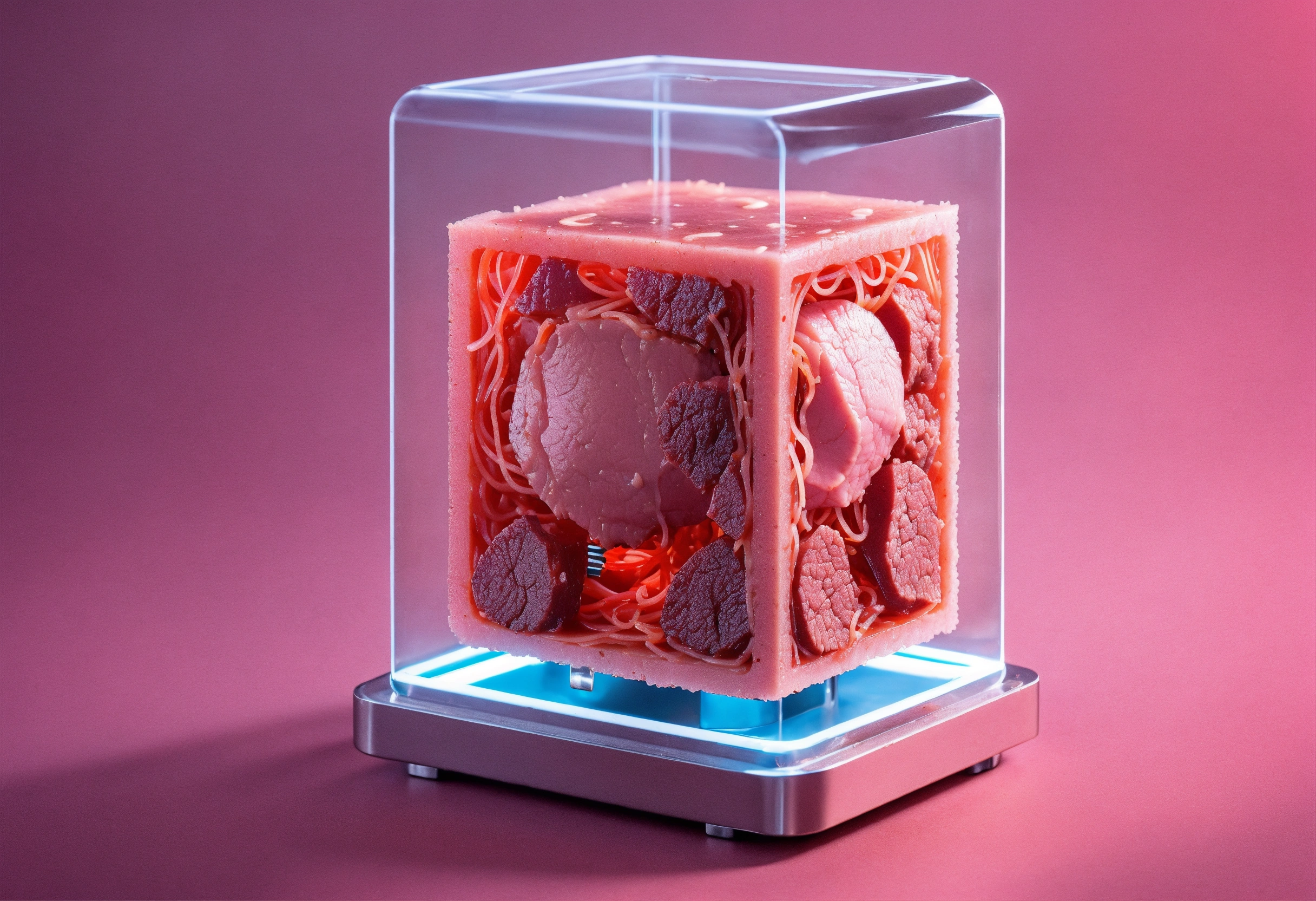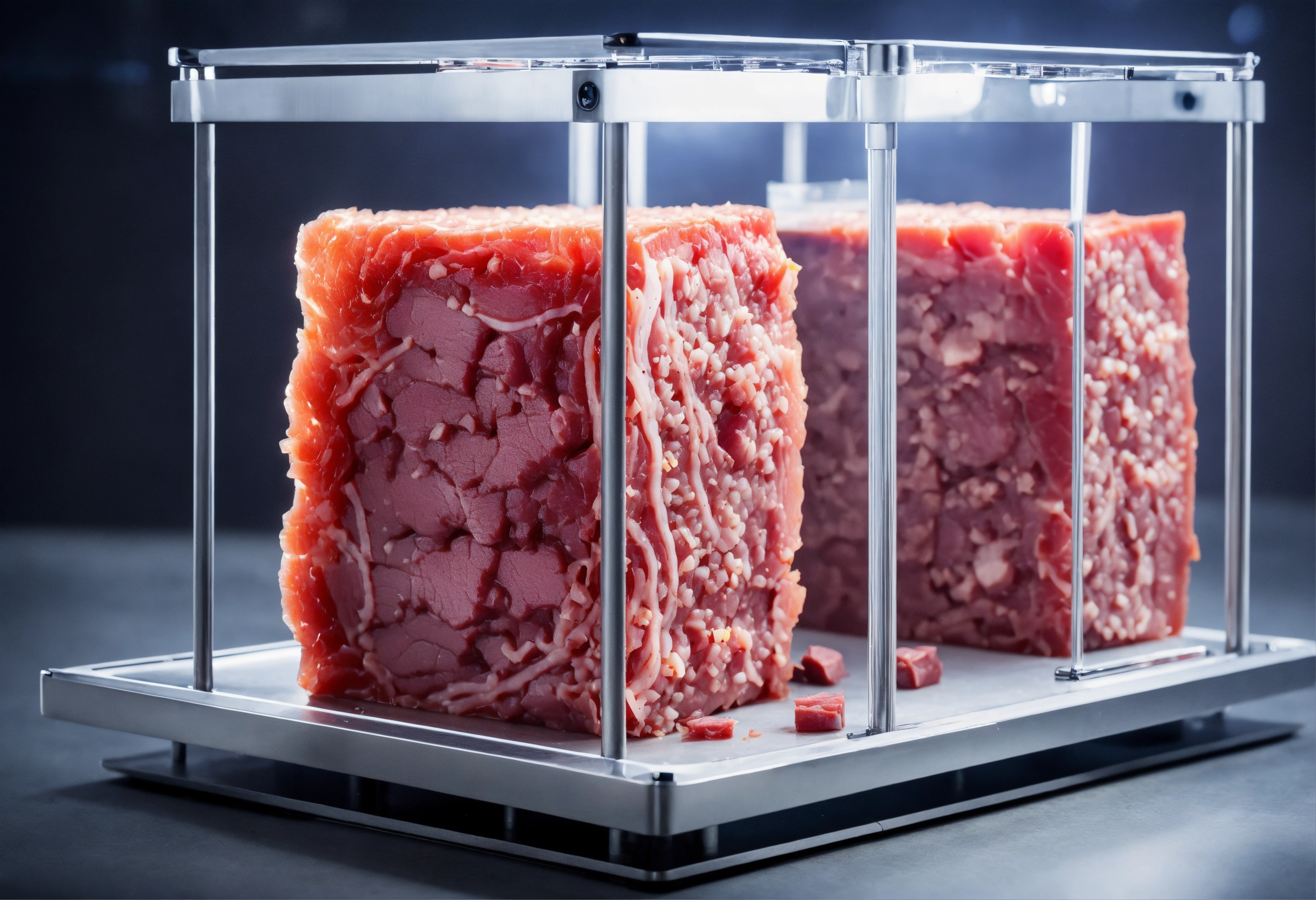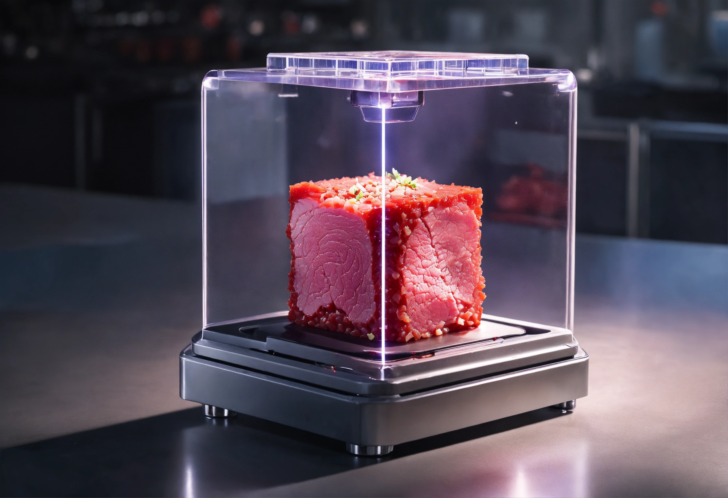 Small cube of artificial meat in a futuristic apparatus