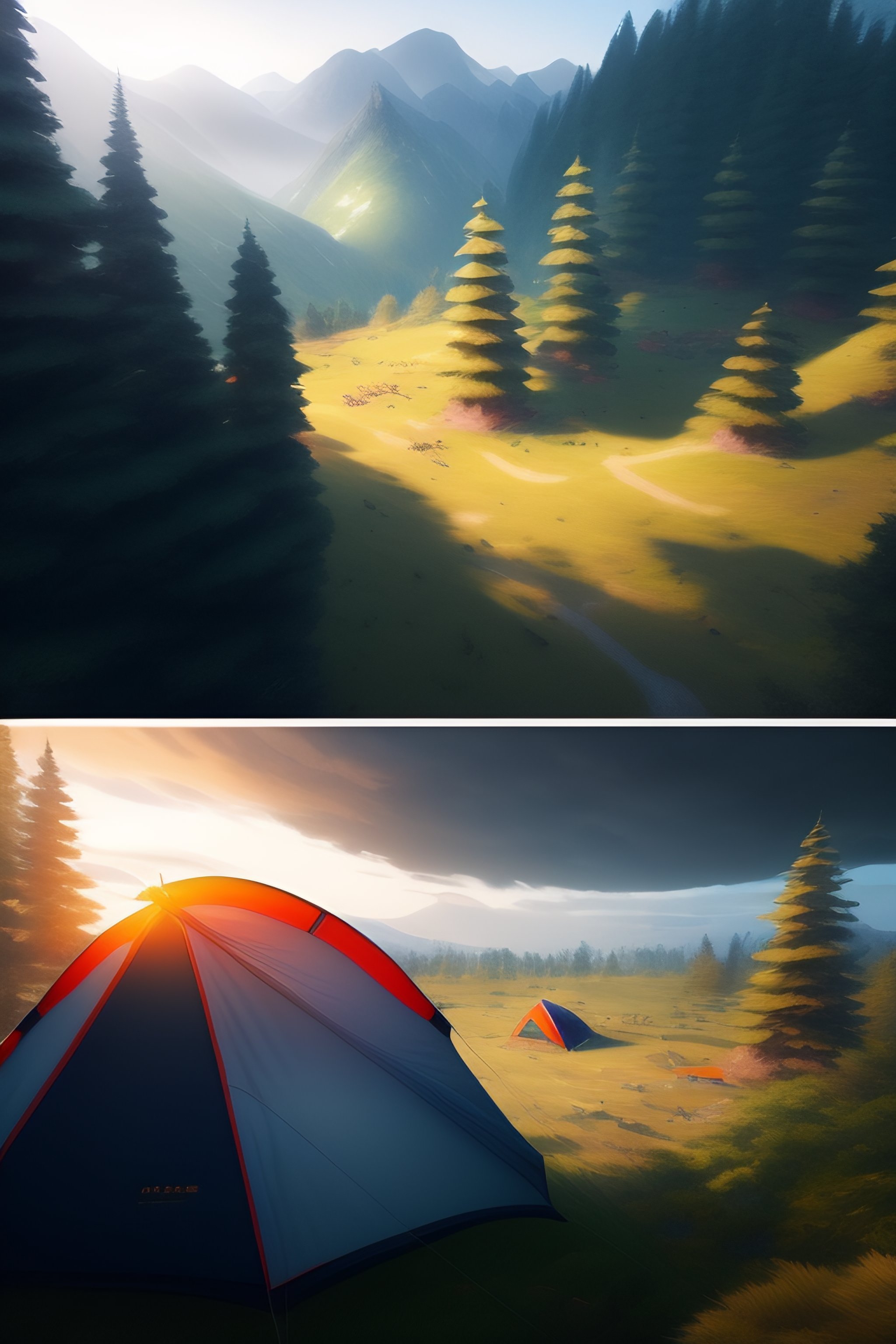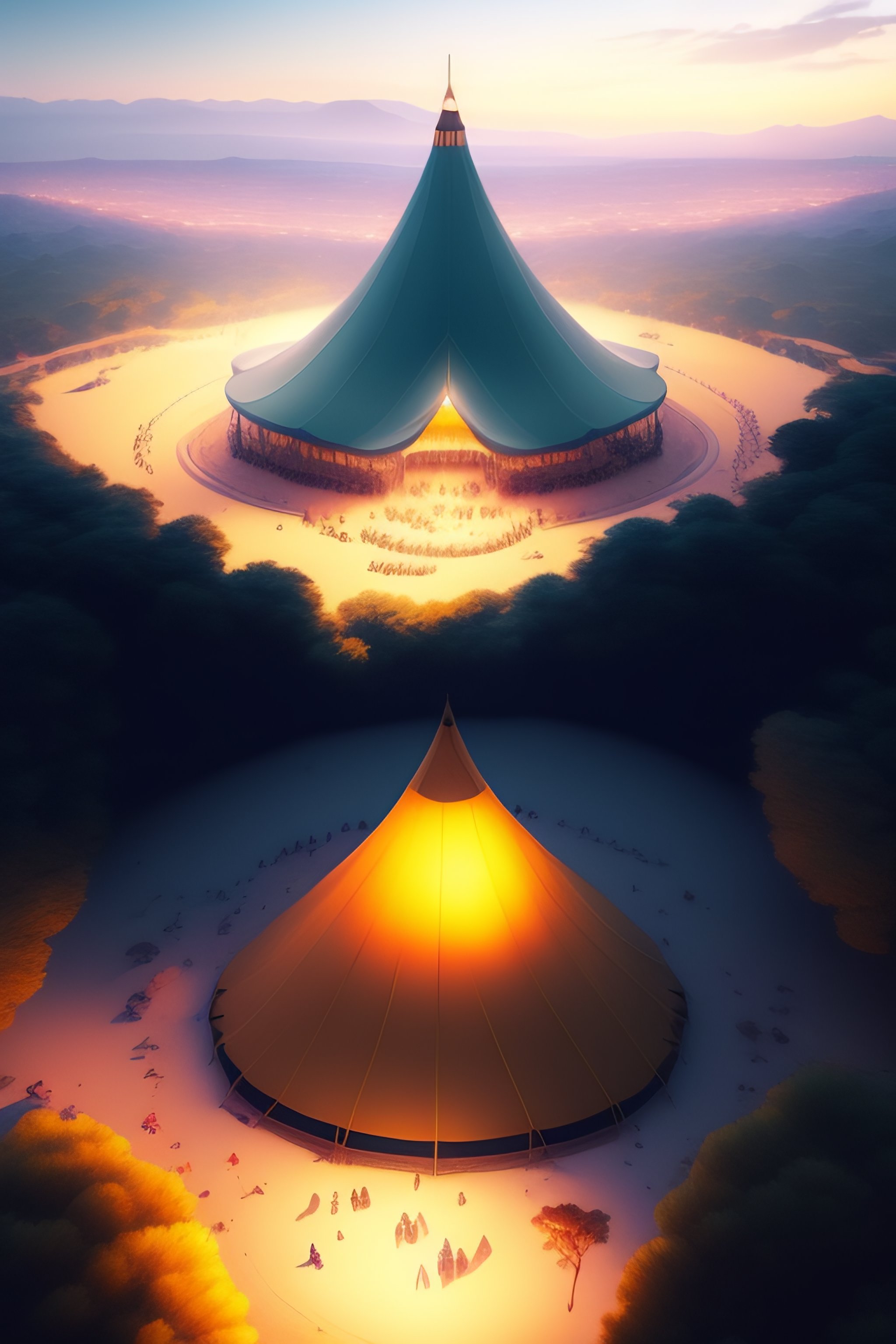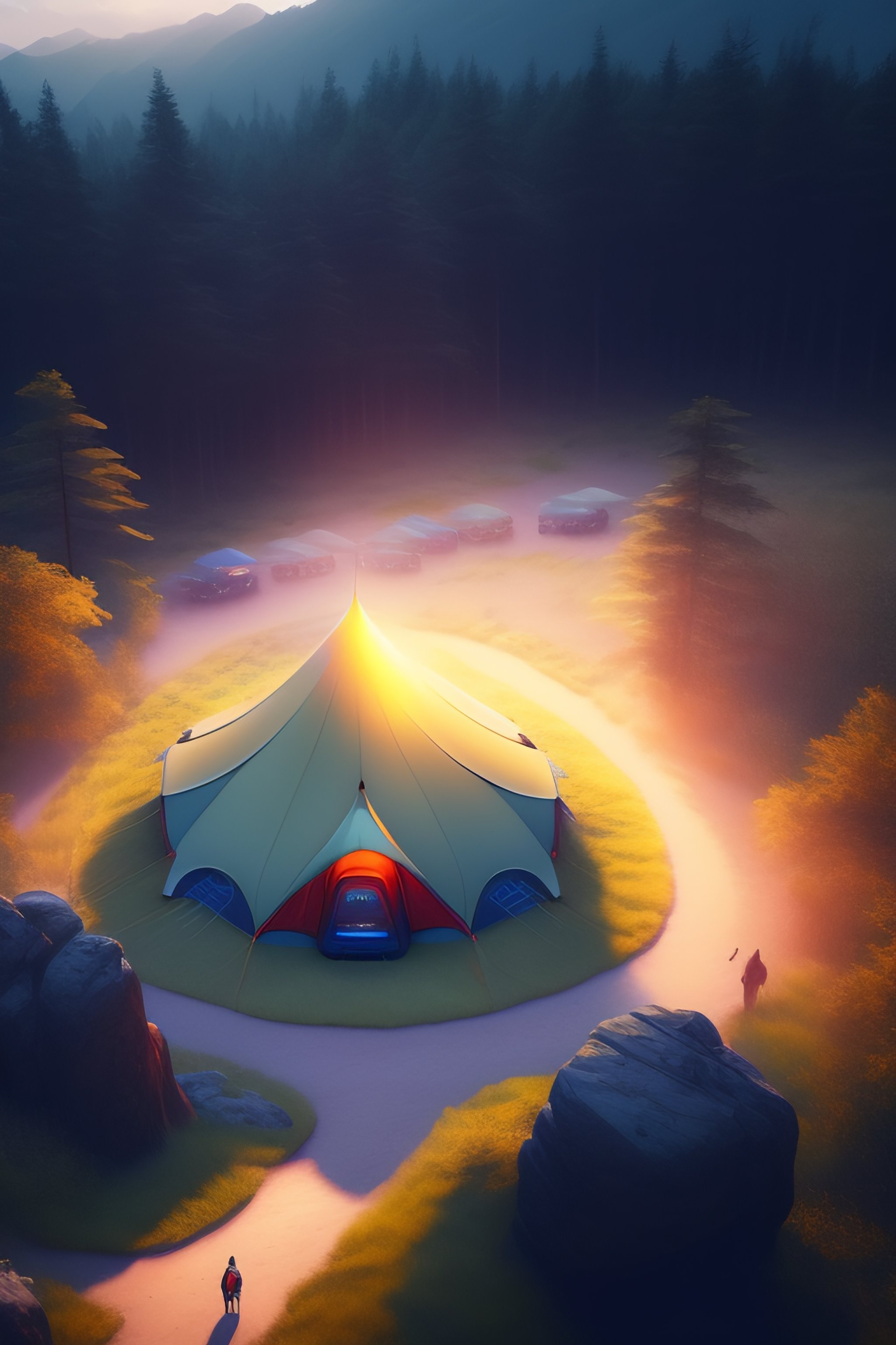 A camping sight with a tent, camping gears, campfire with a dozen of people in a circle in day light forest with cute animals, studio ghibli, isometric, sharp, rendered in unreal engine 5, highly detailed, bird-eye view, digital painting, artstation, smooth, sharp focus, illustration, wide angle, wallpaper, splash art, promo art, dramatic lighting, drone shot, art by artgerm and greg rutkowski and bo chen and jin xiaodi