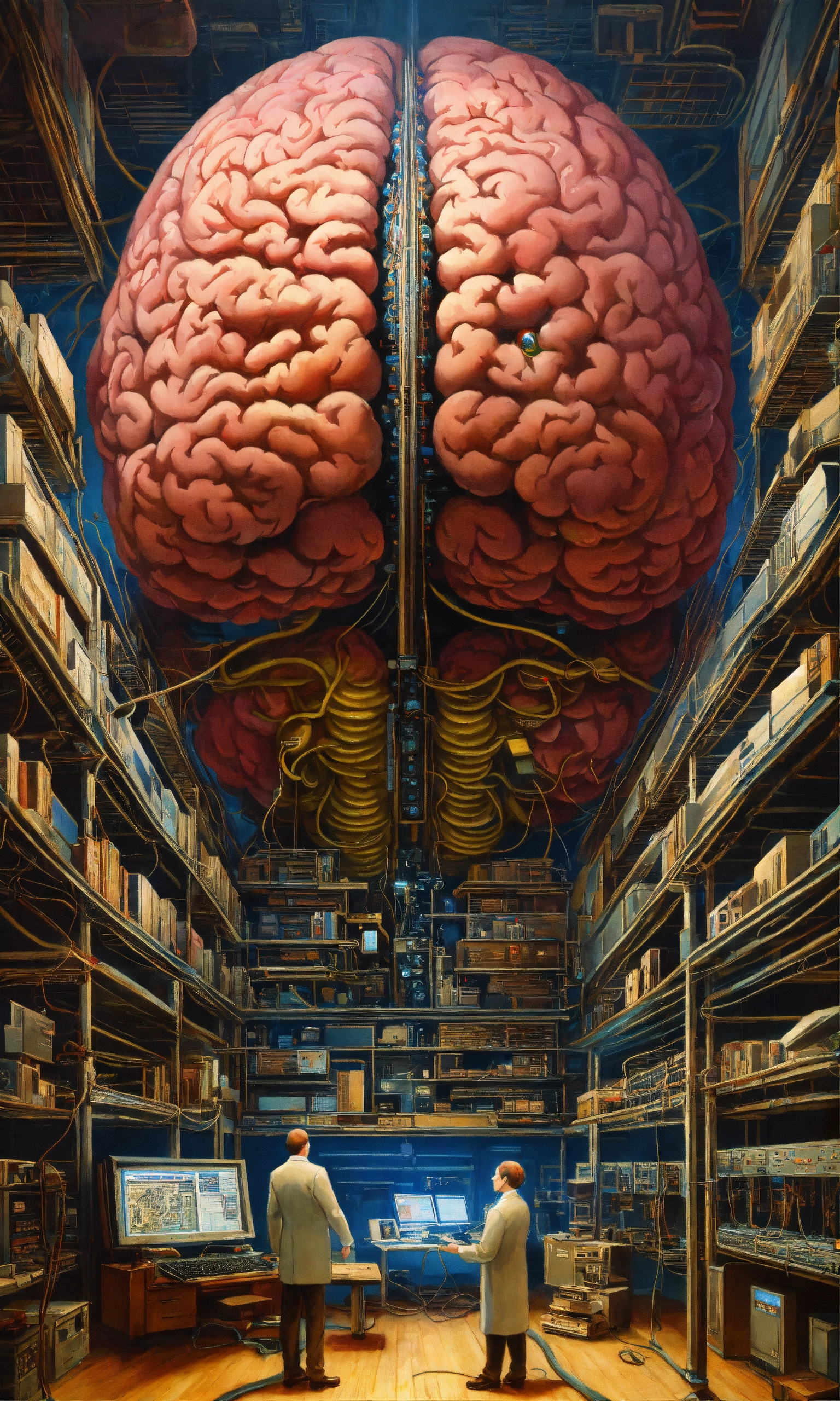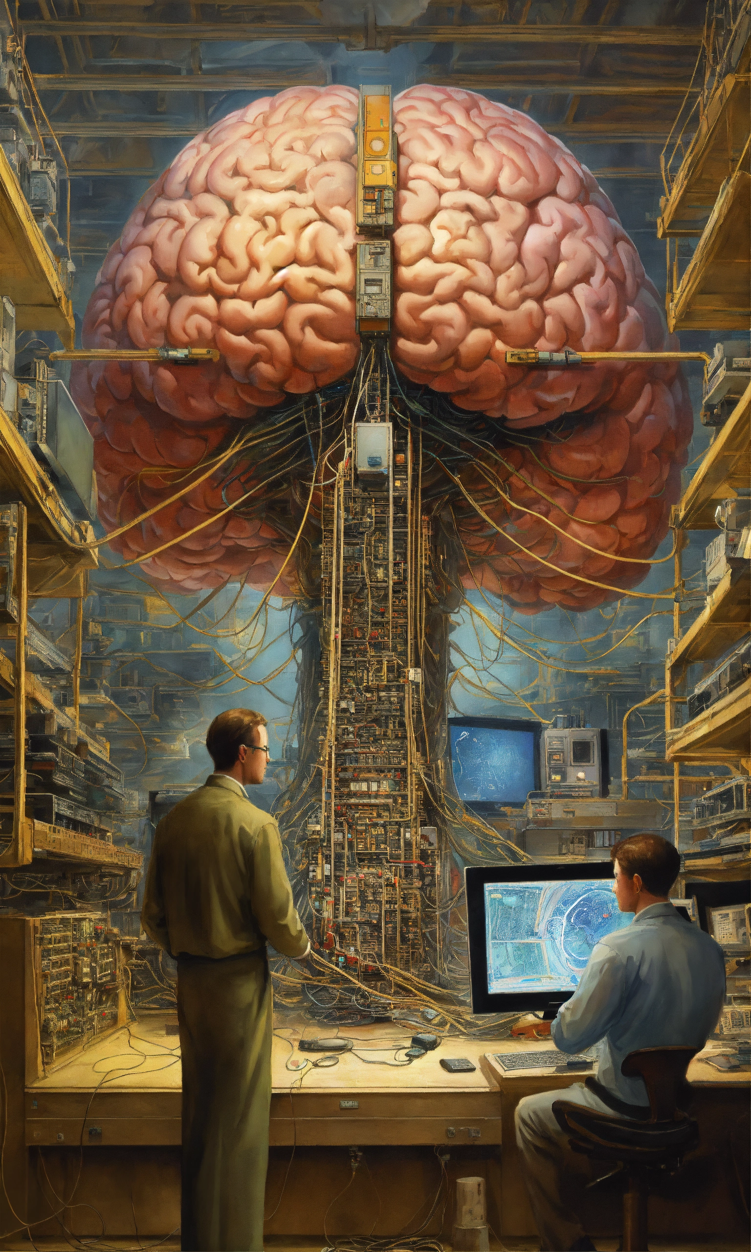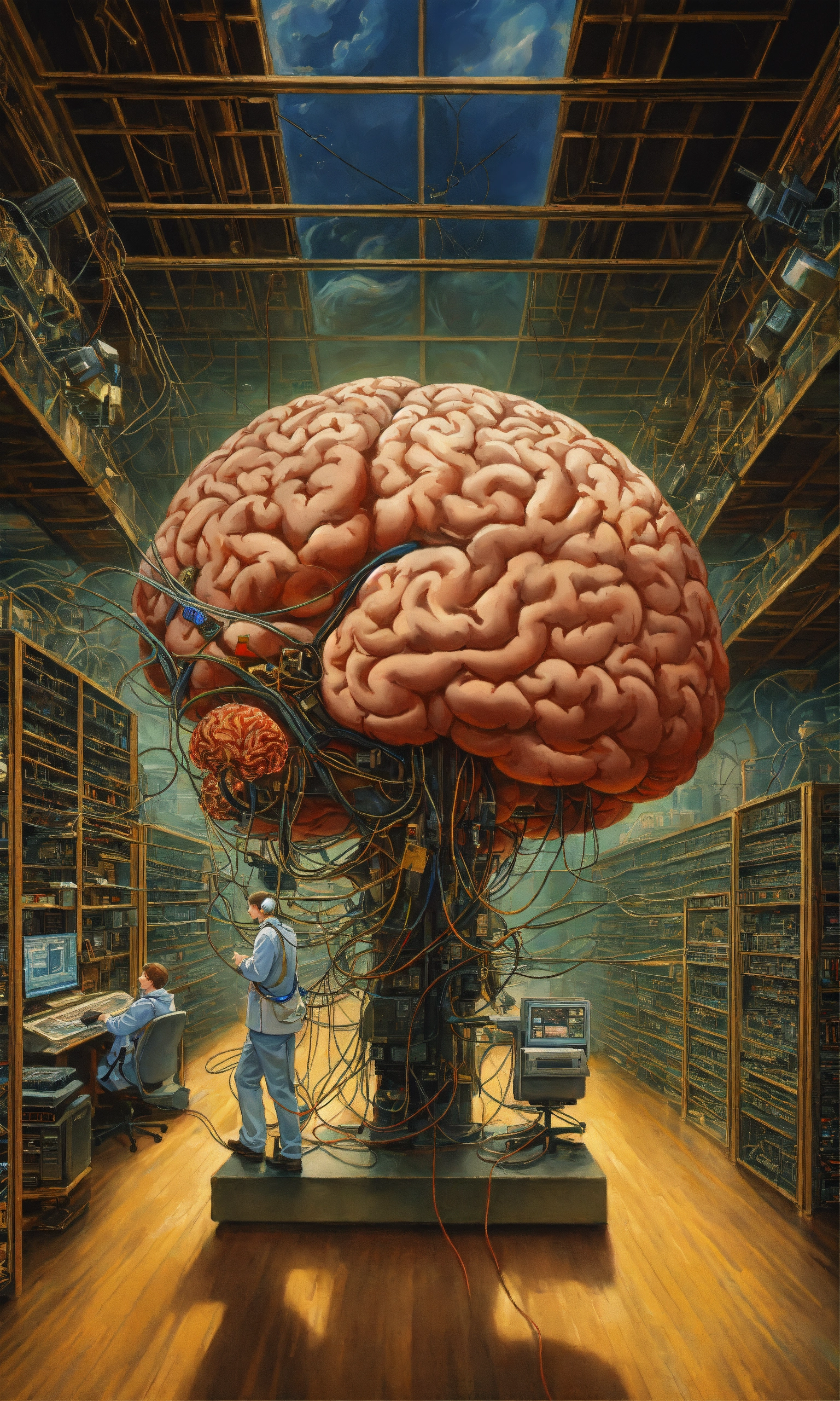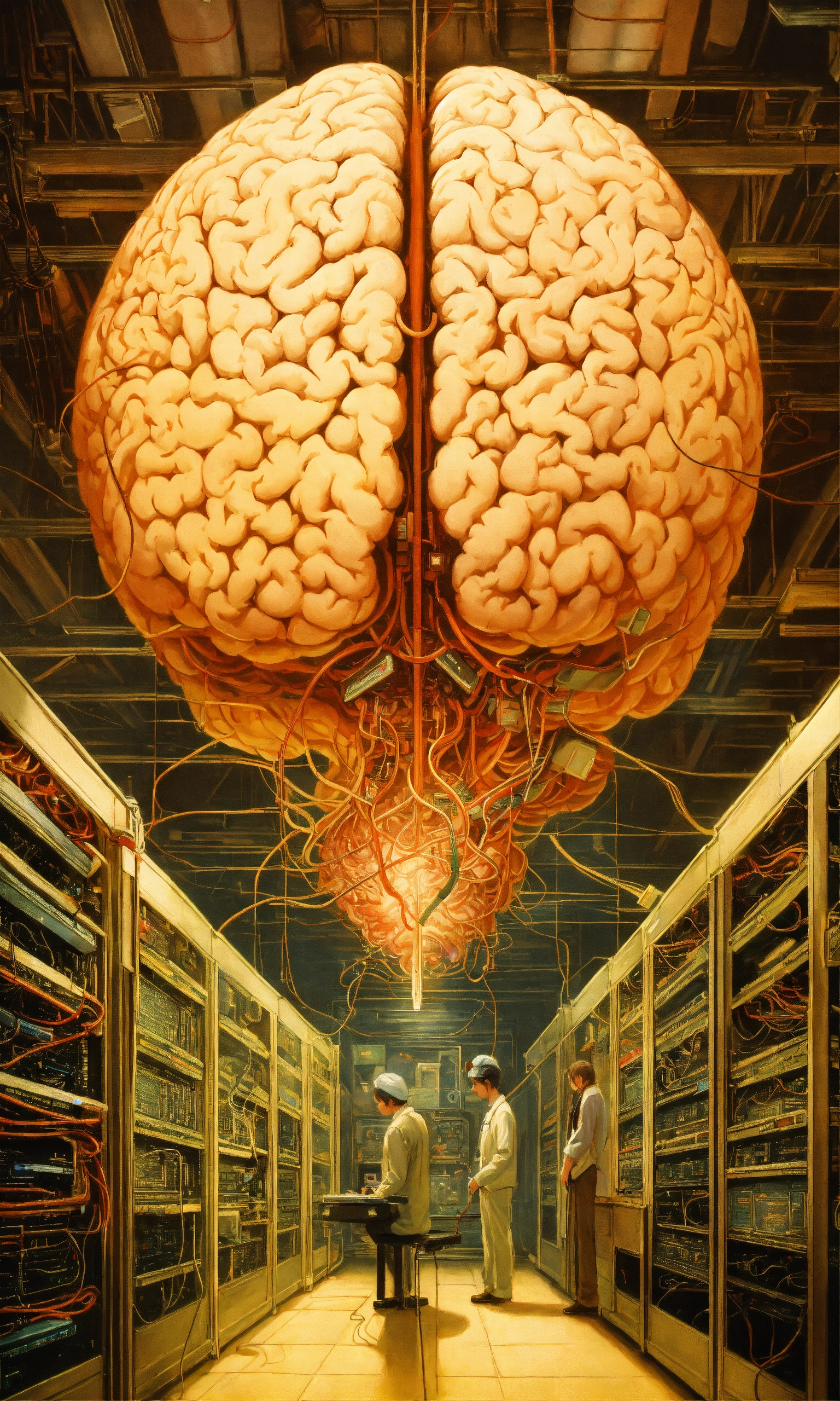 In the center of the room, a colossal human brain is intricately connected to advanced computers housed in the surrounding racks by millions of wires. this extraordinary brain possesses two eyes that fixate upon us with astonishing precision, captured in a painting with unparalleled detail and resolution at 64k, there are two alien scientists who are examining the brain