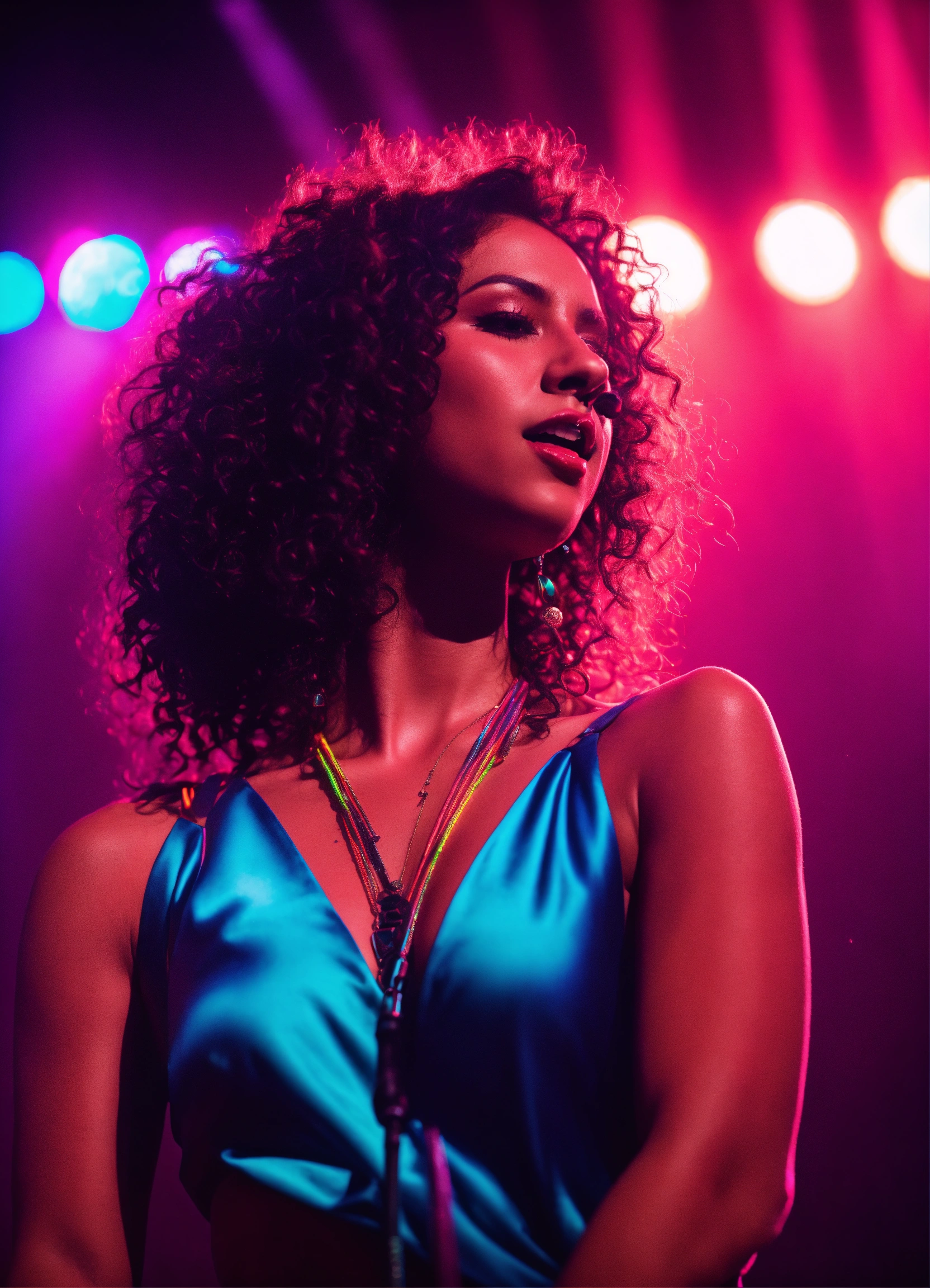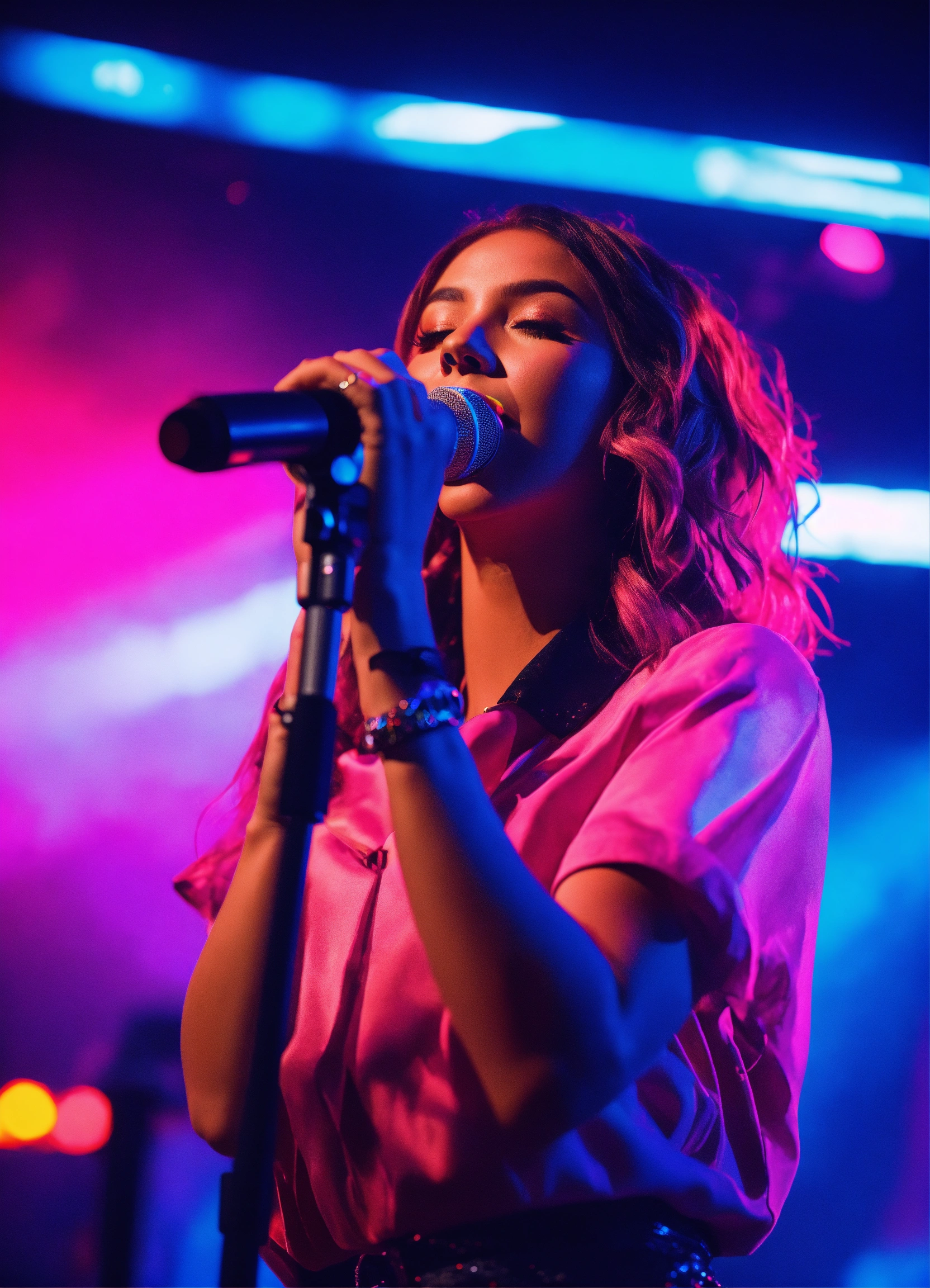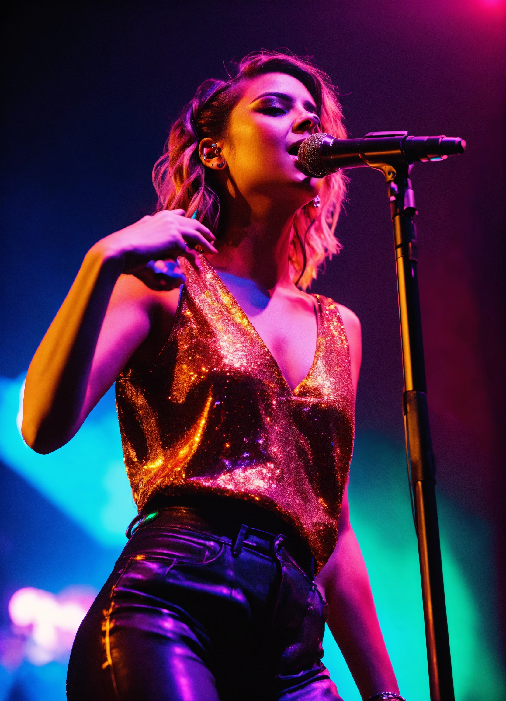 Cinematic photography, modern, female singer on stage performing, neon colors, realistic details, ultra 8k resolution