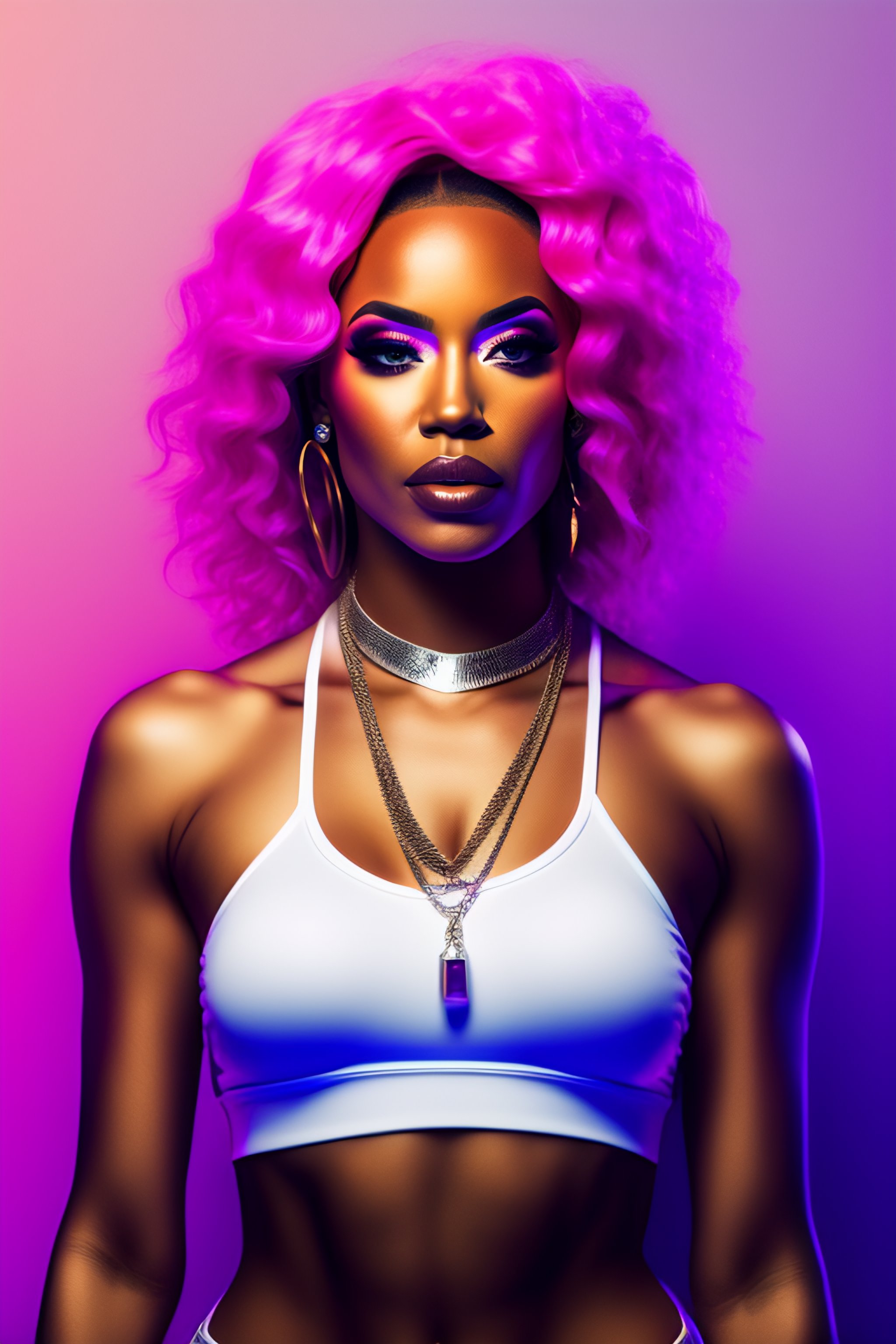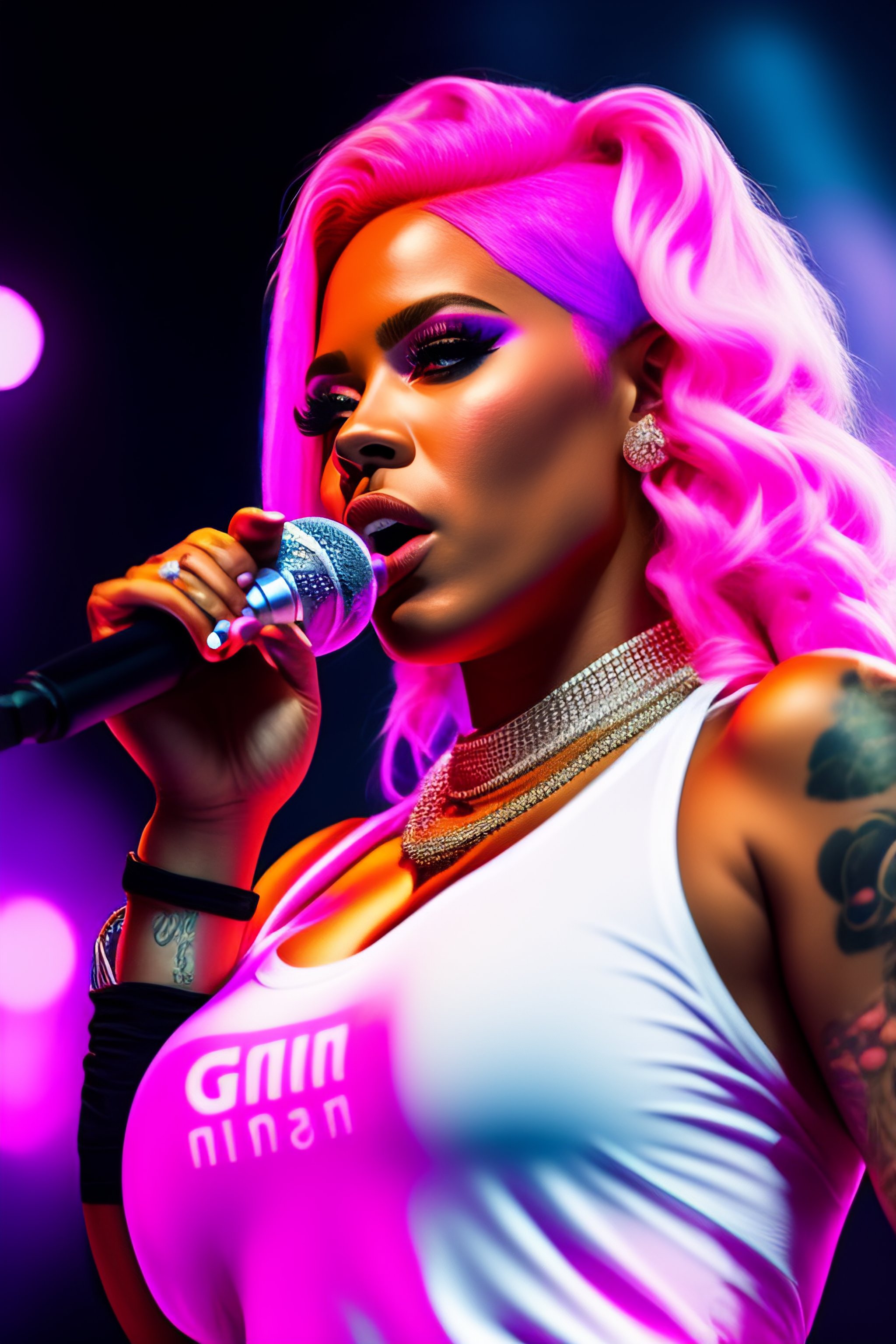 Female white rapper performing on stage at a concert, pink hair, silver chains on her neck, a character side portrait, realistic, half body shot, sharp focus, elegant