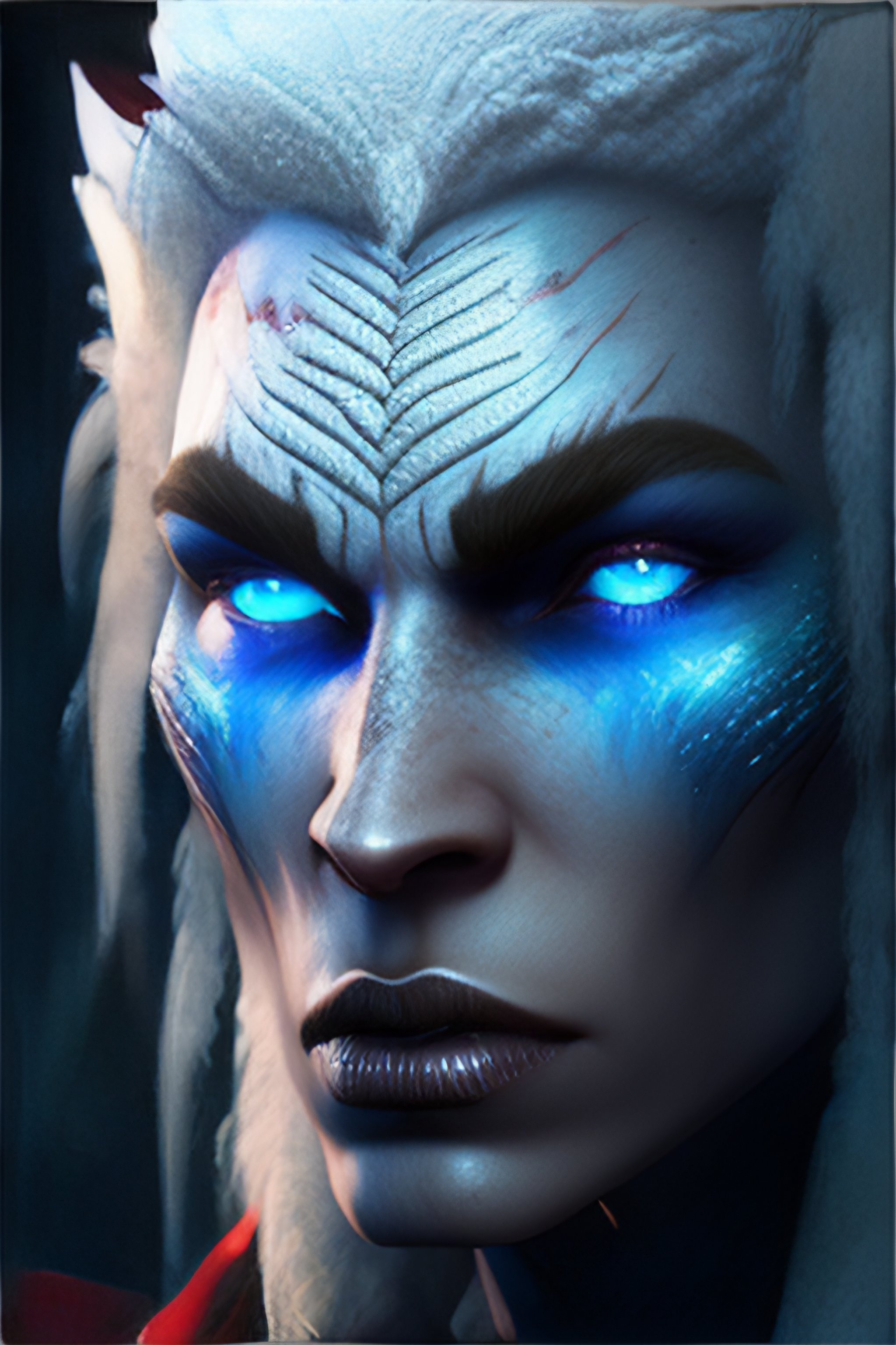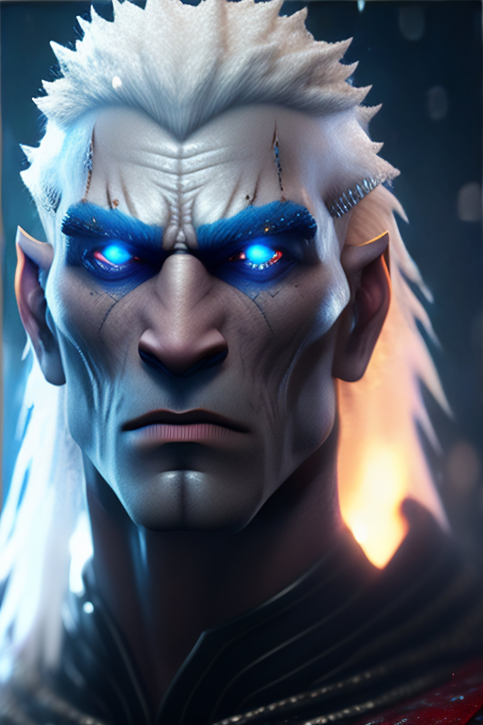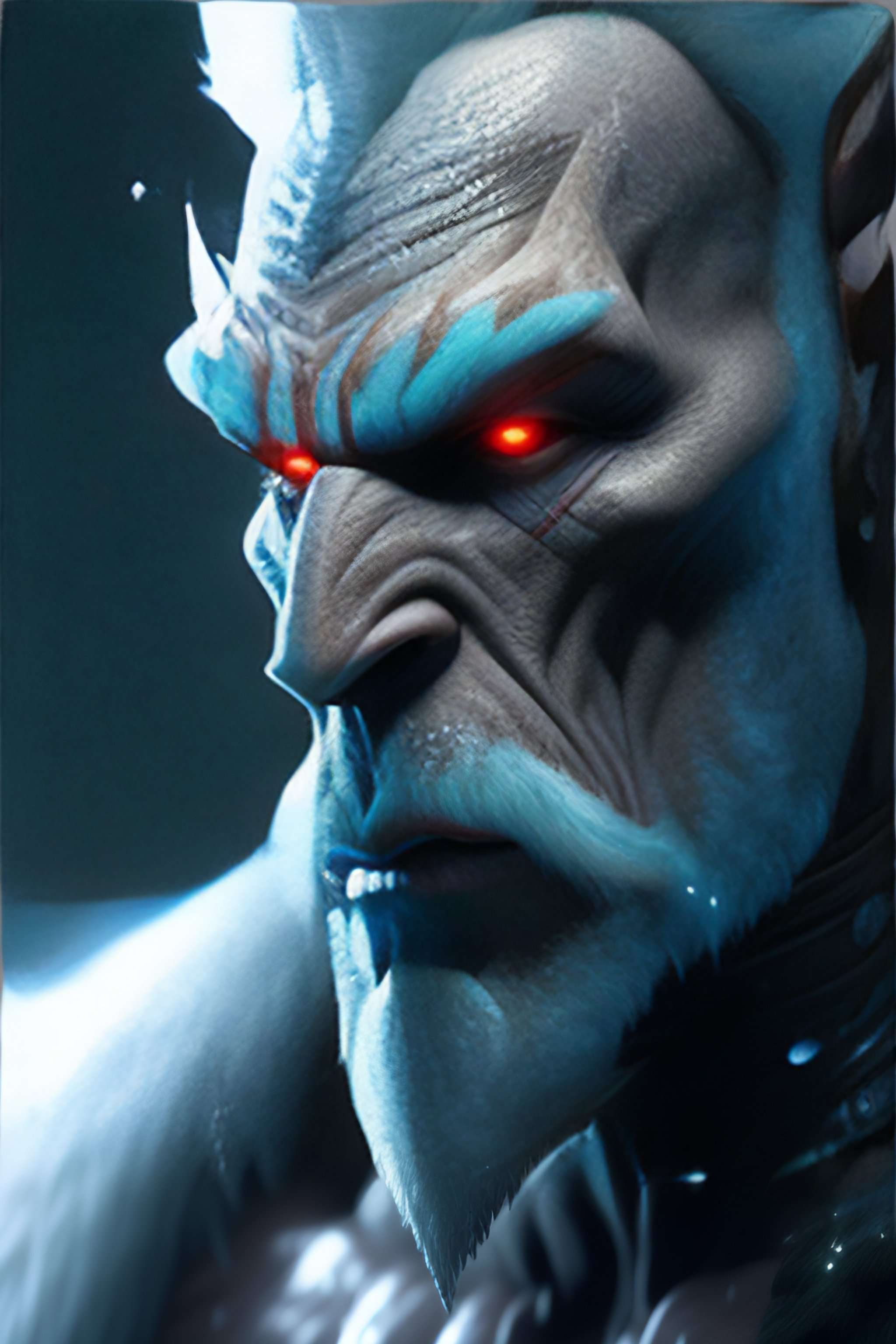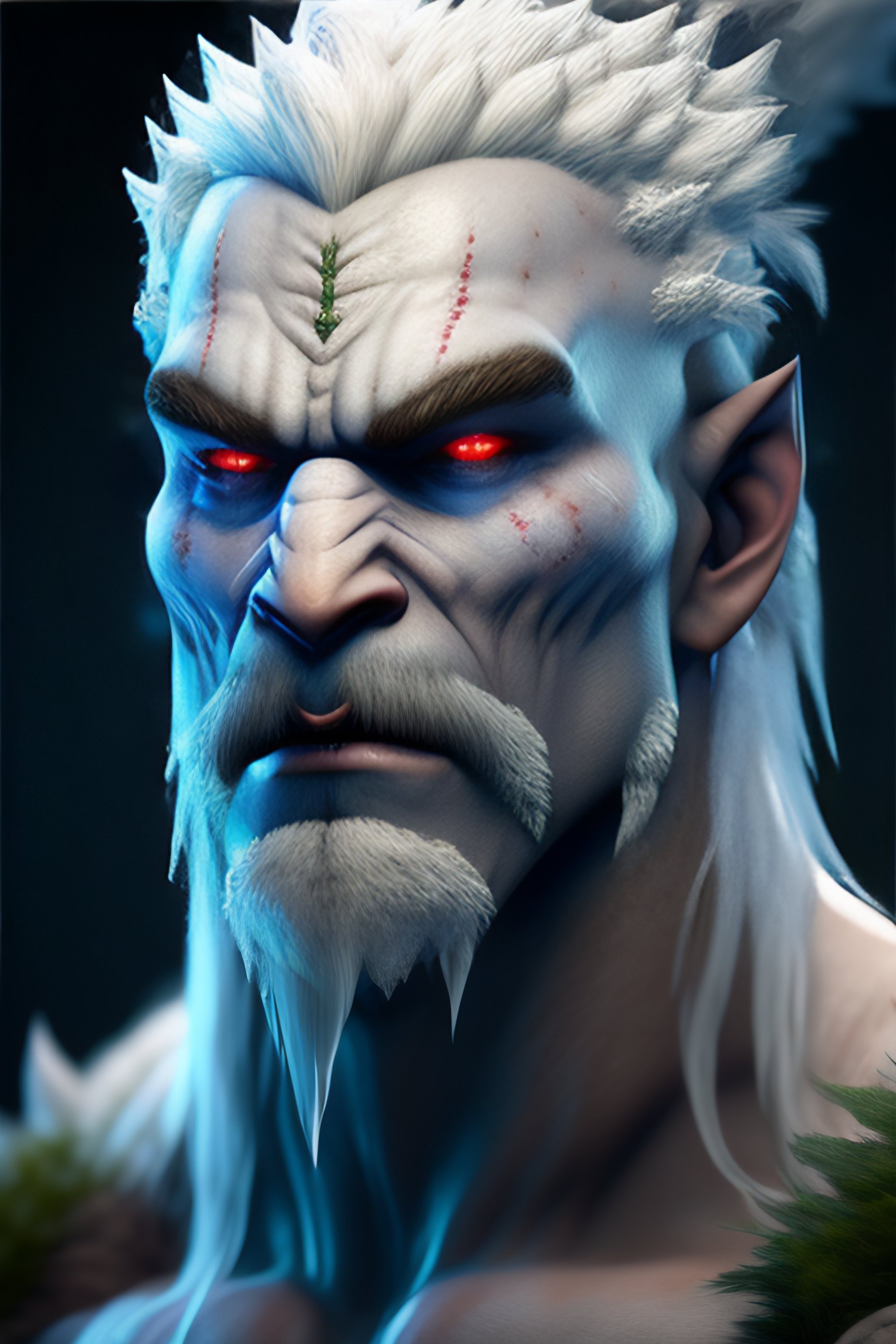 Ultra realistic, 4k, hd, misty, gloomy, white, frosty, blue, ice troll, scary, ghoul, yeti, ugly, pointed ears, primal, fangs, blue skin, apelike, red-golden-green eyes, reddish nose, phantom lancer