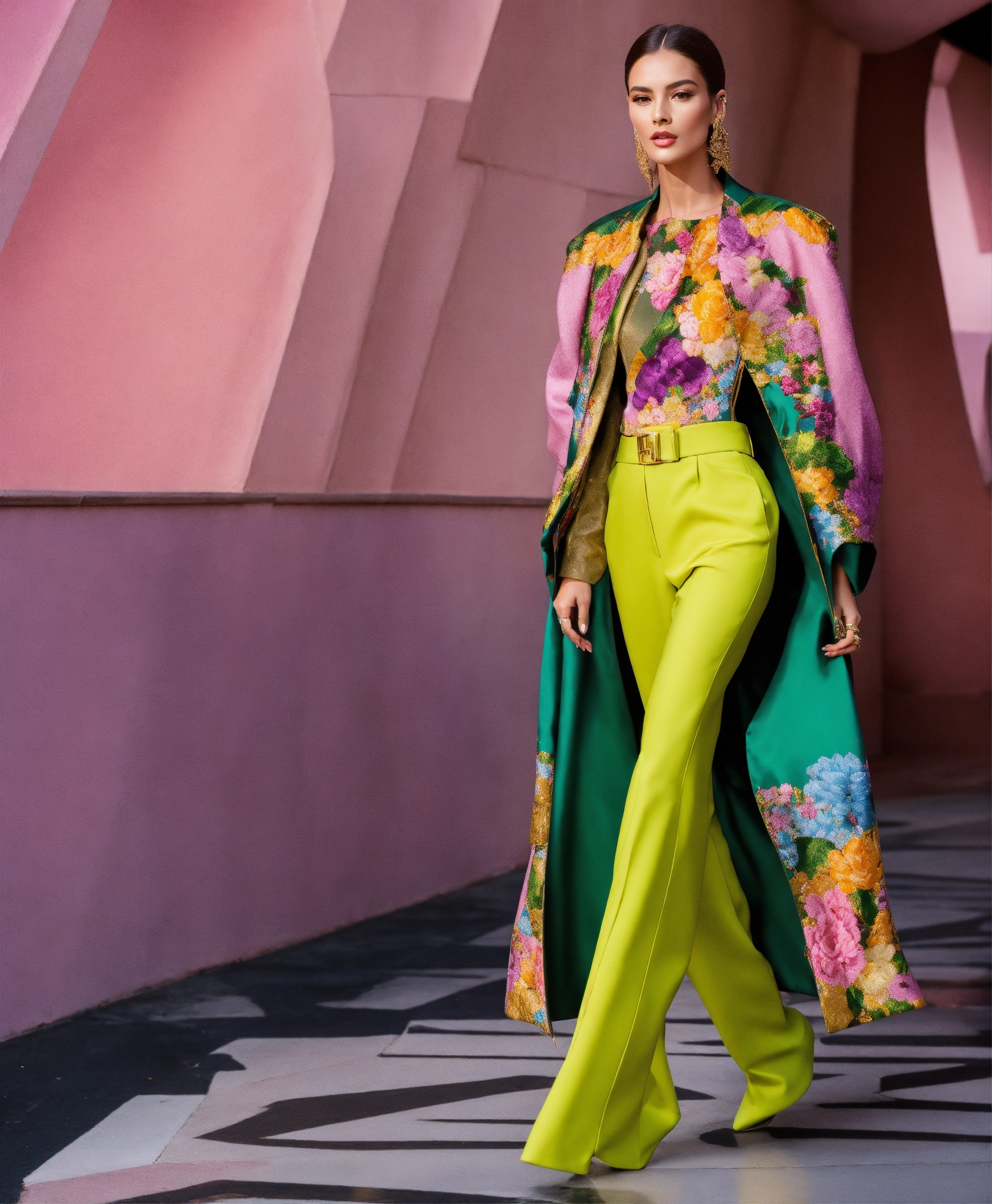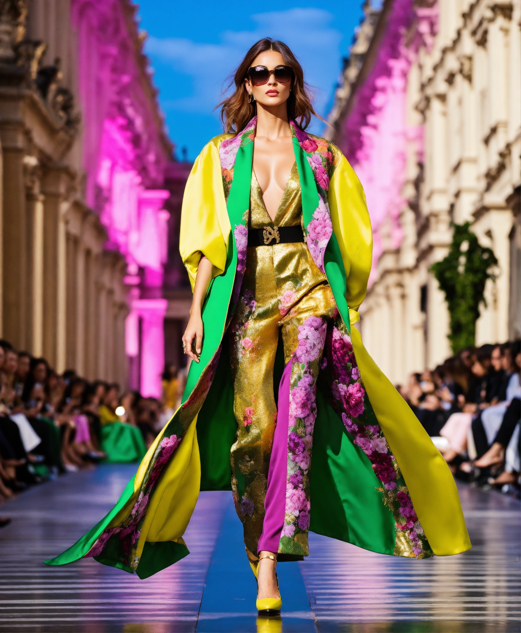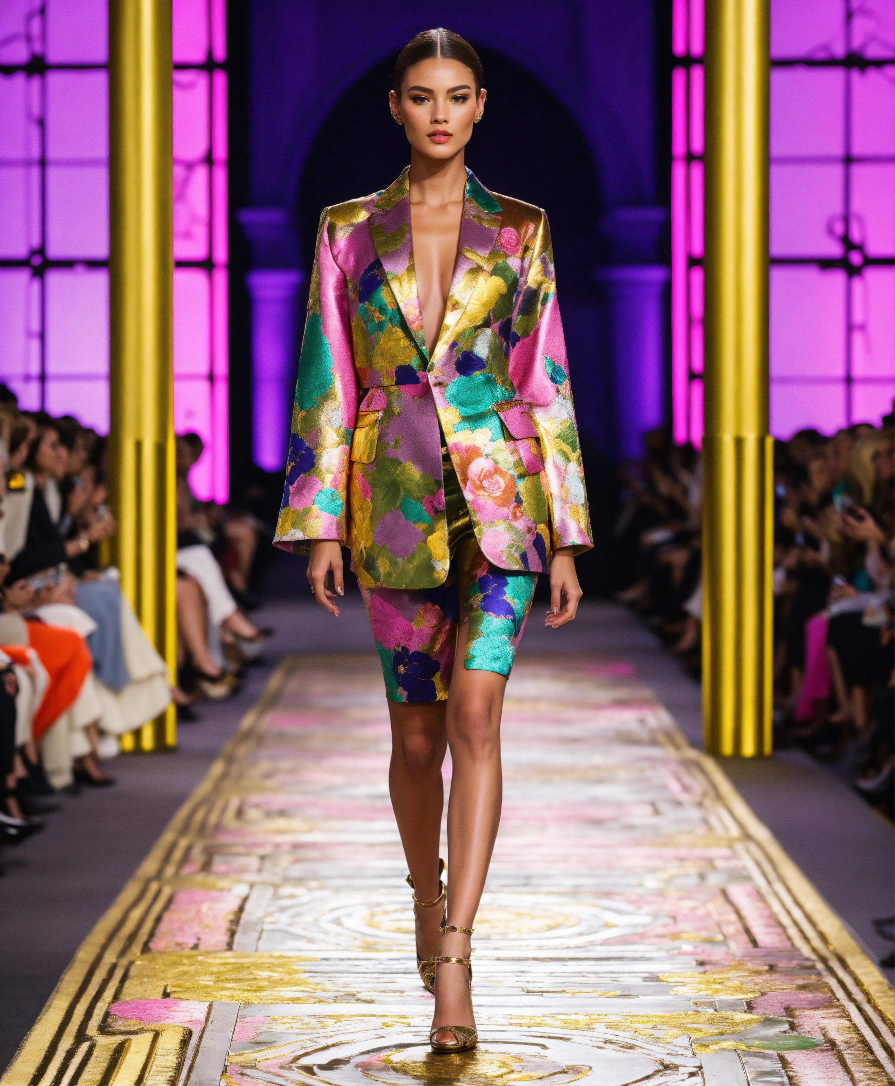 Ultra realistic full body photo of a chic french model walking the runway modeling summer designer novelty interesting complex unusual street sporty classy modern dolman sleeve outfit brave, paris versailles details cutouts and and gold geometric pattern floral structured tailored jacket pink gold green lilac peridot silver magenta lime fuchsia yellow blue black gray copper mauve bronze haute couture ultimate elegance beautiful luxurious awesome wealthy resplendent magnificent sublime 12k
