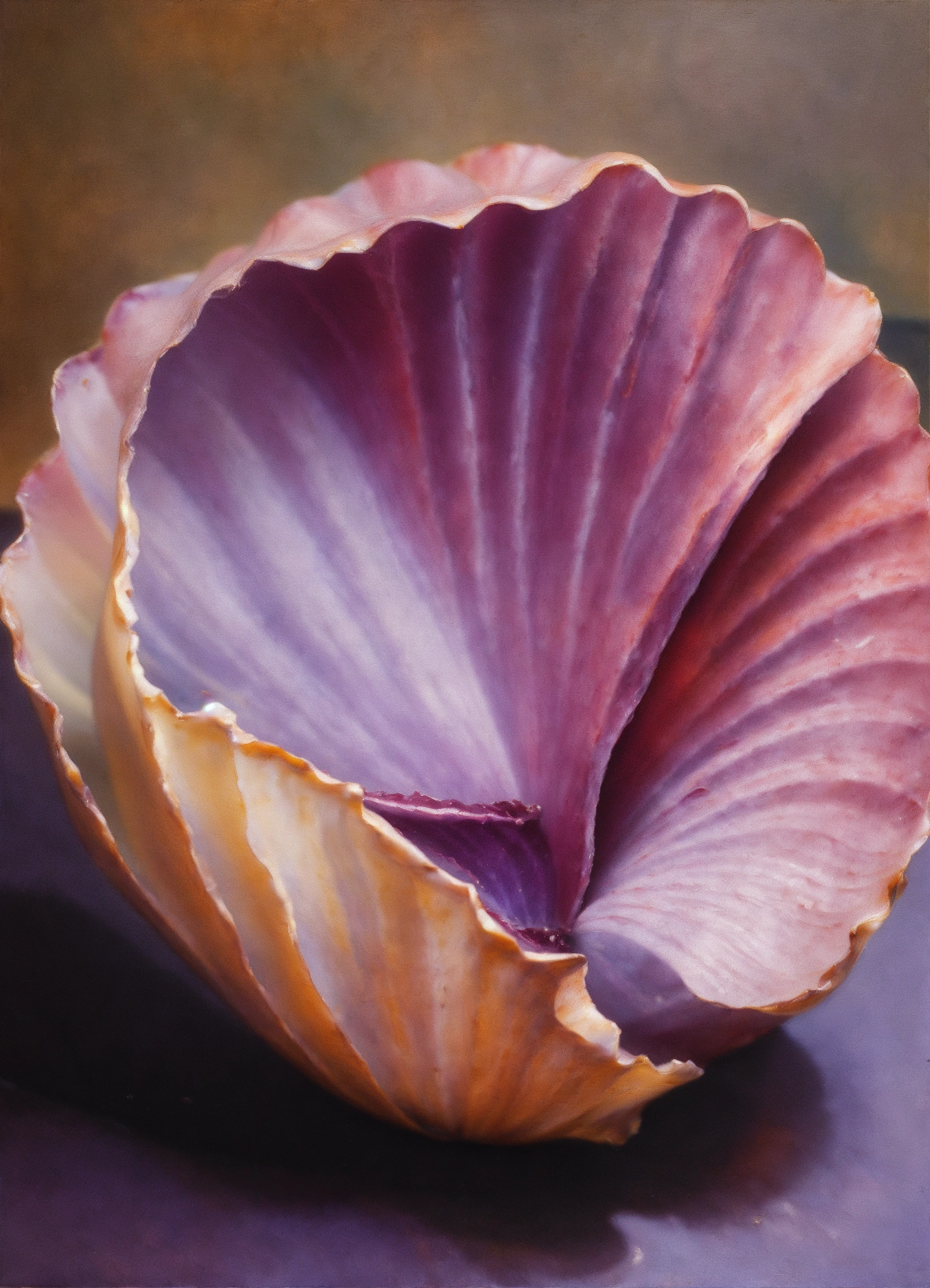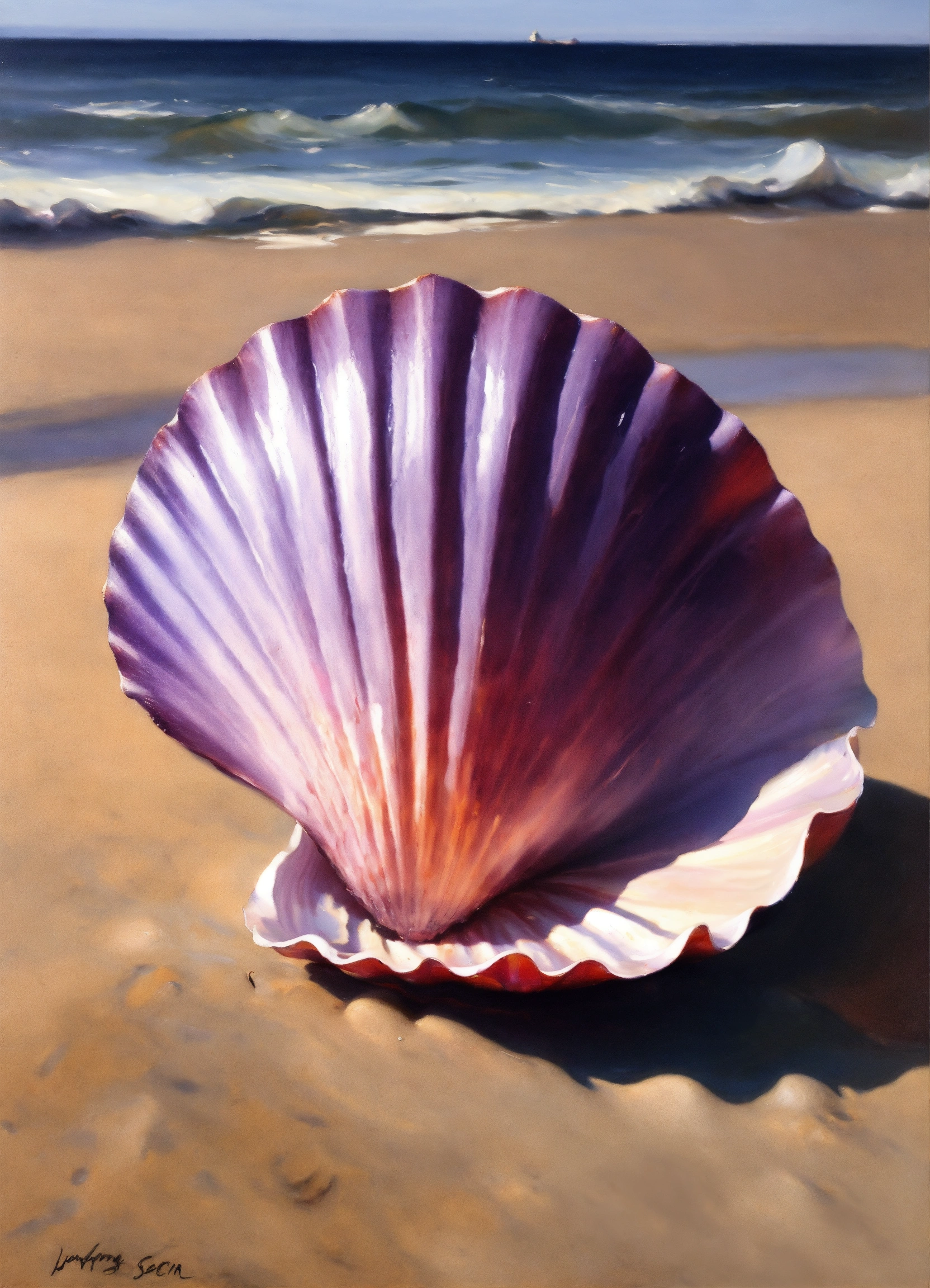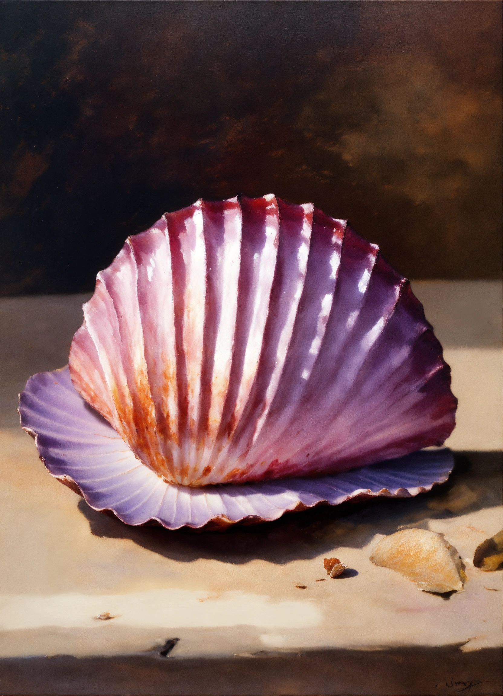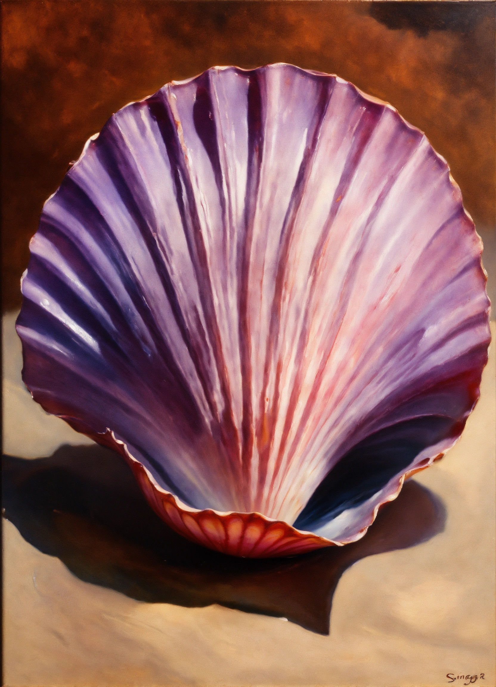 Oil painting of a purple and pink scallop seashell in the style of john singer sargent