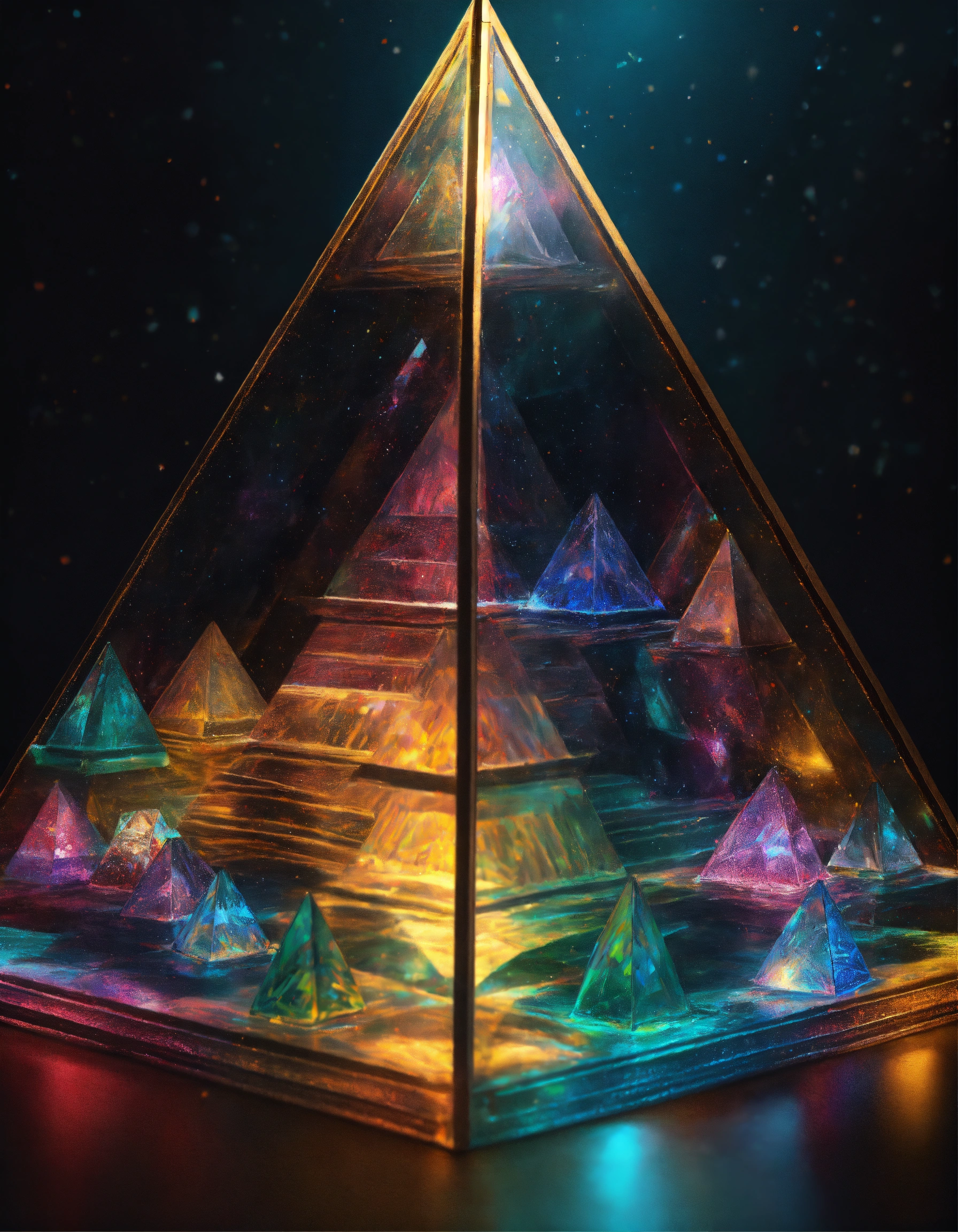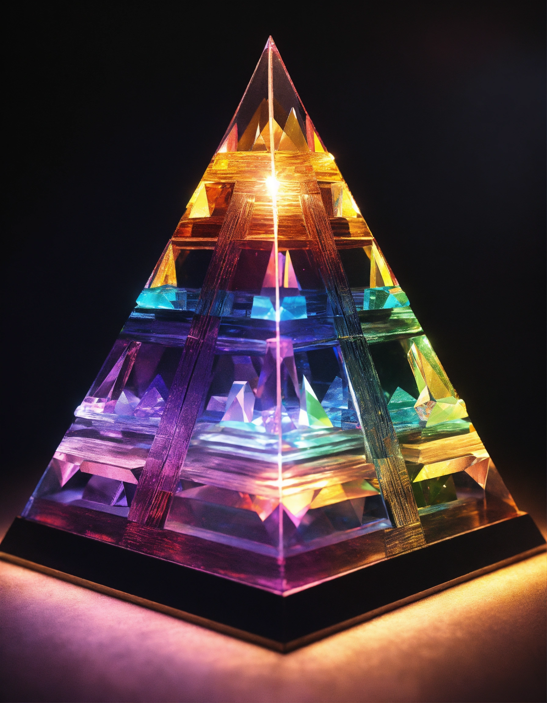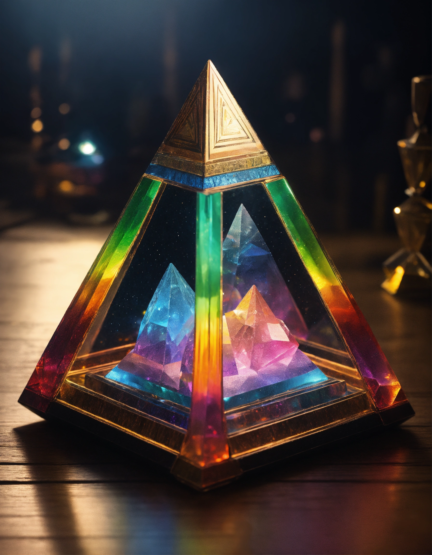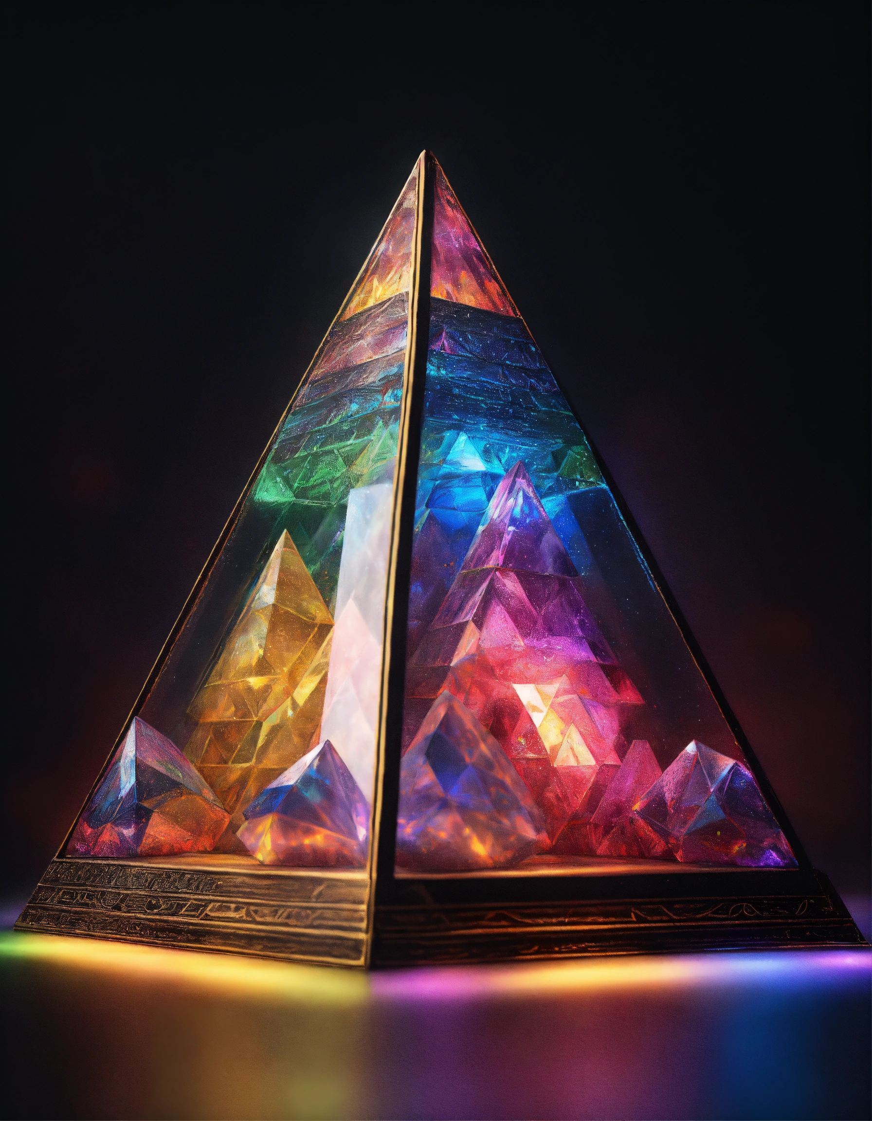 Realistic colored pencil drawing of a multicolored multidimensional crystal pyramid in egyptian style, black background, cinematic lights, 4k, 4d