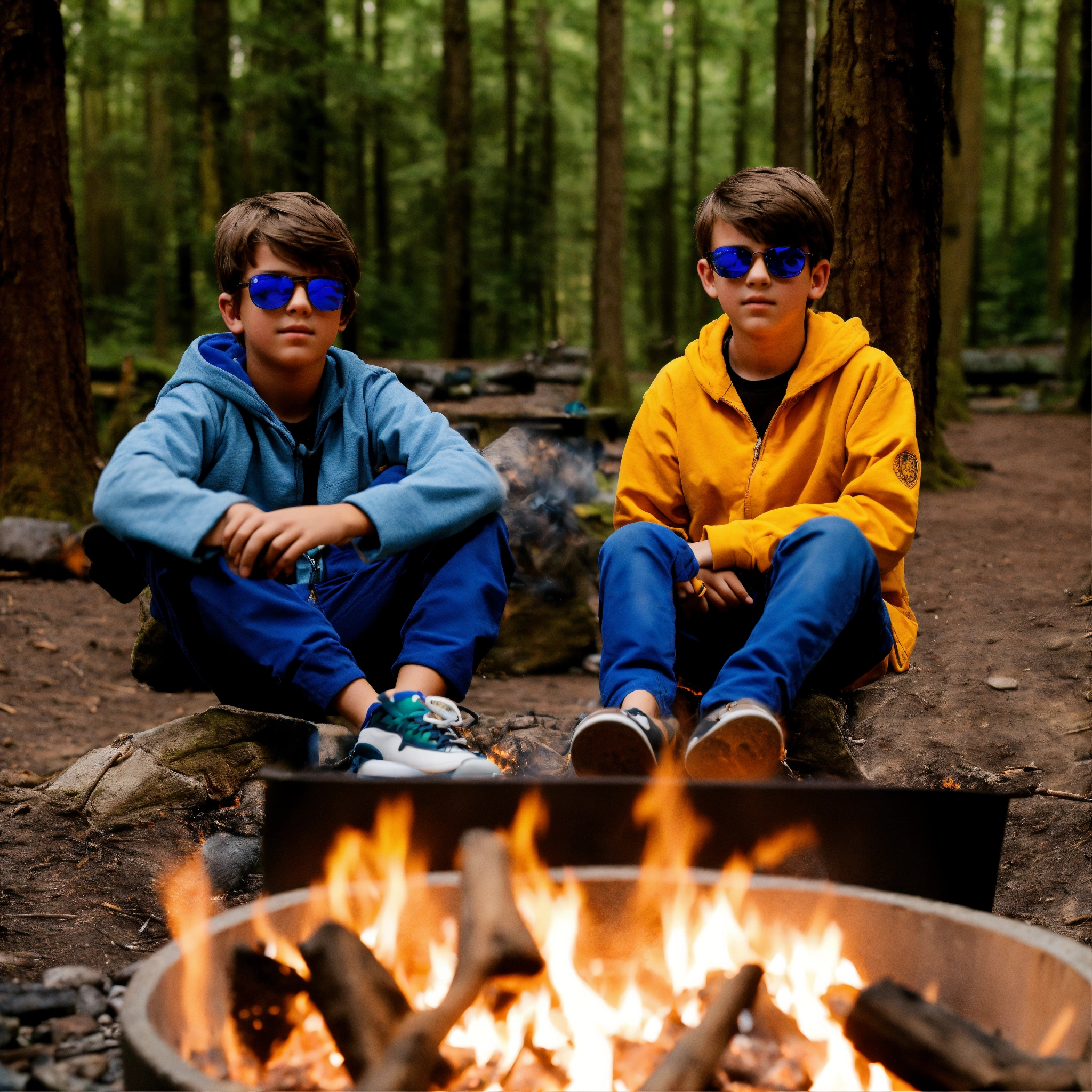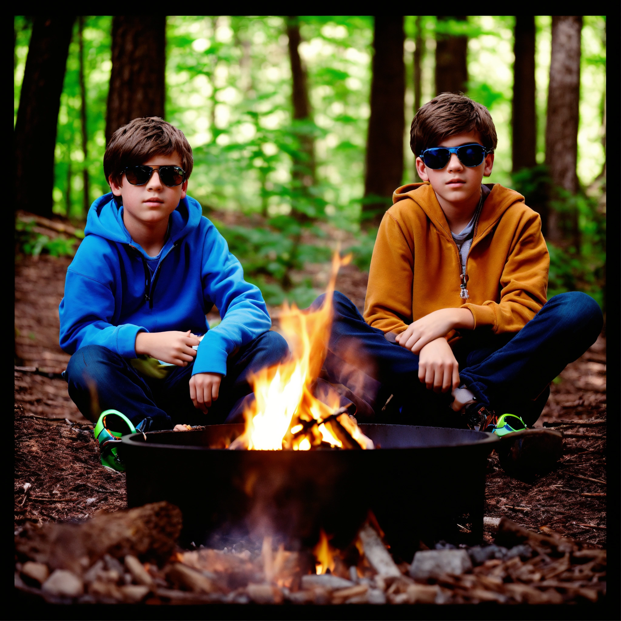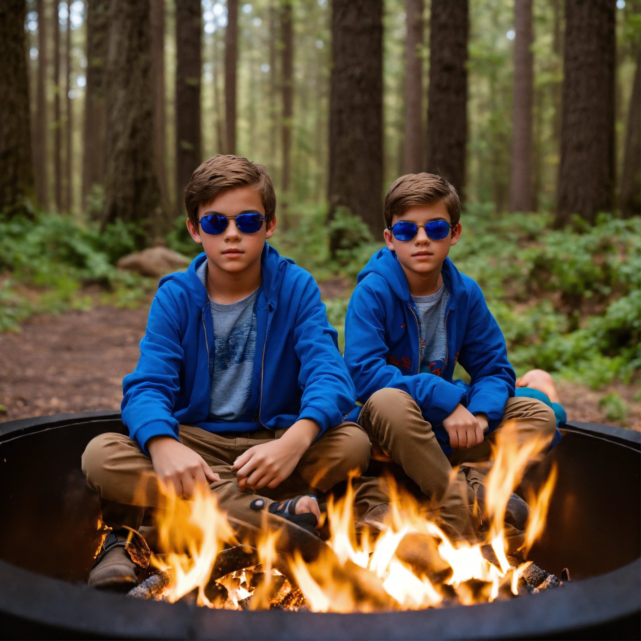 13 year old twin boys with brown hair, brown eyes, sunglasses with blue lenses sitting at a fire pit in the forest with their legs crossed.
