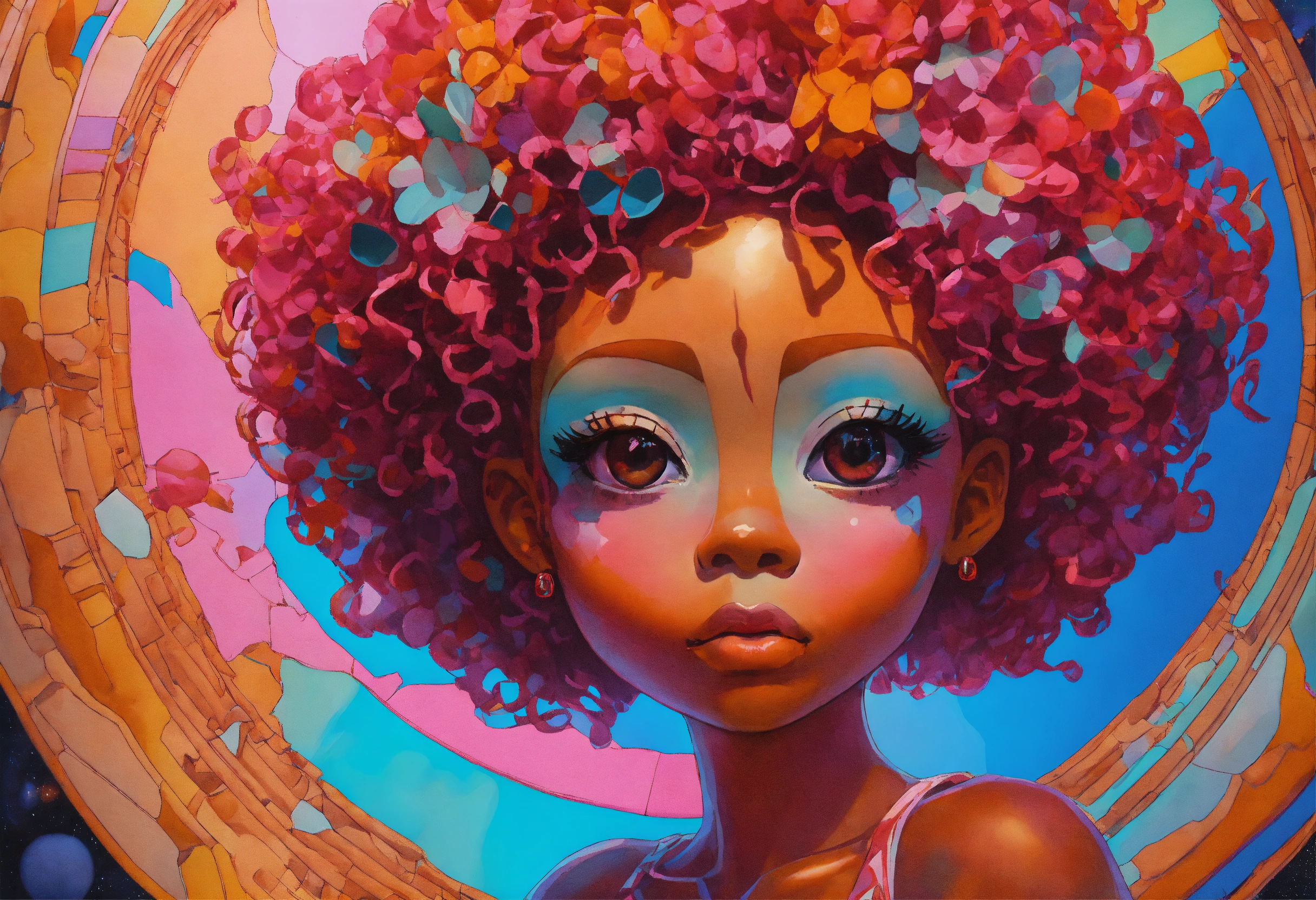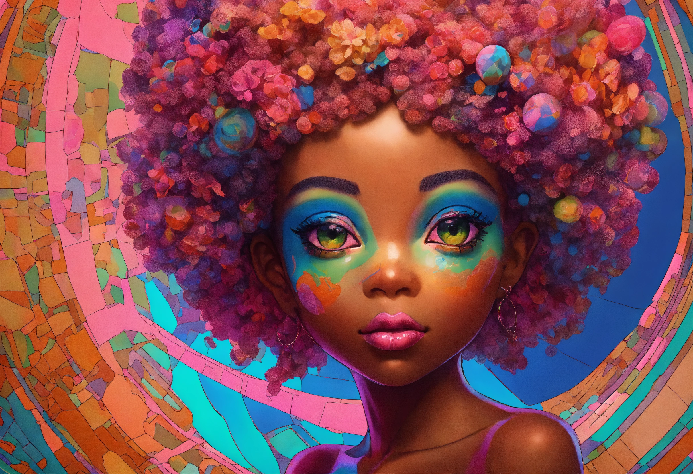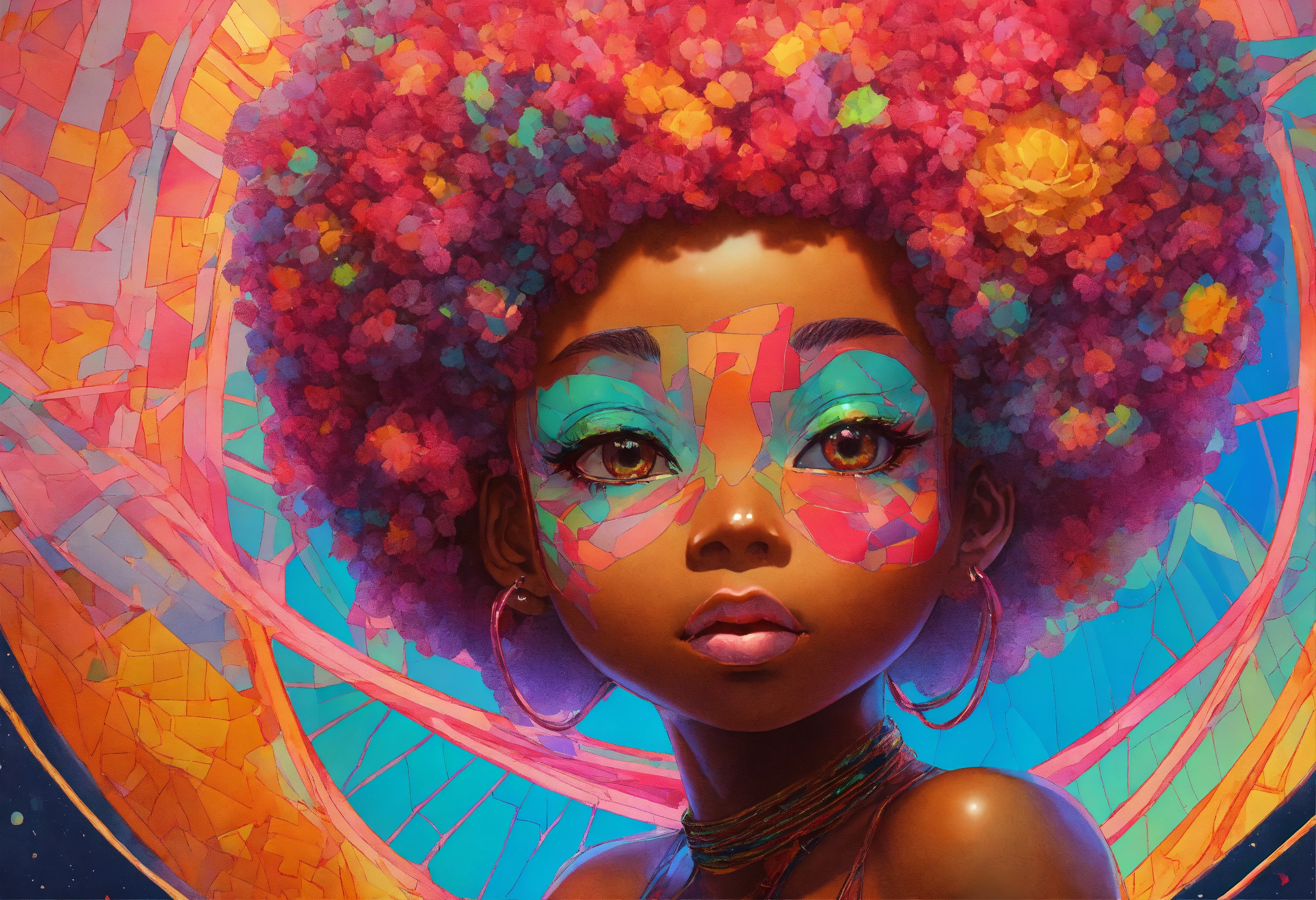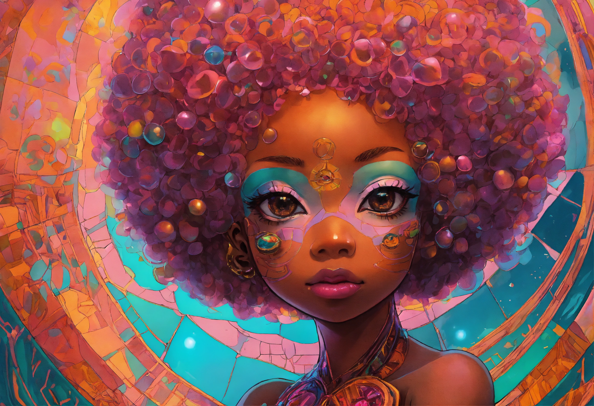 Manga kewpie kawaii afrocentric woman one eye open and one eye closed serene calm facial features colorful pastels. globe reflection in the one open eye. line drawing of a distorted map of the world background. evoked emotions that she sees outside the world without being seen8k full body sculpture of an afrocentric woman intricately carved from clear glass with vibrant neon plasma running through her. set against a wavy background, the glow of neon accentuates her crystalline skeletal structure. gentle lighting, combined with neon, illuminates her, emphasizing the plasma's luminosity, with a brightly lit ambiance. 1/4 ratio rule of thirds subject placement wide angle. show full head and hair