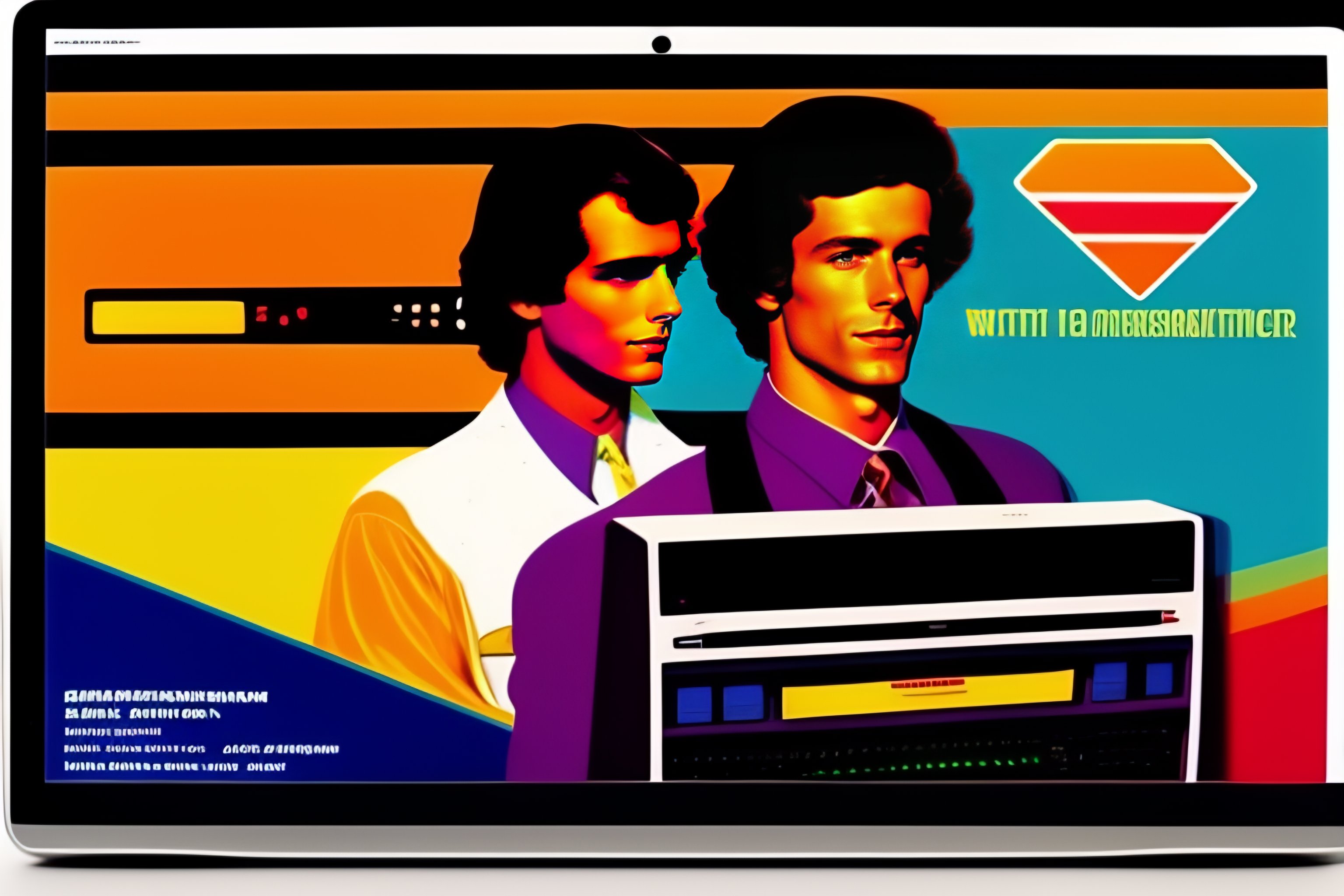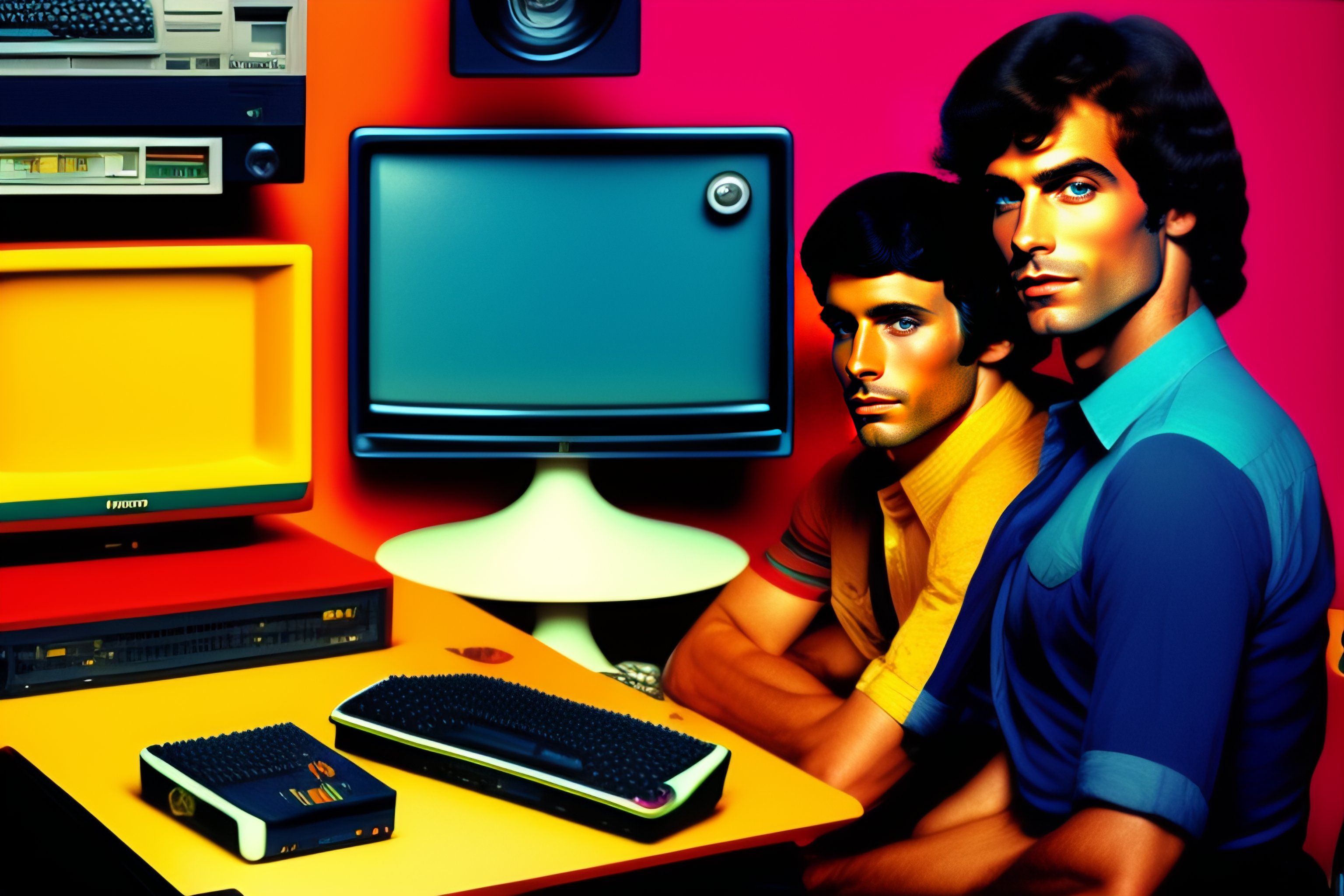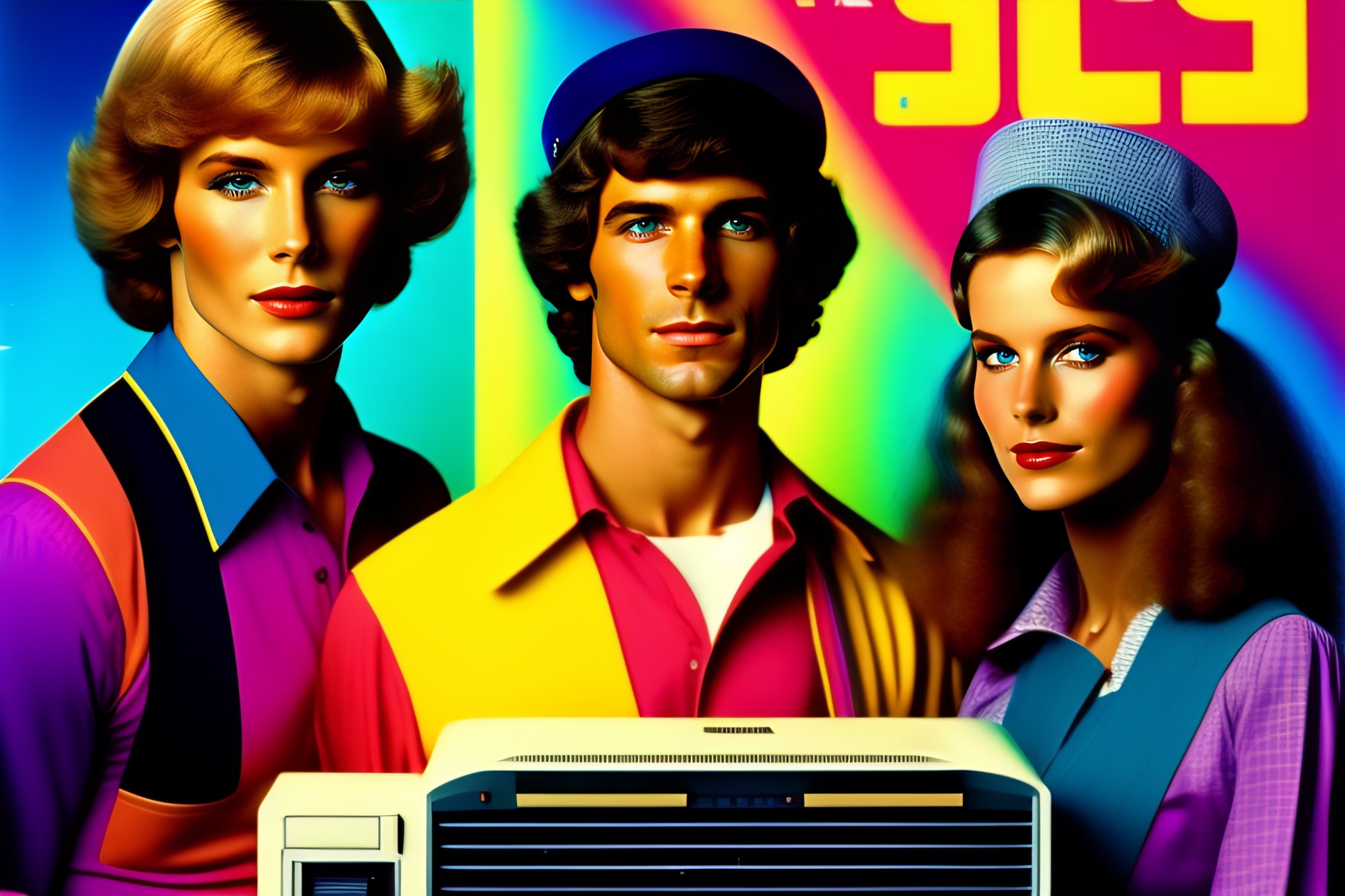 Full - color 1980's magazine advertisement for a retro software company, whit hipster programers and retro computers, strong colors, no copy, blond, hipster biered