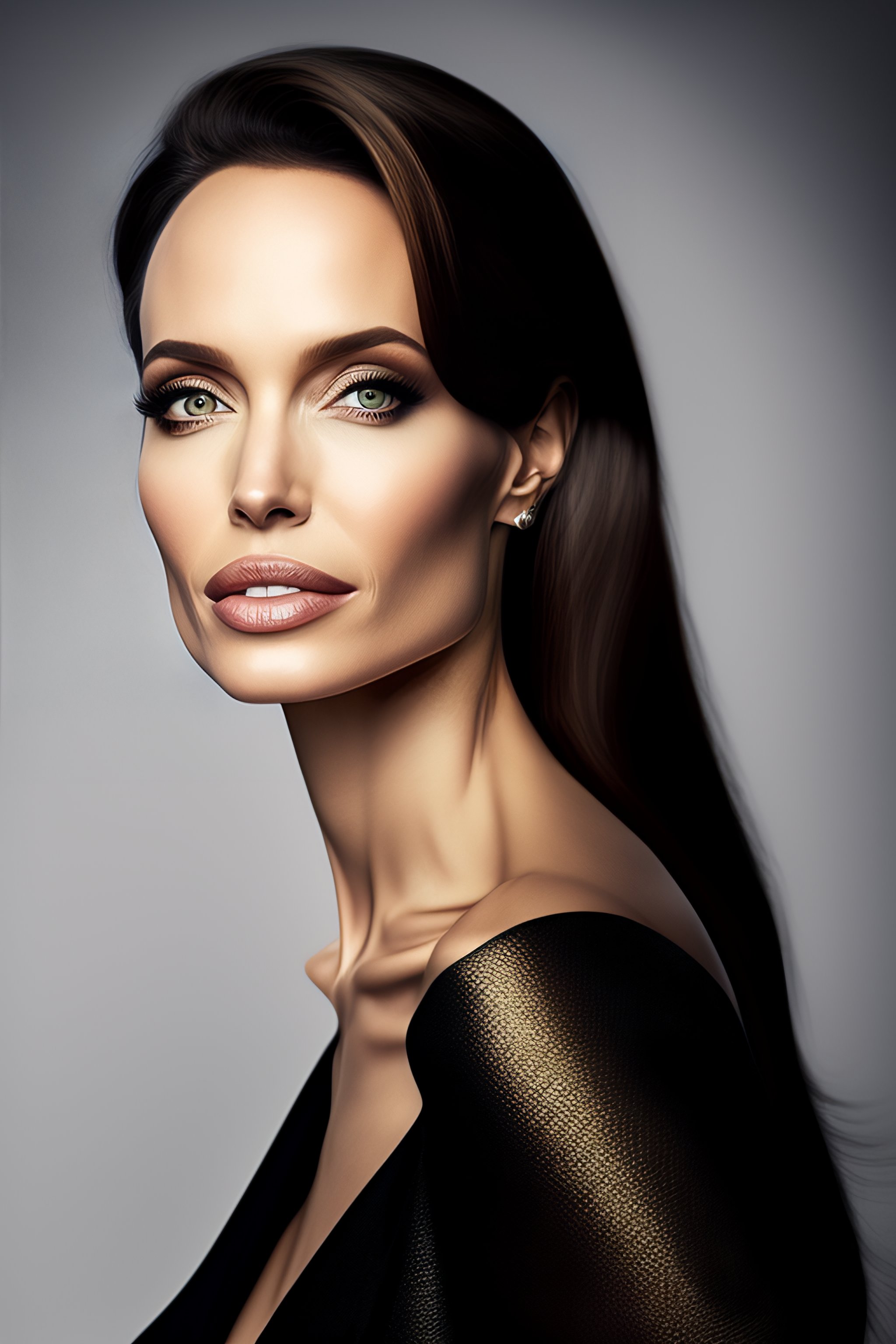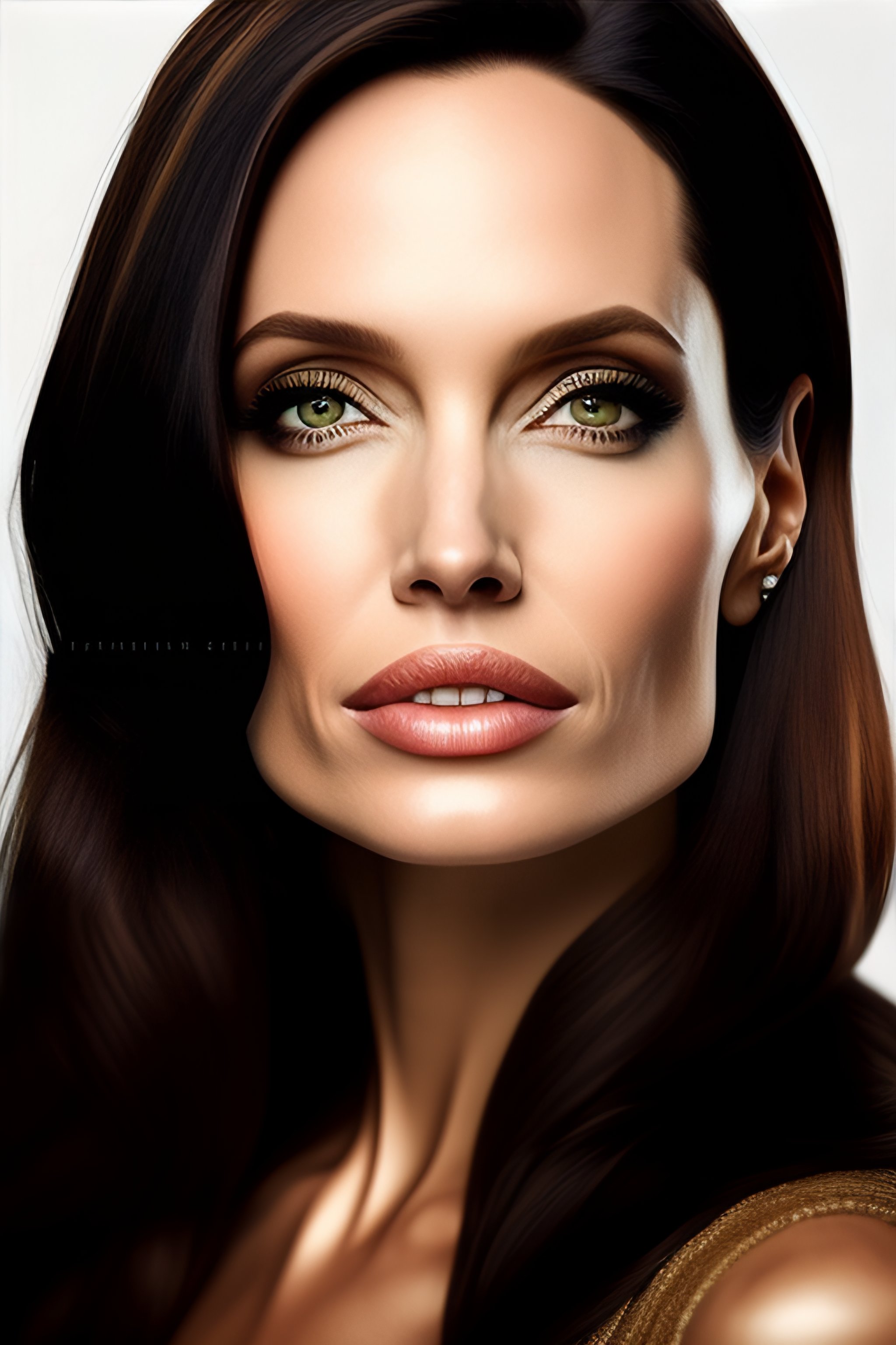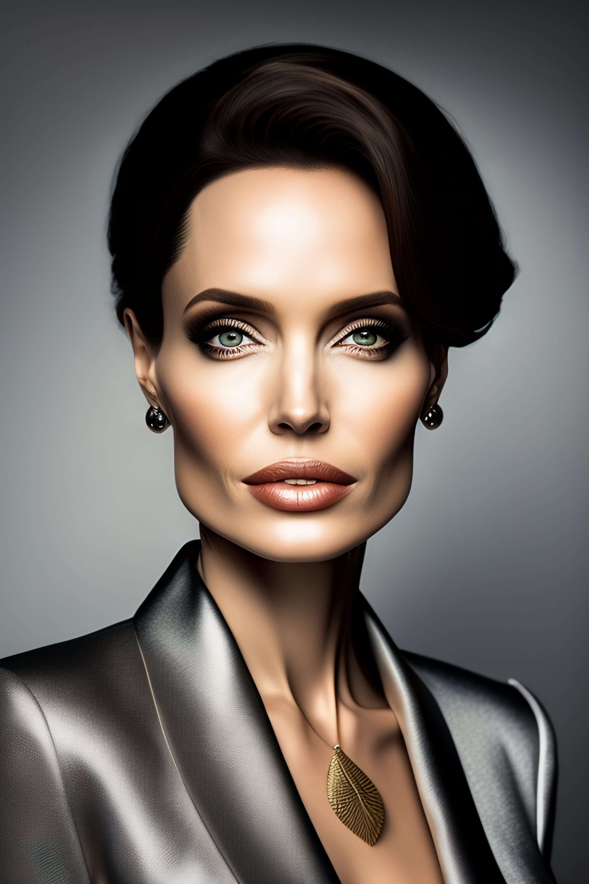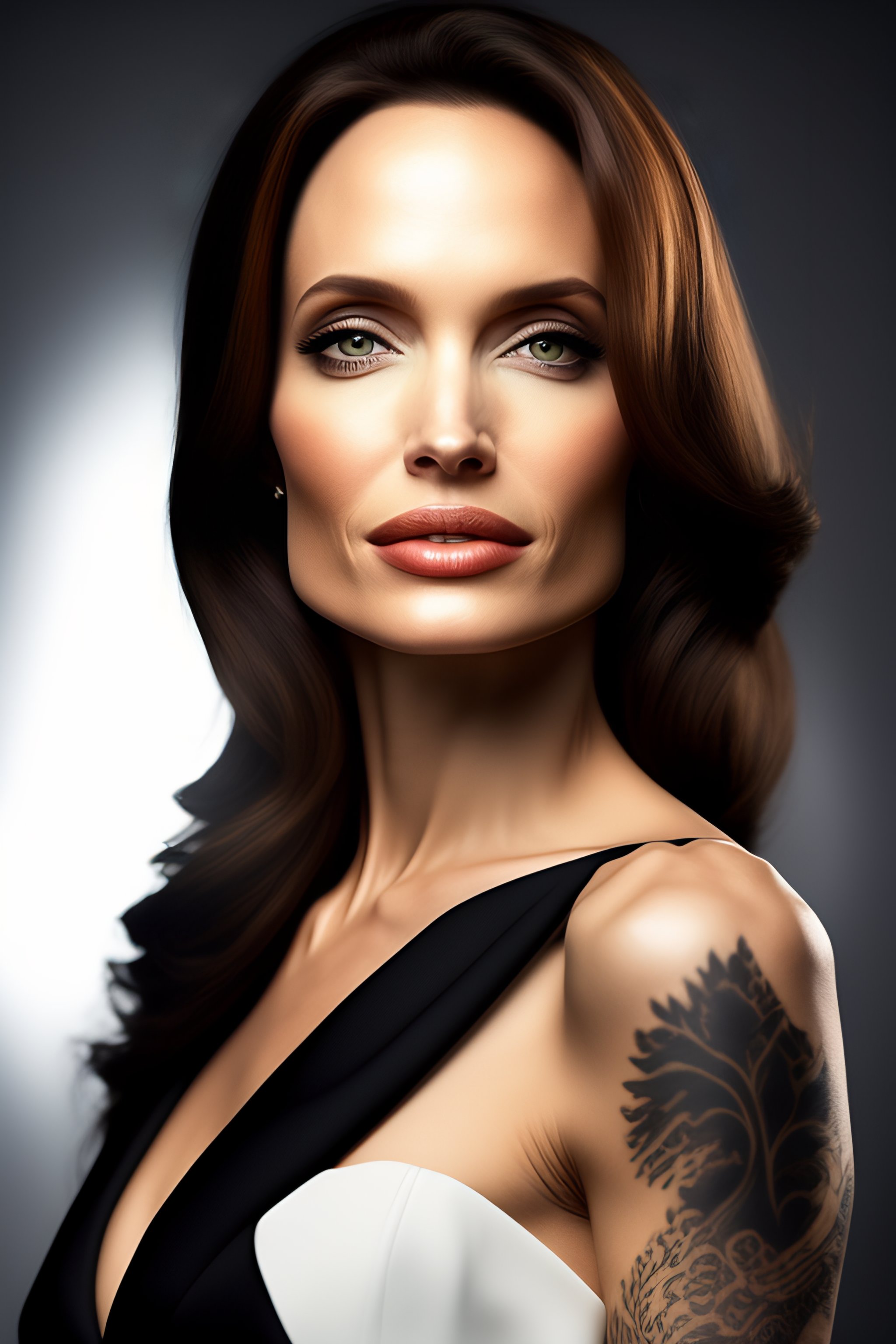 Business headshot of angelina jolie, slight smile, feminine, high contrast, strong shadows, with tattoos, hair partial highlight, flirtatious look