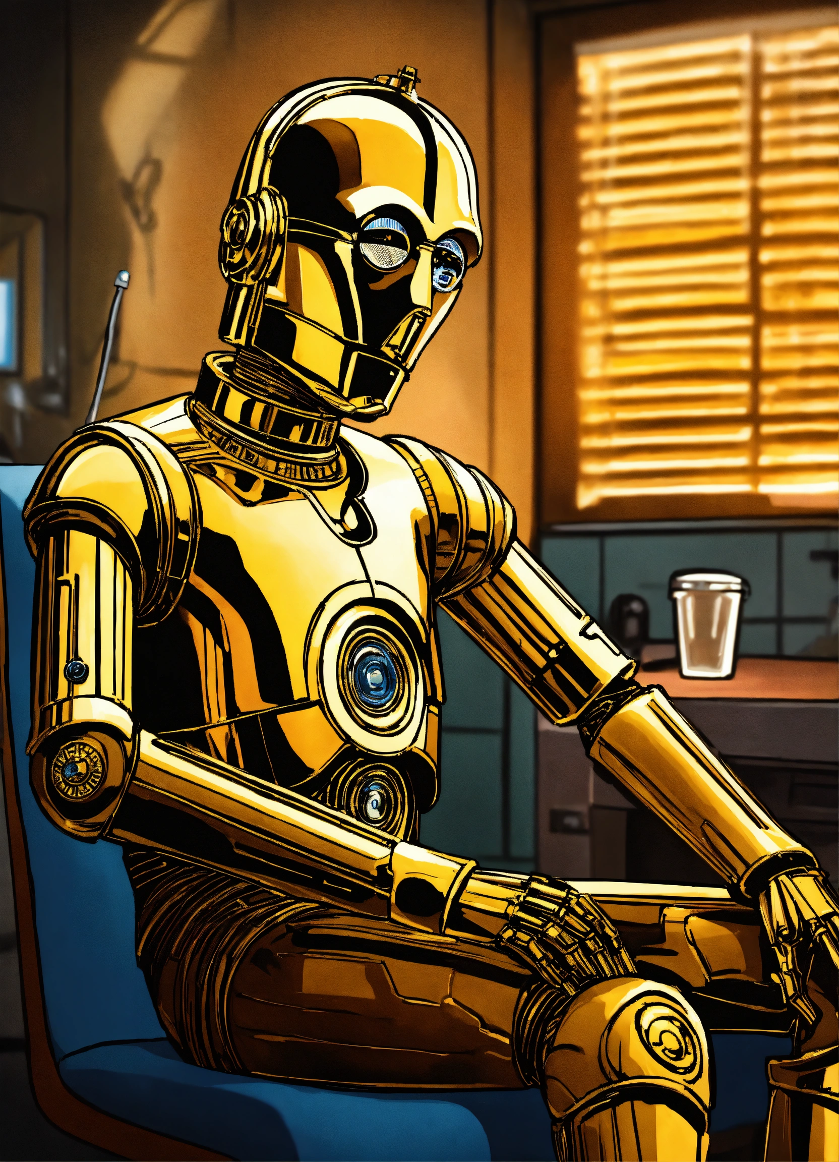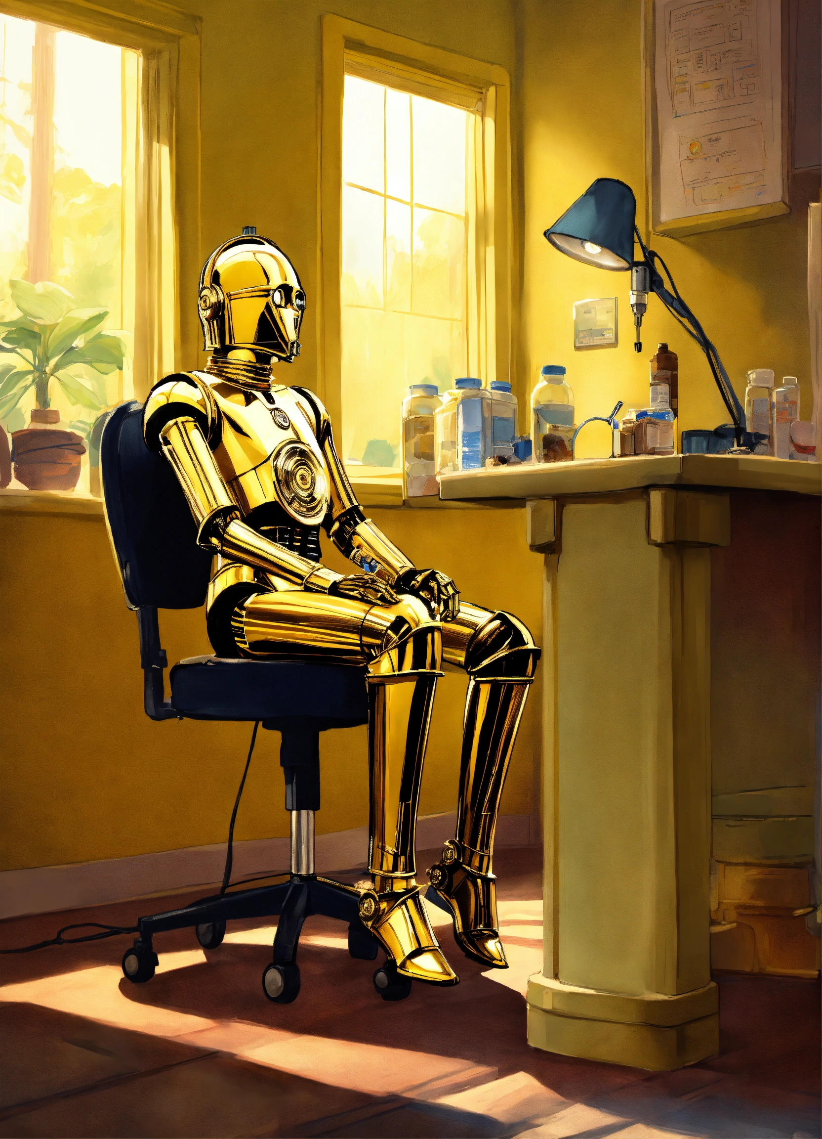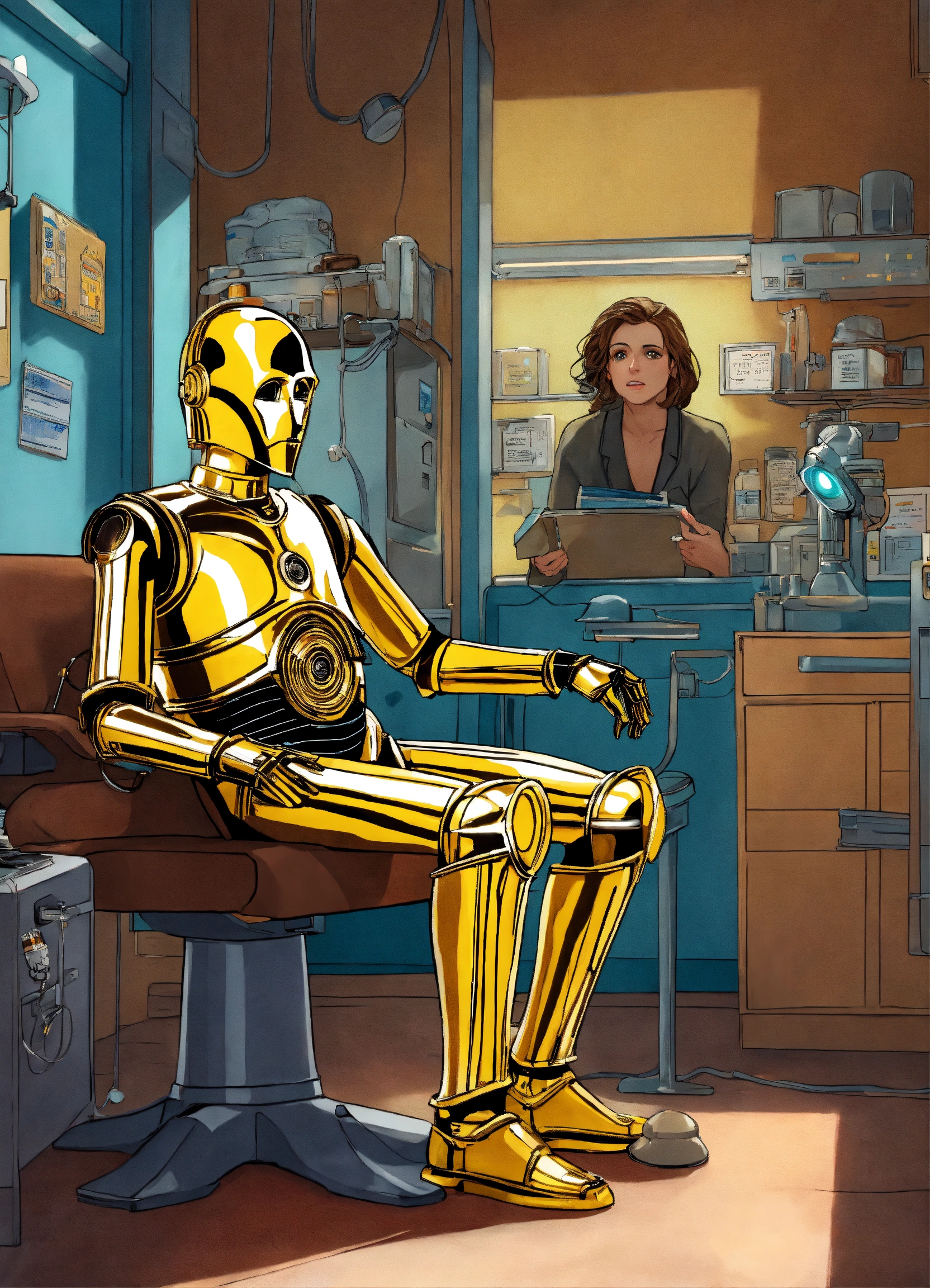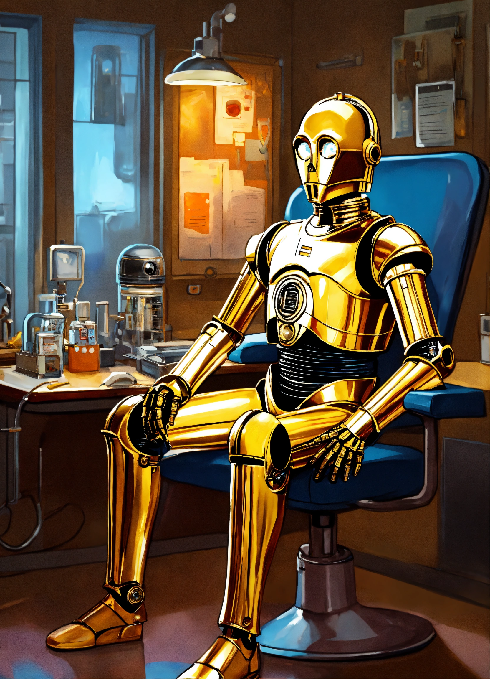 Illustrate a whimsical scene where c - 3po, the droid from 'star wars, ' is at the doctor's office. frame the scene in a 9 16 portrait format to focus on the character's visit. depict c - 3po sitting on a doctor's examination table, with medical instruments nearby and a physician or medical droid attending to him. capture c - 3po's unique expression, conveying his curiosity or concern about the examination. use futuristic and clinical lighting to create a playful yet sci - fi atmosphere.
