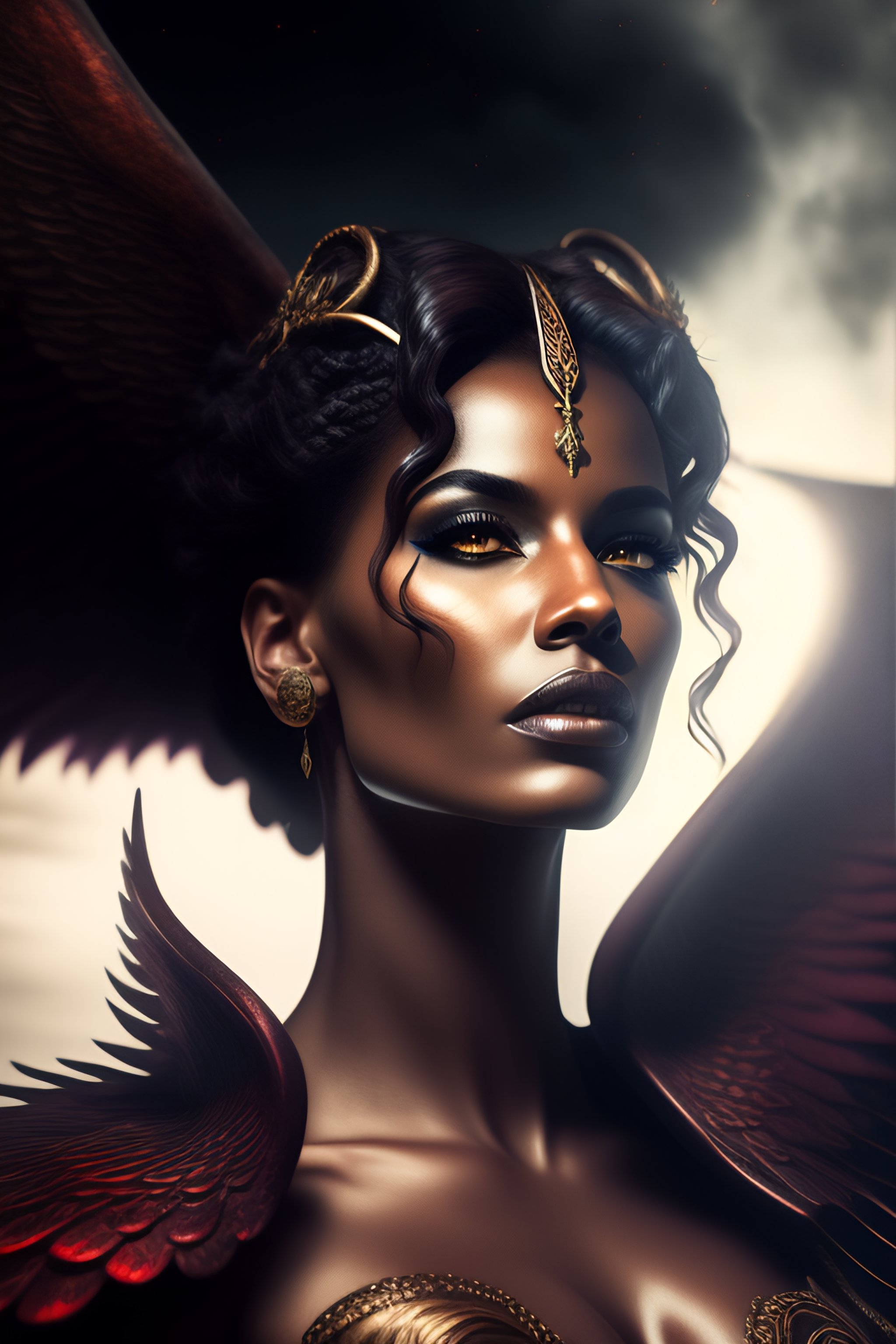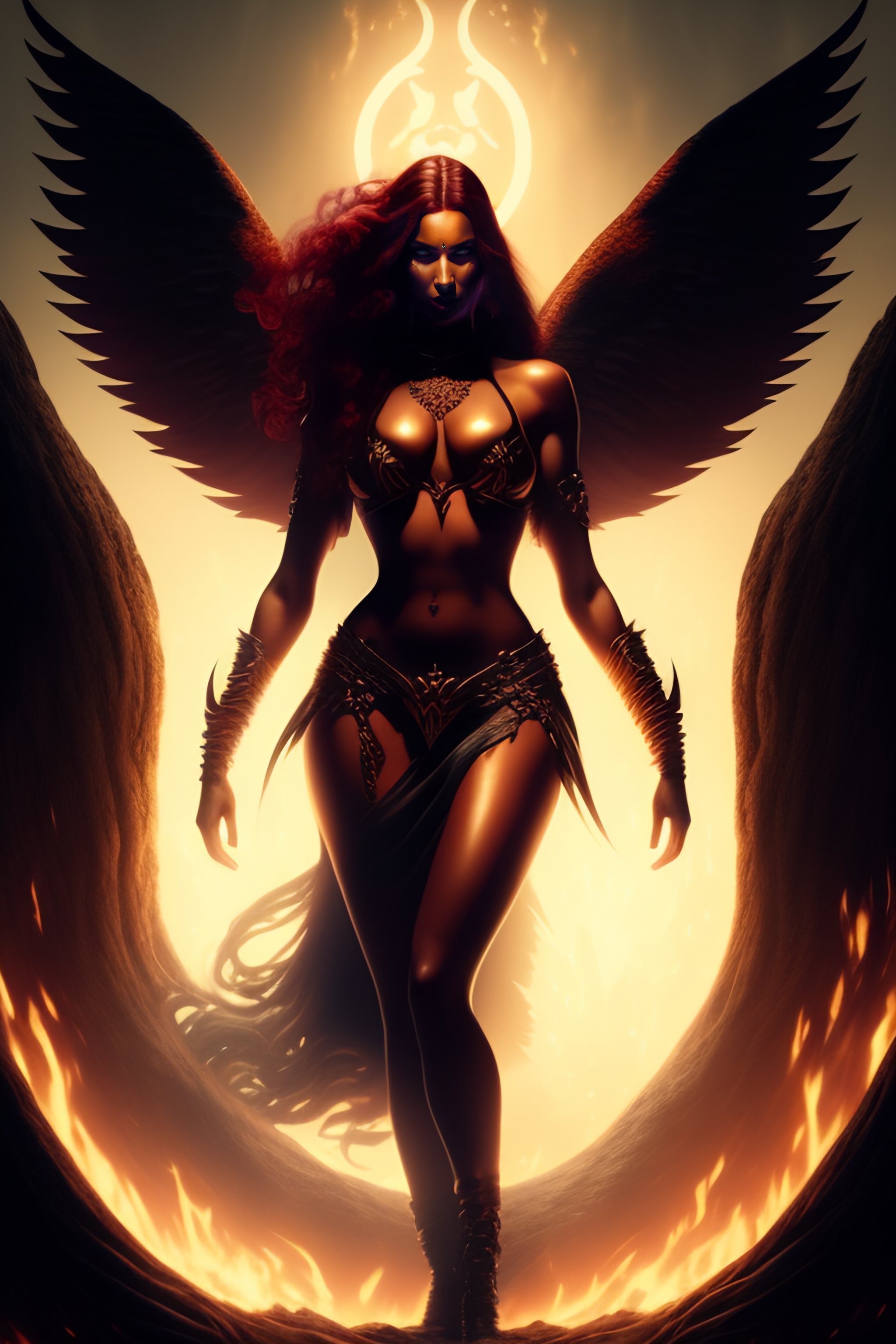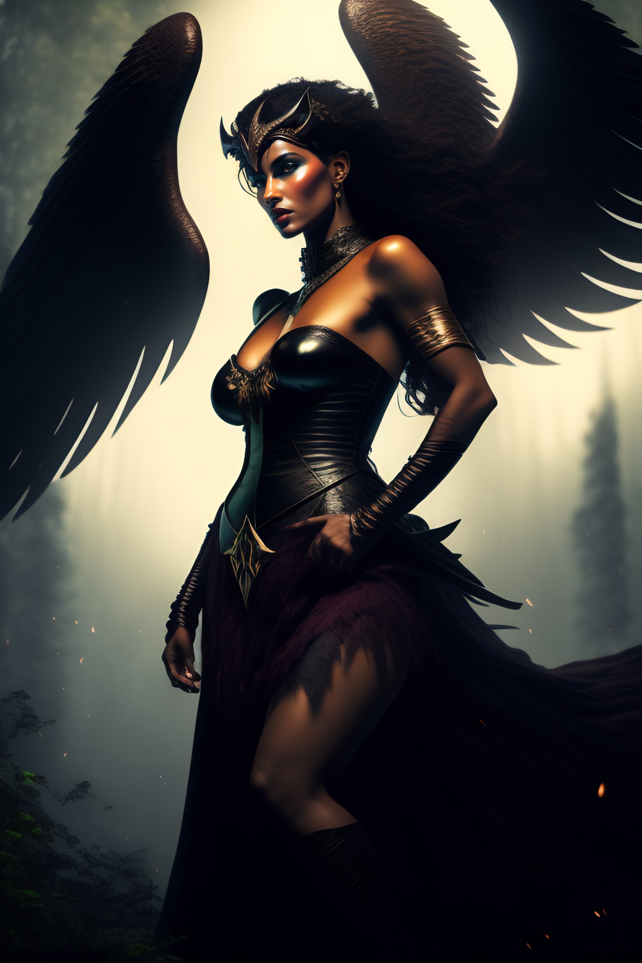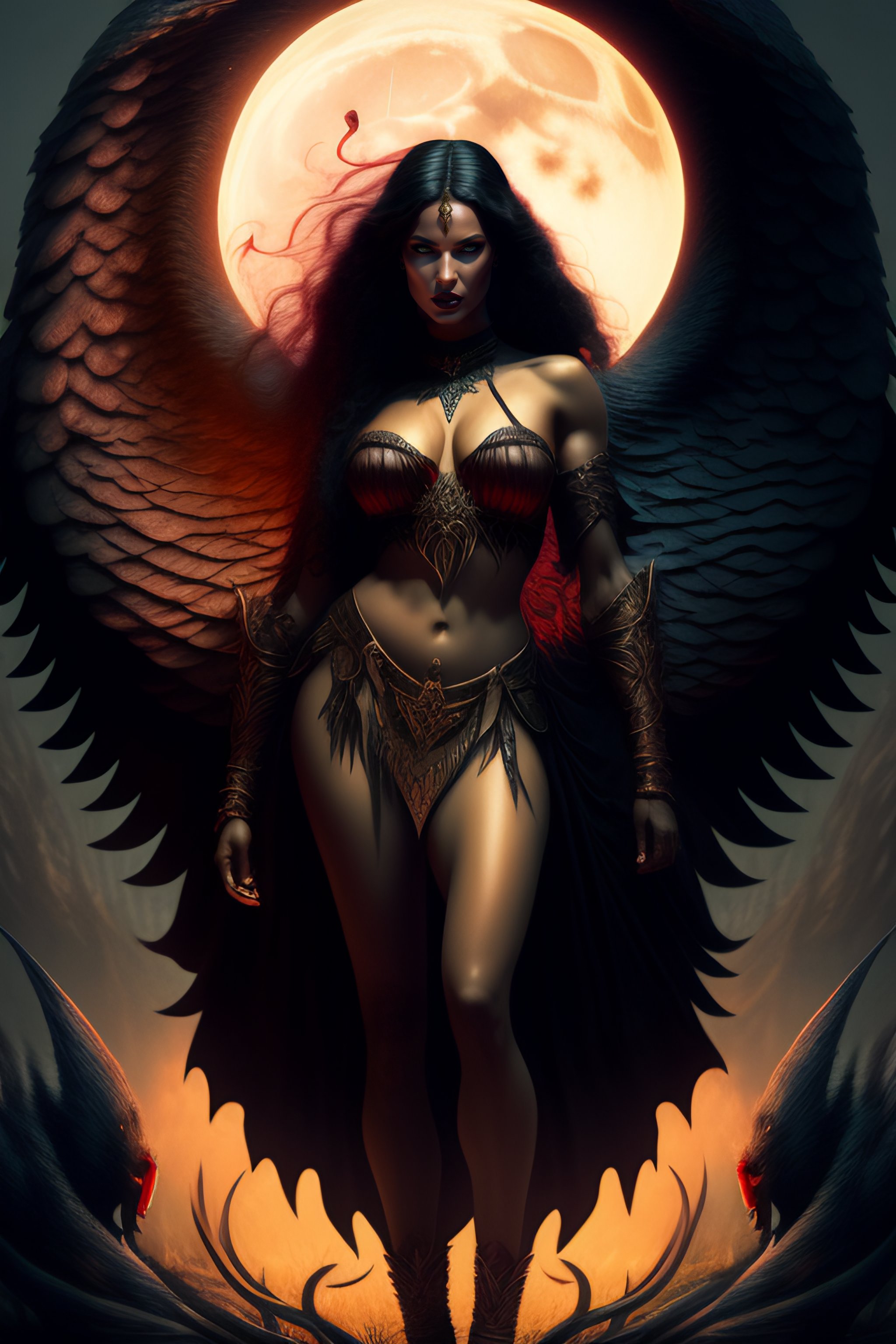 Lilith, the mythical first woman and demon of folklore. she should be depicted in a powerful and imposing manner, with wings and claws. set her in a dark, foreboding forest, surrounded by twisted trees and shadows. in the background, there should be a full moon, casting an eerie glow over the scene. lilith should be depicted as if she is about to attack, with a fierce expression and bared teeth. include at least three unique details in the image to make it visually striking and evocative of lilith's mythic origins.
