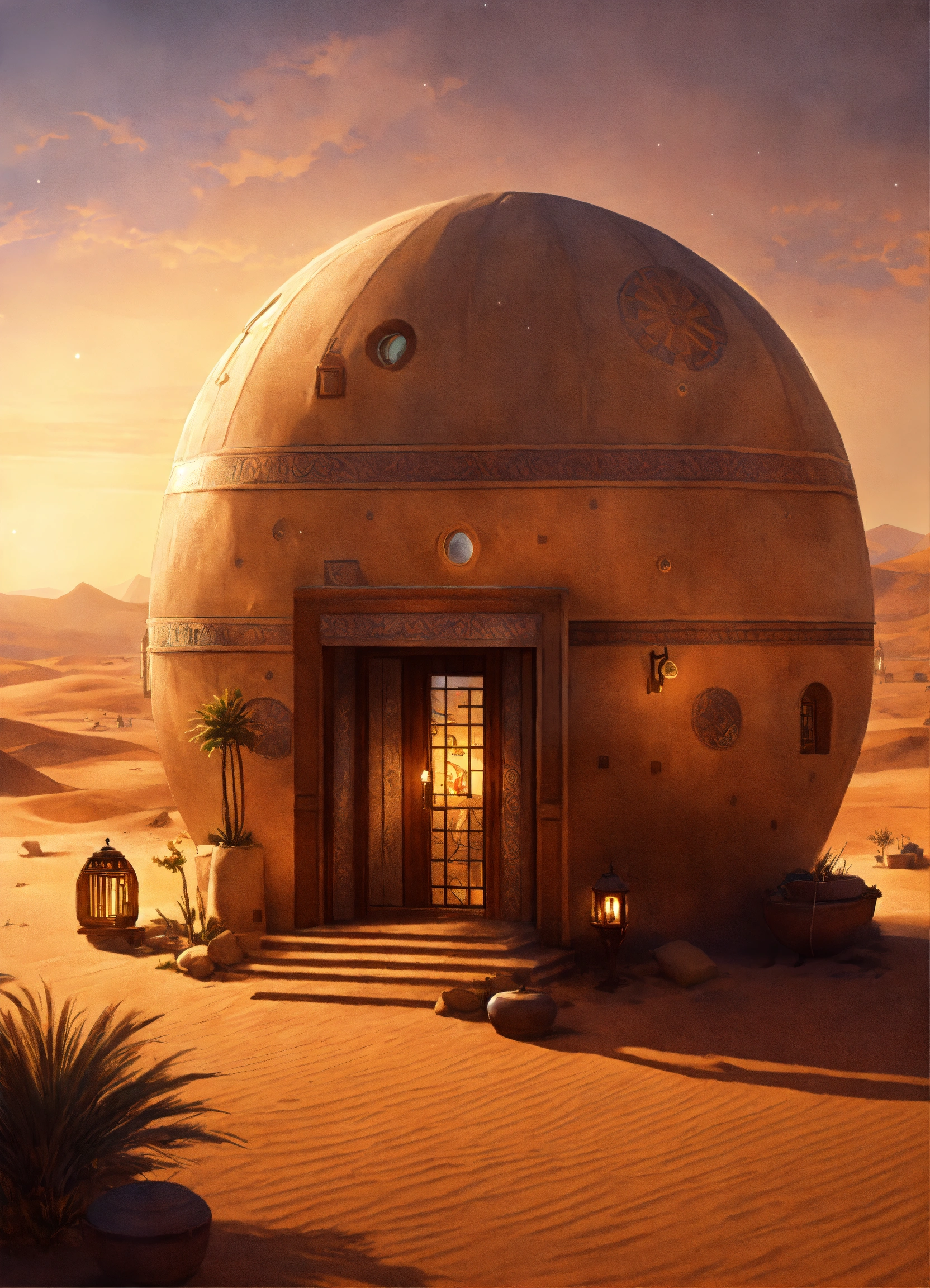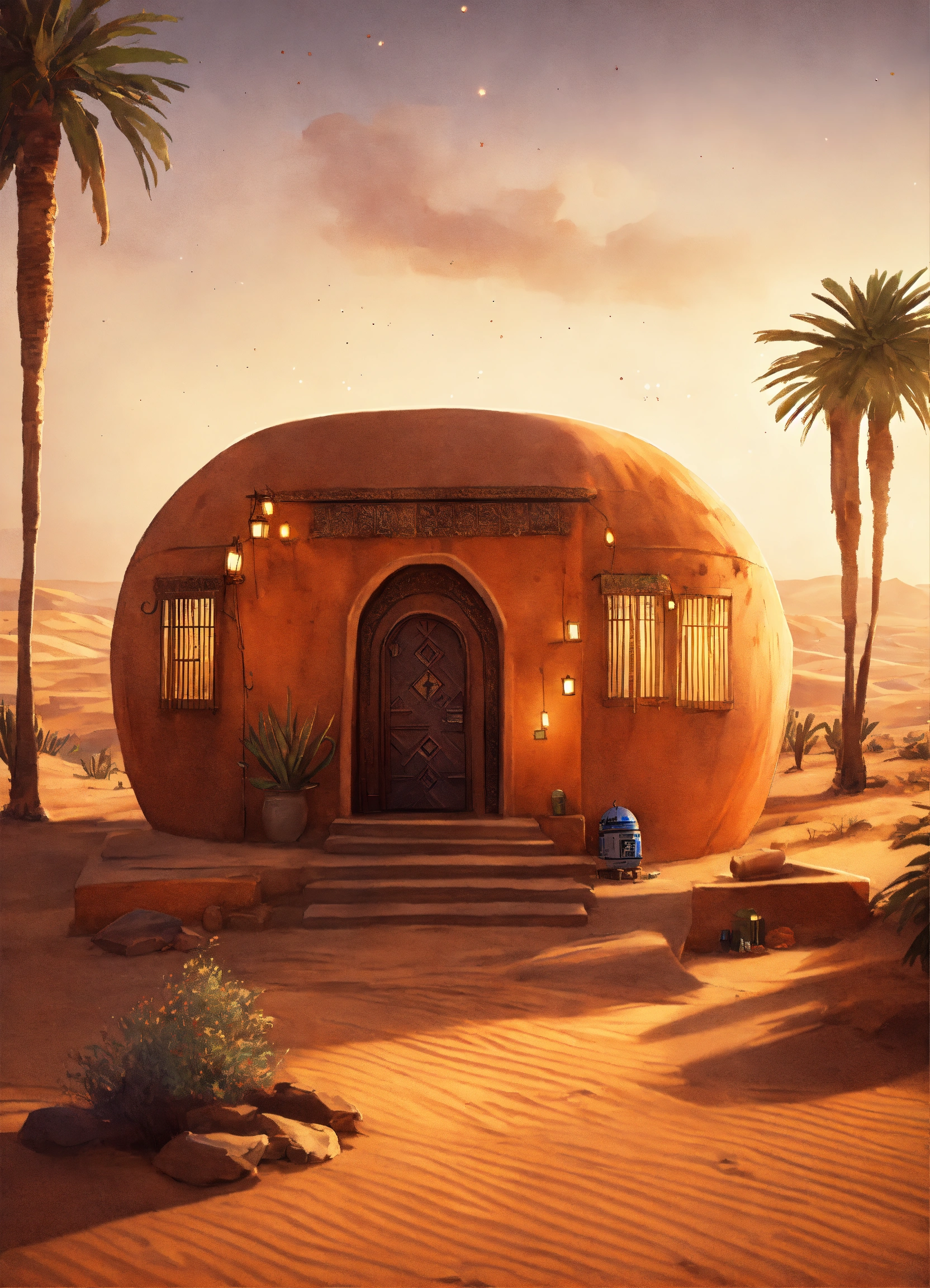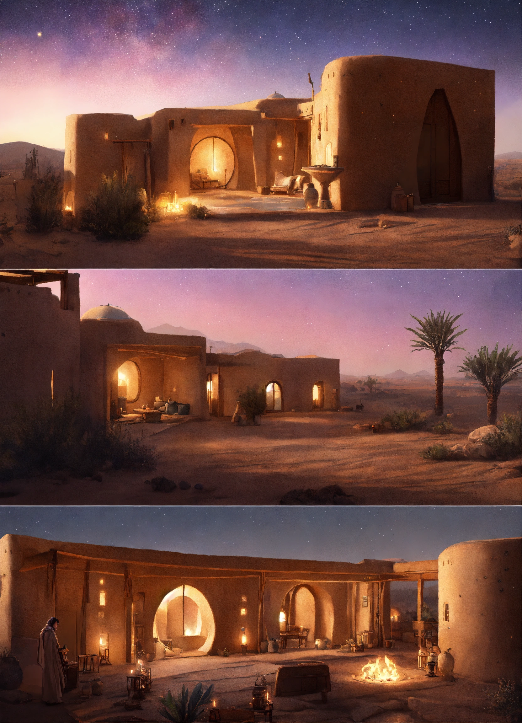 Concept art of a large desert home, star wars, jakku, desert, flat roof, several rooms, hut, one story, peasant, fire and chairs outside, survivor, charming, desert planet, multi-room, moroccan, starry desert planet sky, lanterns outside, moroccan fairy light lanterns outside poor, view from the outside, exterior view only, stucco outhouse, patterned design stucco walls, windows without glass, windows have shimmer flowing curtains, exterior only, house with courtyard in the center