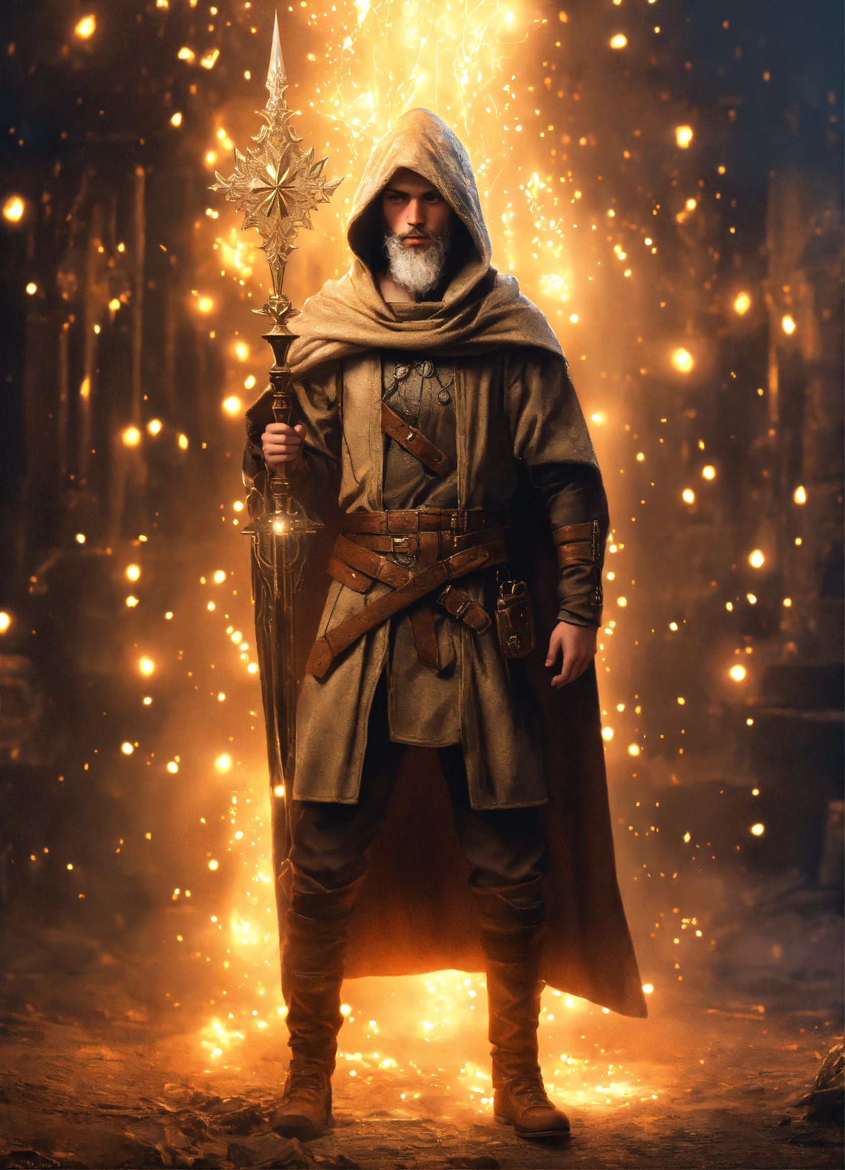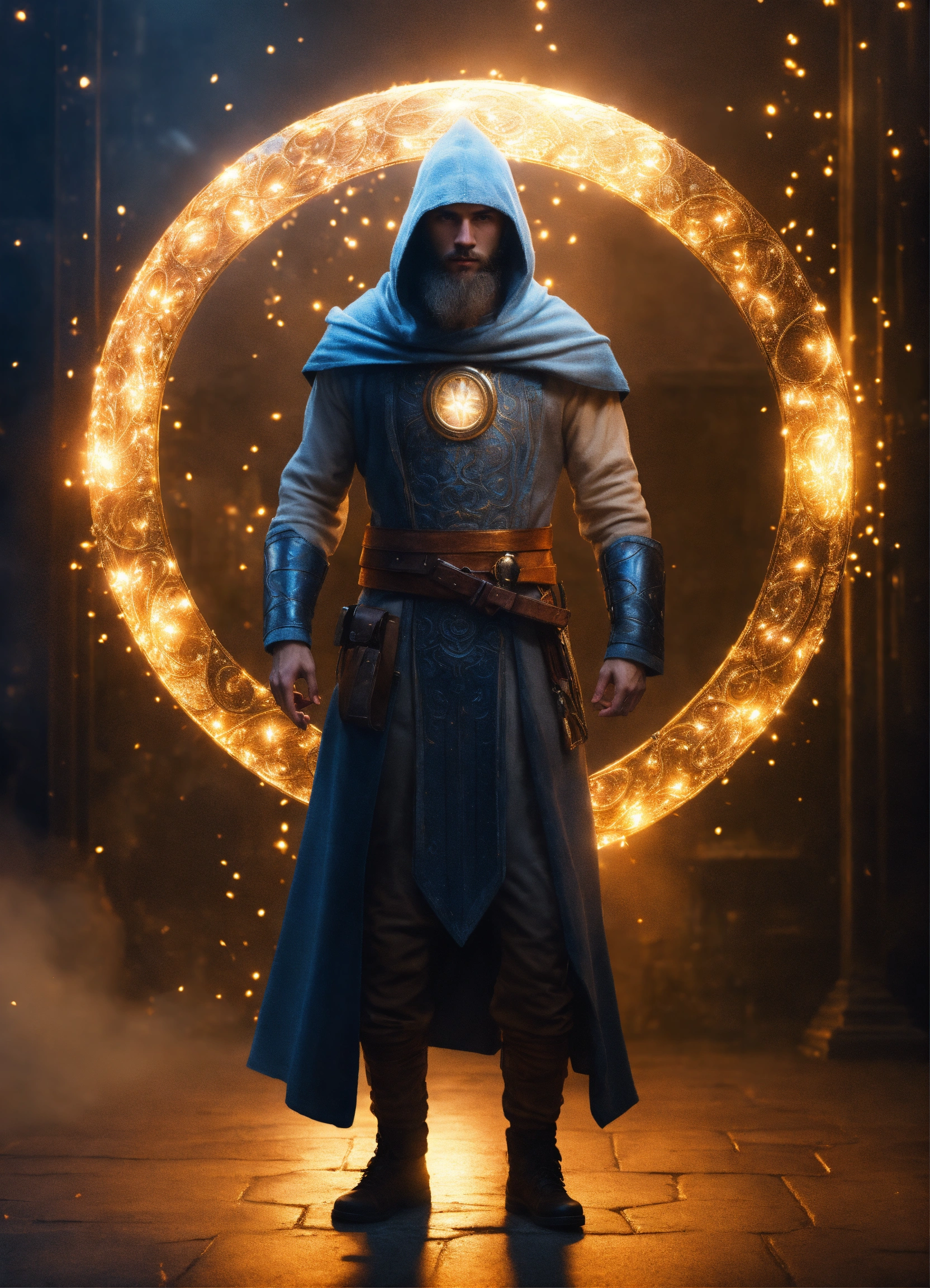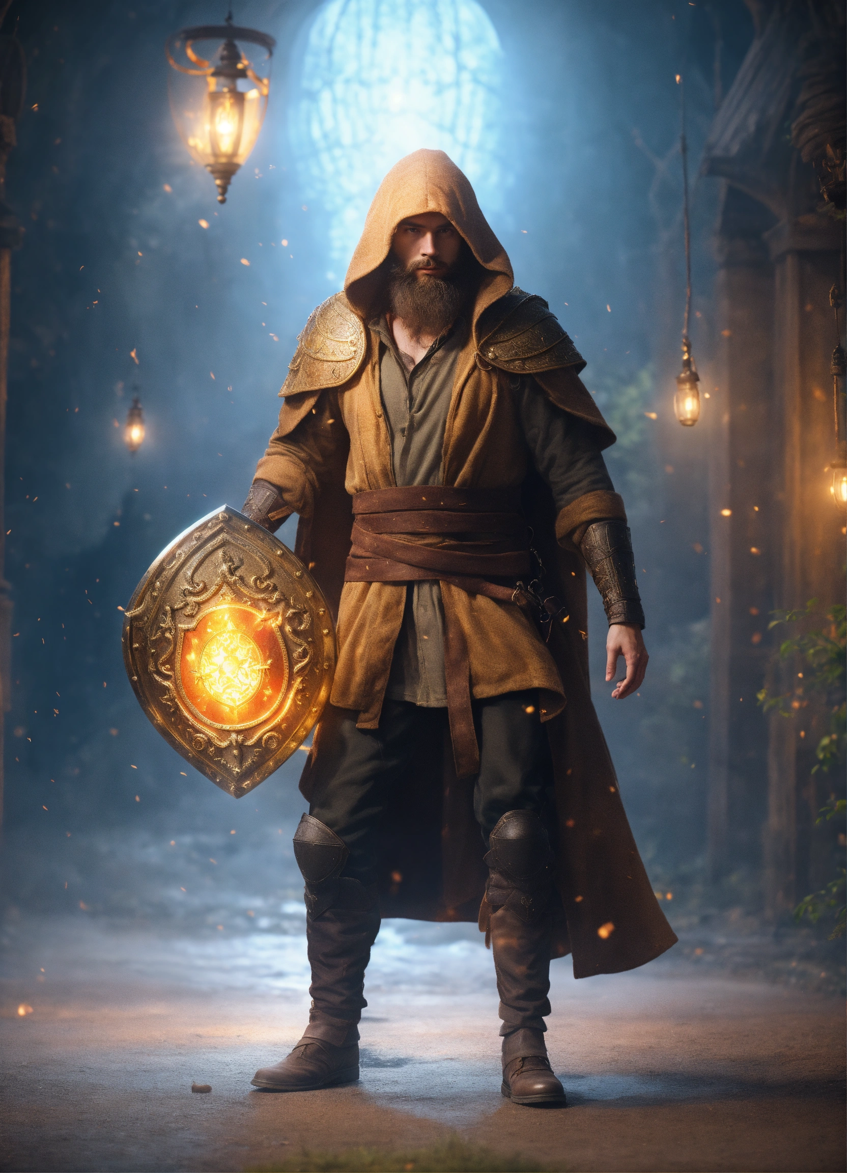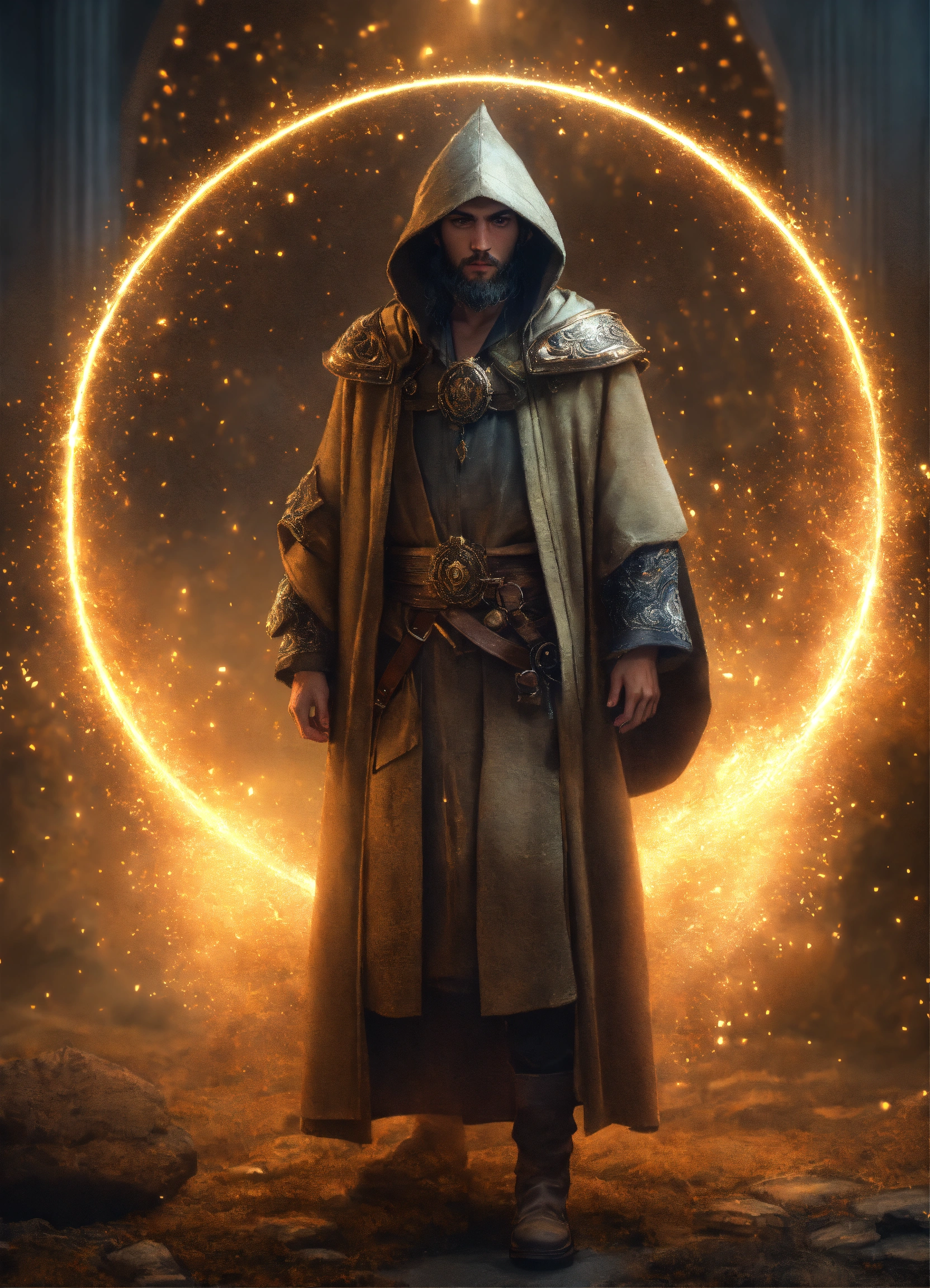 A realistic full body portrait of a young male hermit, mystical powers, magic shield, neutral background, moody, photorealistic, cinematic scene, super detailed, hyper realistic, bright lights, 8 k