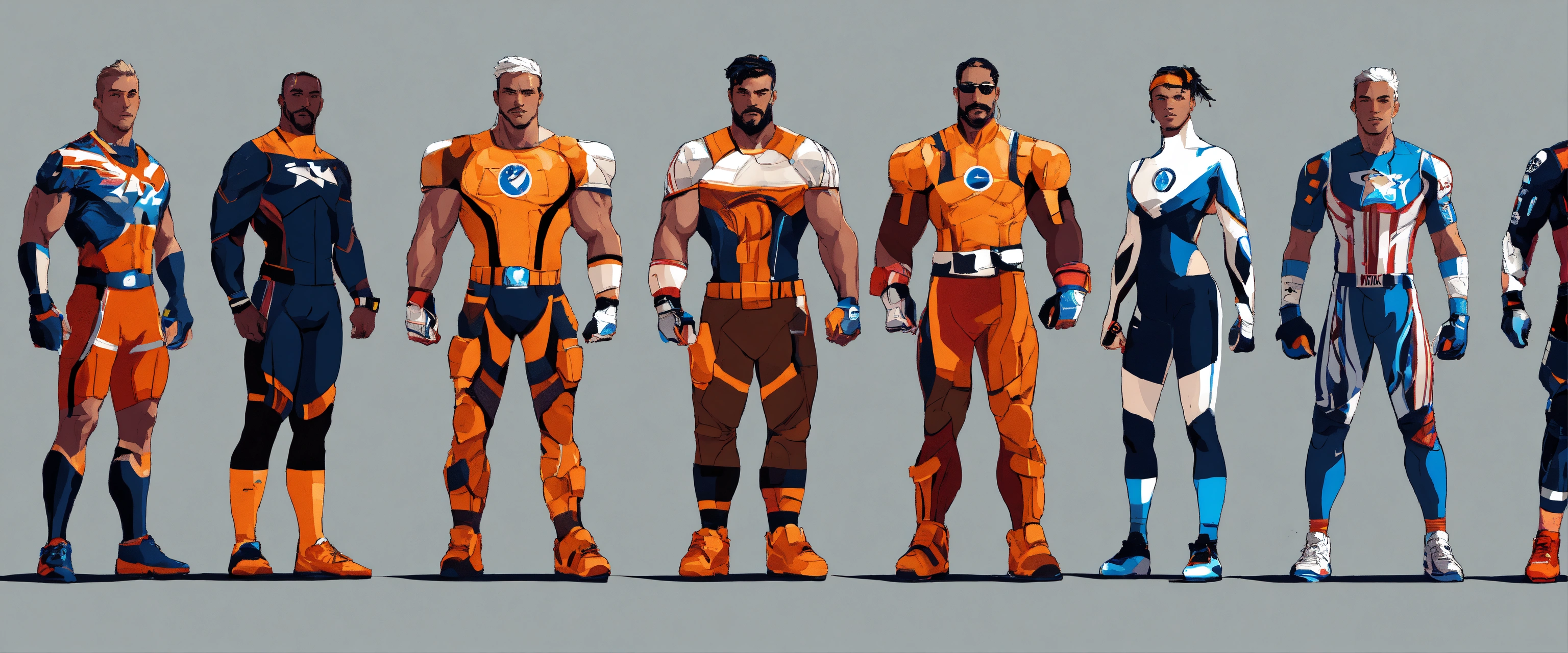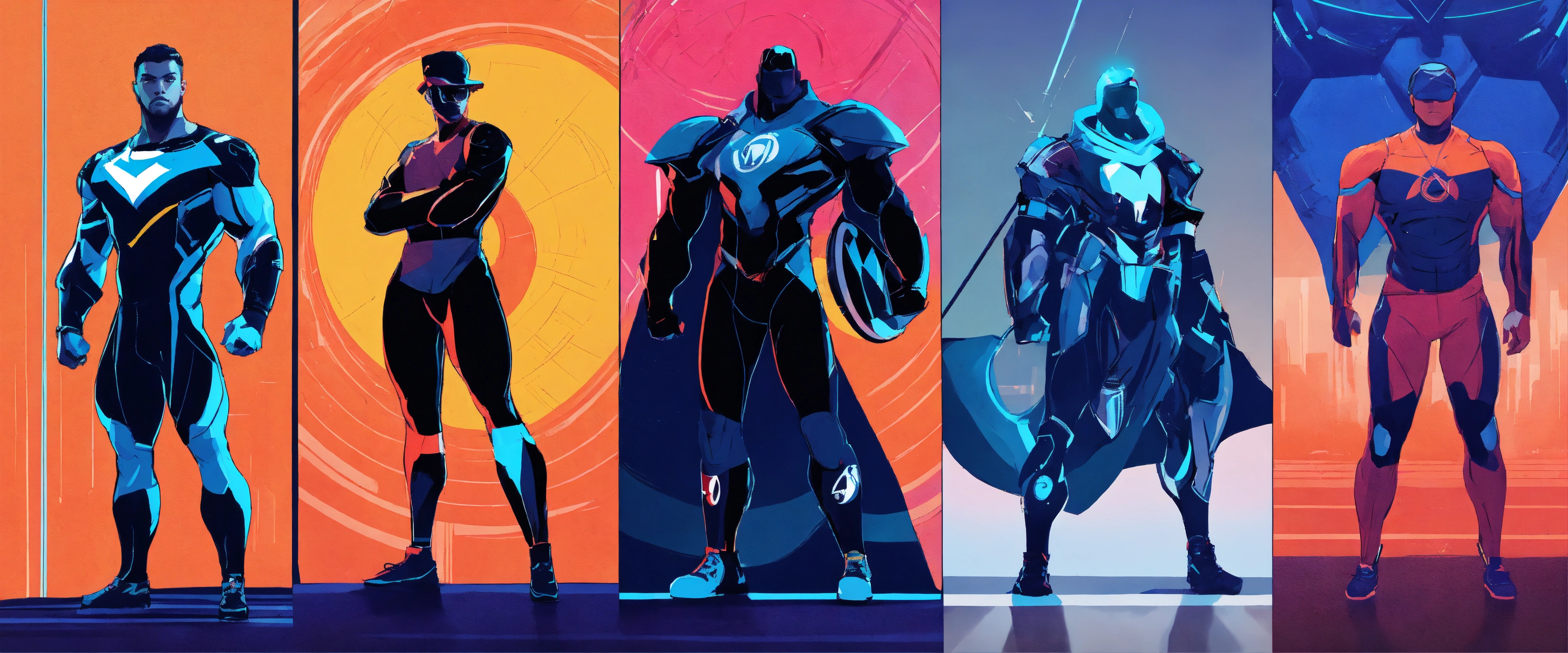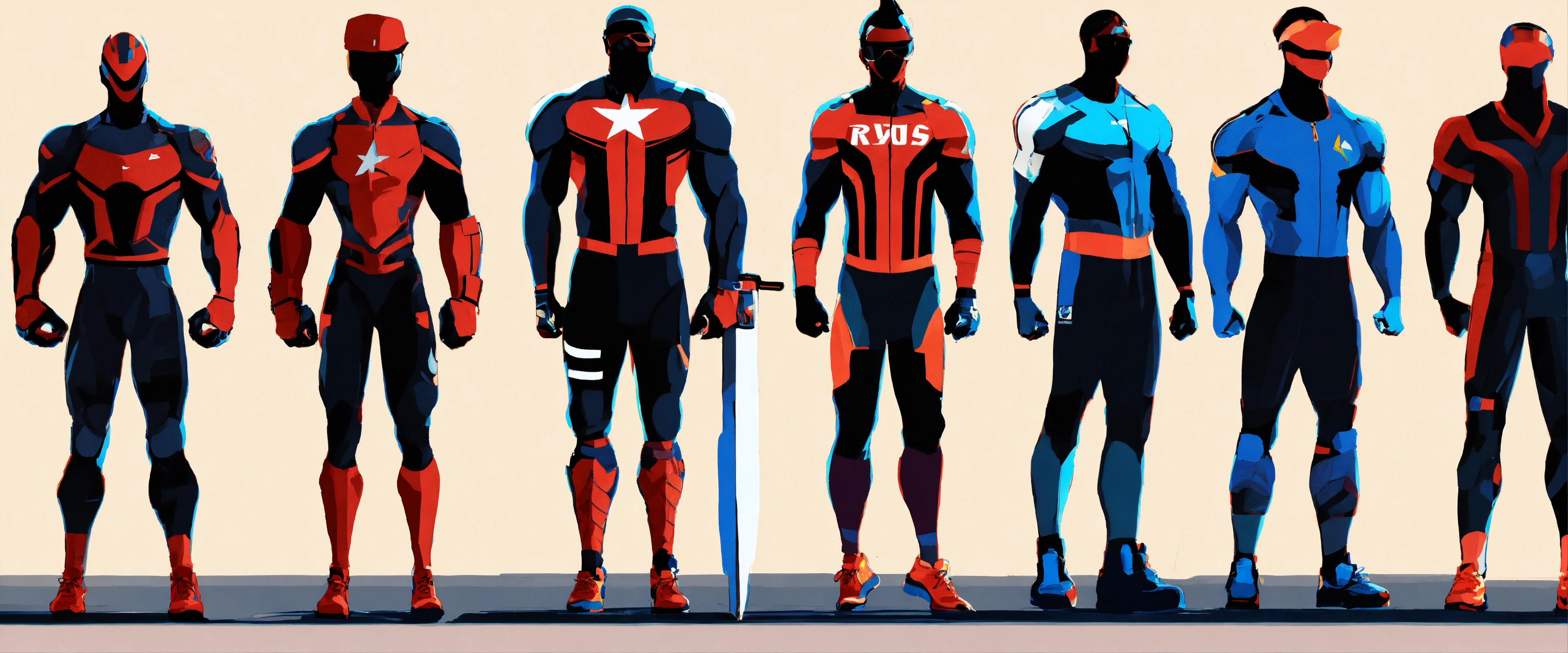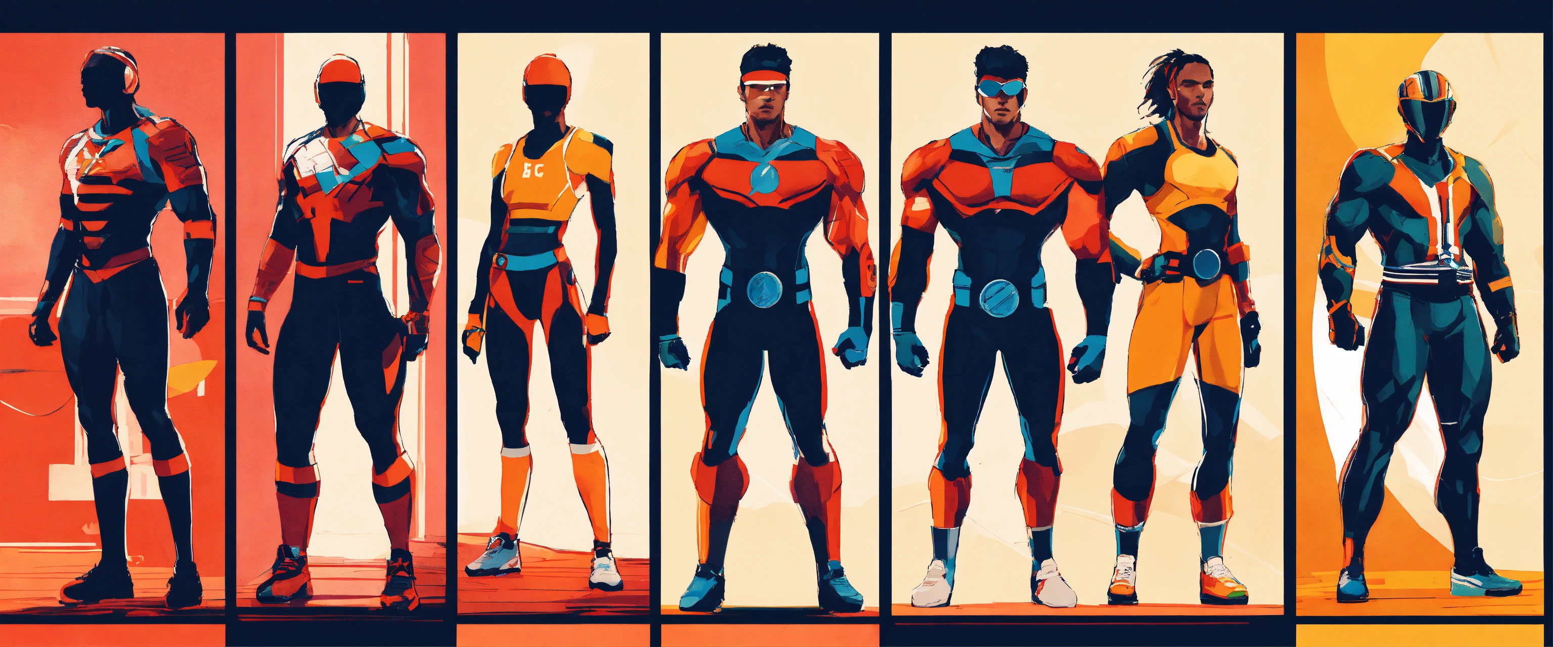 Futuristic athlete designs, strong silhouette, heroes from another age, hard edges, complex and vibrant, highly detailed, minimal and powerful, concept art, sport stars, athletic and dapper, classic, iconic